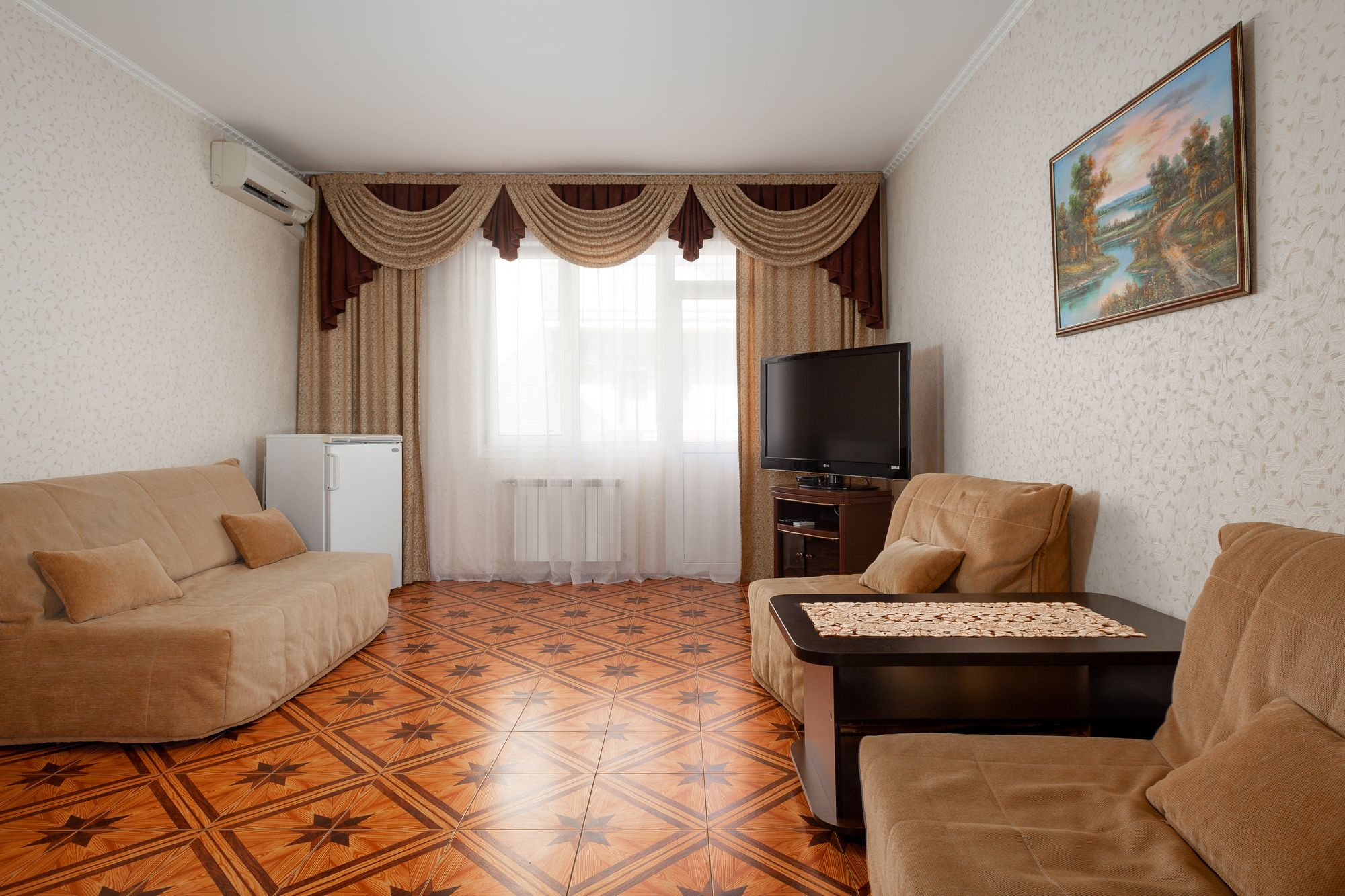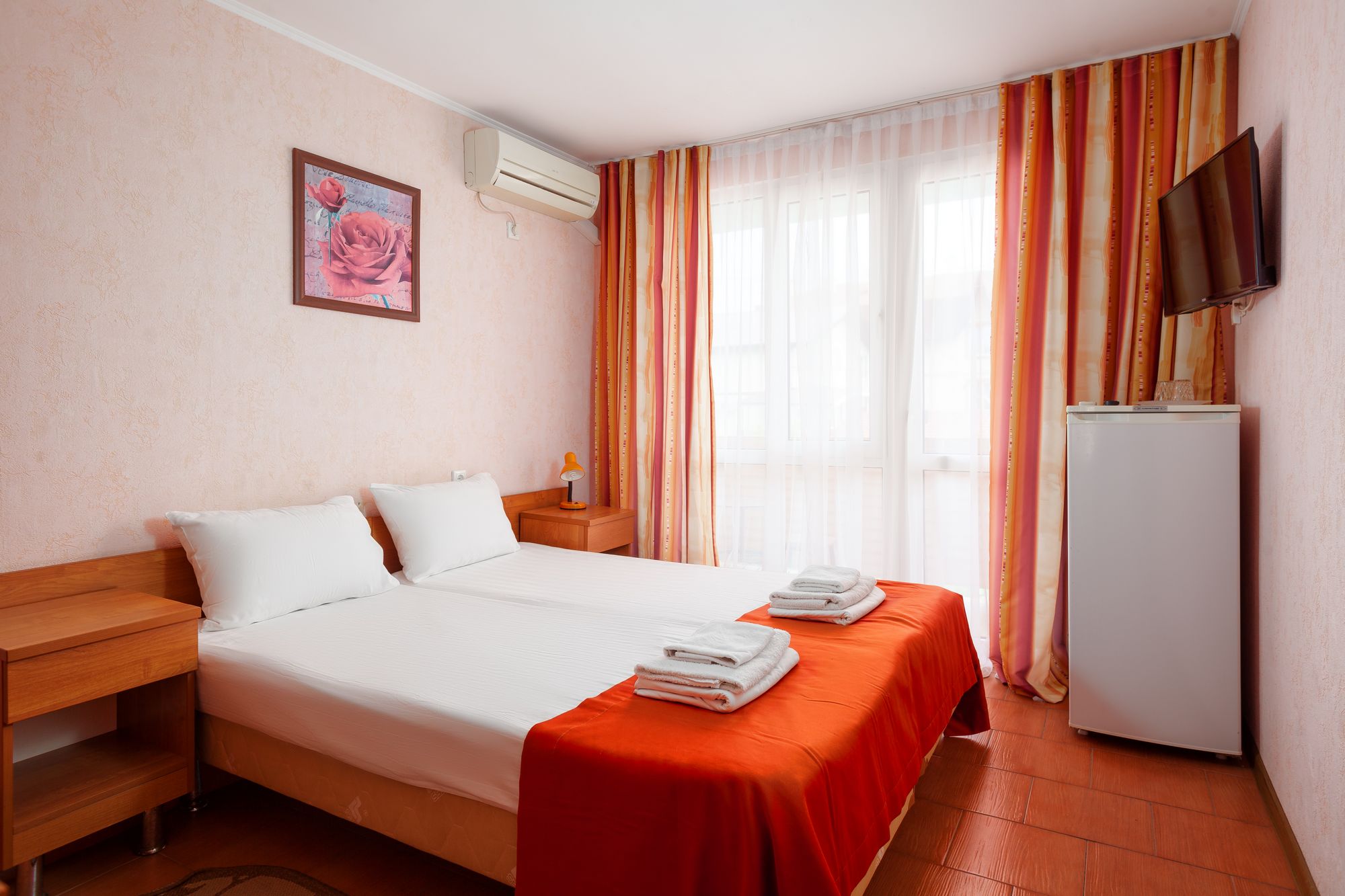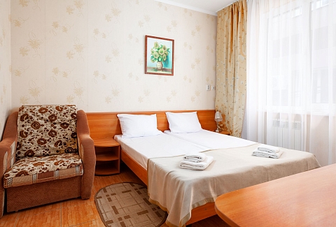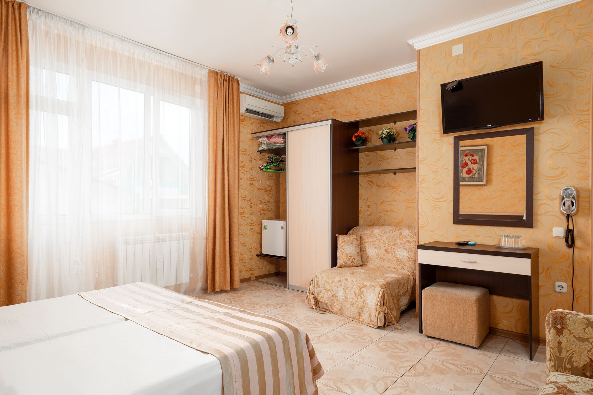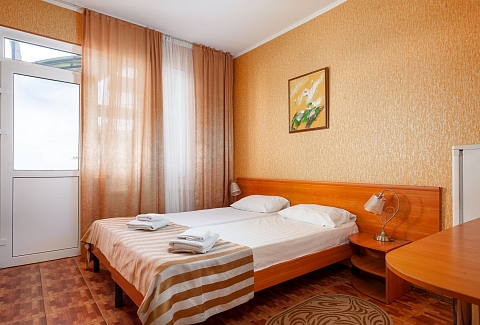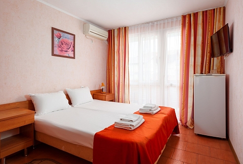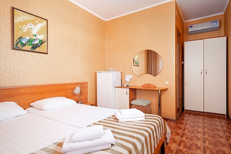 В номере: зеркало, кровати полутороспальные, прикроватные тумбочки, стол, шкаф, кондиционер, мини-холодильник, набор посуды, сейф, телевизор