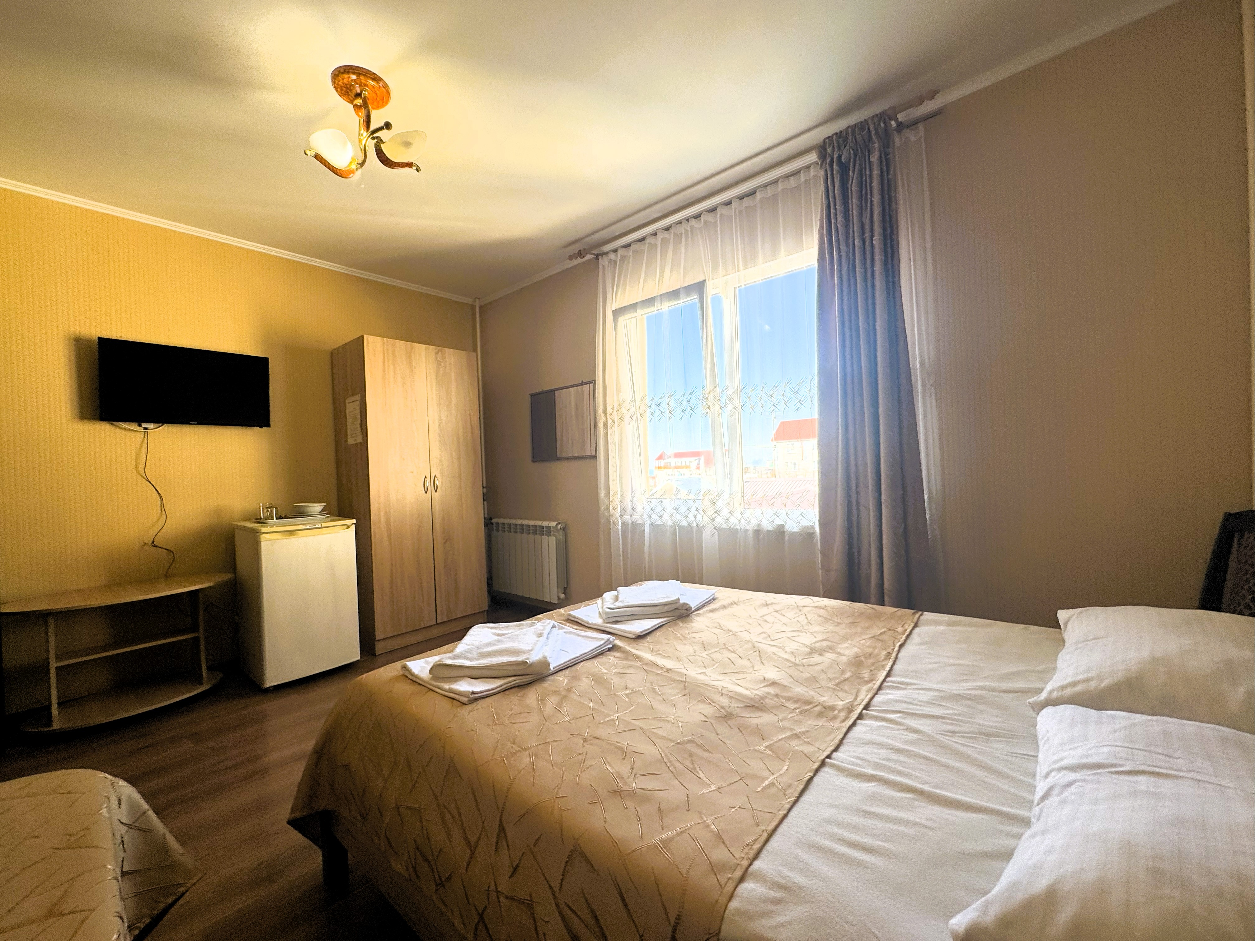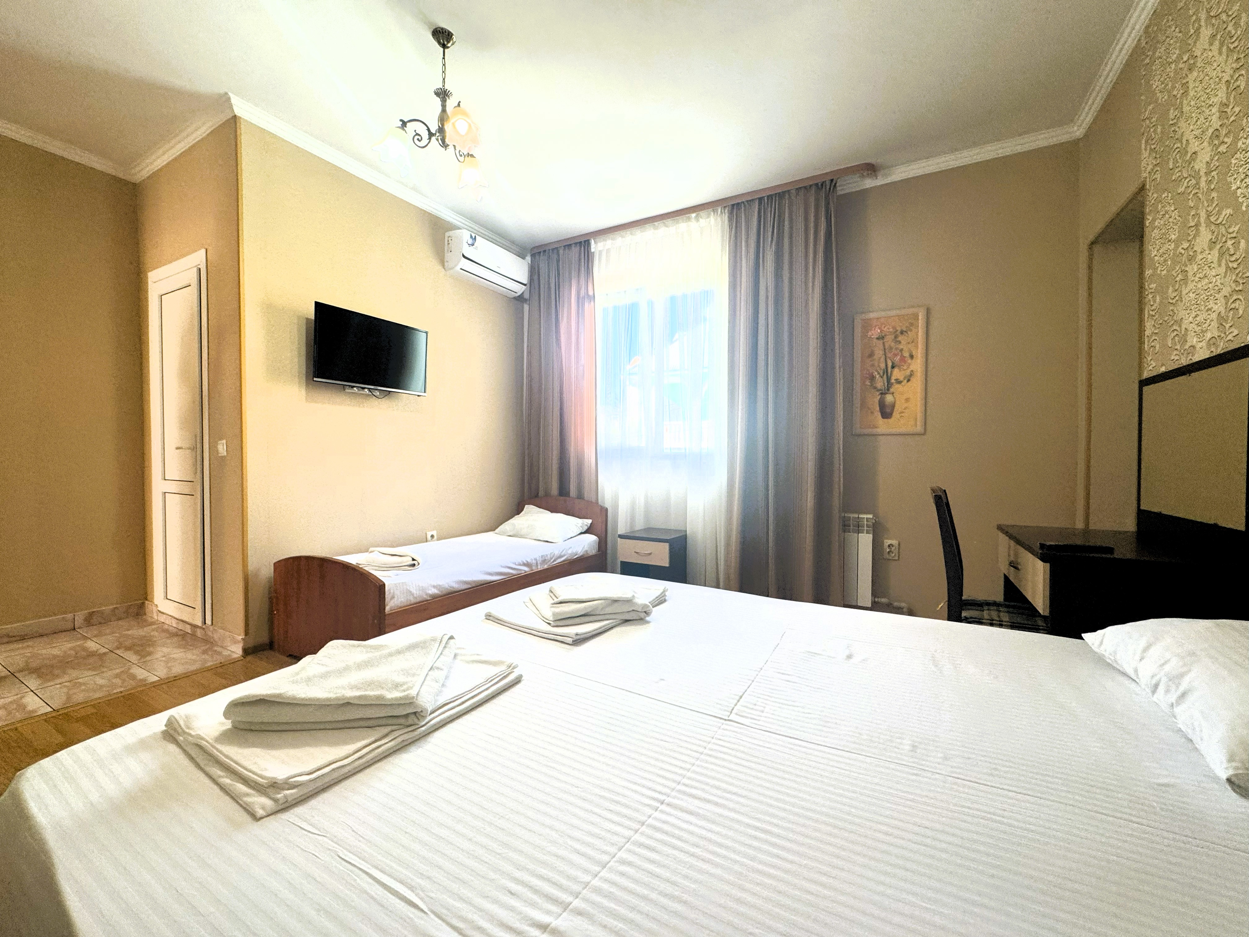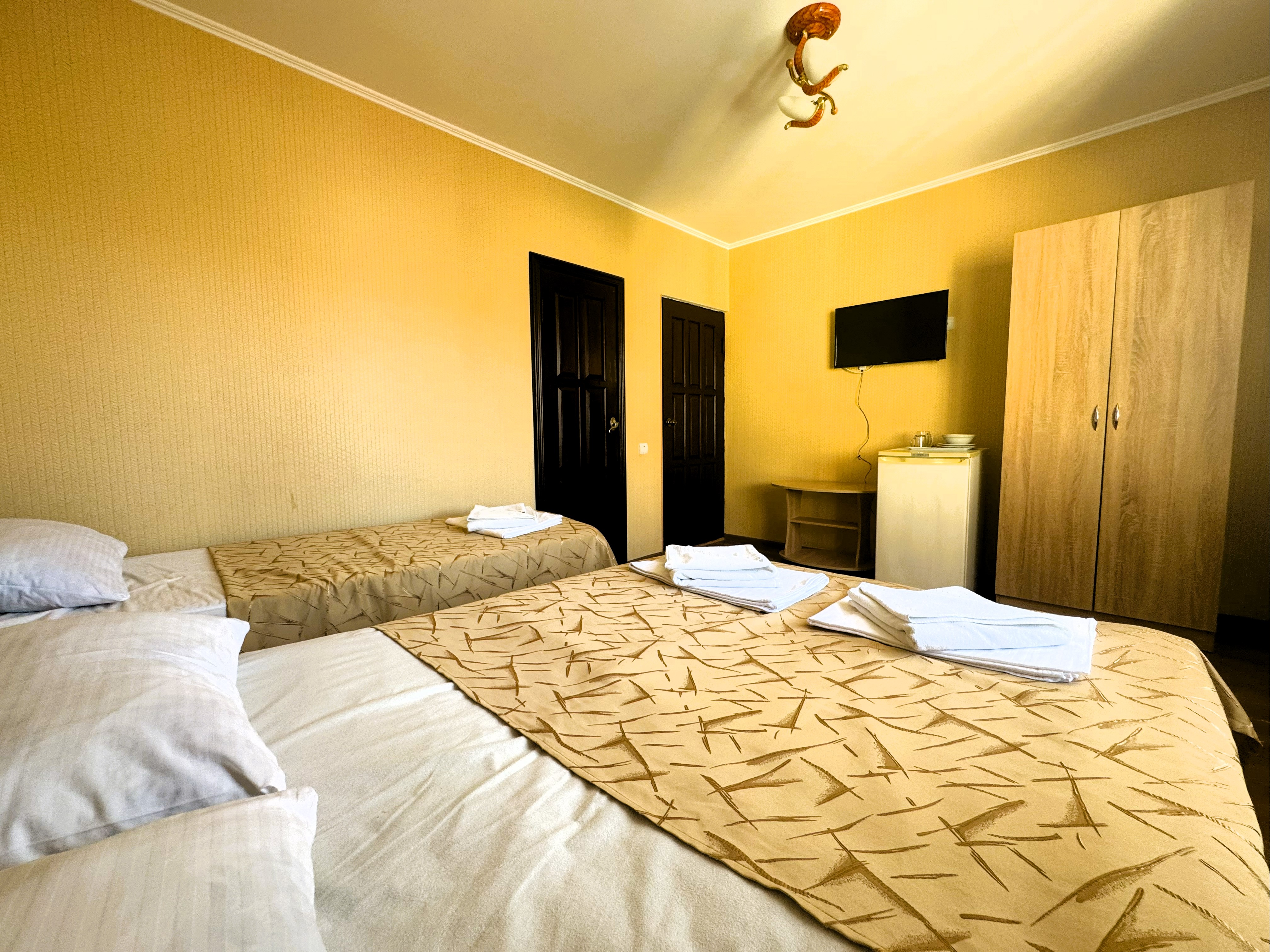 В номере: вешалка, зеркало, кресло-кровать, кровати односпальные /одна двуспальная кровать, прикроватные тумбочки, стол, стул, шкаф, кондиционер, телевизор, холодильник