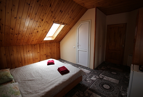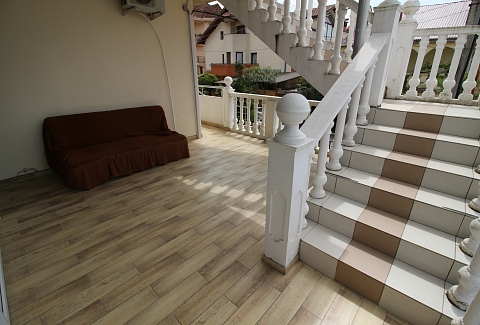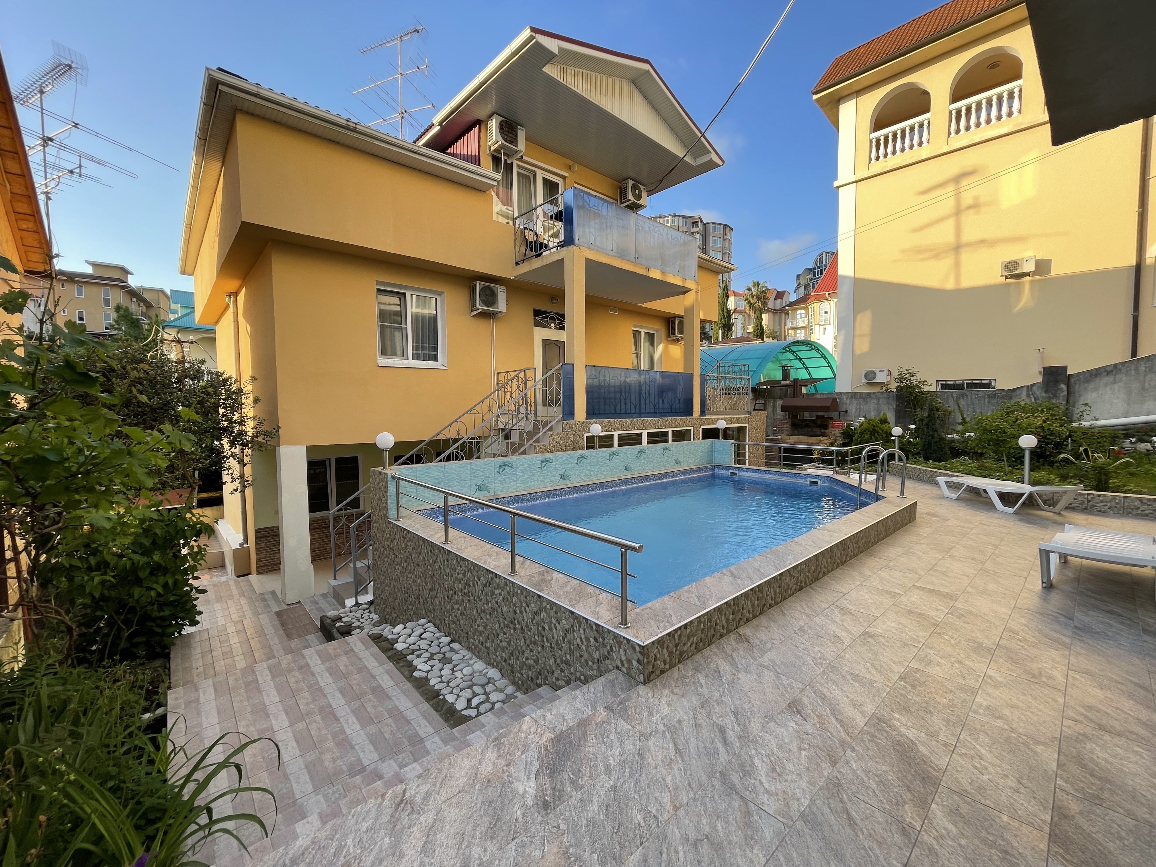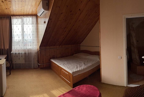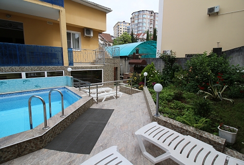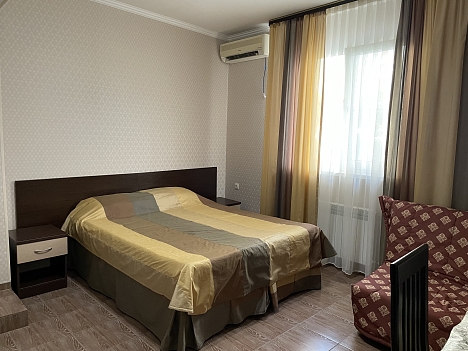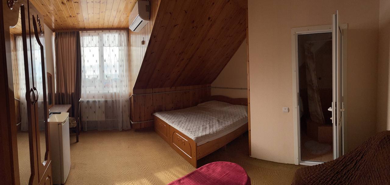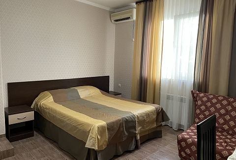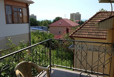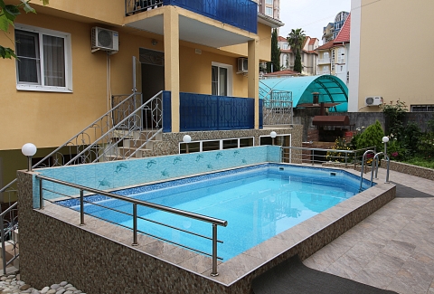 Трехэтажный отель разместился на тихой зеленой улице. Жилой фонд, рассчитанный на 18 номеров, предлагает отдыхающим номера Стандарт, а также двухкомнатные Люксы и Студии с кухней. Все номера оснащены сплит-системой, есть телевизор и холодильник. Из некоторых номеров открываются панорамные виды на море. В распоряжении гостей общая кухня для самостоятельного приготовления пищи, мангальная зона, открытый подогреваемый бассейн, беспроводной интернет, стоянка для автомобилей. На ресепшене можно арендовать дополнительную бытовую технику. В 800 метрах находится городской пляж, покрытый мелкой галькой. На пляже установлены раздевалки, лежаки, навесы, работают душевые, кафе, есть прокат шезлонгов, много водных развлечений.