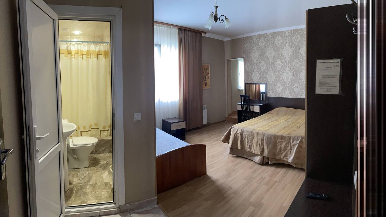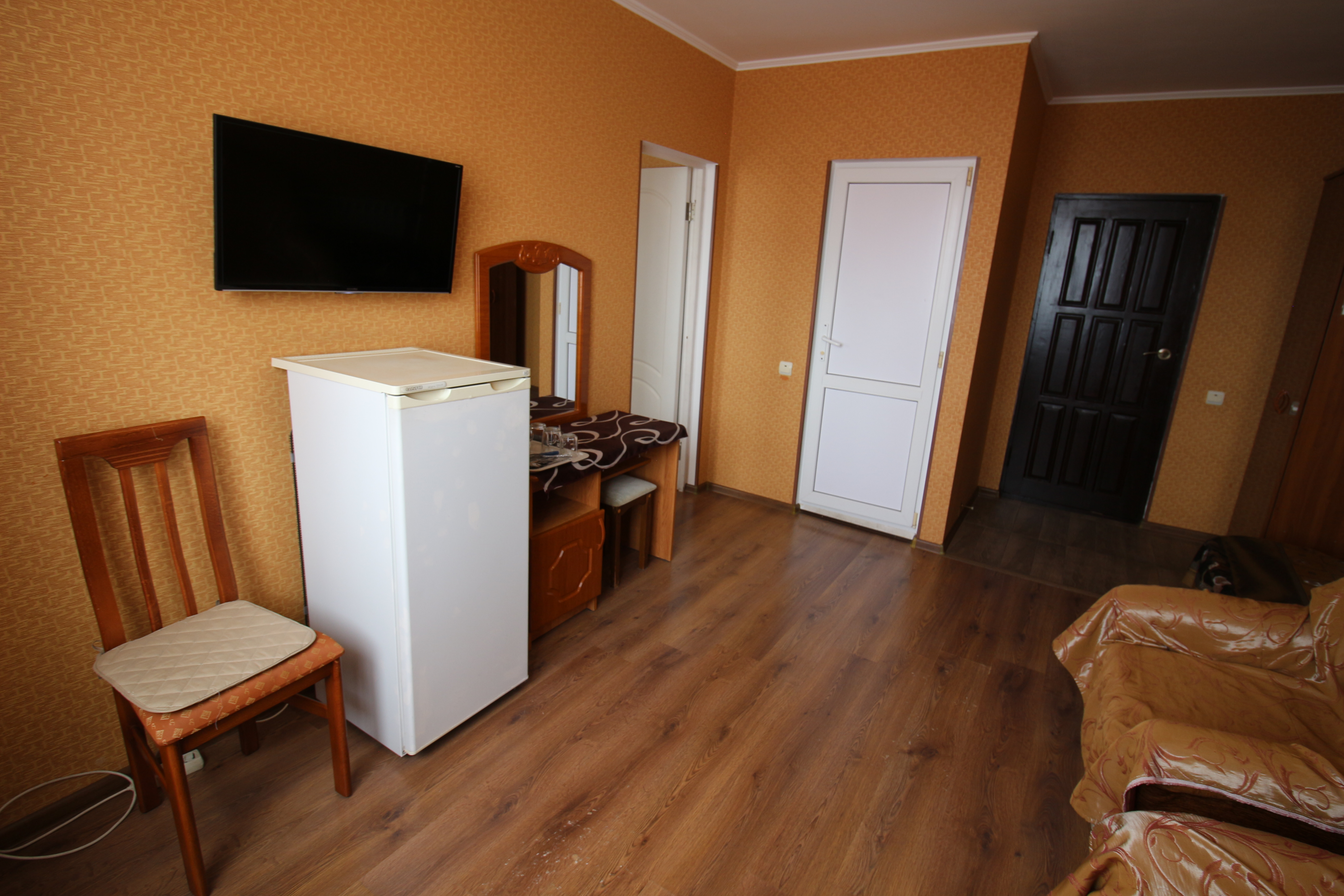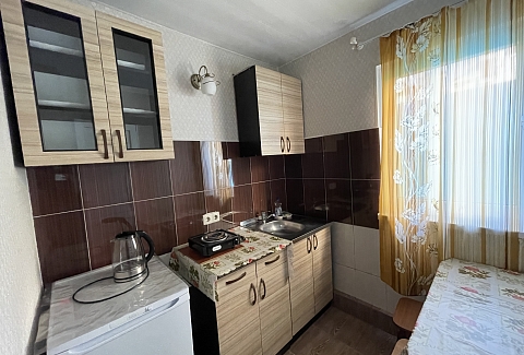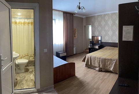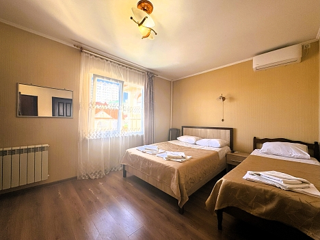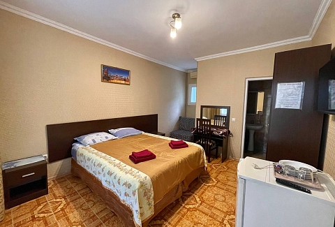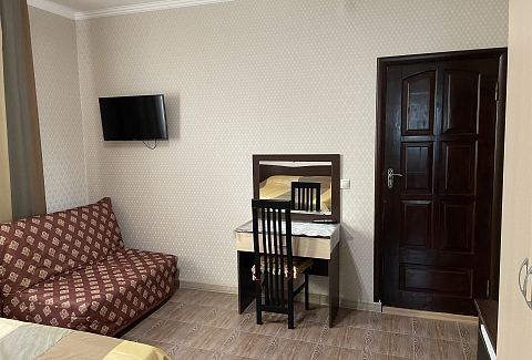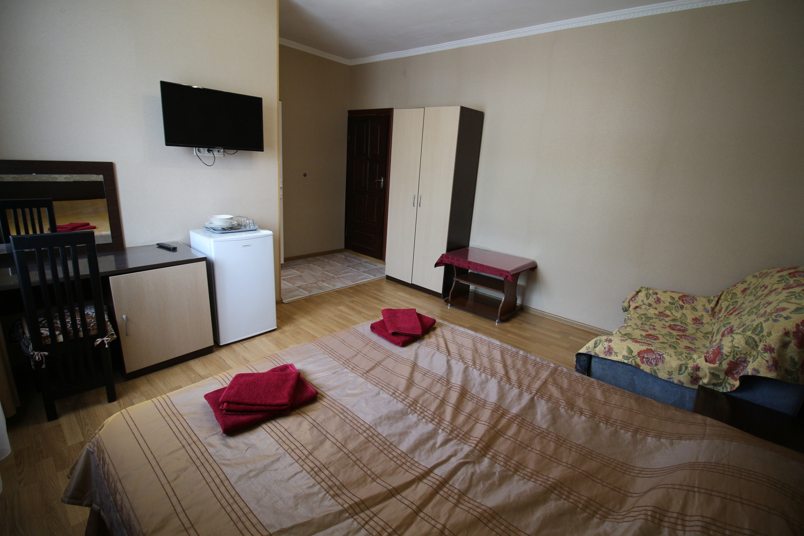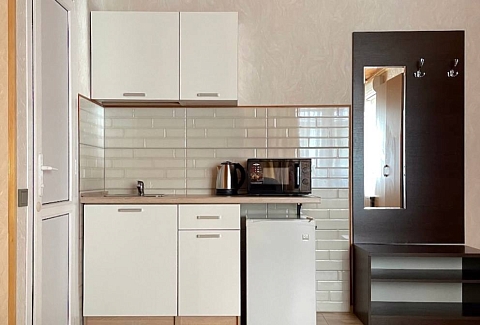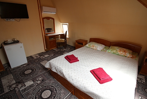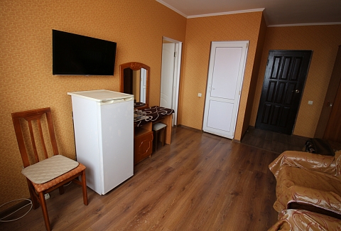 В номере: зеркало, кровать двуспальная, кровать односпальная, стол, стул, шкаф, кондиционер, микроволновая печь, набор посуды, плита электрическая, телевизор, холодильник