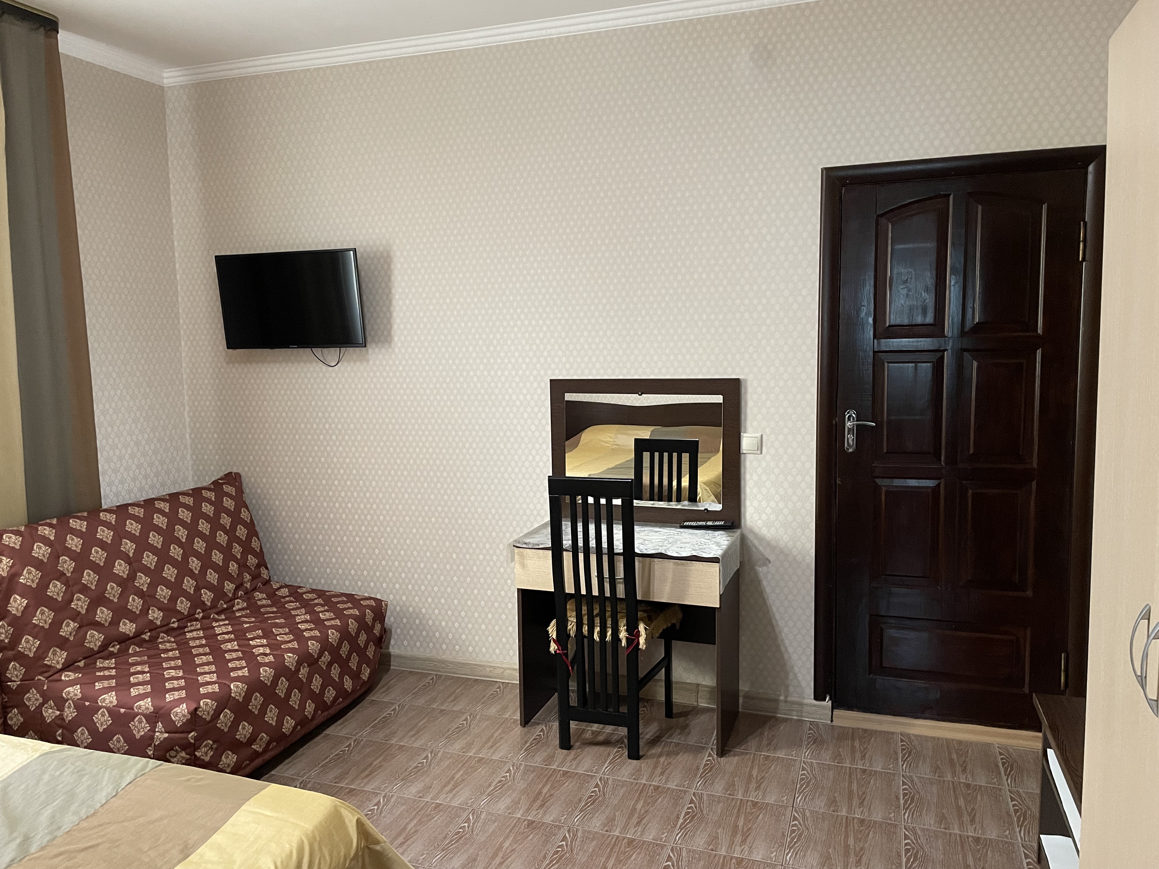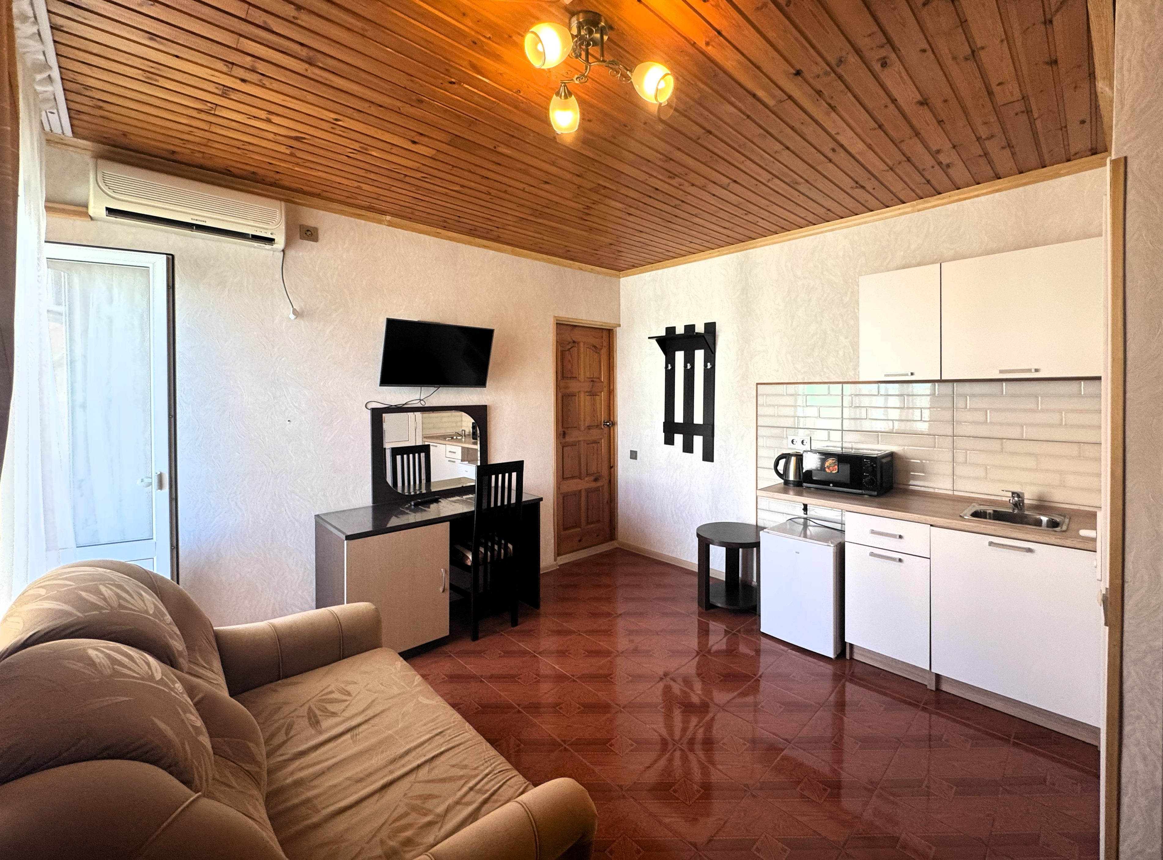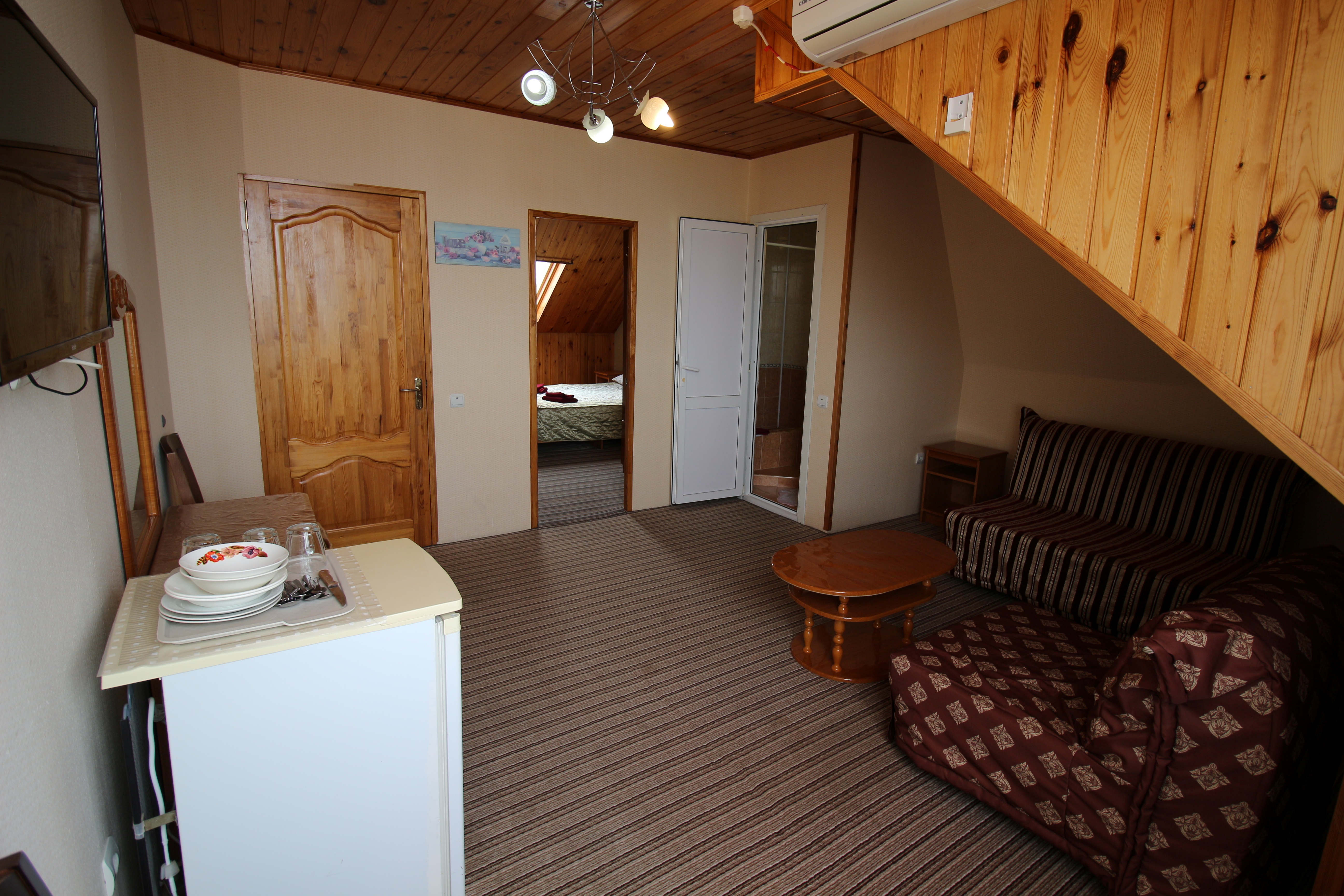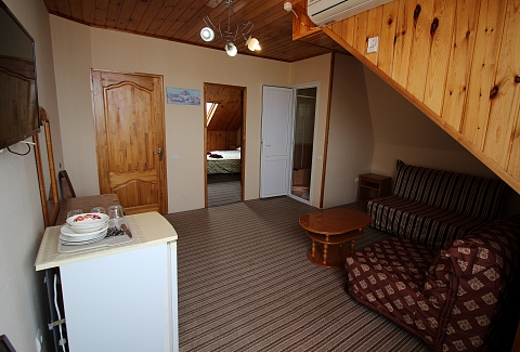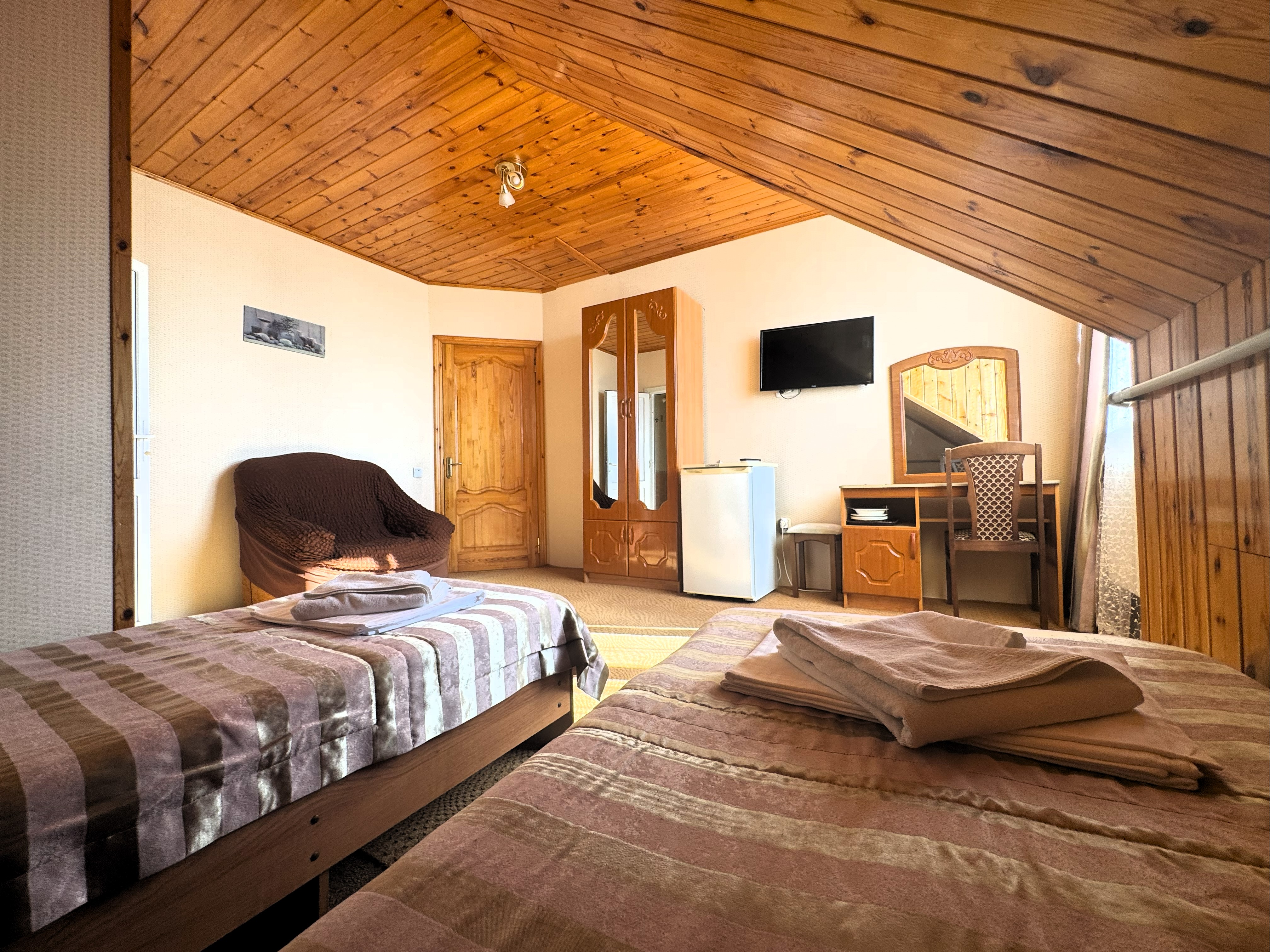 В номере: зеркало, кровать двуспальная, кровать односпальная, стол, стул, шкаф, кондиционер, микроволновая печь, набор посуды, плита электрическая, телевизор, холодильник
