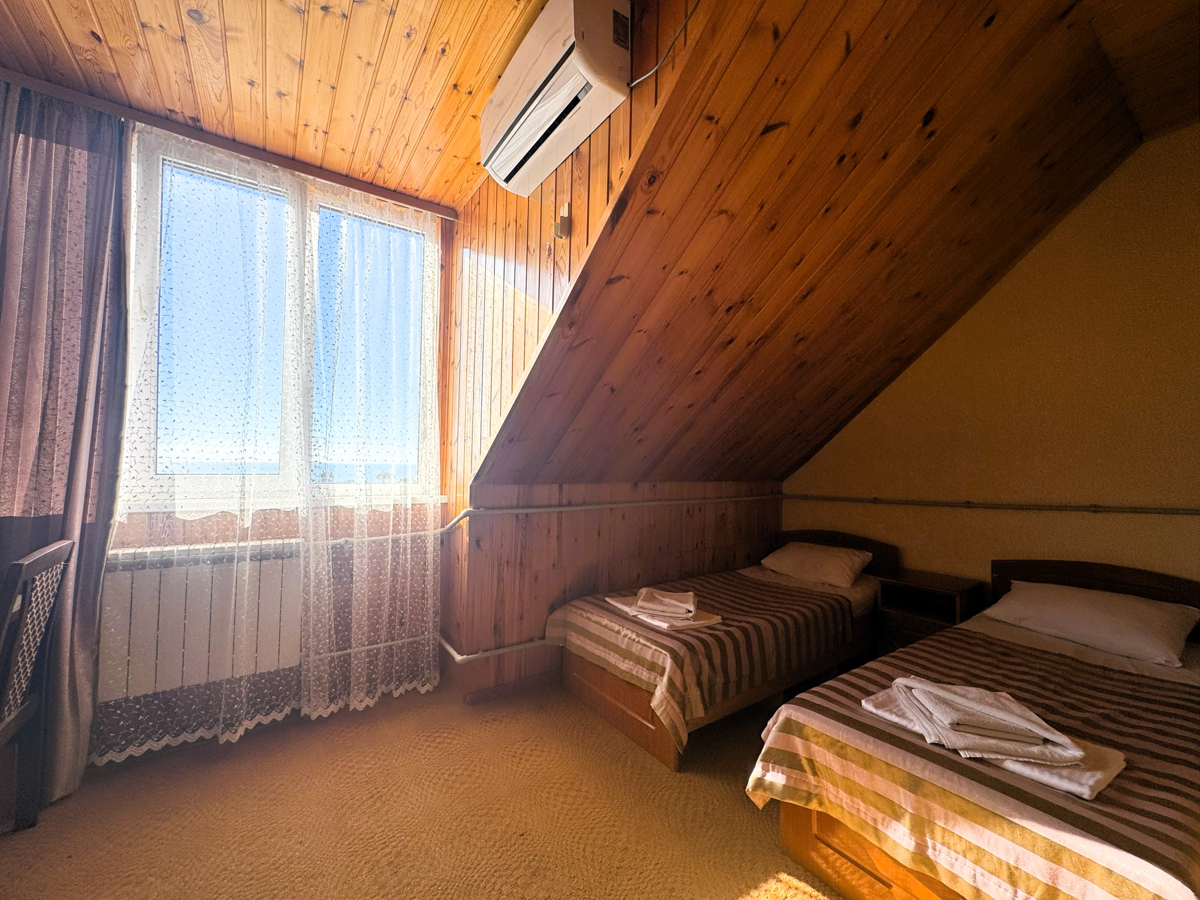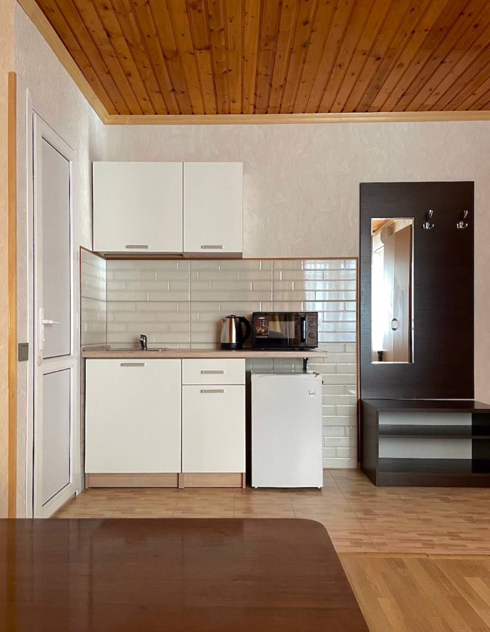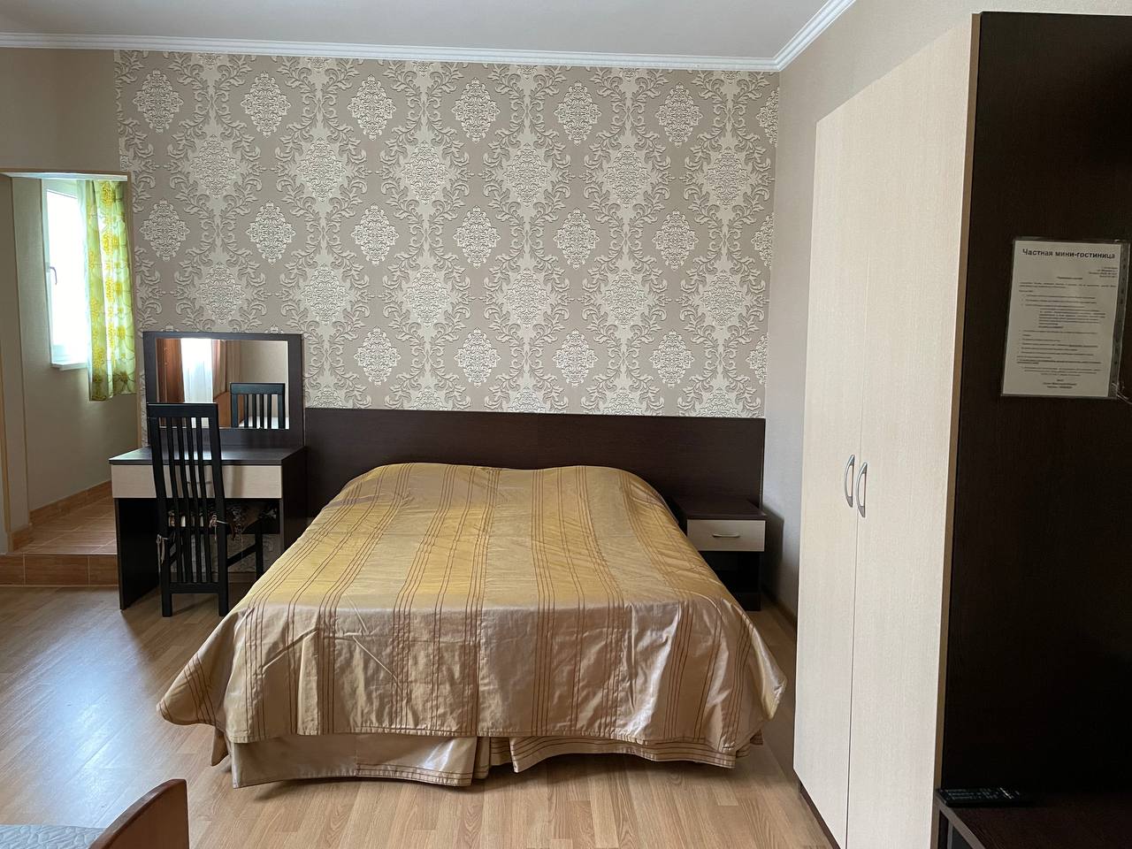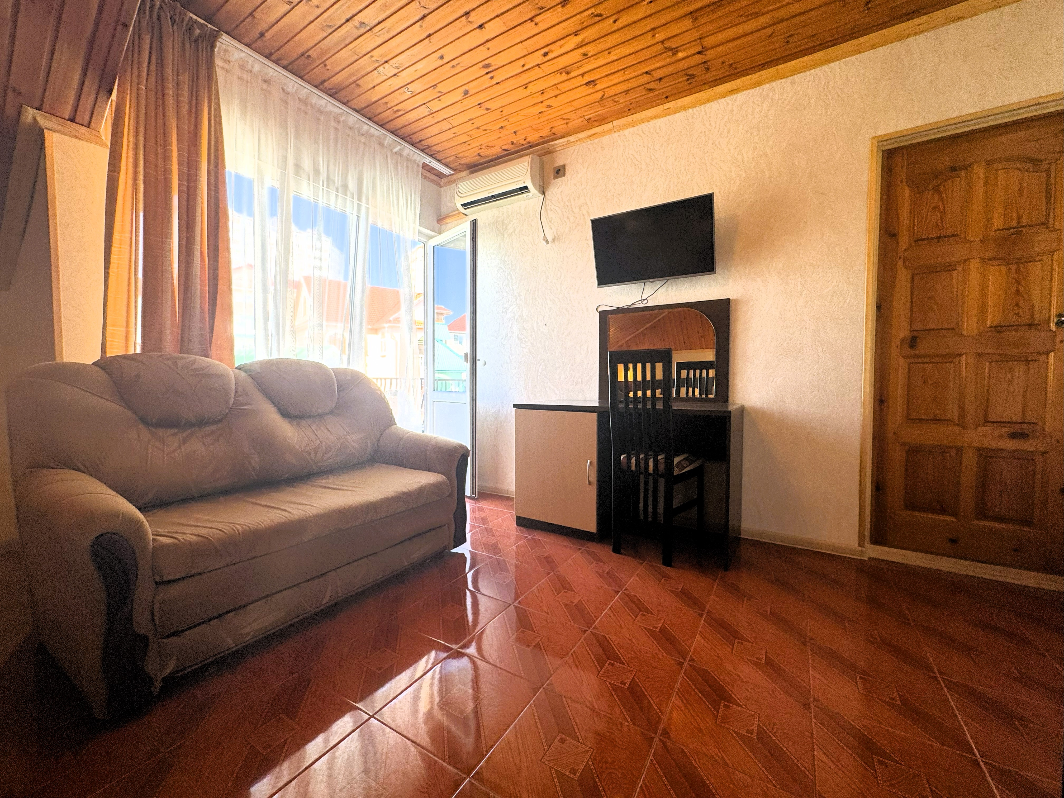 В номере: зеркало, кровать двуспальная, кровать односпальная, стол, стул, шкаф, кондиционер, микроволновая печь, набор посуды, плита электрическая, телевизор, холодильник