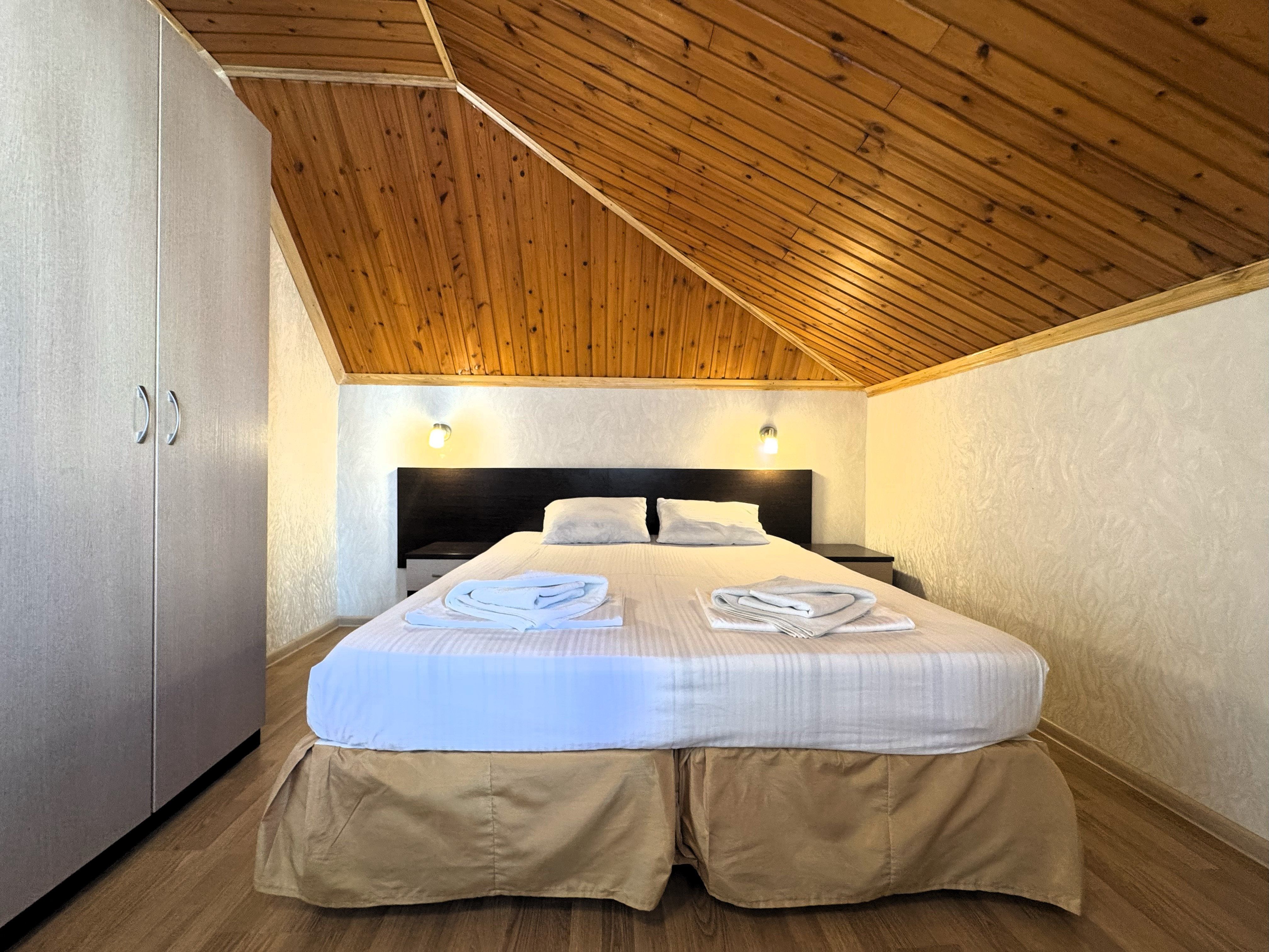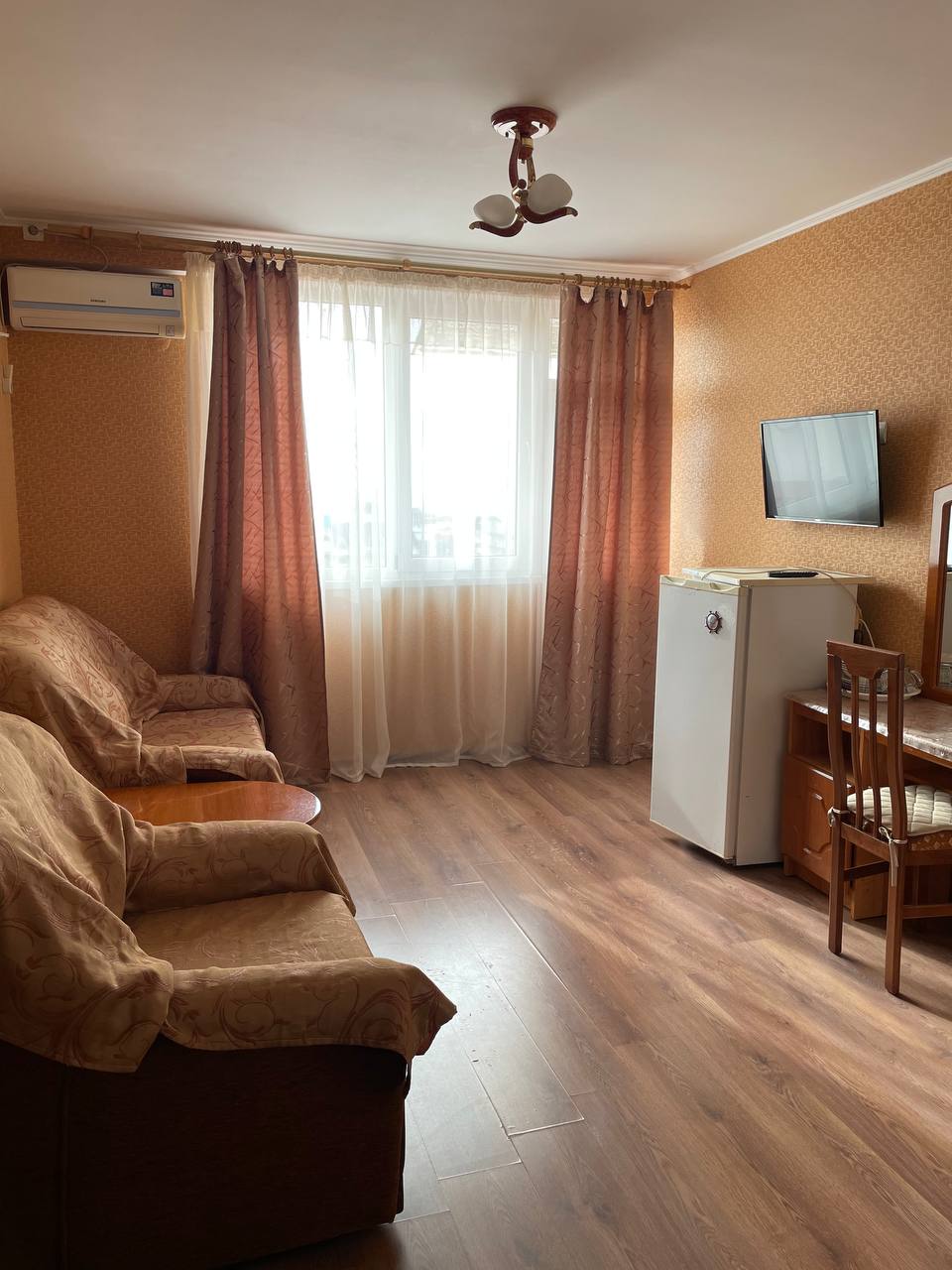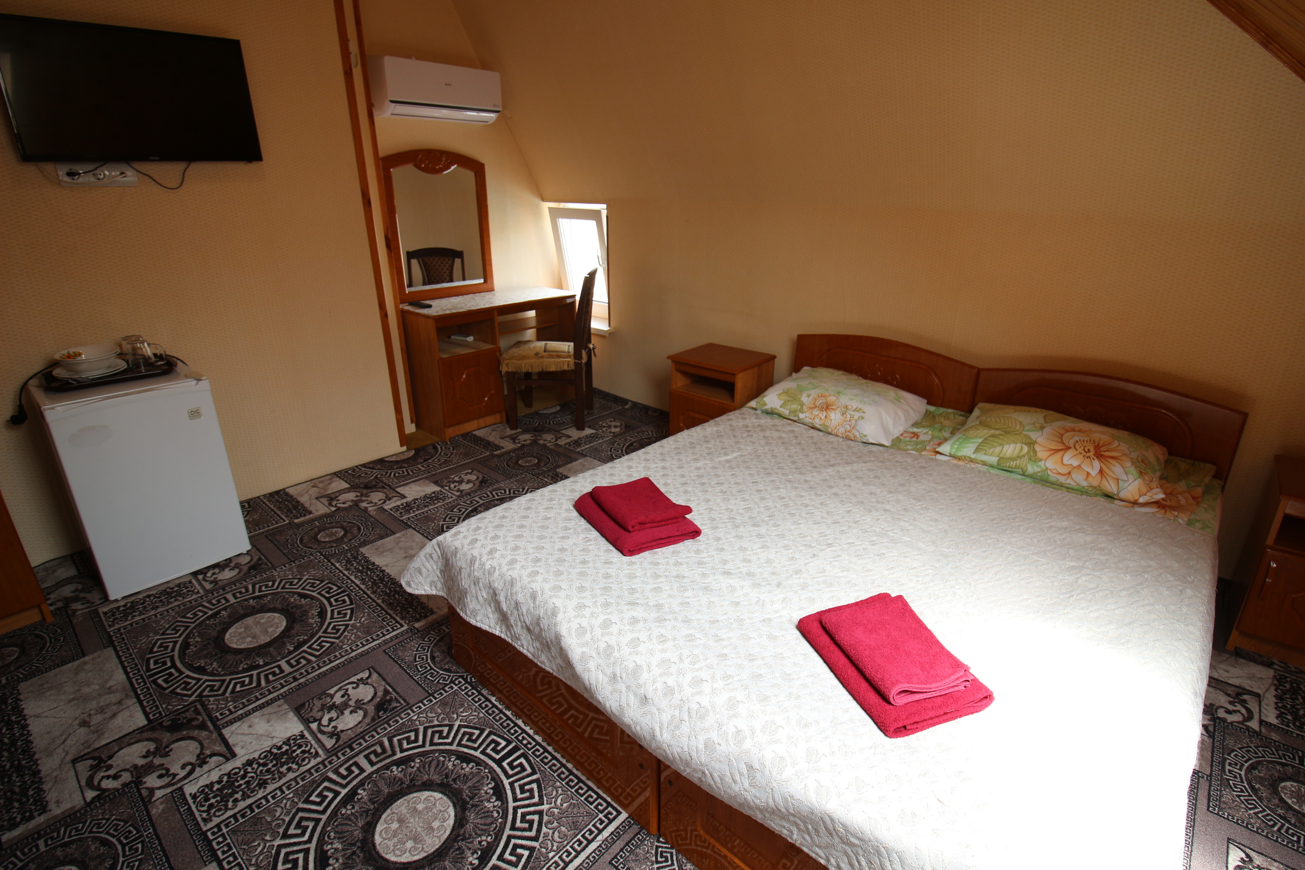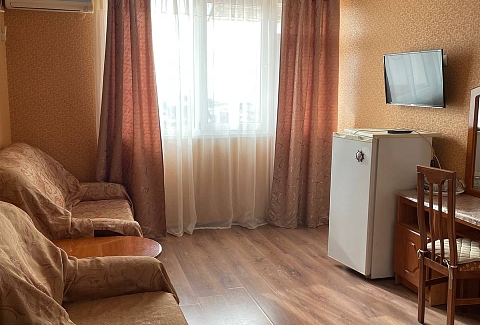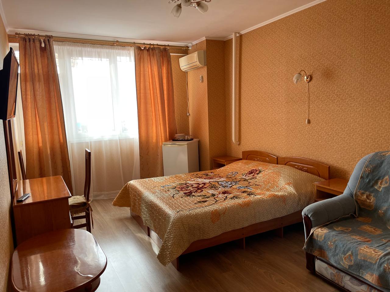В номере: вешалка, зеркало, кресло-кровать, кровать двуспальная, прикроватные тумбочки, стол, стулья, шкаф, кондиционер, телевизор, холодильник