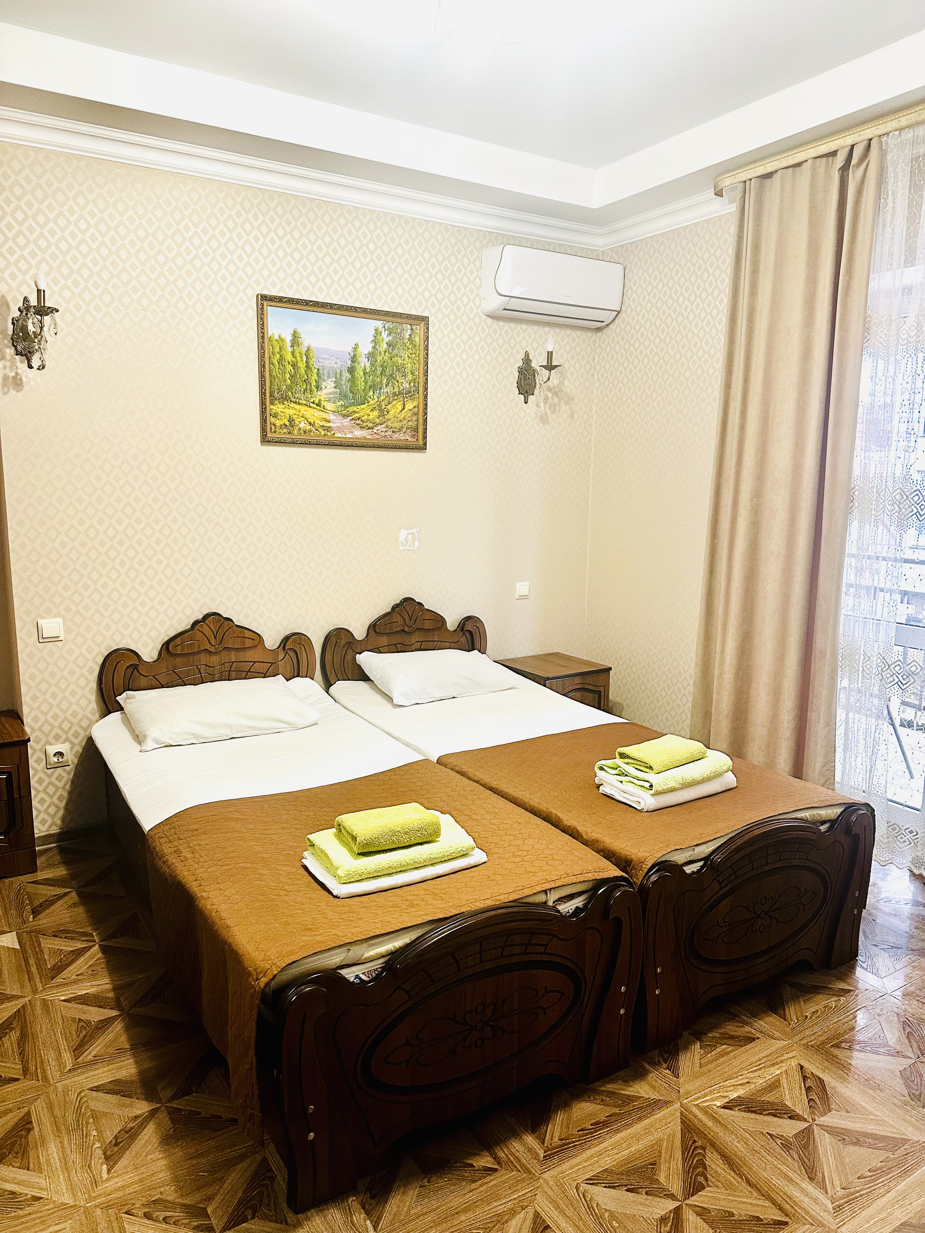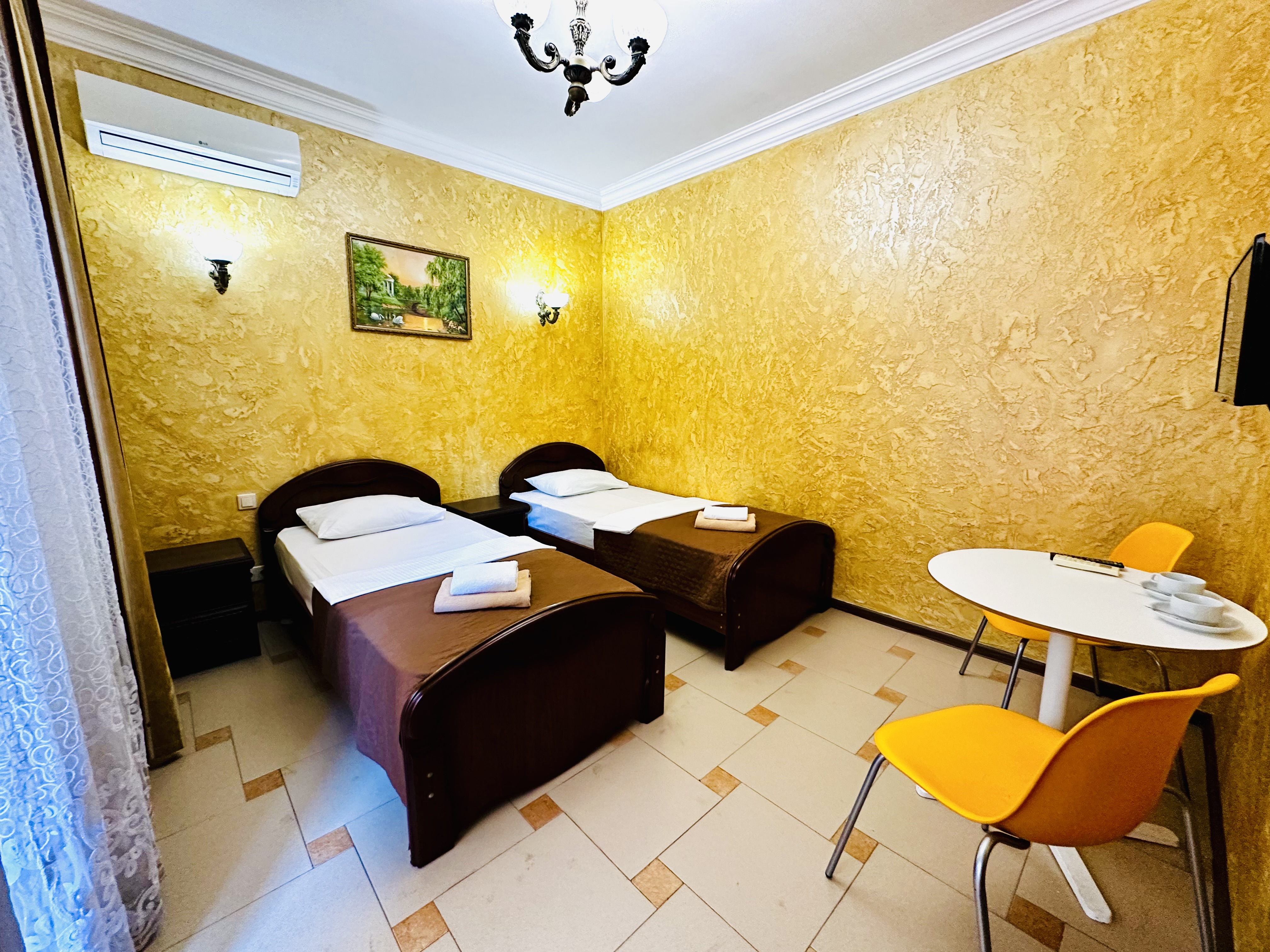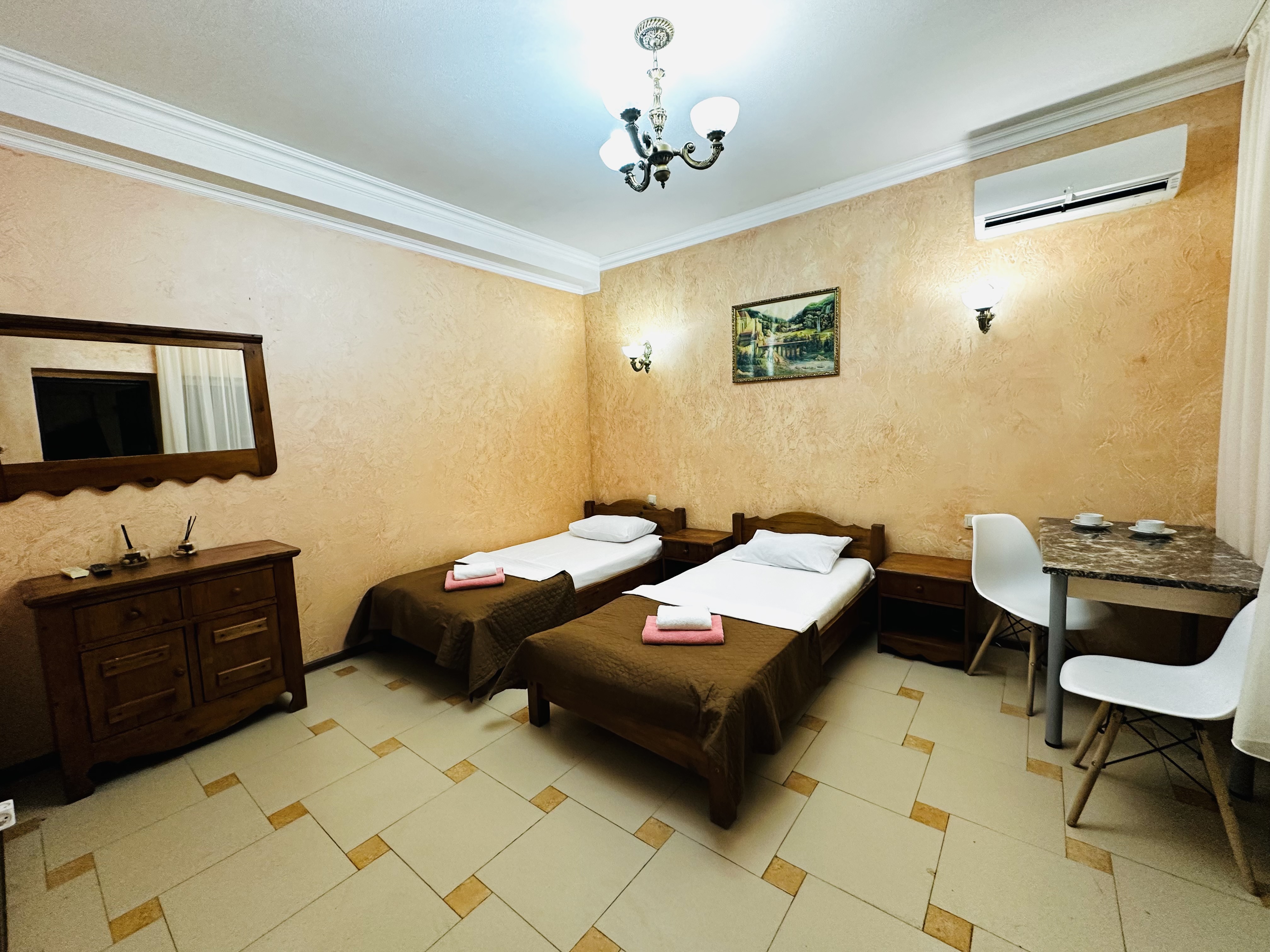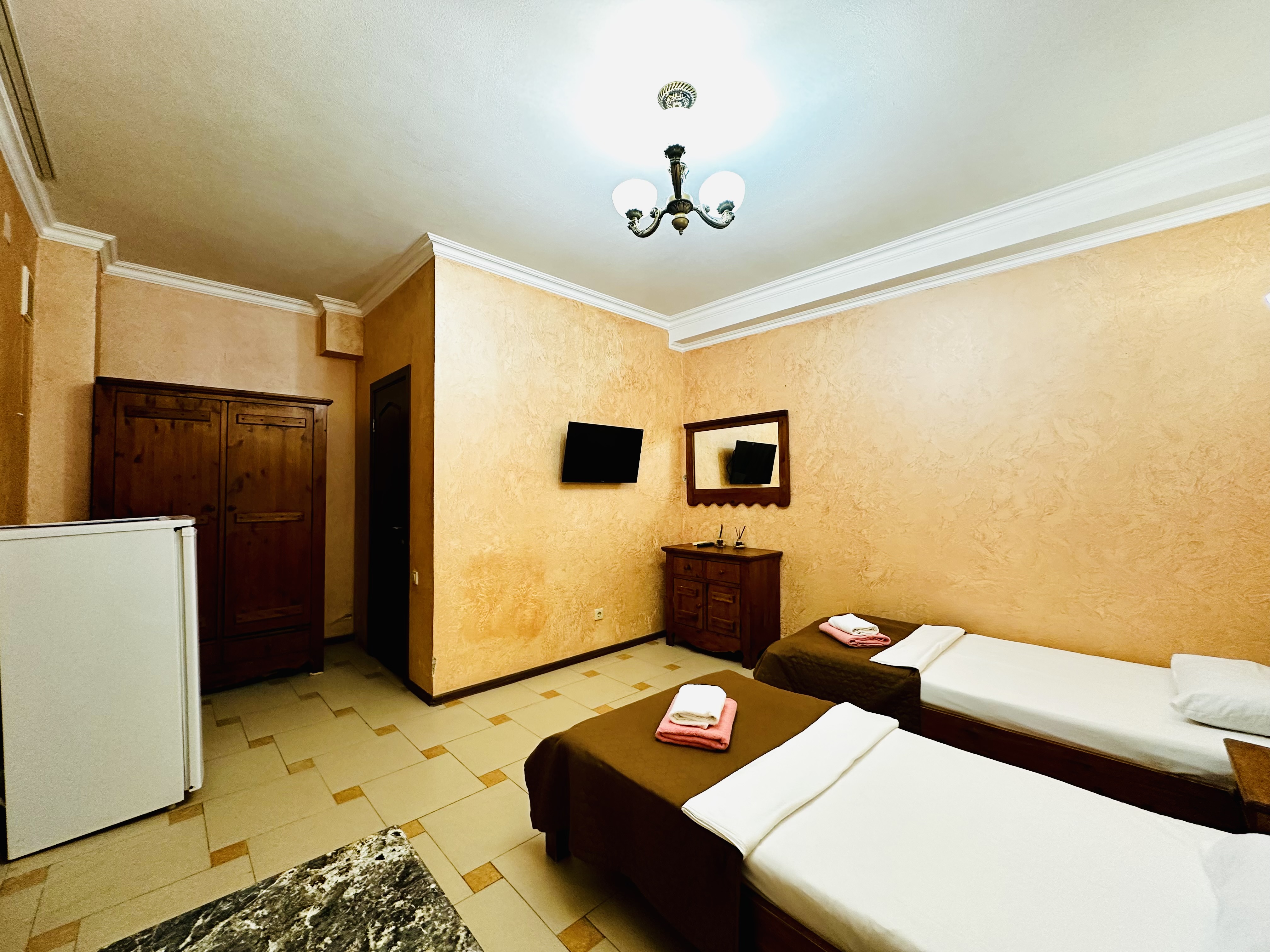 В номере: зеркало, кровати односпальные, прикроватные тумбочки, стол, стулья, шкаф, кондиционер, телевизор ЖК, холодильник, чайный набор посуды