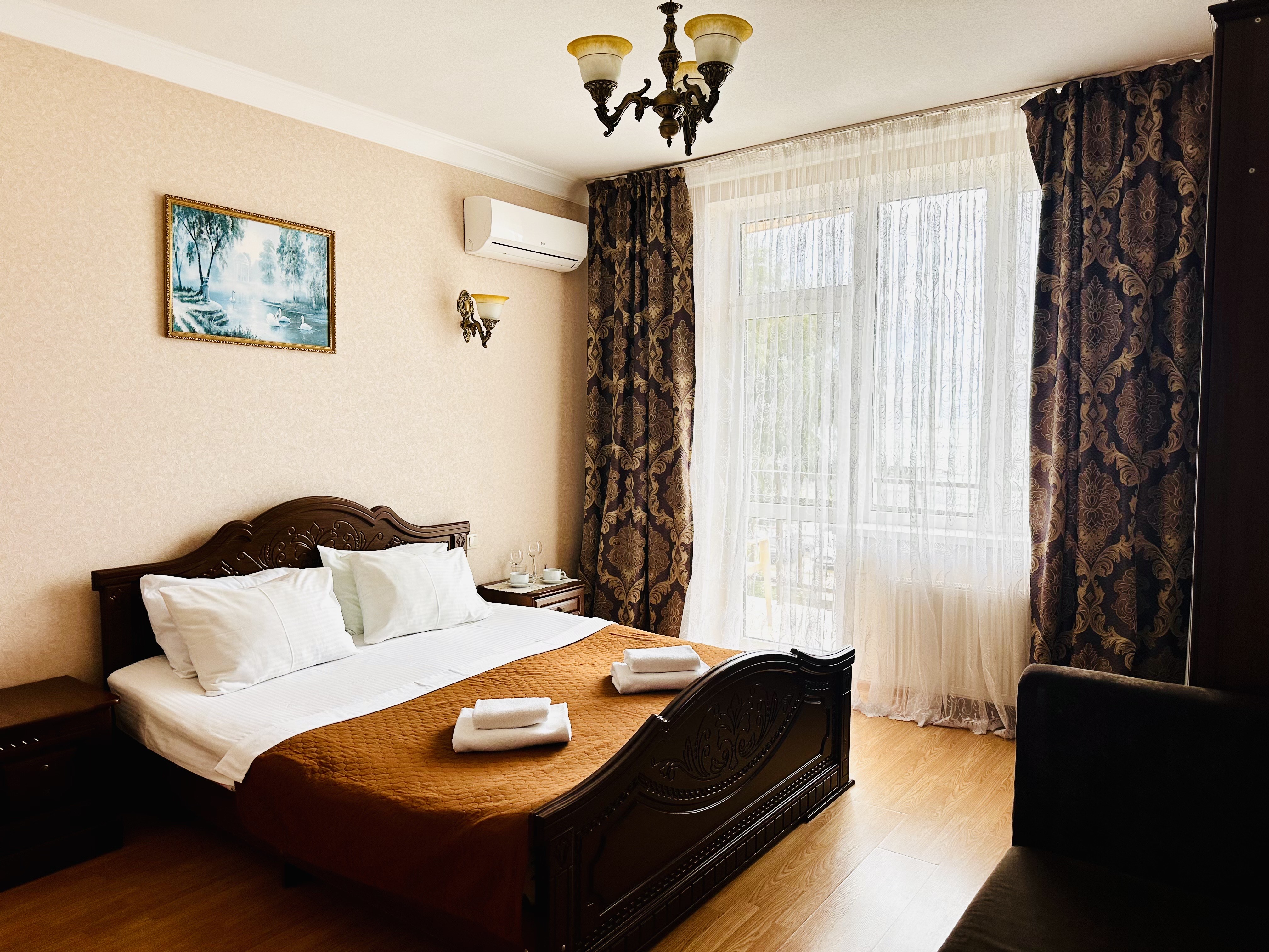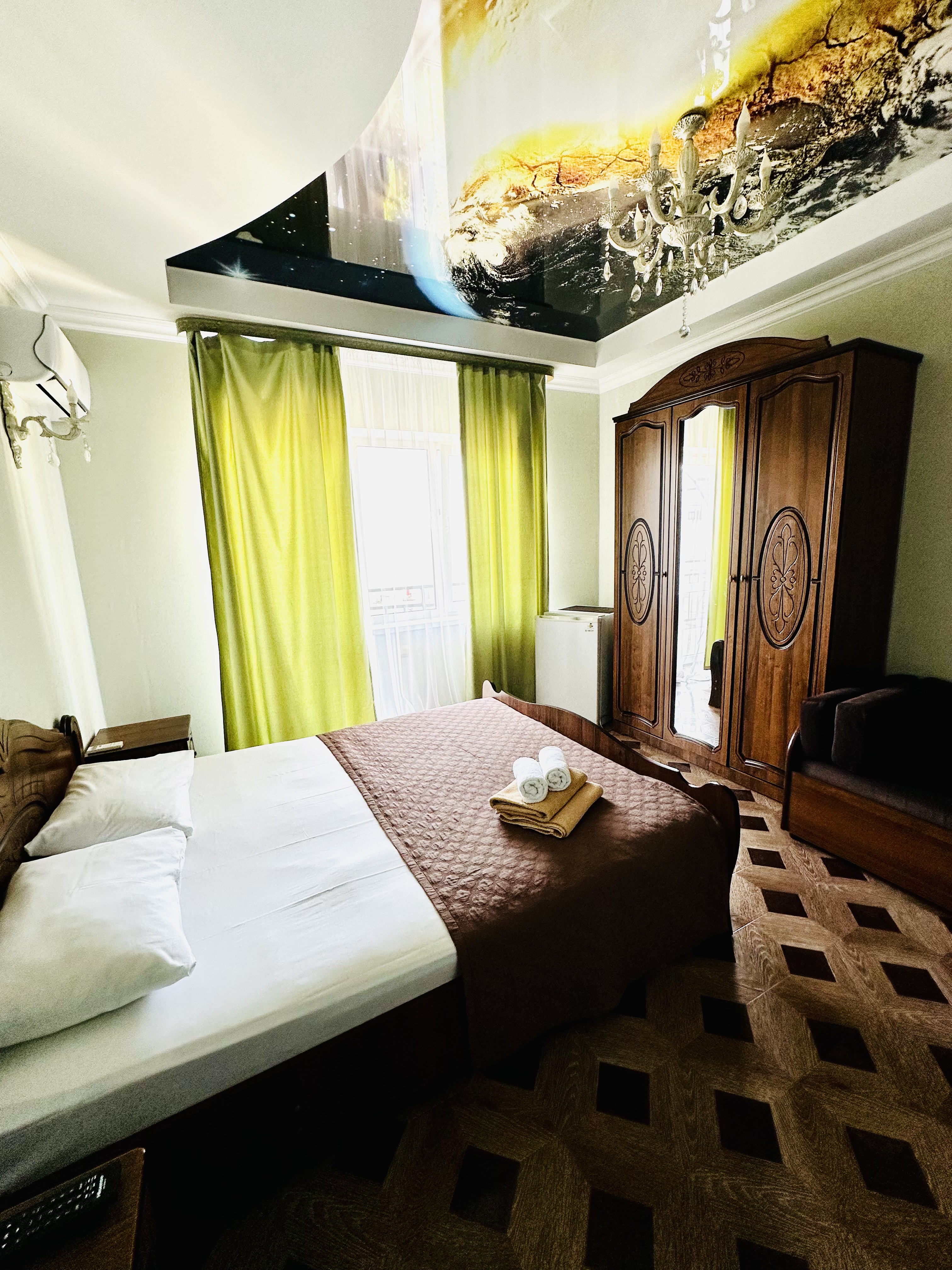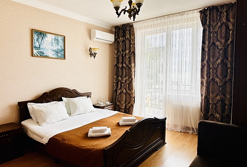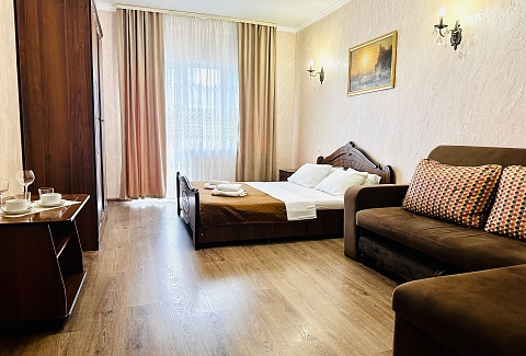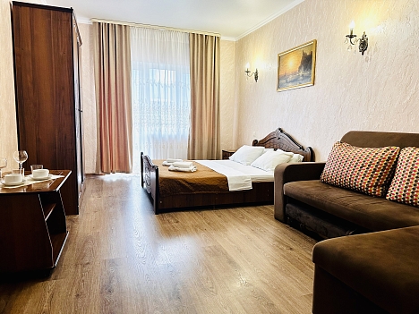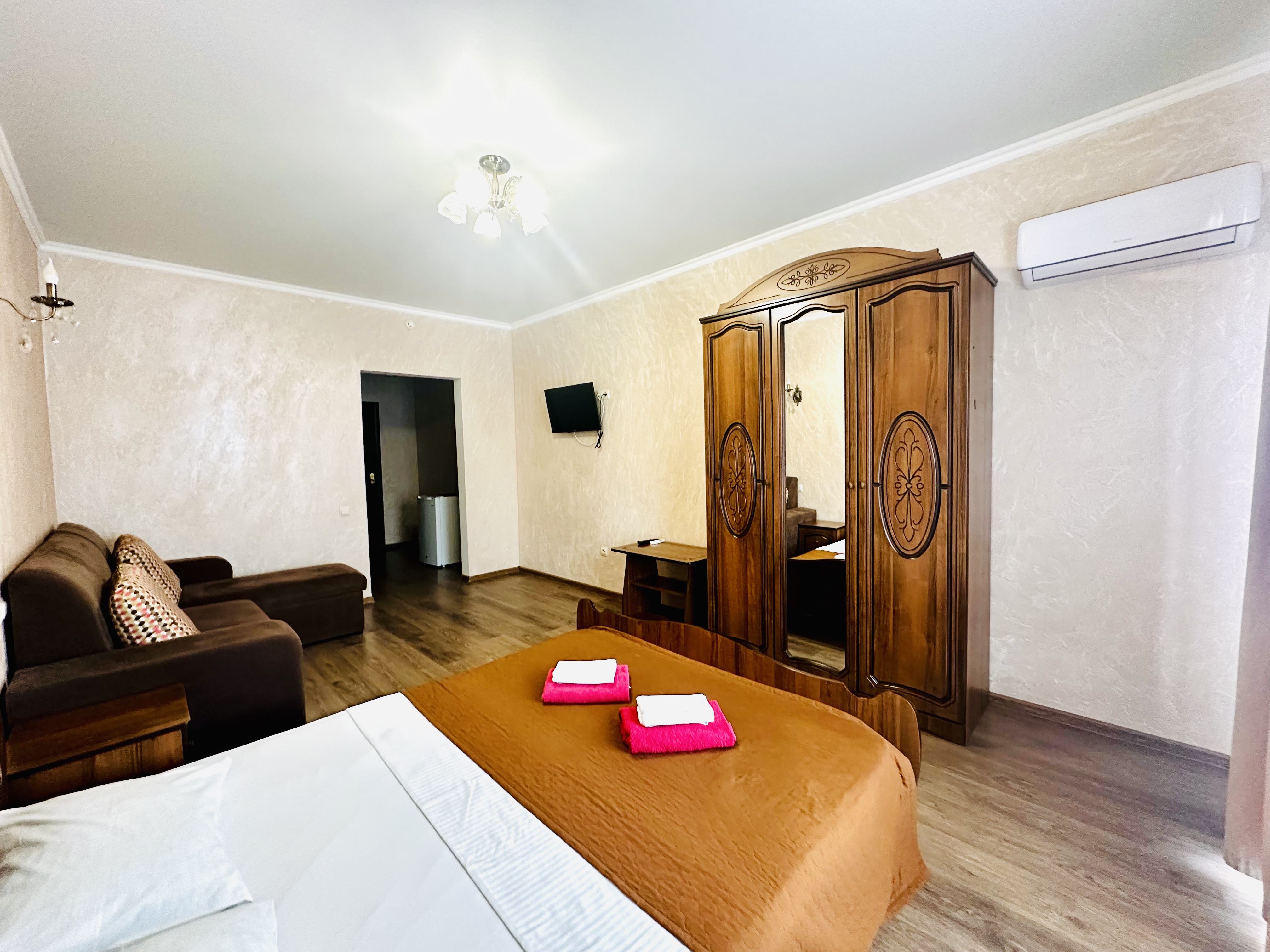 В номере: диван раскладной, кровать двуспальная, прикроватные тумбочки, стол, шкаф, кондиционер, телевизор ЖК, холодильник, чайный набор посуды