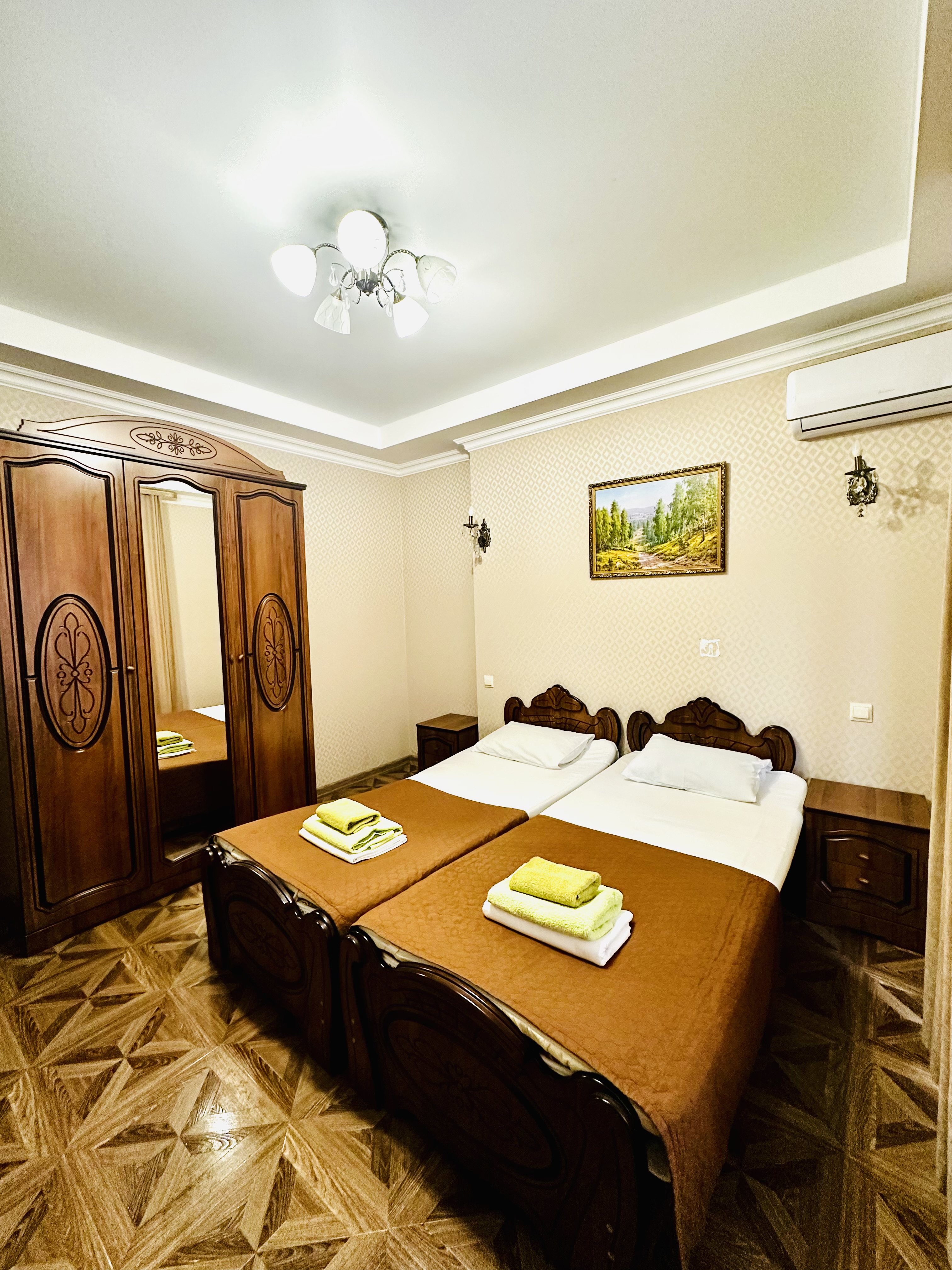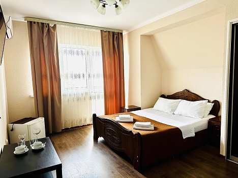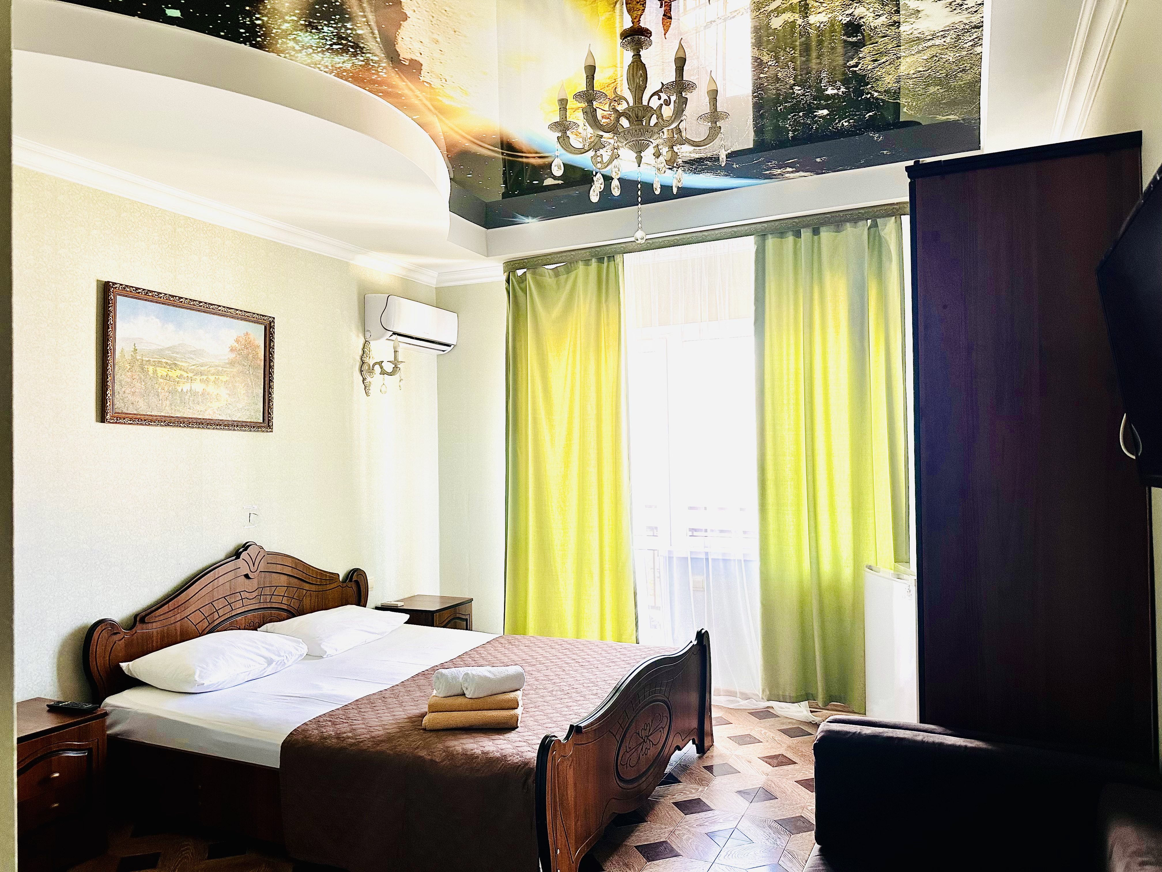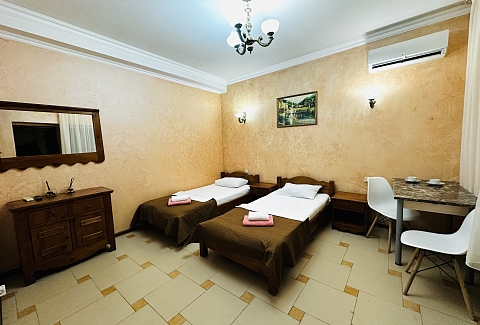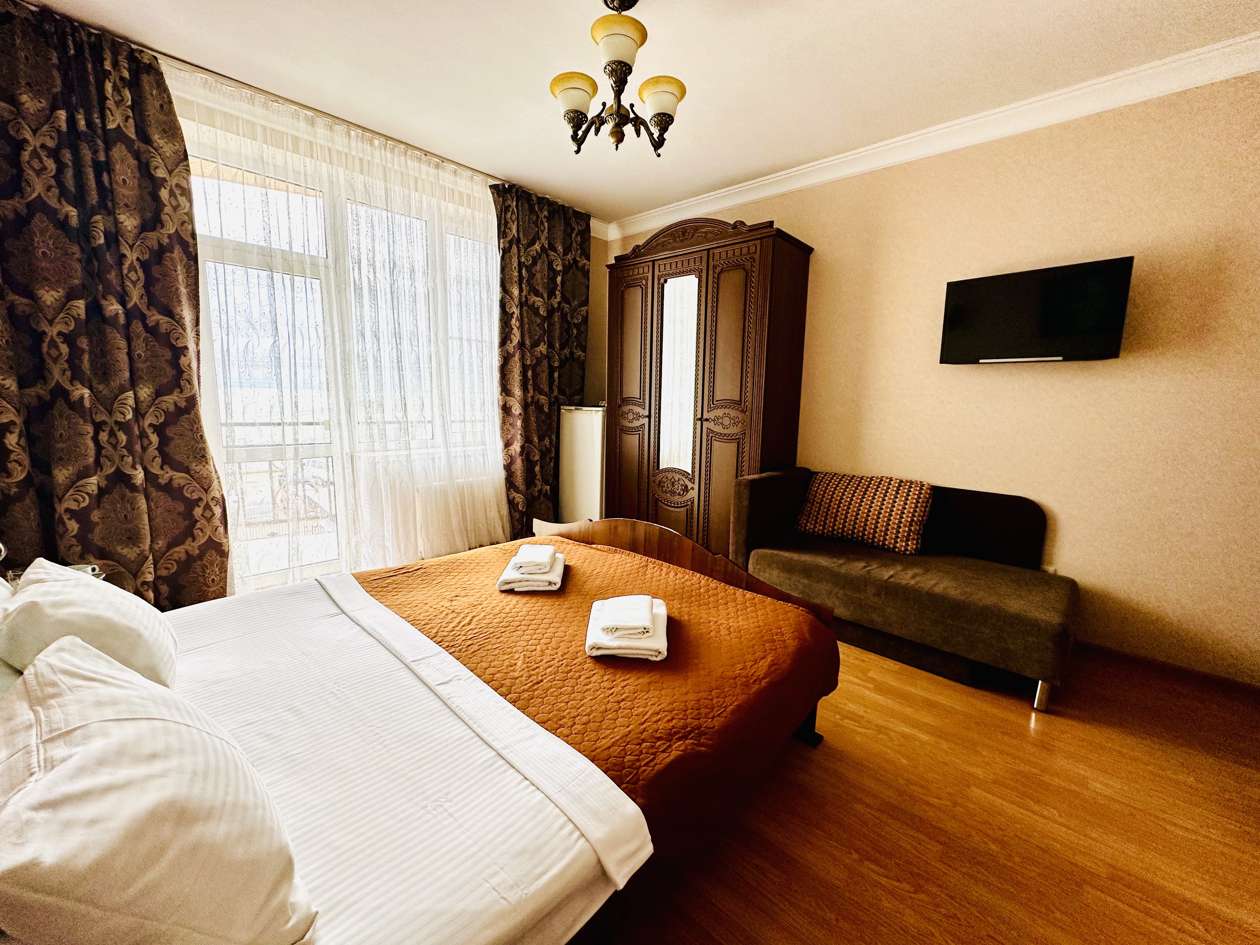 В номере: диван раскладной, кровать двуспальная, прикроватные тумбочки, стол, шкаф, кондиционер, телевизор ЖК, холодильник, чайный набор посуды