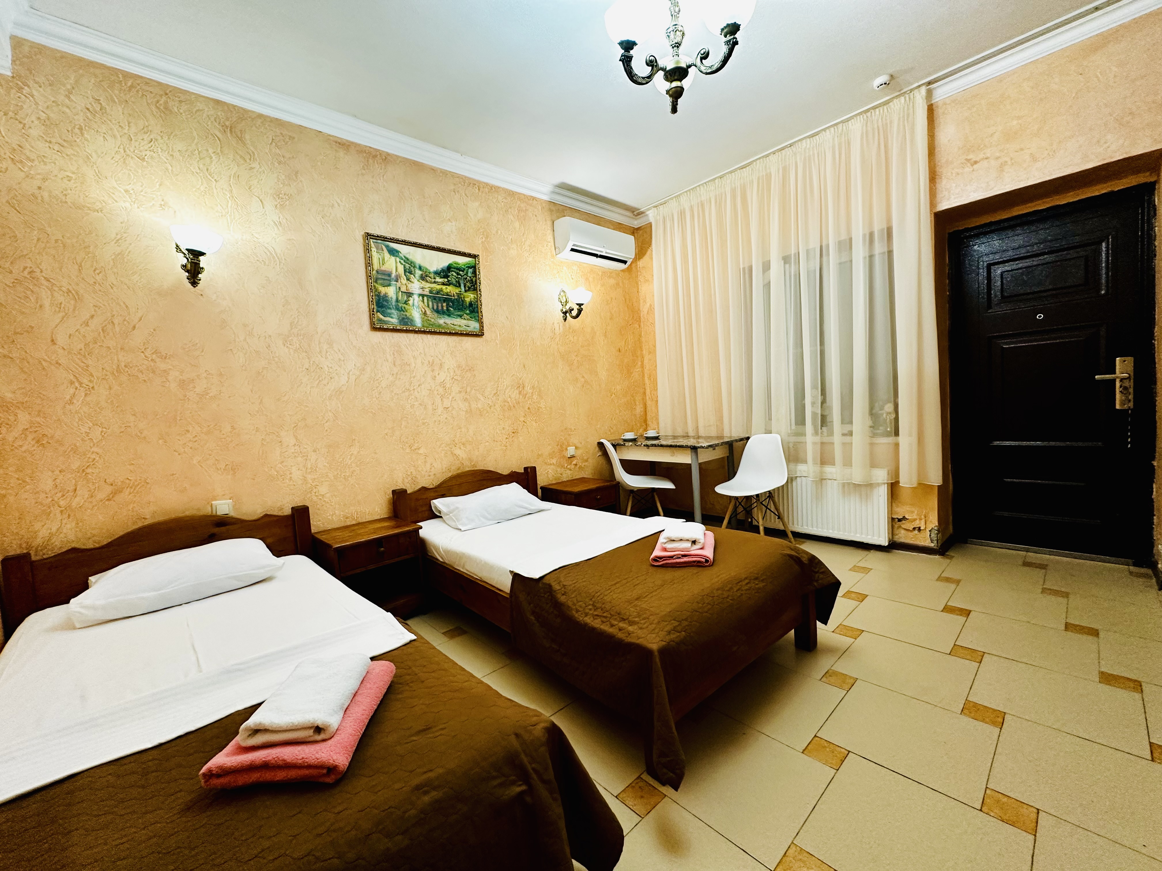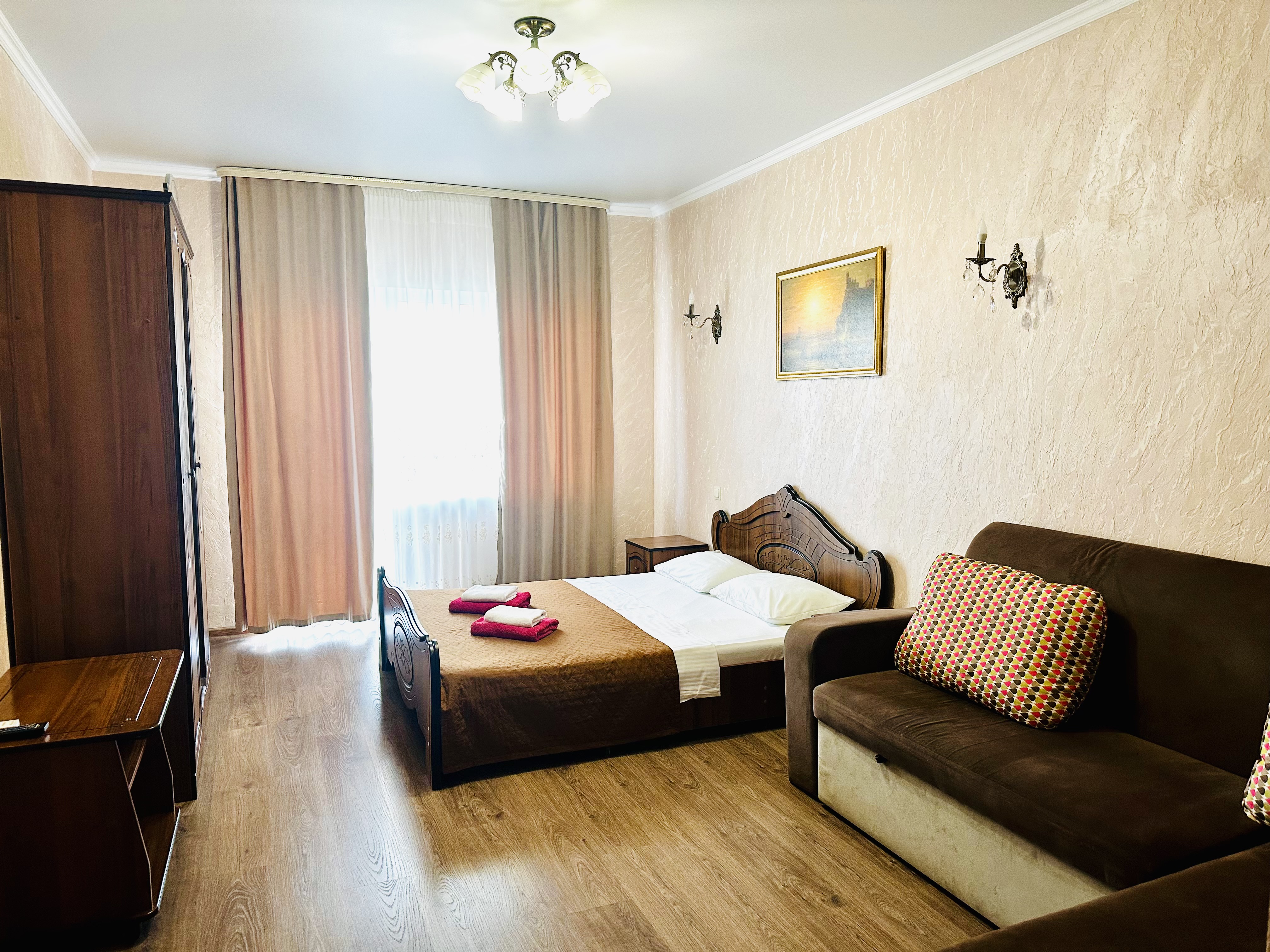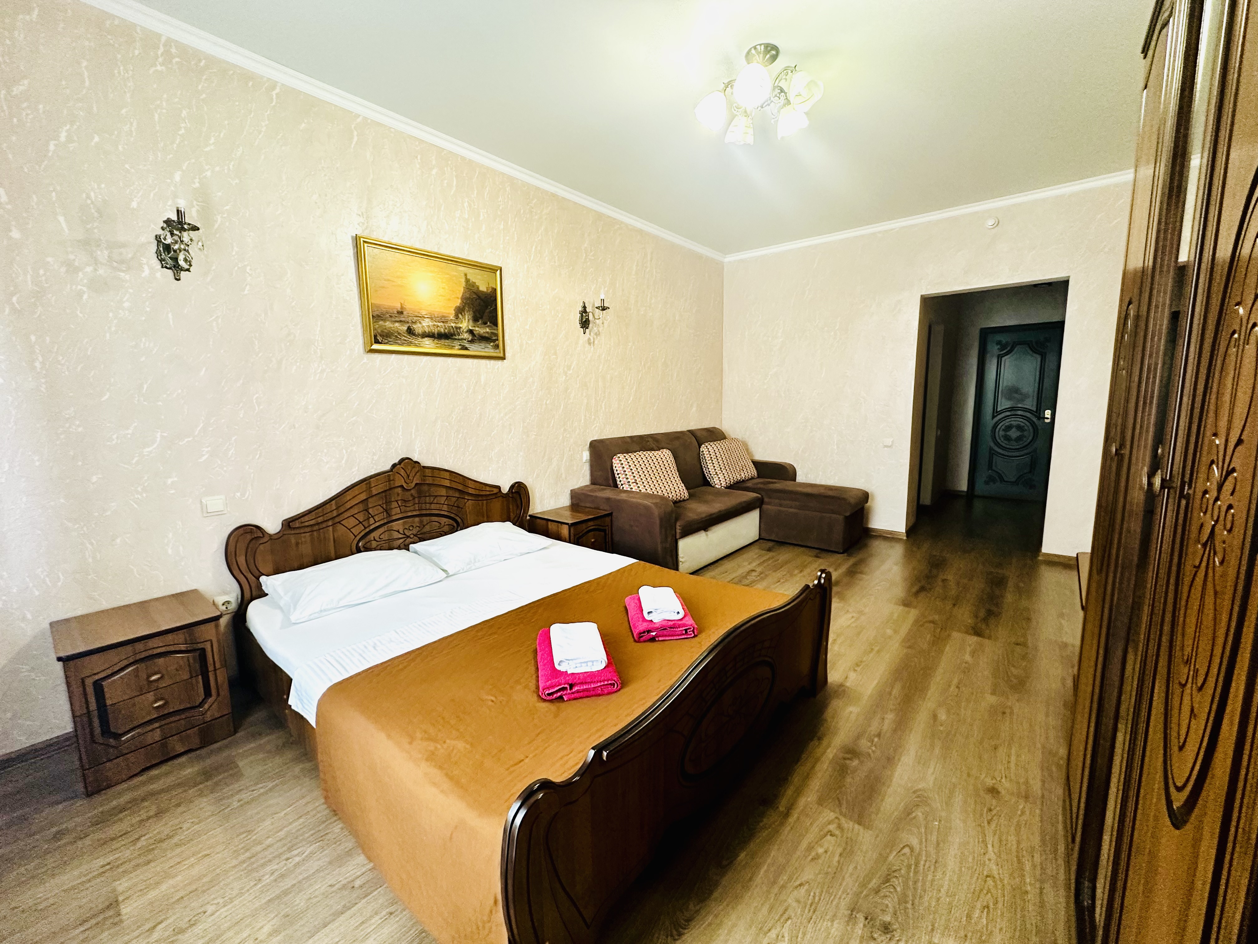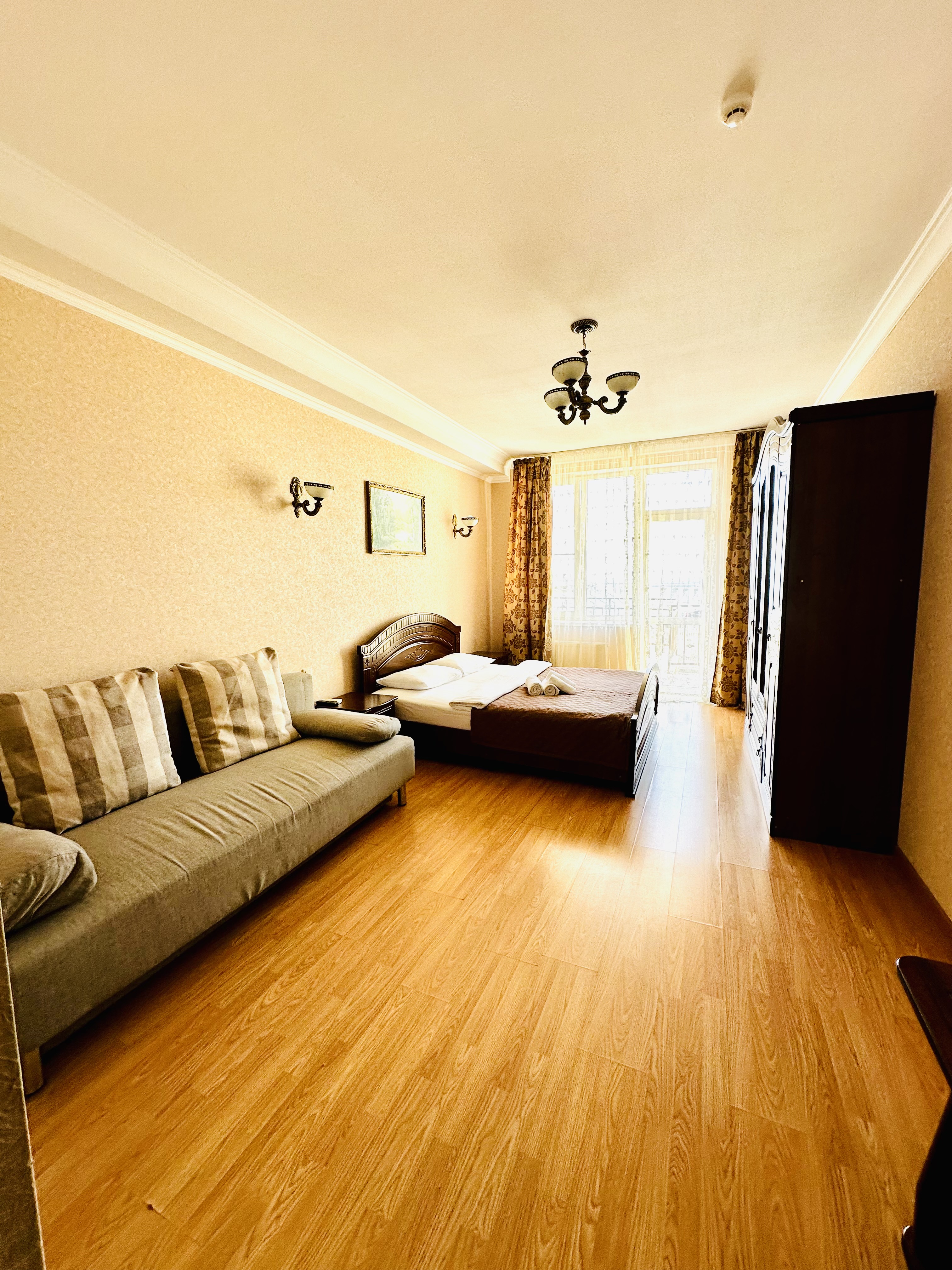 В номере: диван раскладной, кровать двуспальная, прикроватные тумбочки, стол, шкаф, кондиционер, телевизор ЖК, холодильник, чайный набор посуды