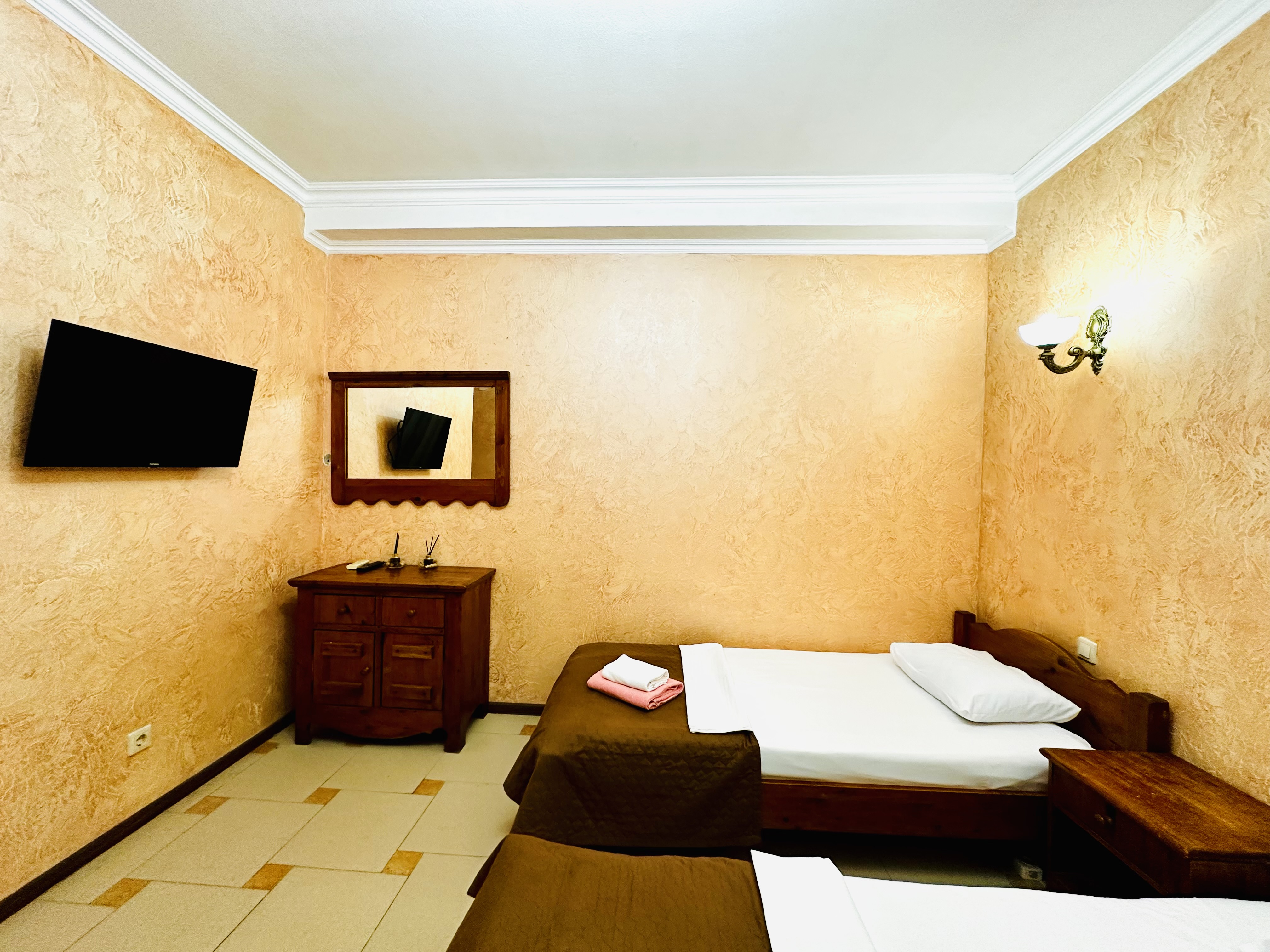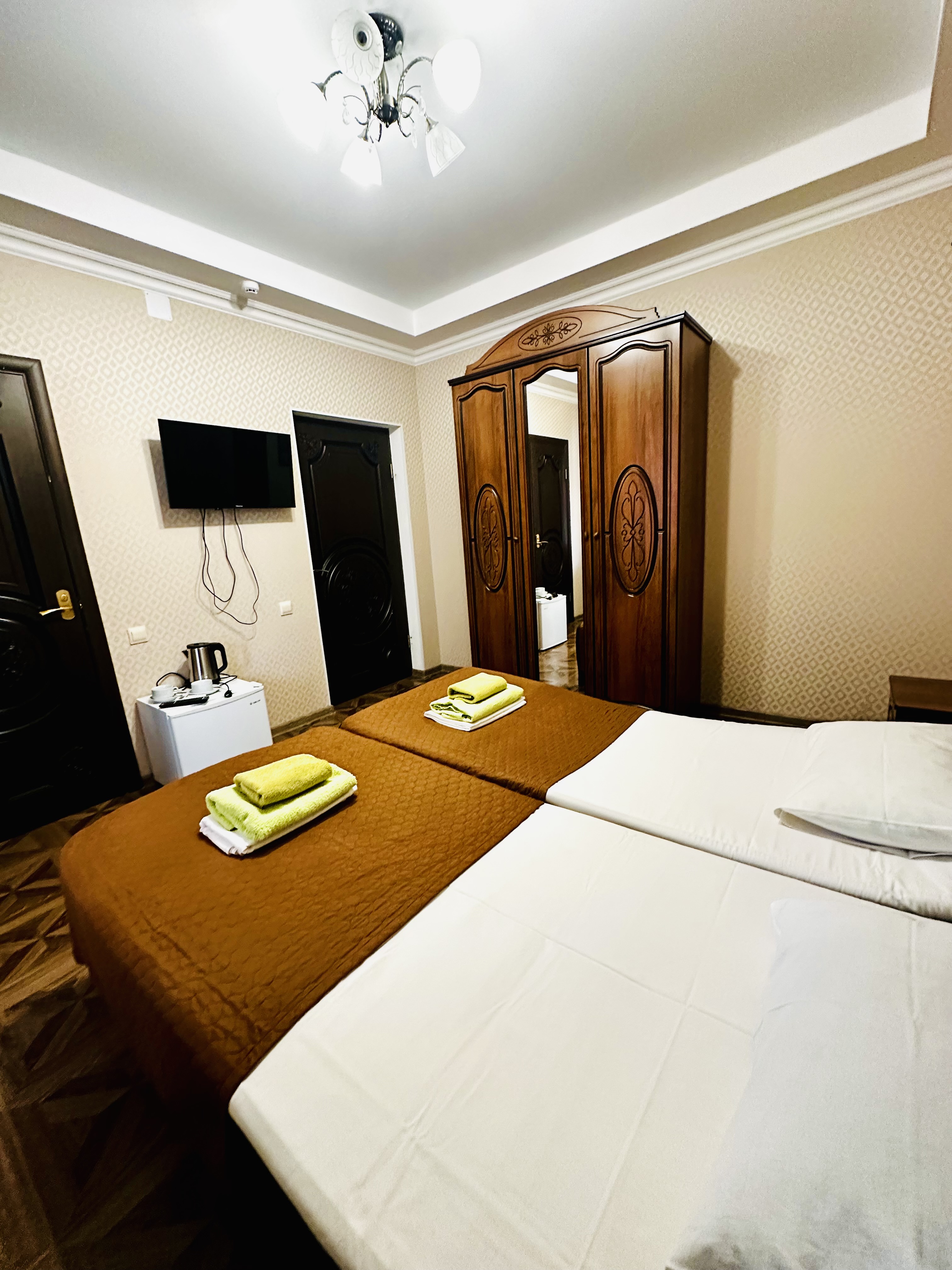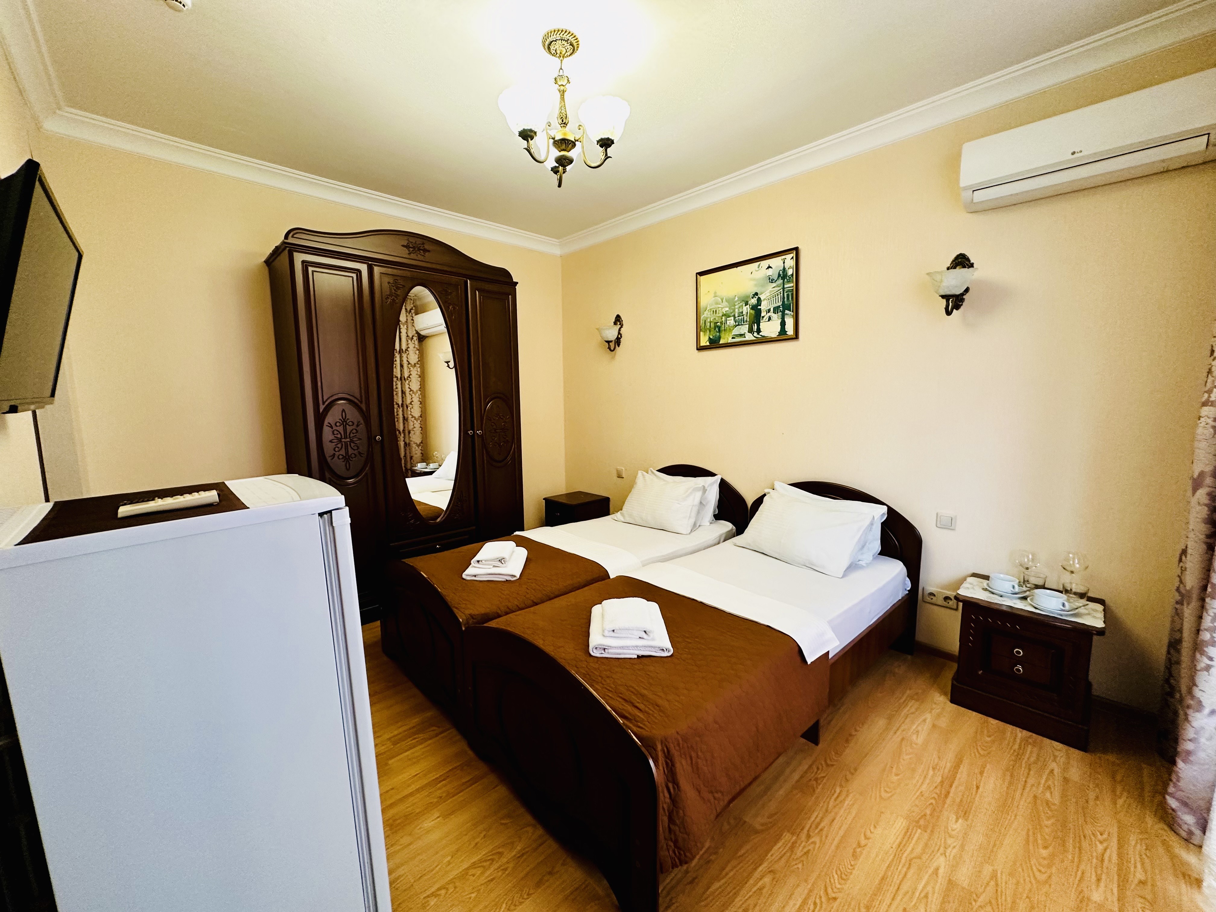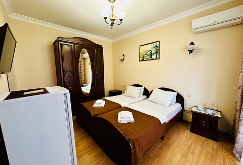 В номере: зеркало, кровати односпальные /одна двуспальная кровать, прикроватные тумбочки, шкаф, кондиционер, телевизор ЖК, холодильник, чайный набор посуды