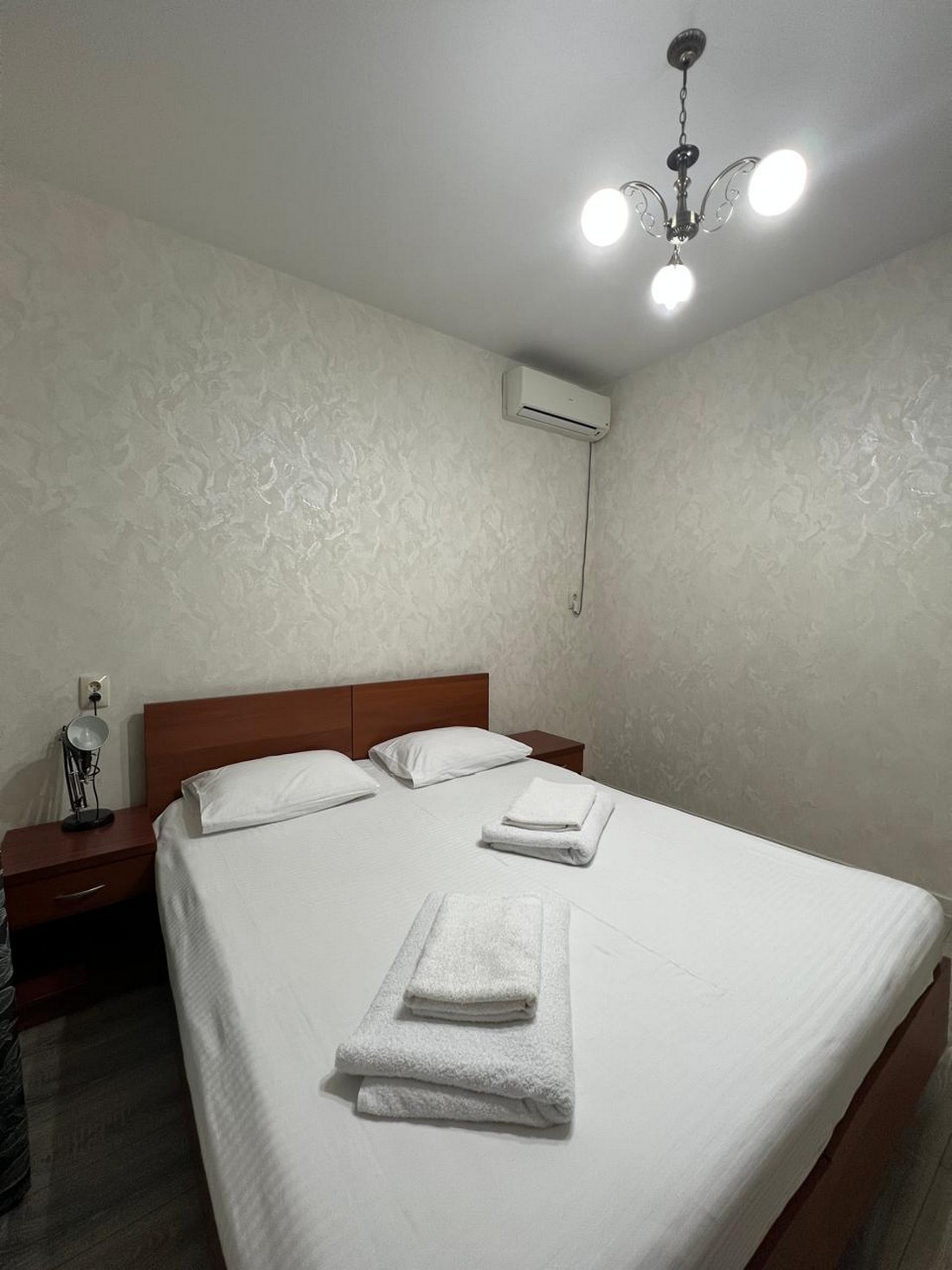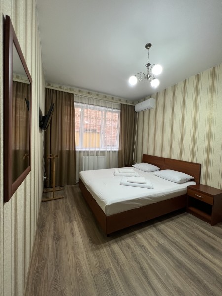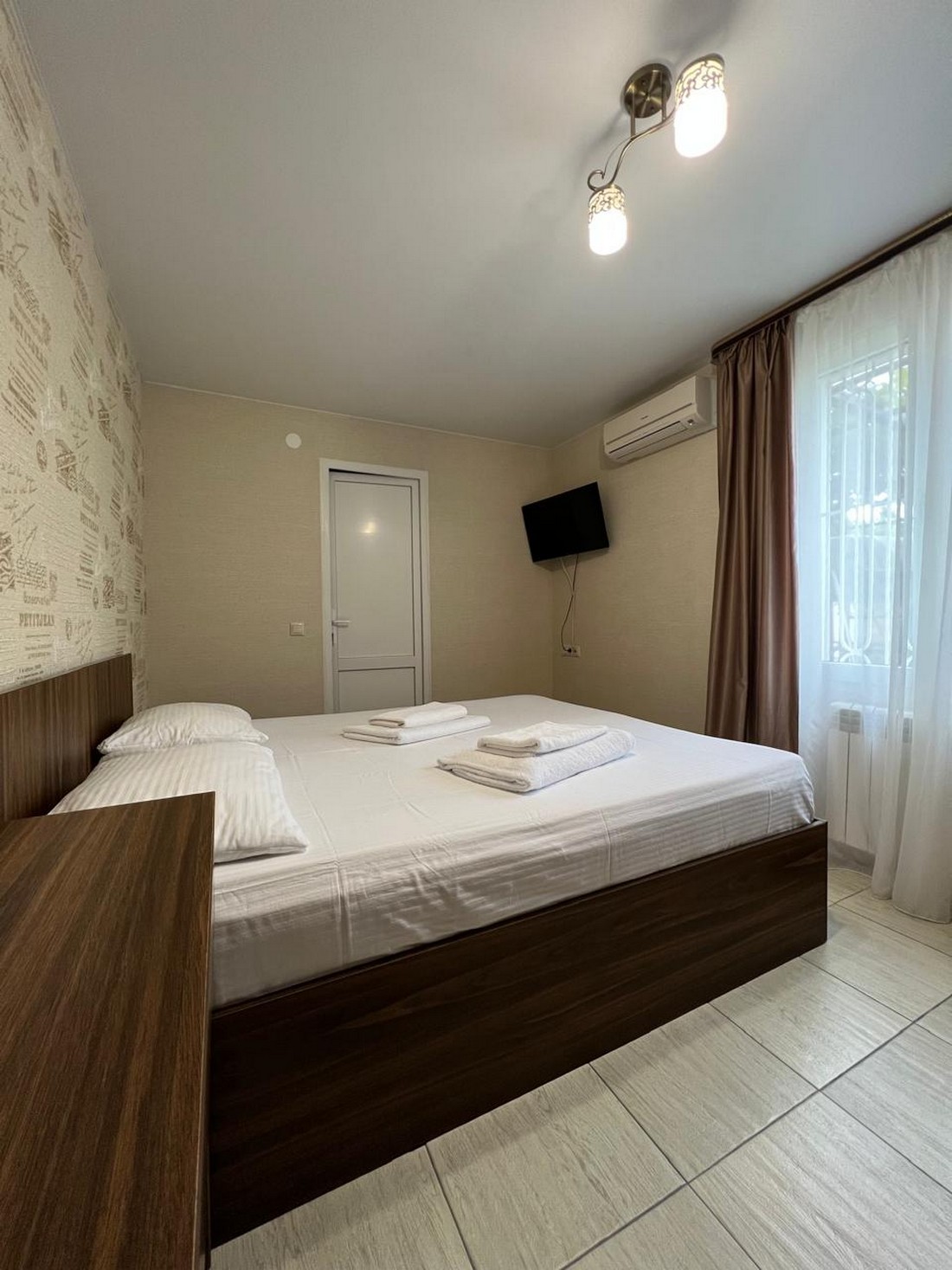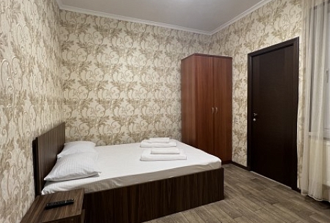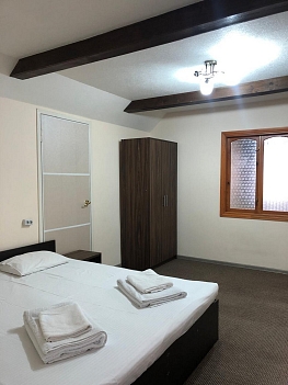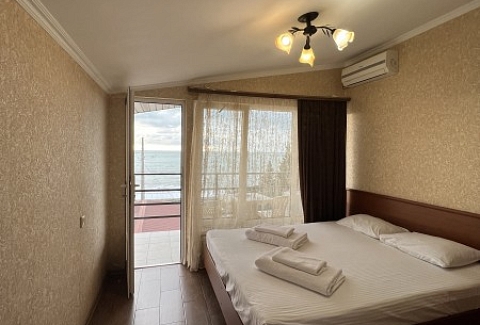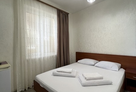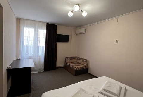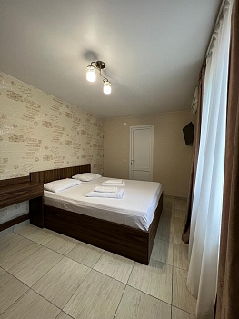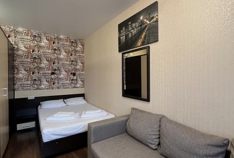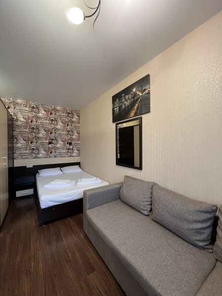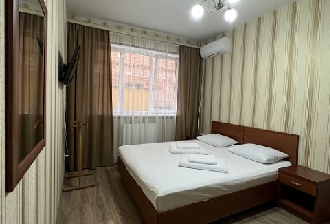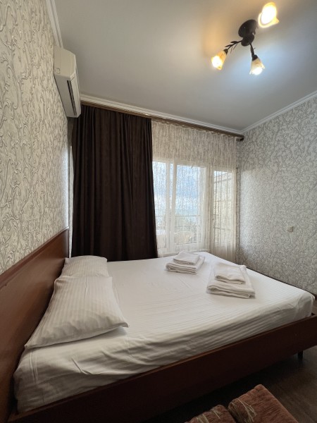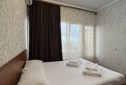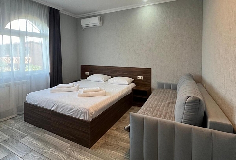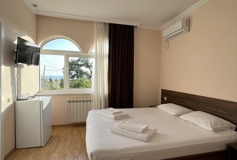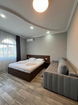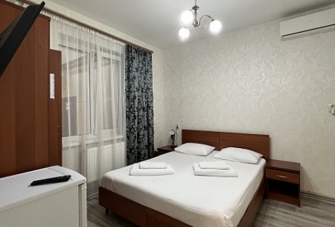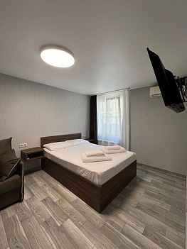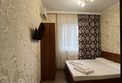 В номере: вешалка, диван раскладной, кровать двуспальная, шкаф, микроволновая печь, набор посуды, плита электрическая, сейф, сплит-система, телевизор, холодильник, чайник, чайный набор посуды