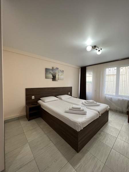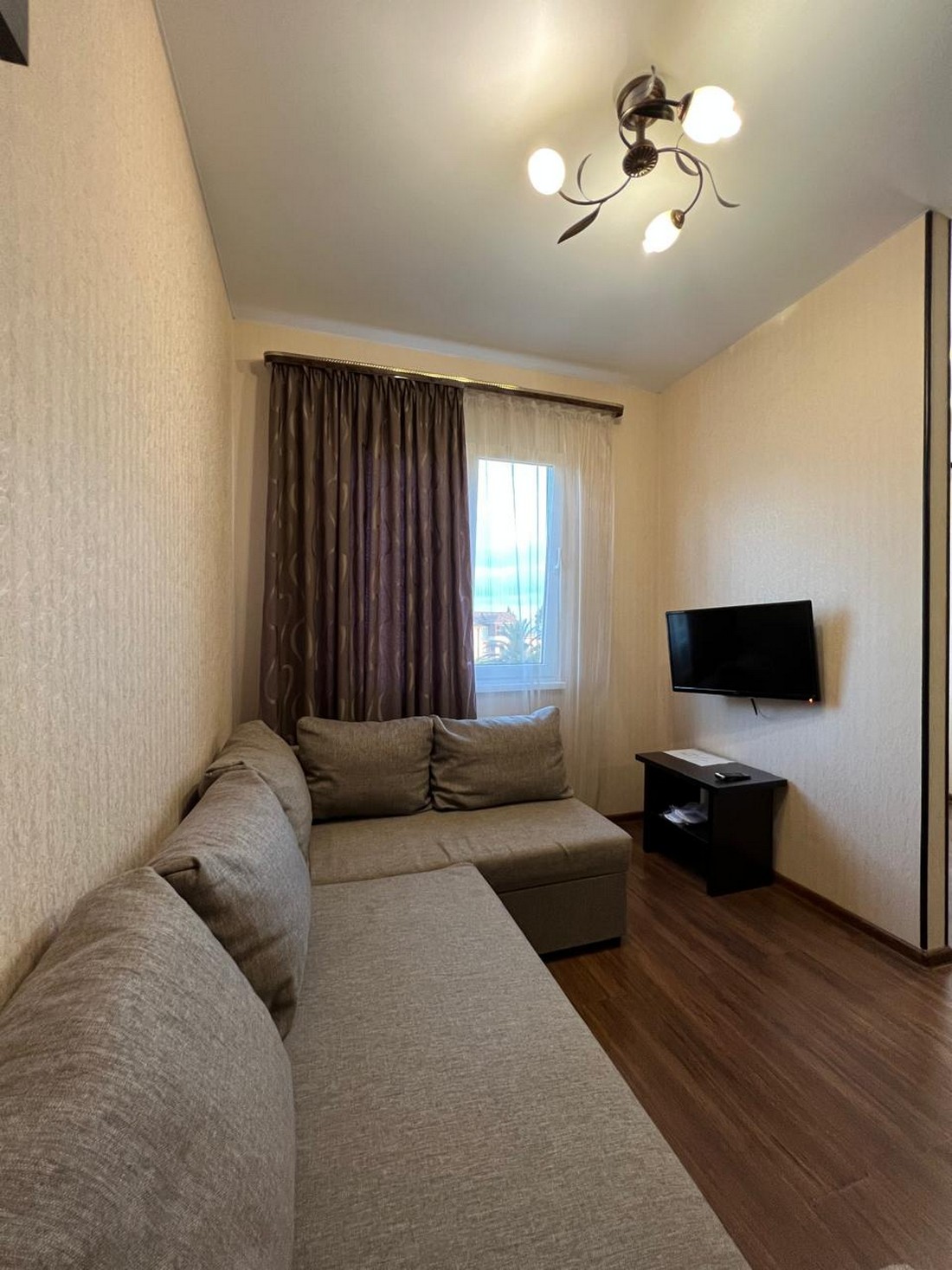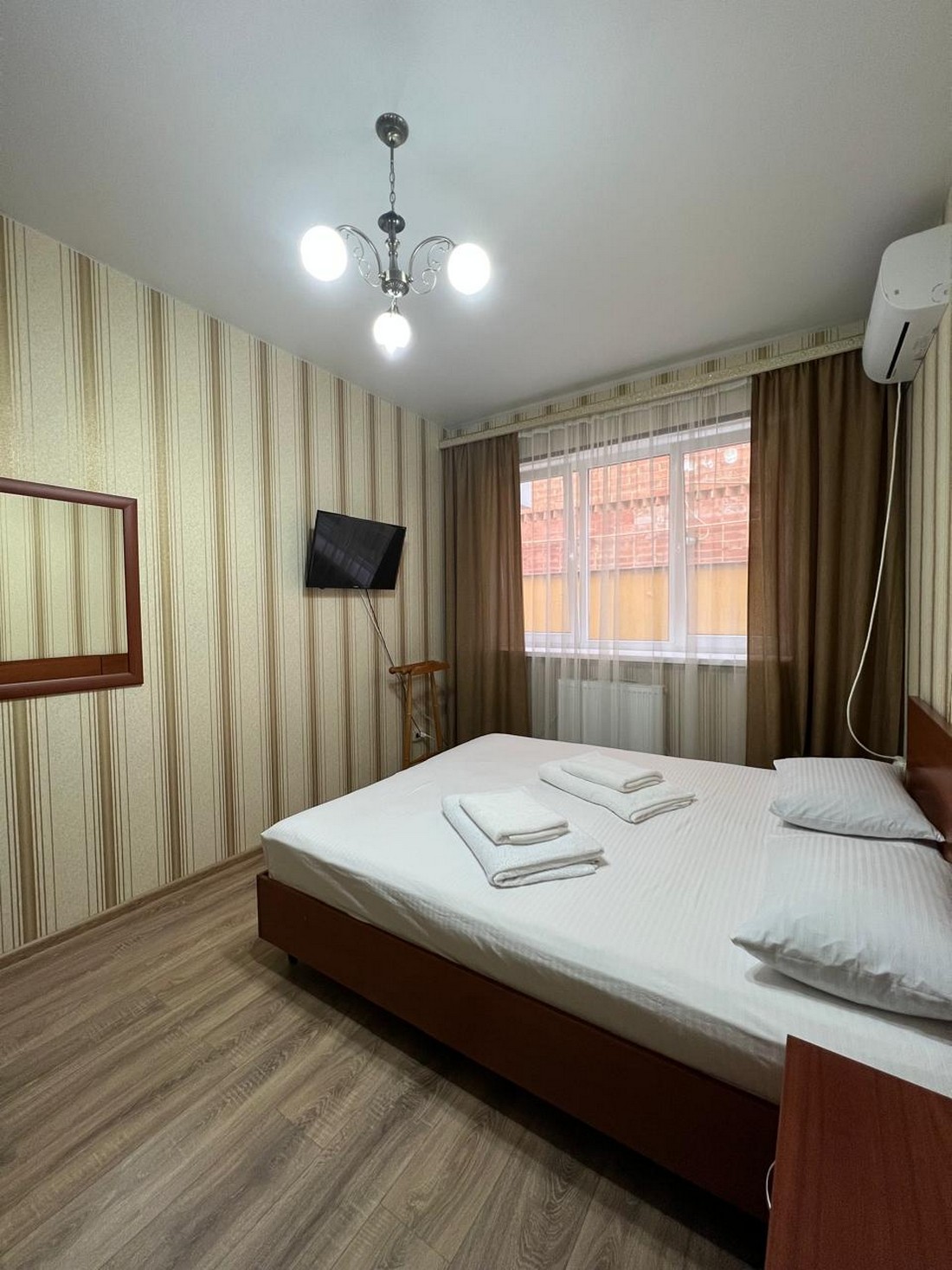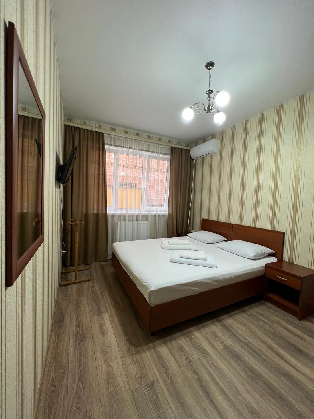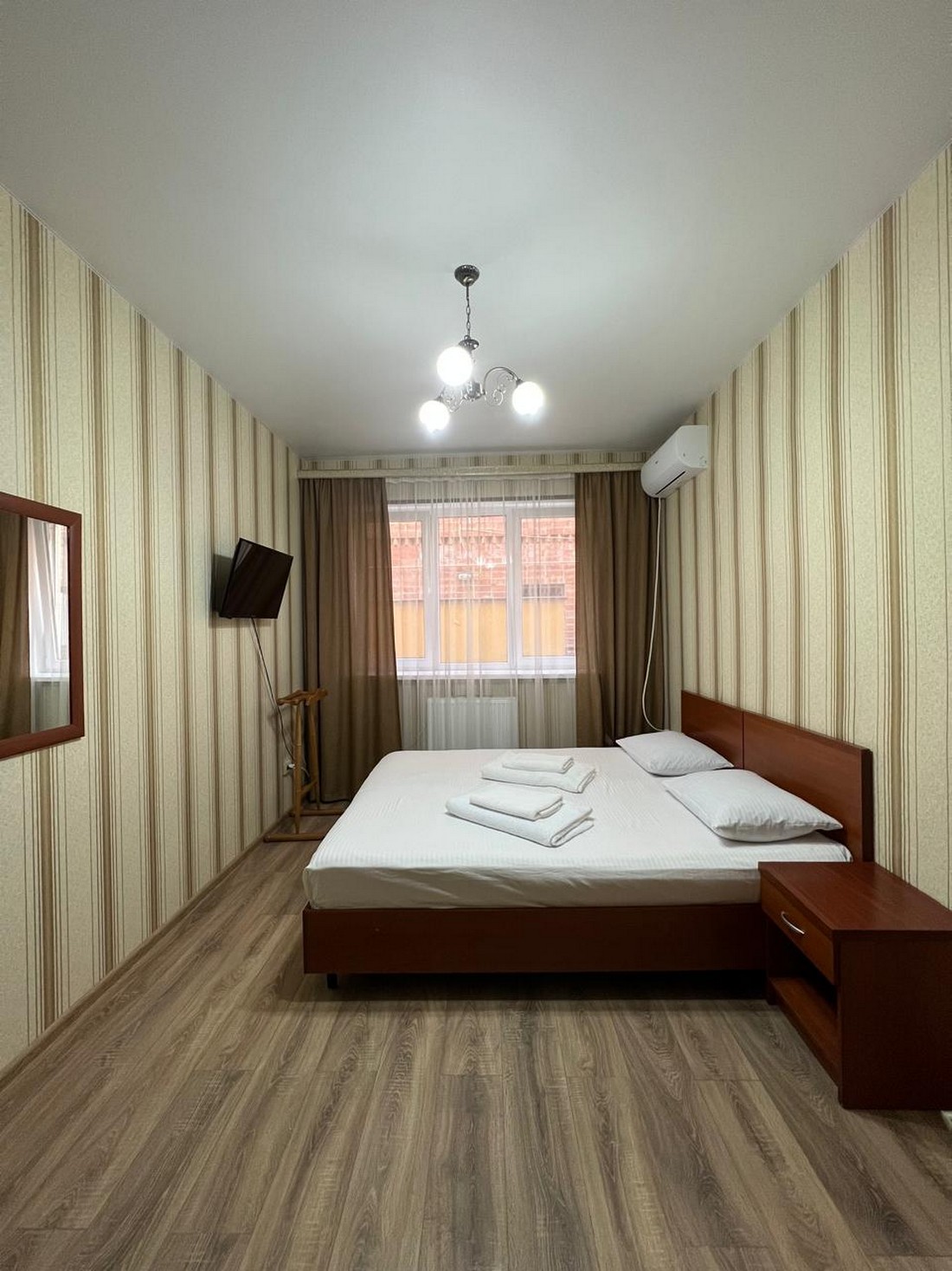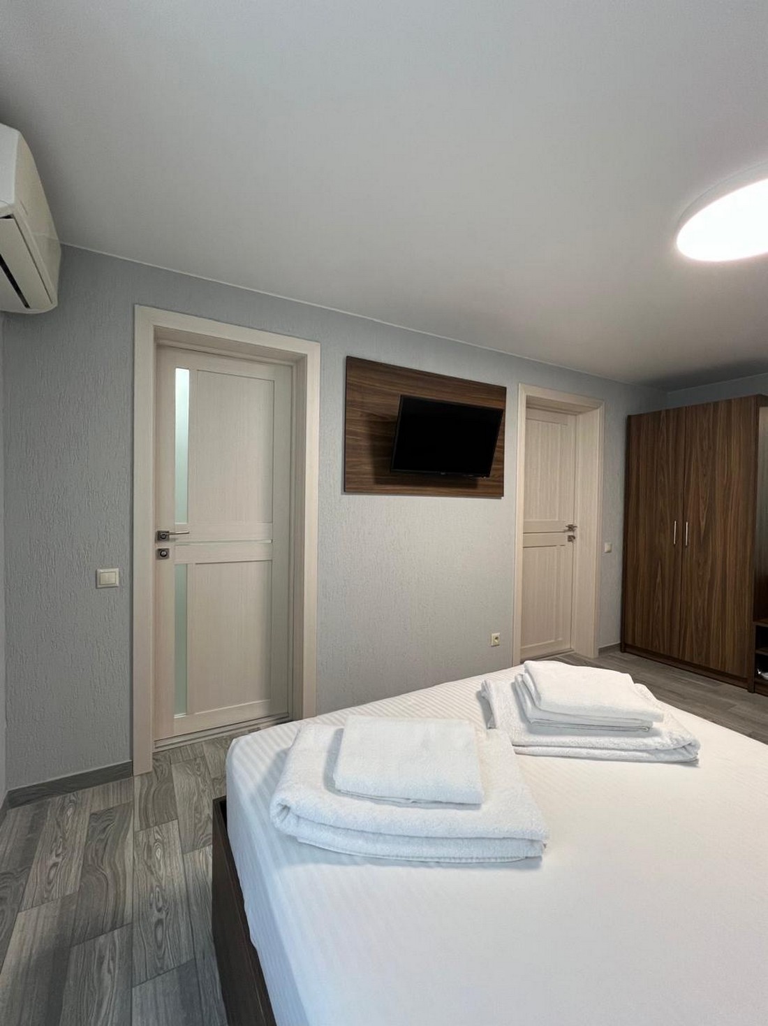 В номере: вешалка, диван раскладной, кровать двуспальная, шкаф, микроволновая печь, набор посуды, плита электрическая, сейф, сплит-система, телевизор, холодильник, чайник, чайный набор посуды
