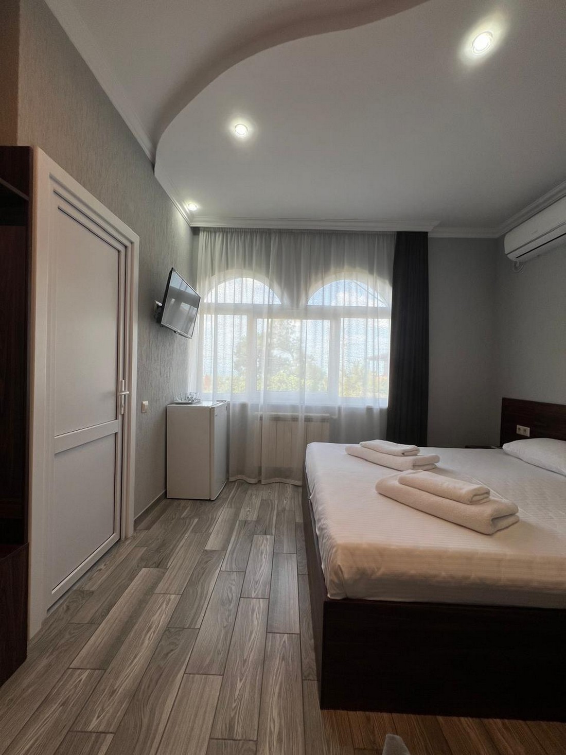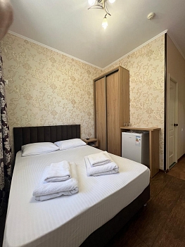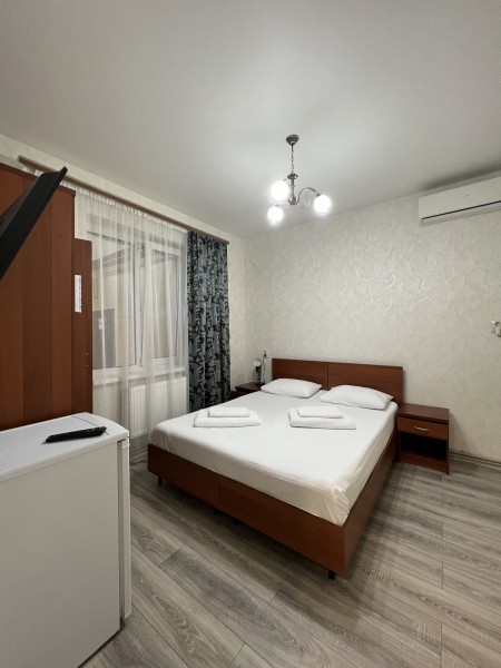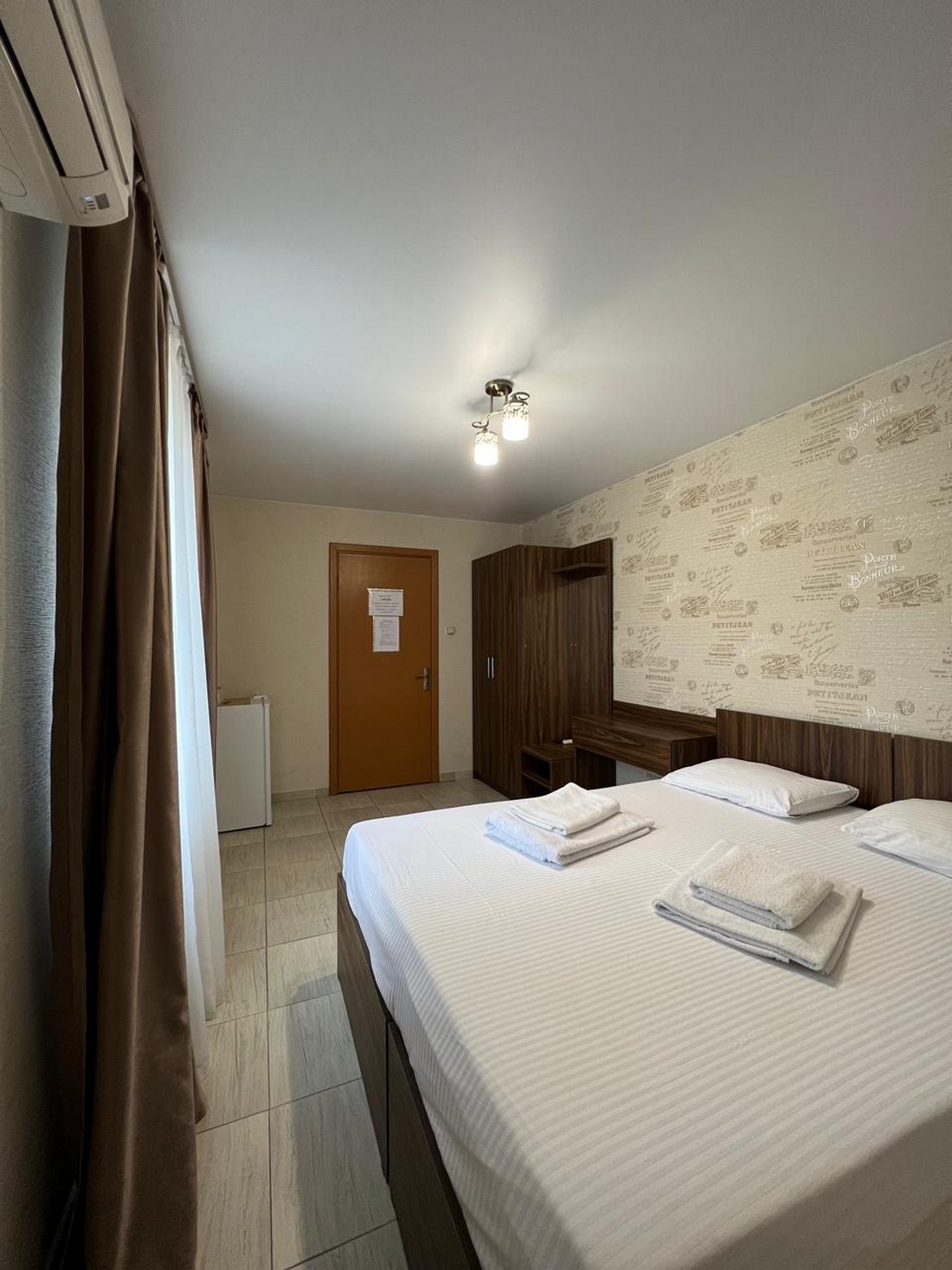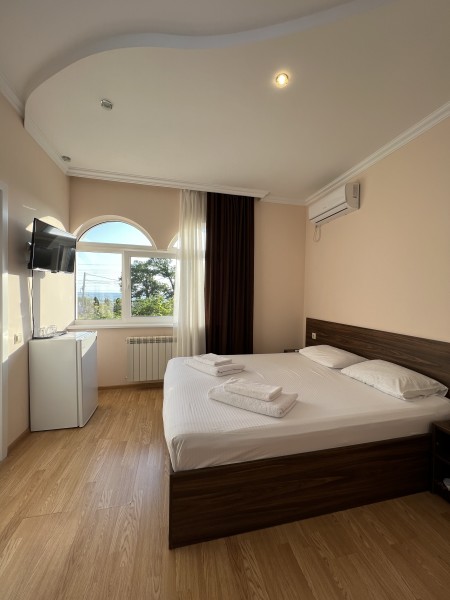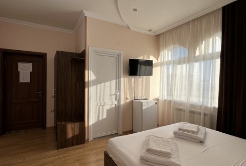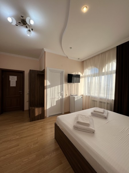 В номере: вешалка, кровать двуспальная, шкаф, сейф, сплит-система, телевизор, холодильник