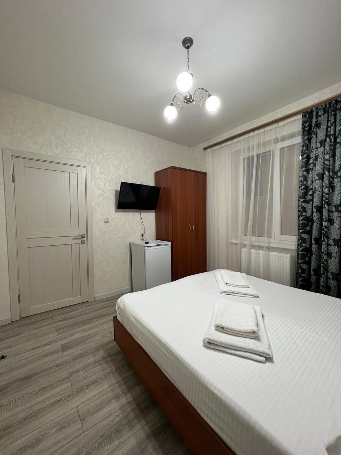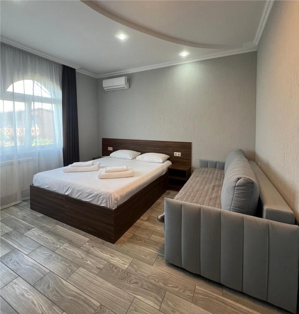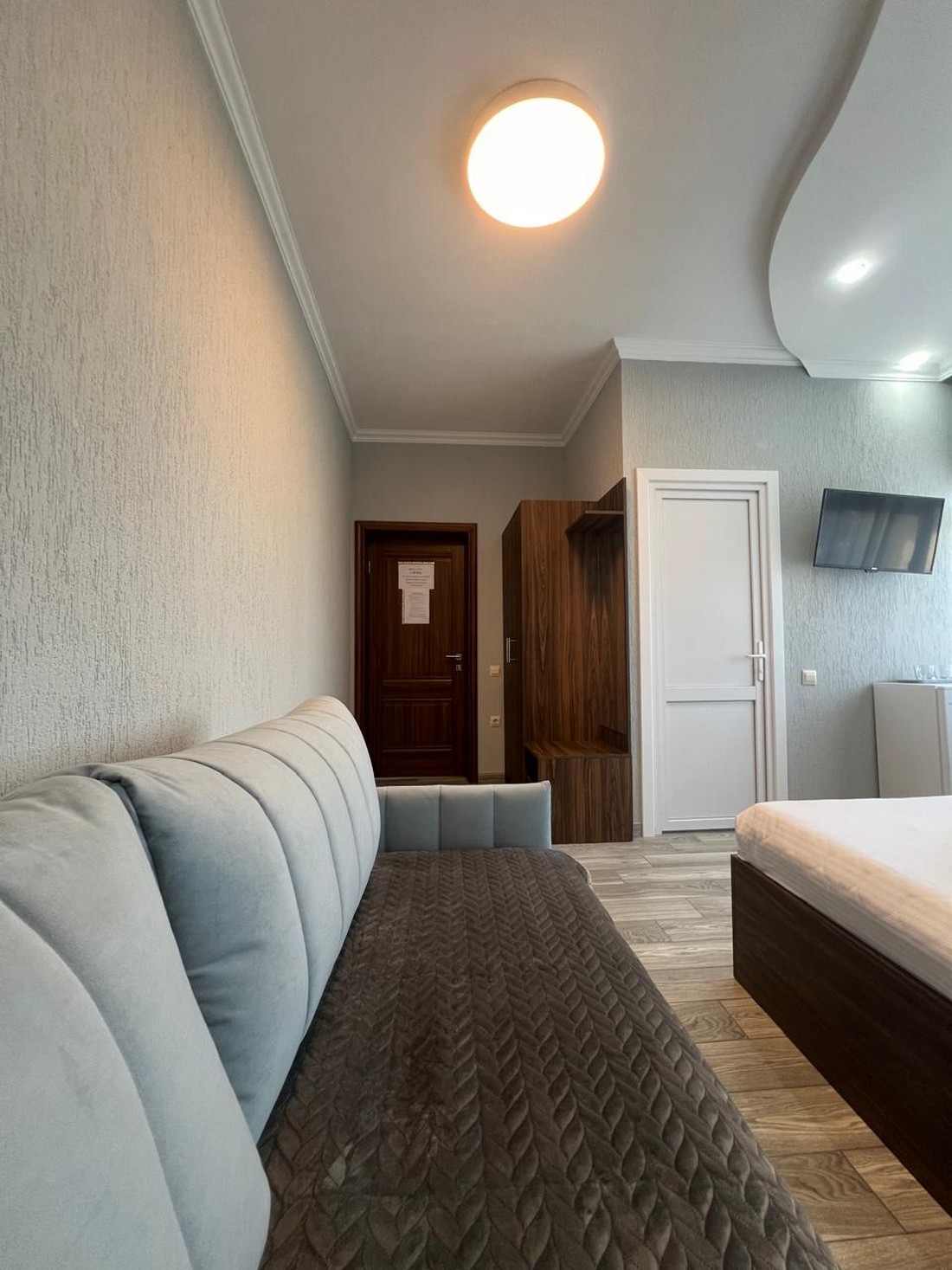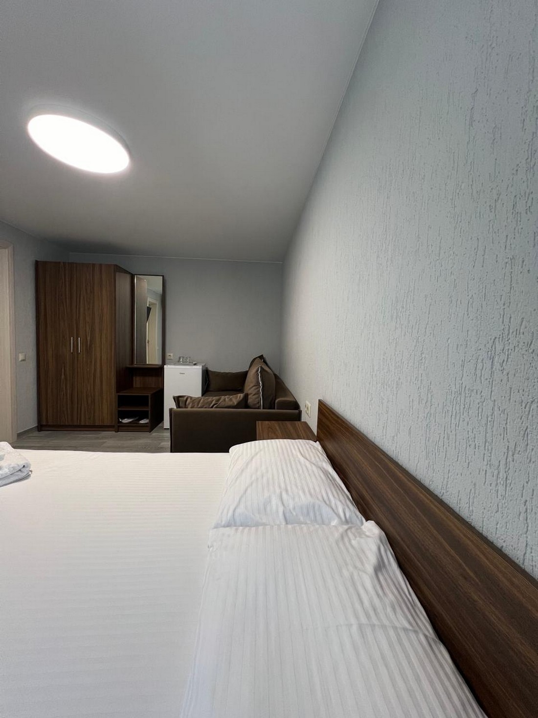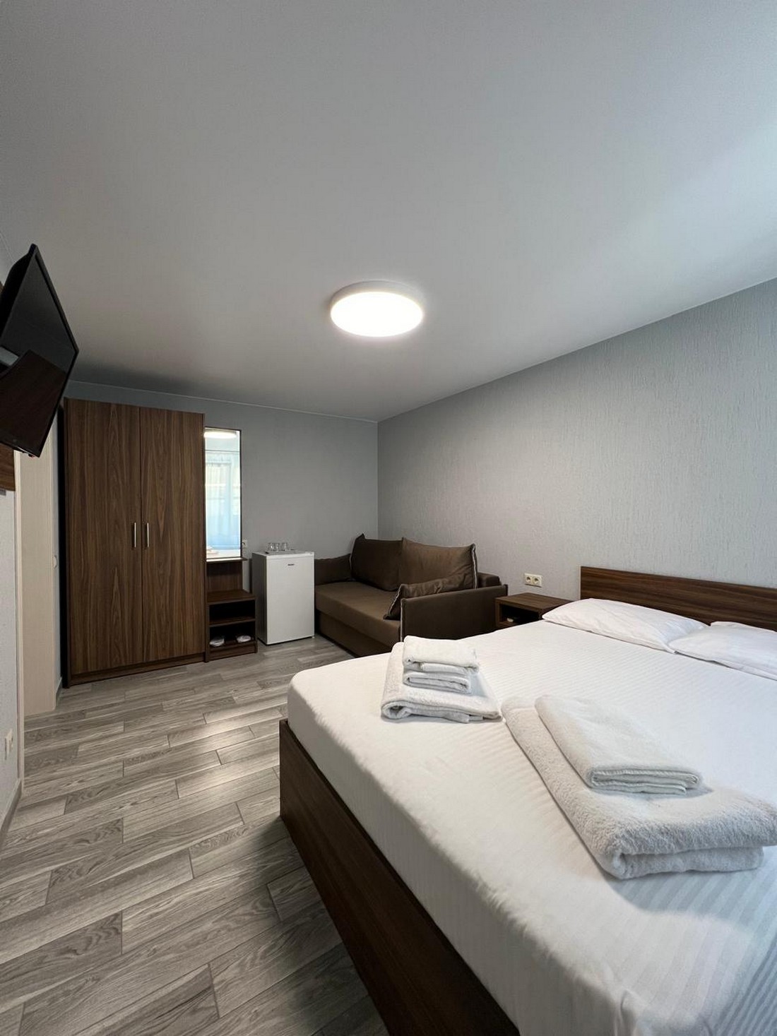 В номере: вешалка, диван, кровать двуспальная, шкаф, сплит-система, телевизор, холодильник