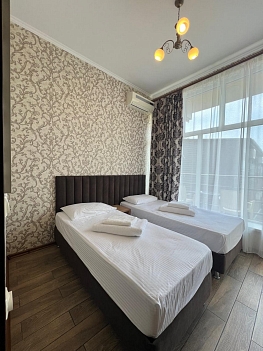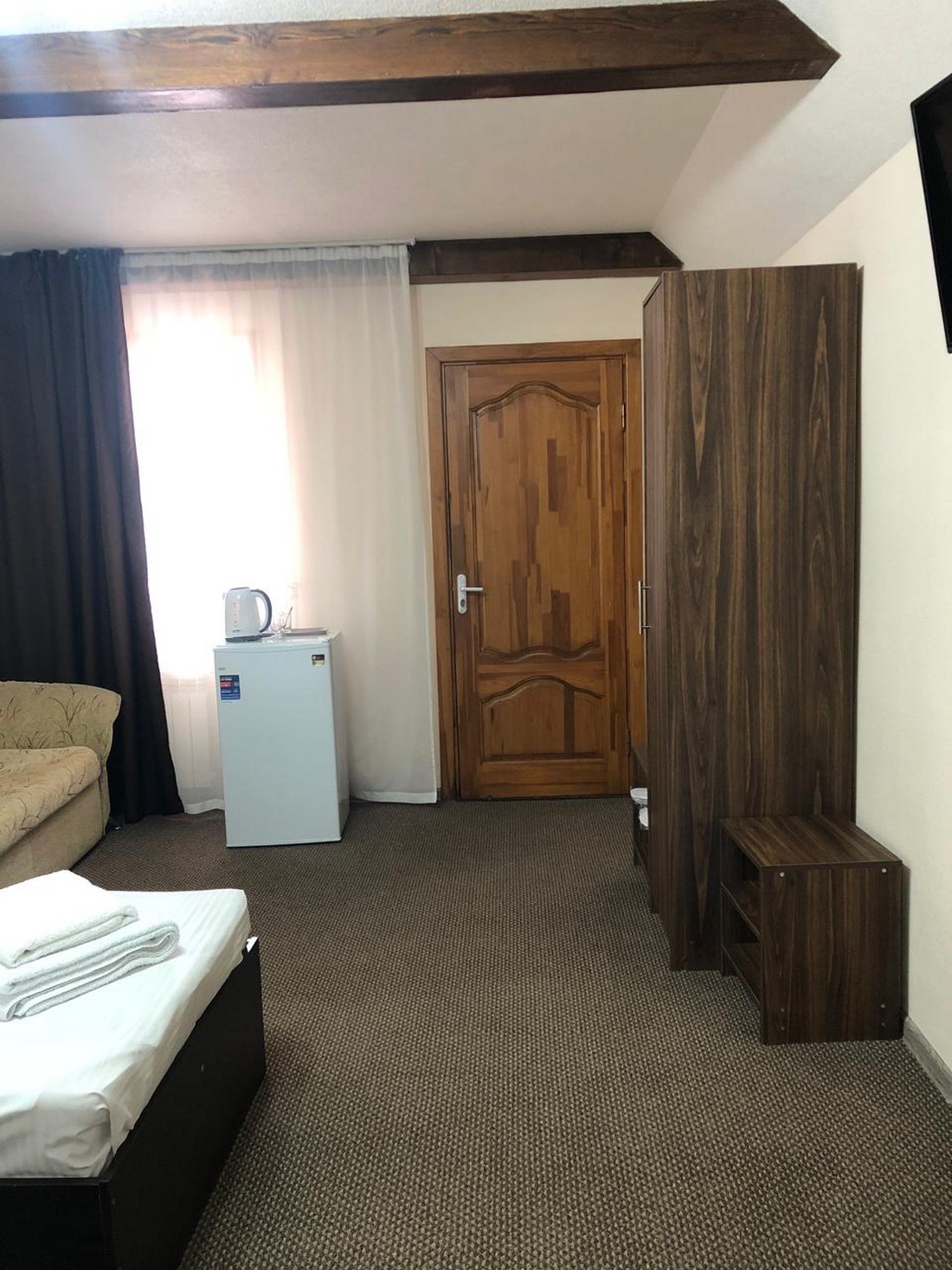 В номере: вешалка, диван, кровати односпальные, кровать двуспальная, шкаф, микроволновая печь, набор посуды, сейф, сплит-система, телевизор, холодильник, чайник