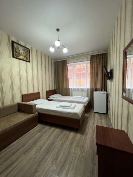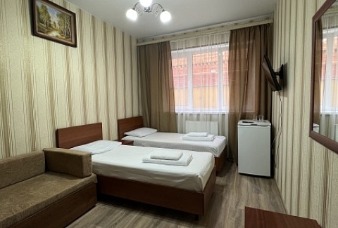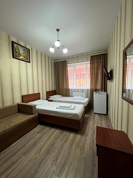 В номере: вешалка, кровати односпальные, кровать двуспальная, шкаф, сплит-система, телевизор, холодильник