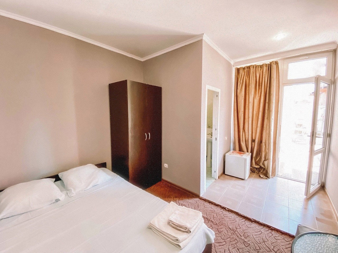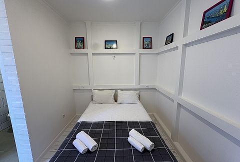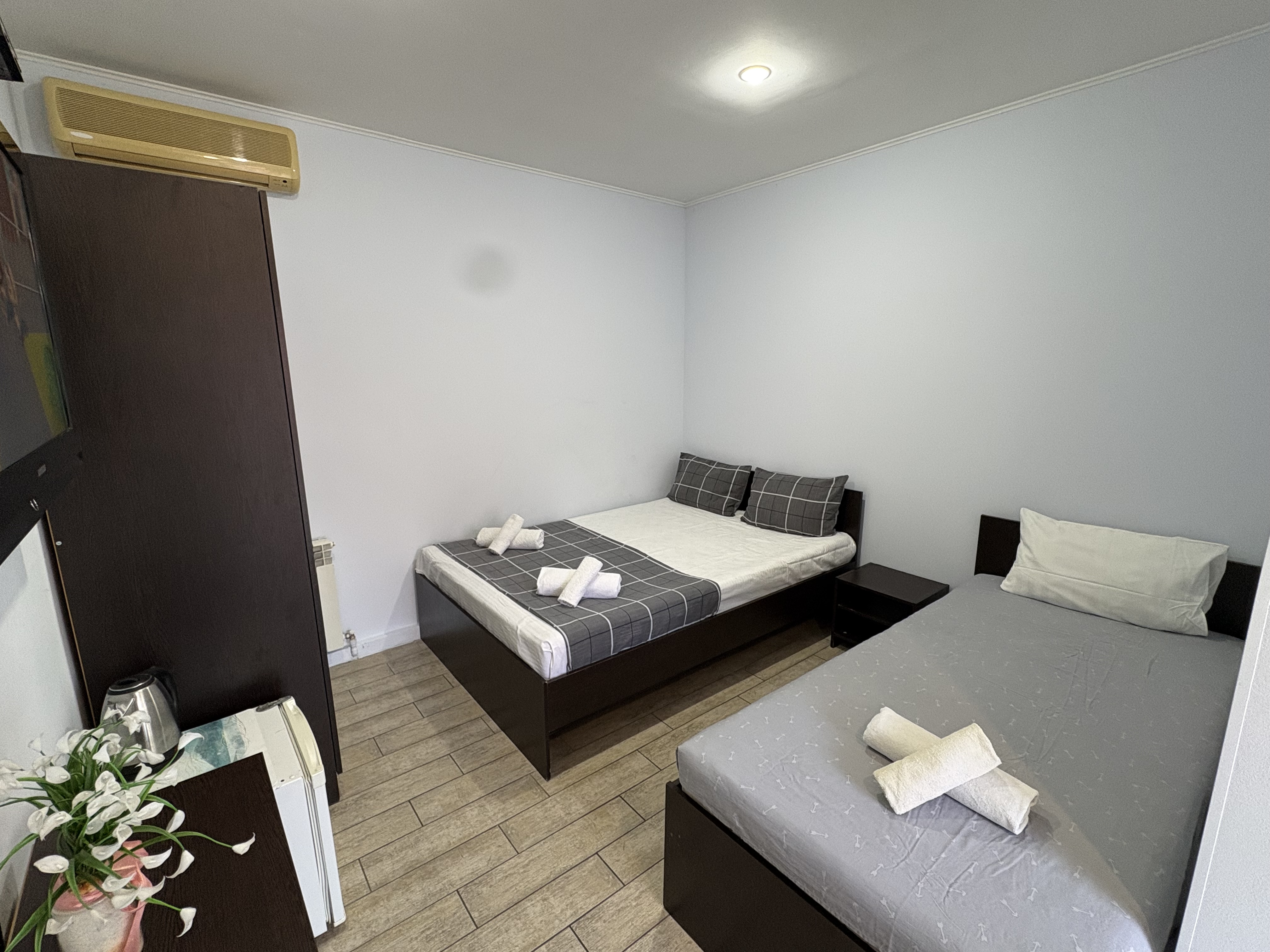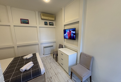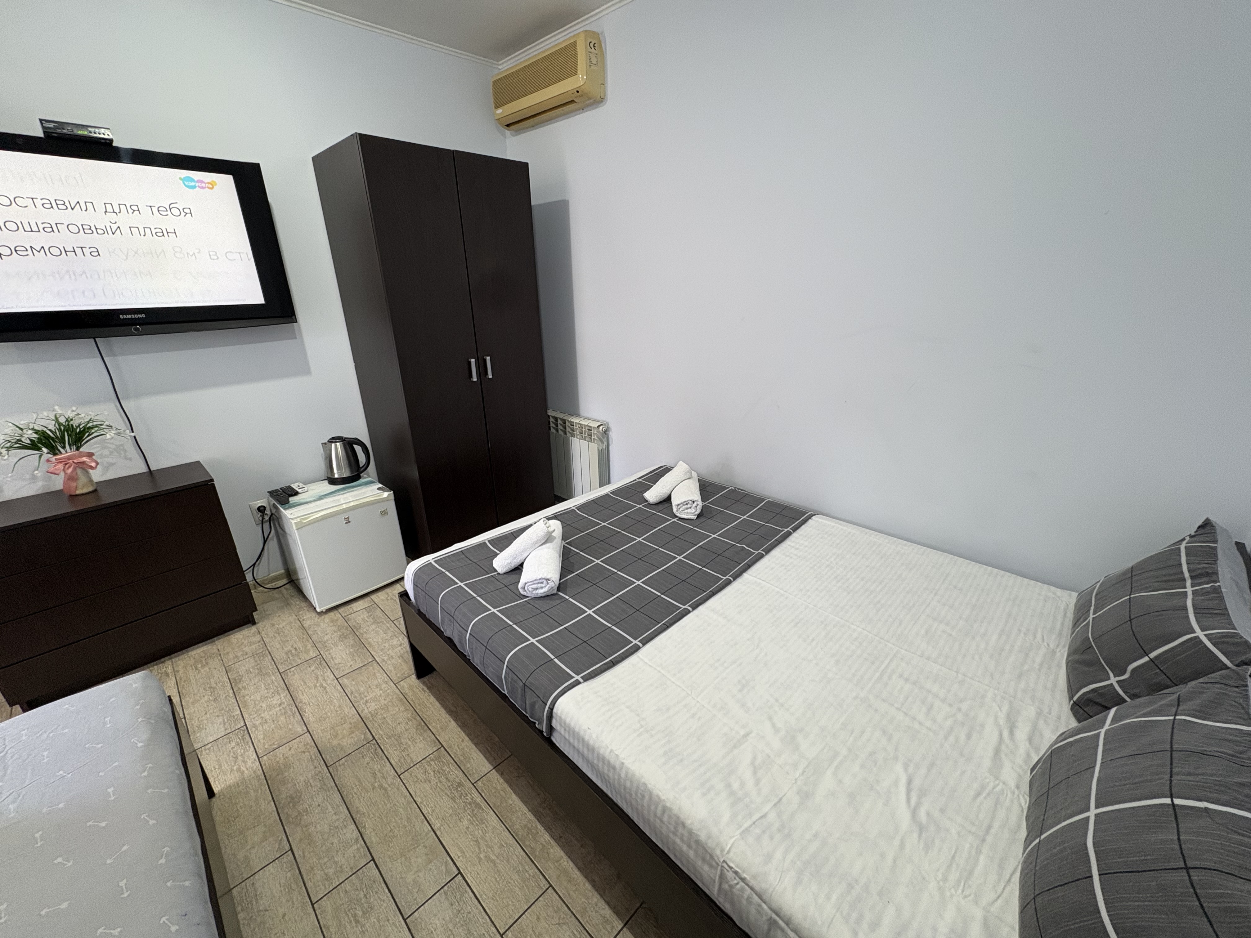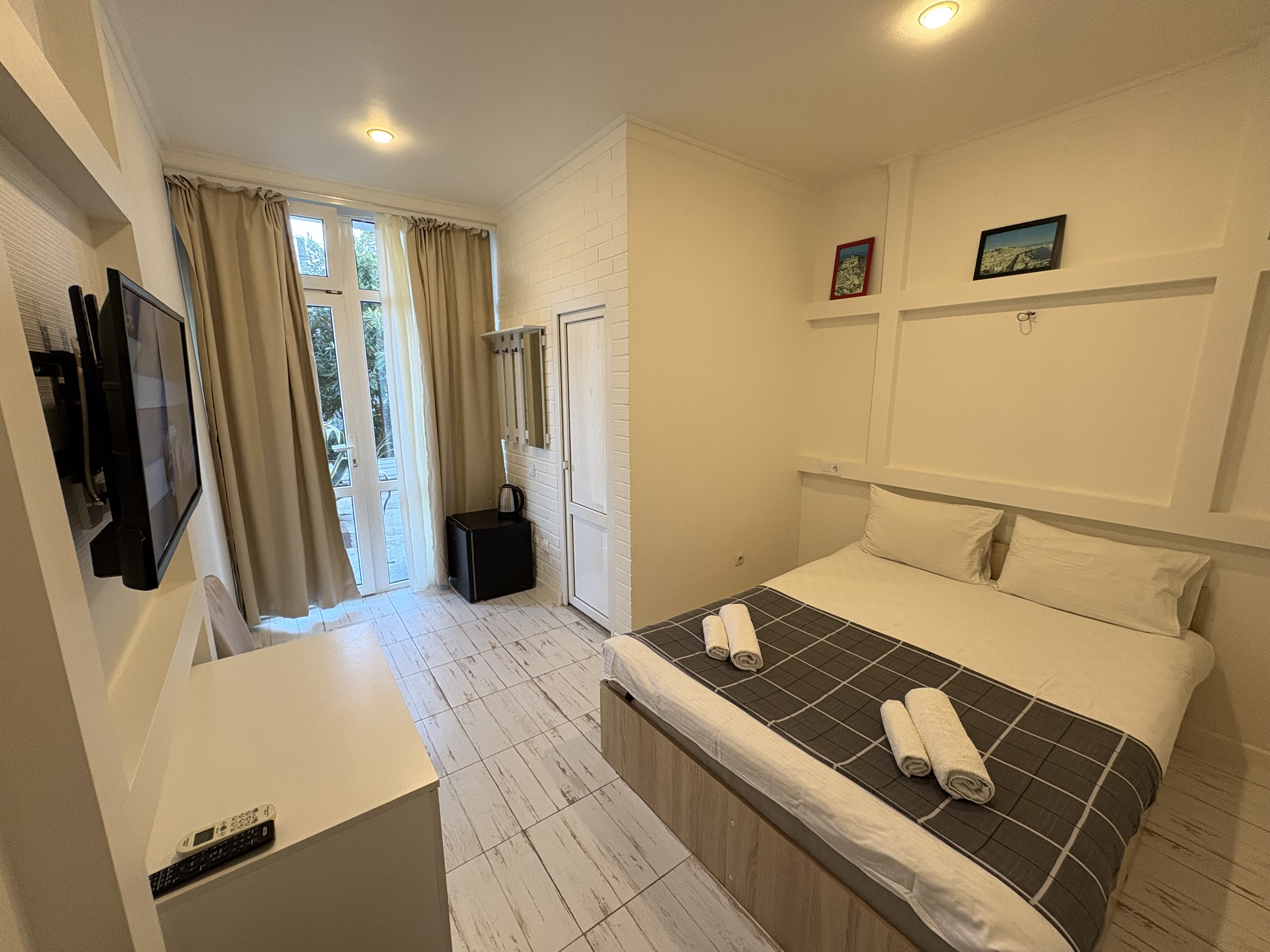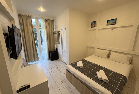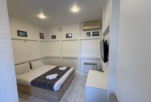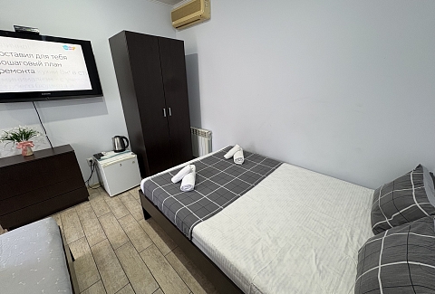 В номере: вешалка, зеркало, кровать двуспальная, кондиционер, мини-холодильник, набор посуды, телевизор, электрочайник