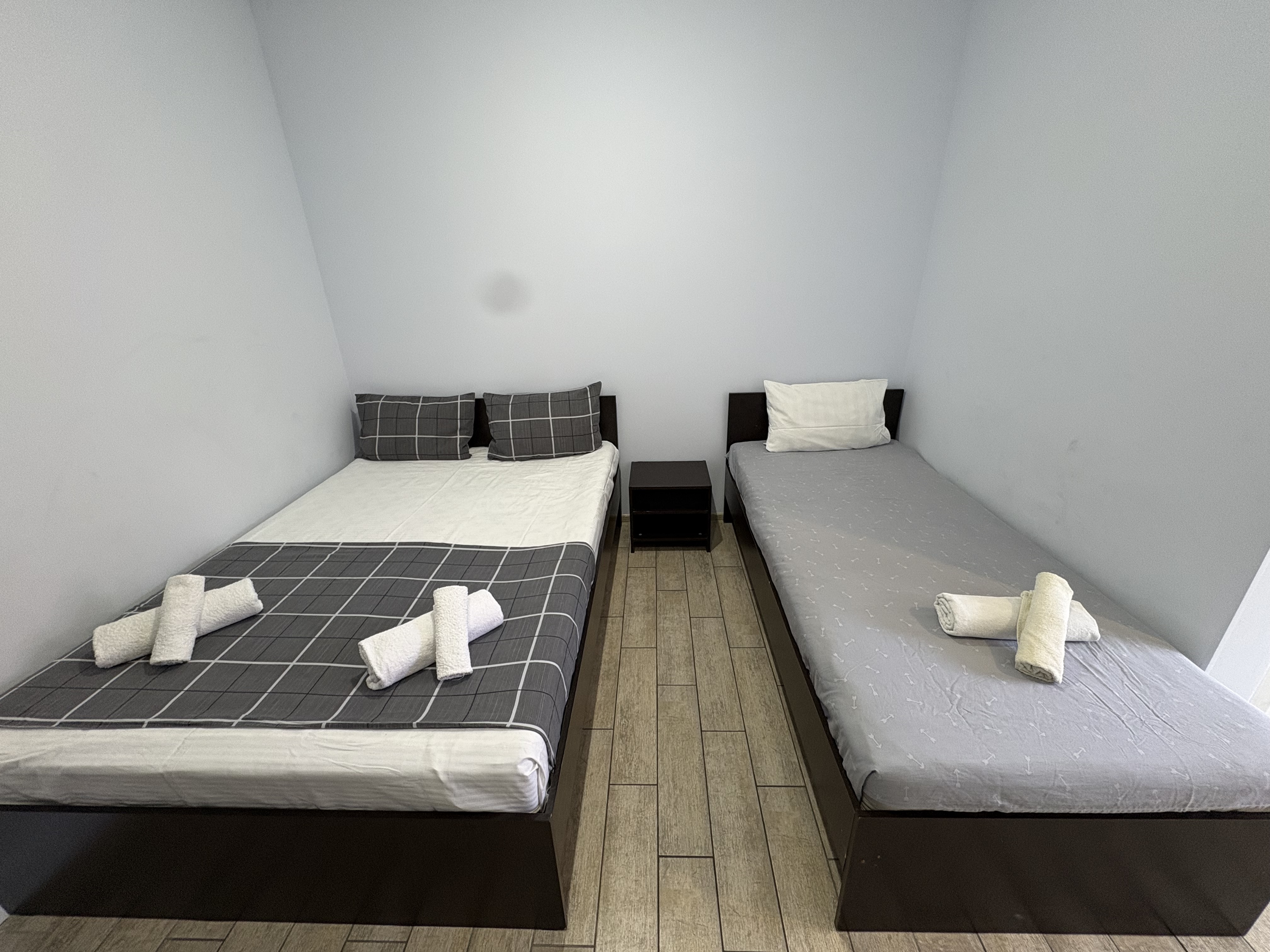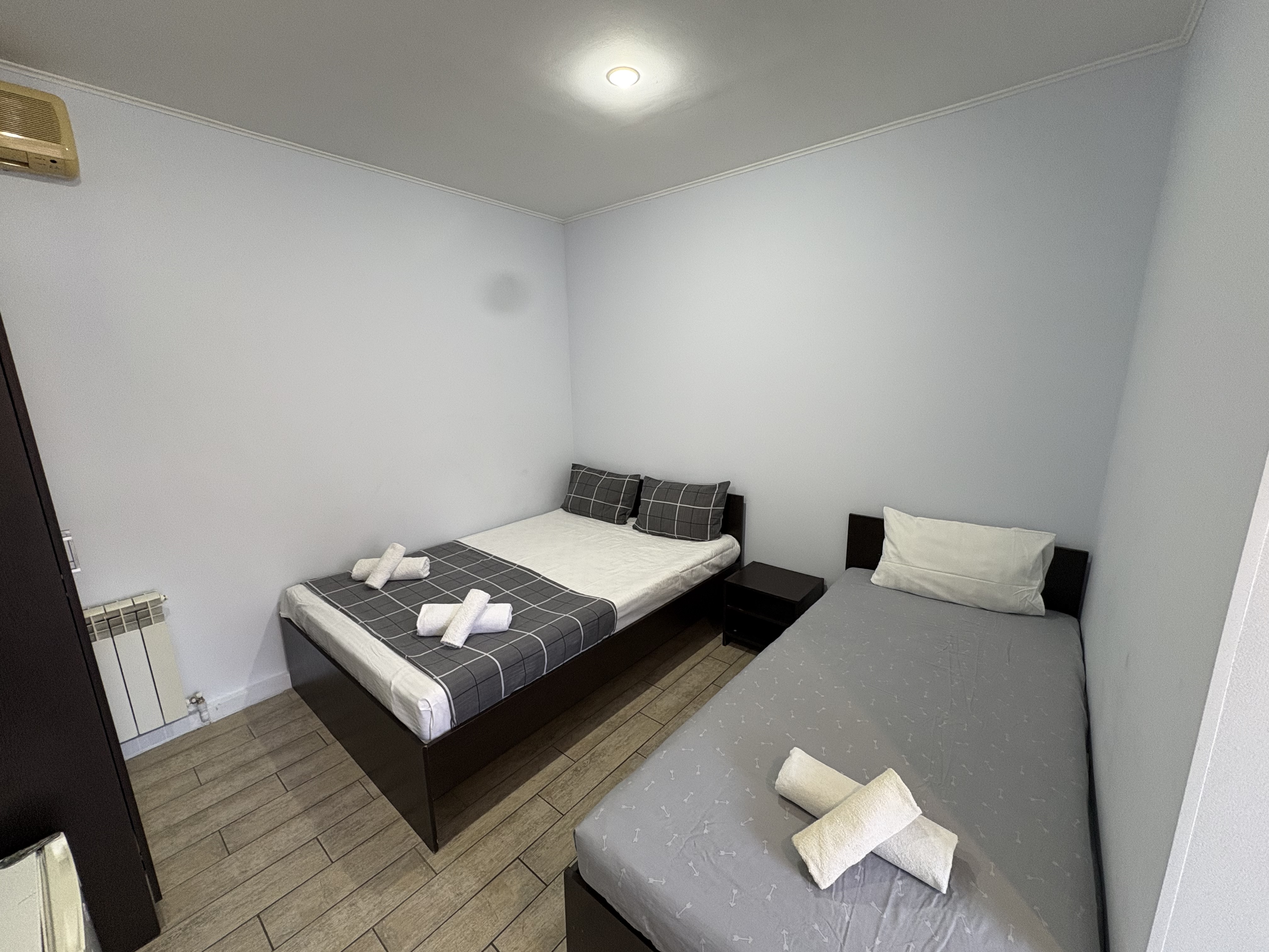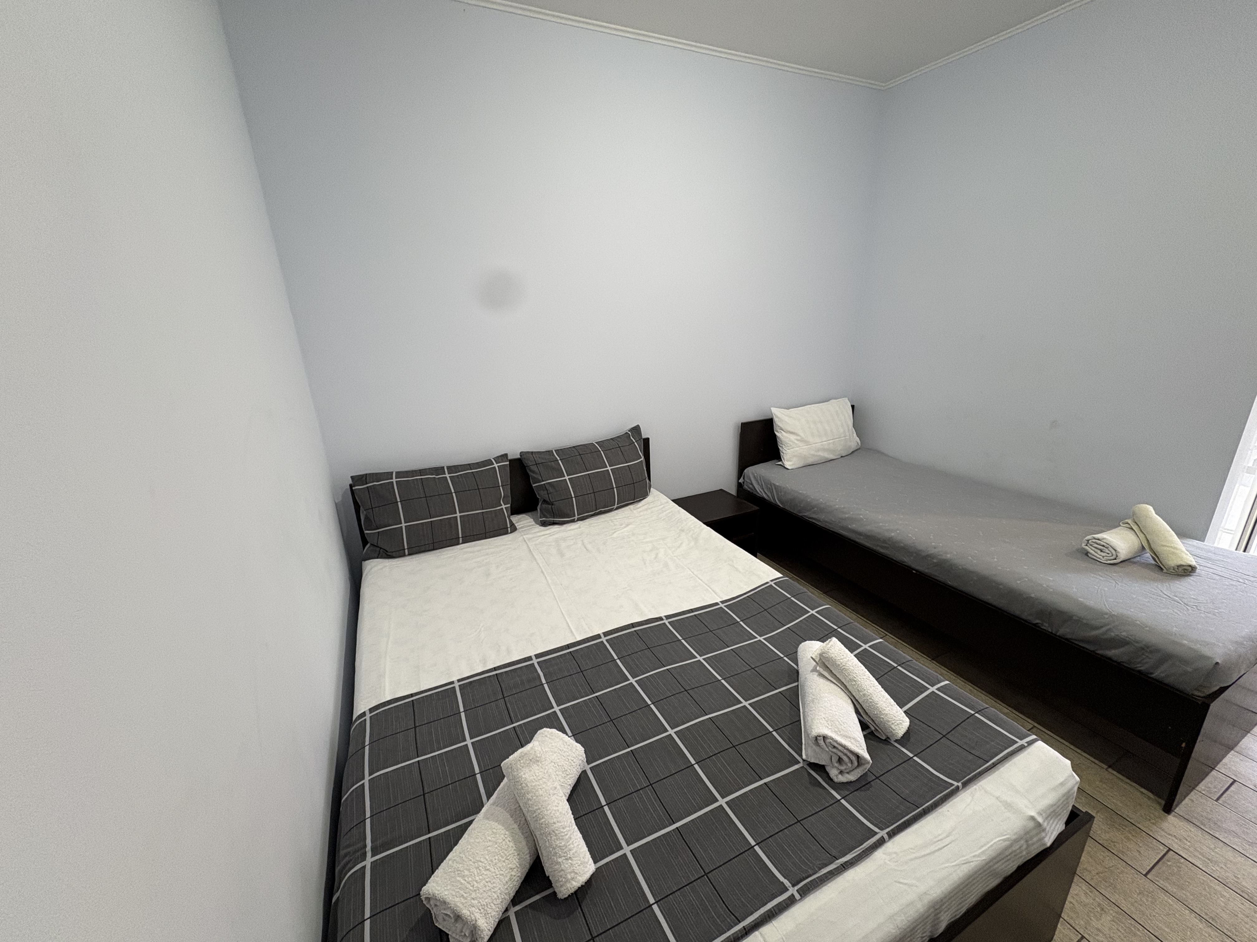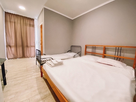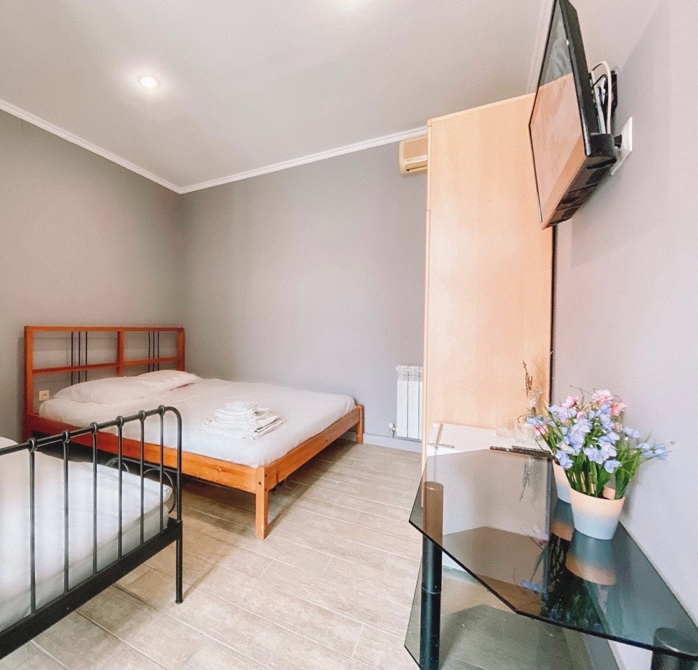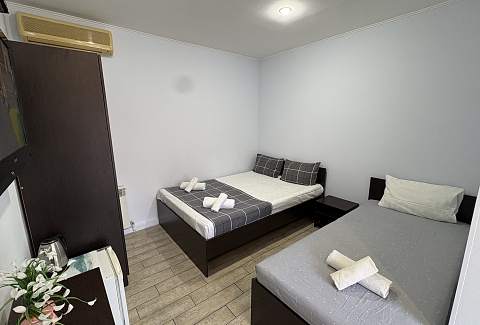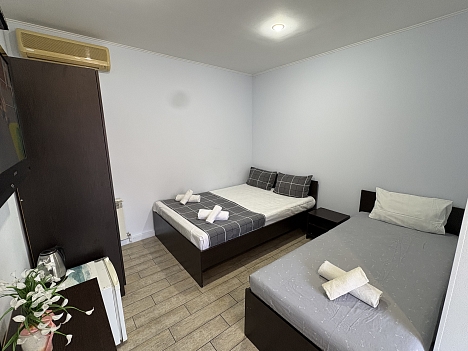В номере: вешалка, еврораскладушка, зеркало, кровати односпальные /одна двуспальная кровать, прикроватные тумбочки, шкаф, кондиционер, мини-холодильник, набор посуды, сушилка для белья, телевизор, электрочайник