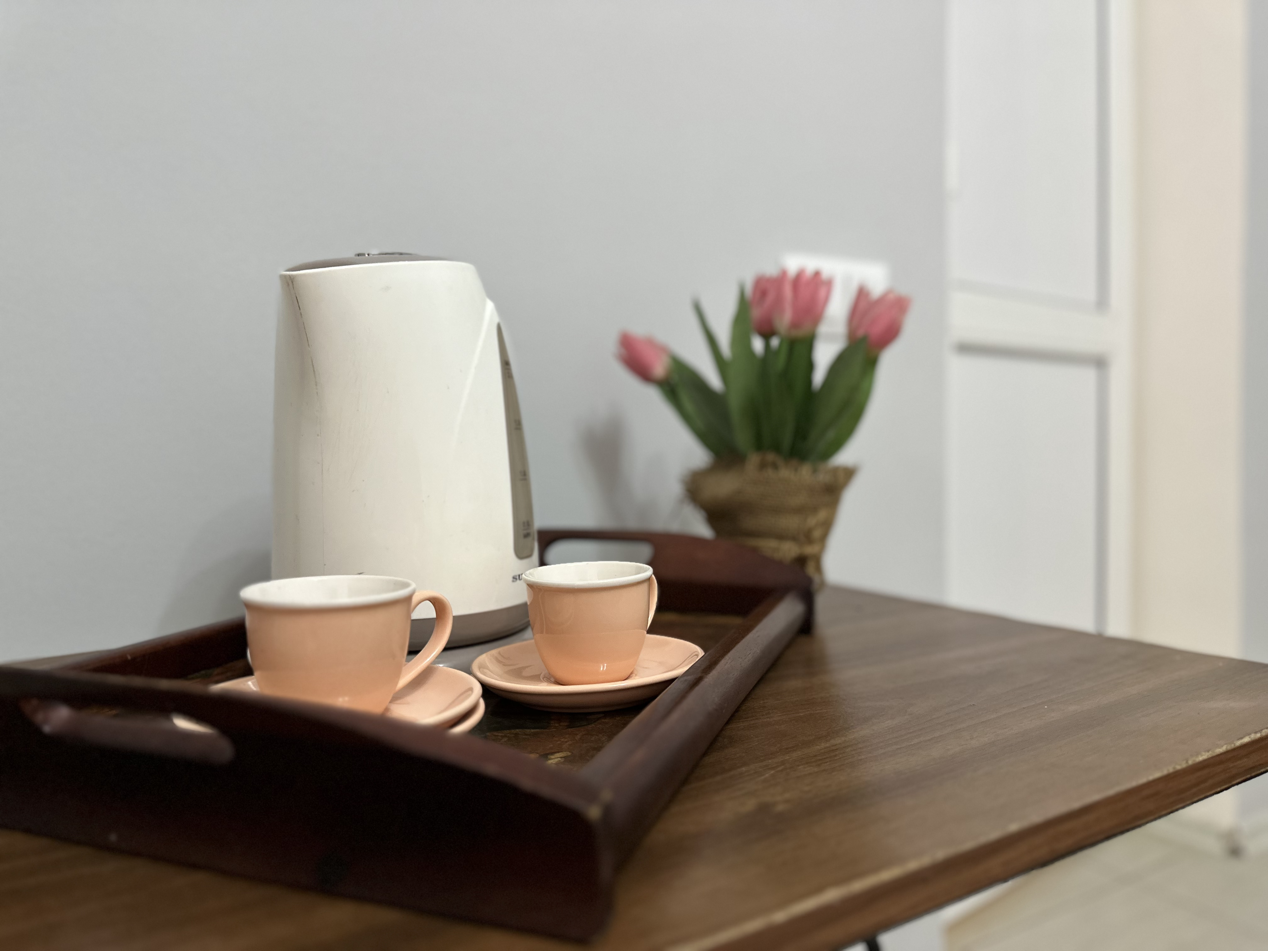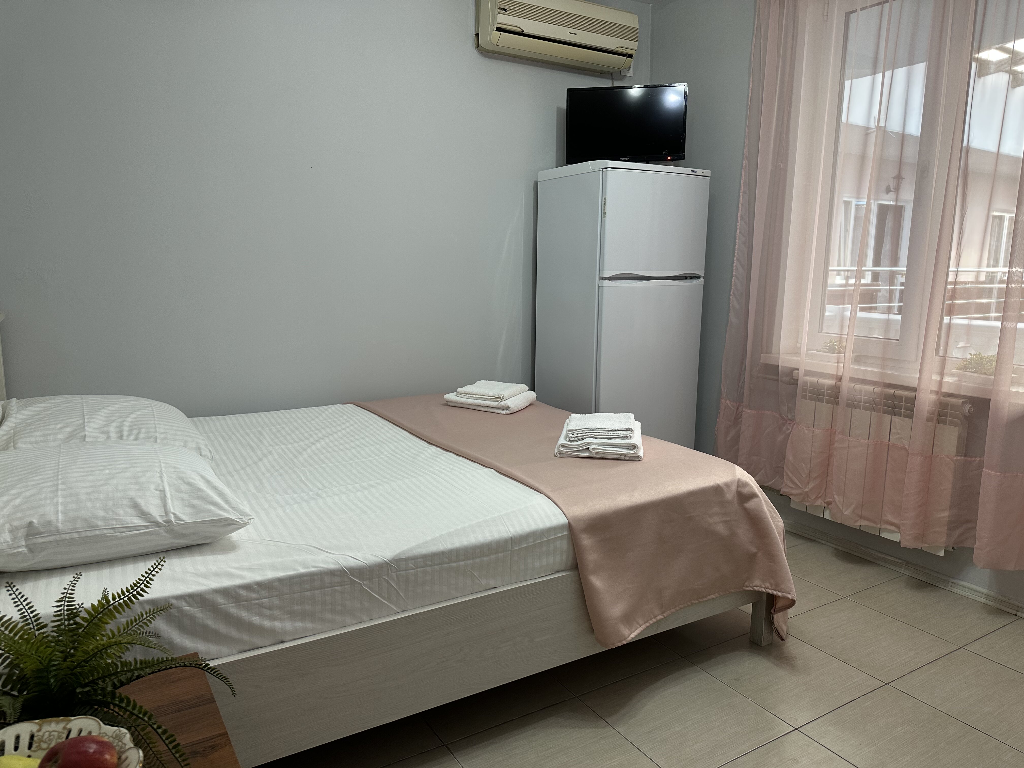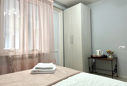 В номере: кровать двуспальная, прикроватные тумбочки, столик журнальный, шкаф, кондиционер, телевизор, чайный набор посуды, электрочайник