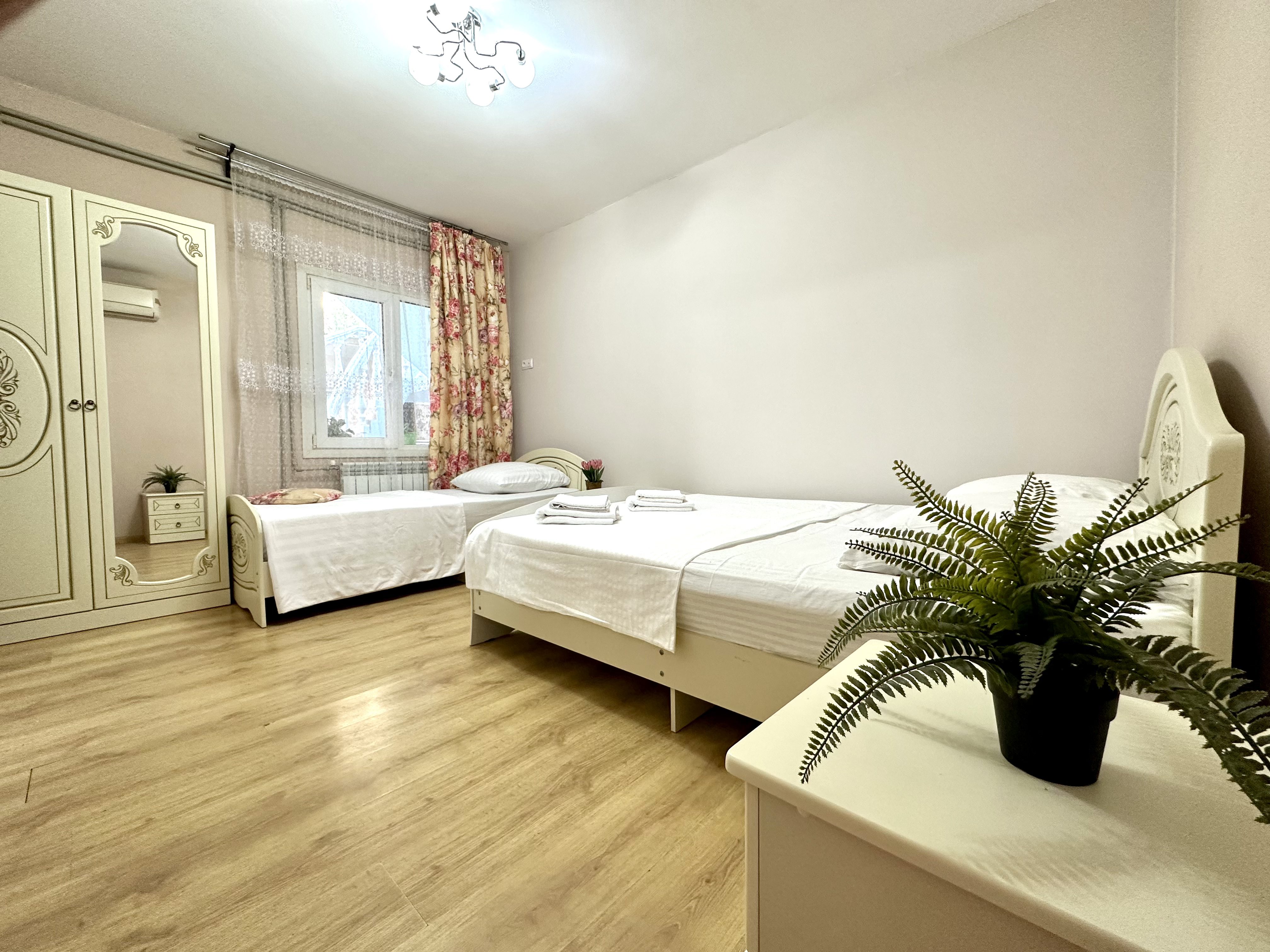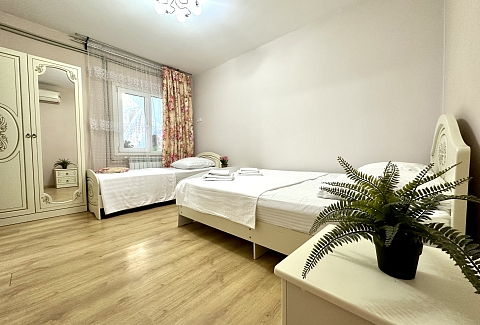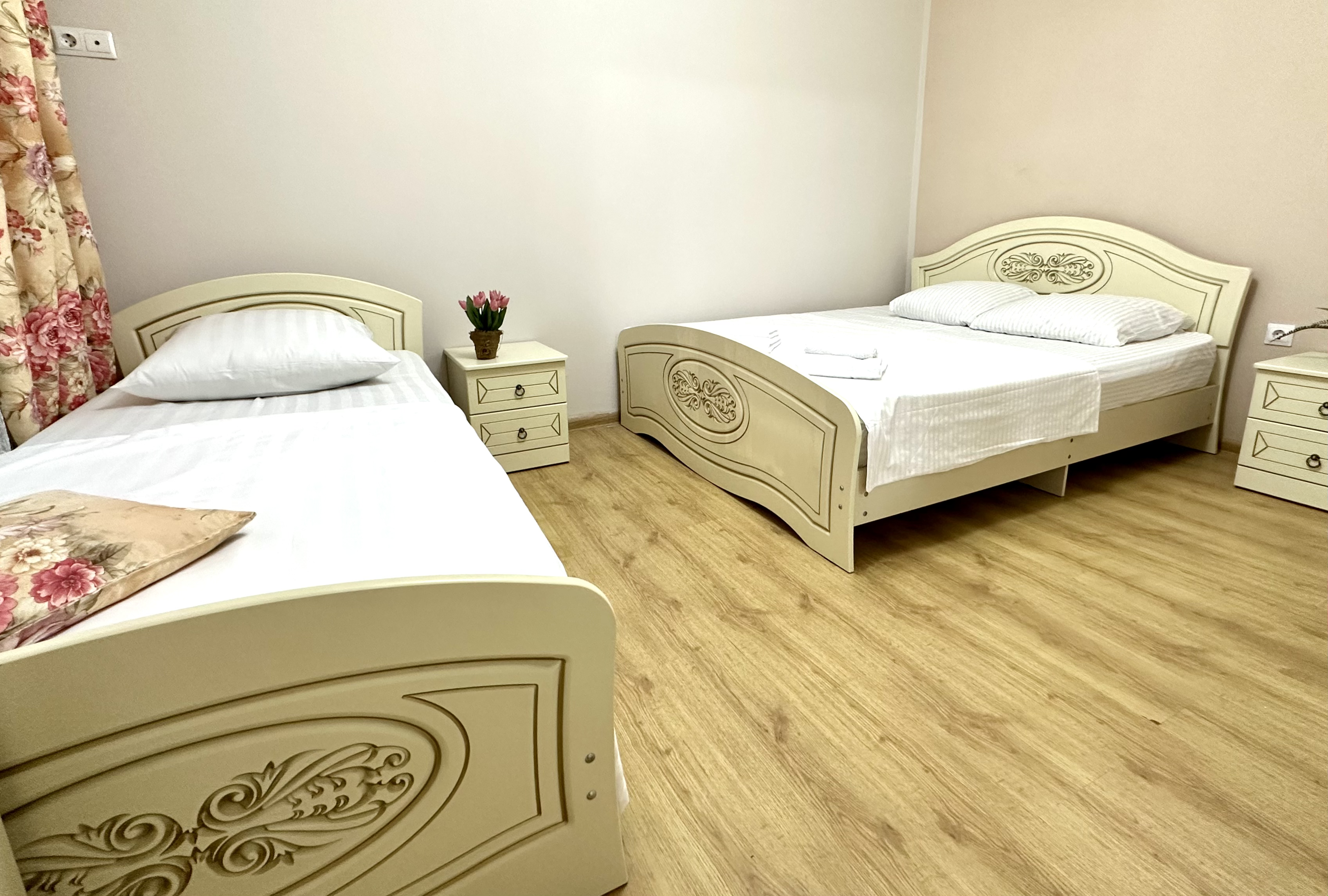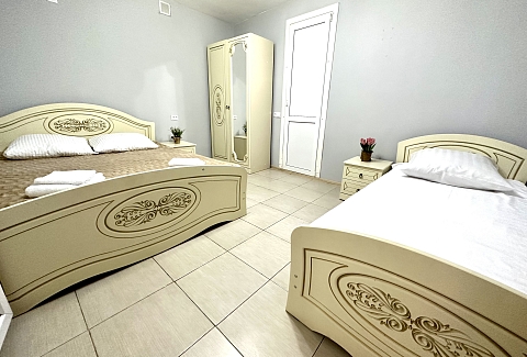 В номере: диван раскладной, кровать двуспальная, кровать односпальная, прикроватные тумбочки, стол обеденный, стулья, шкаф, кондиционер, набор посуды, плита электрическая, телевизор, электрочайник