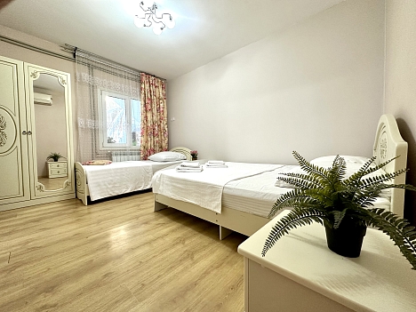 В номере: кровати односпальные, кровать двуспальная, прикроватные тумбочки, стол обеденный, стулья, шкаф, кондиционер, набор посуды, плита электрическая, телевизор, электрочайник