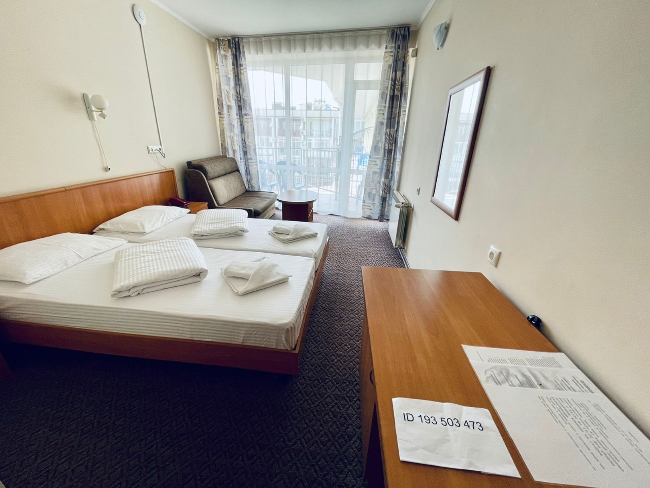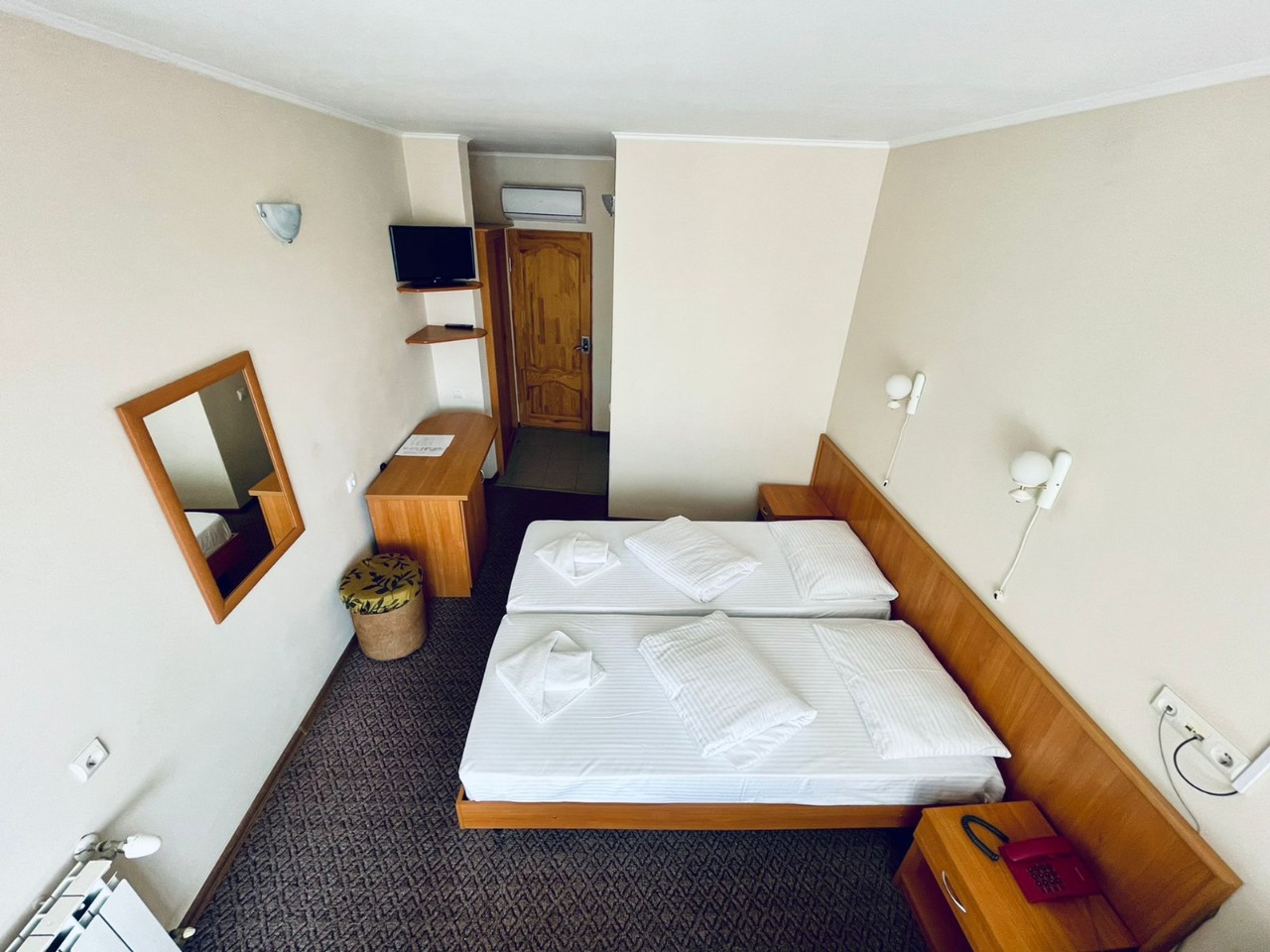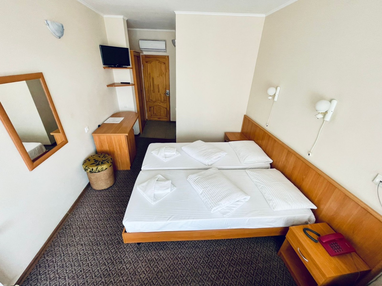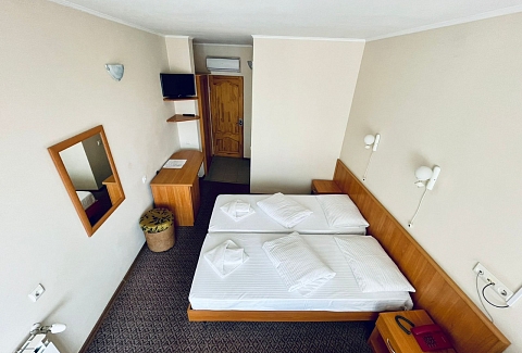 В номере: зеркало, кровати односпальные, прикроватные тумбочки, столик журнальный, шкаф-купе, кондиционер, сейф, телевизор ЖК, чайный набор посуды