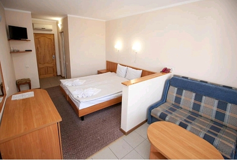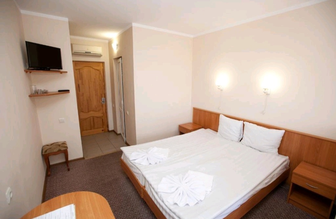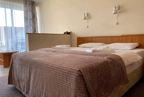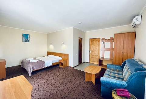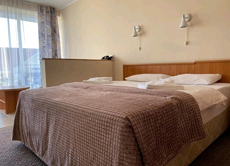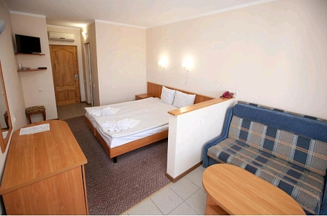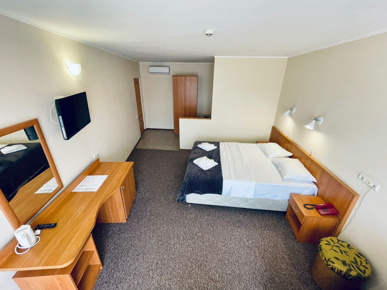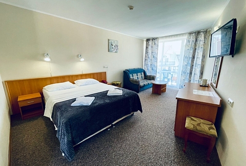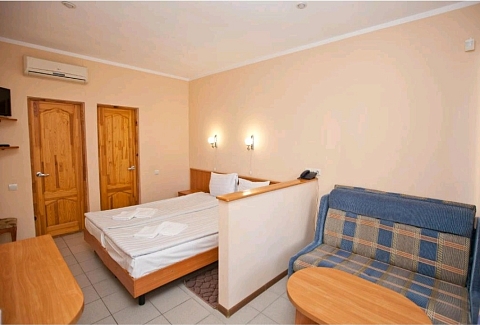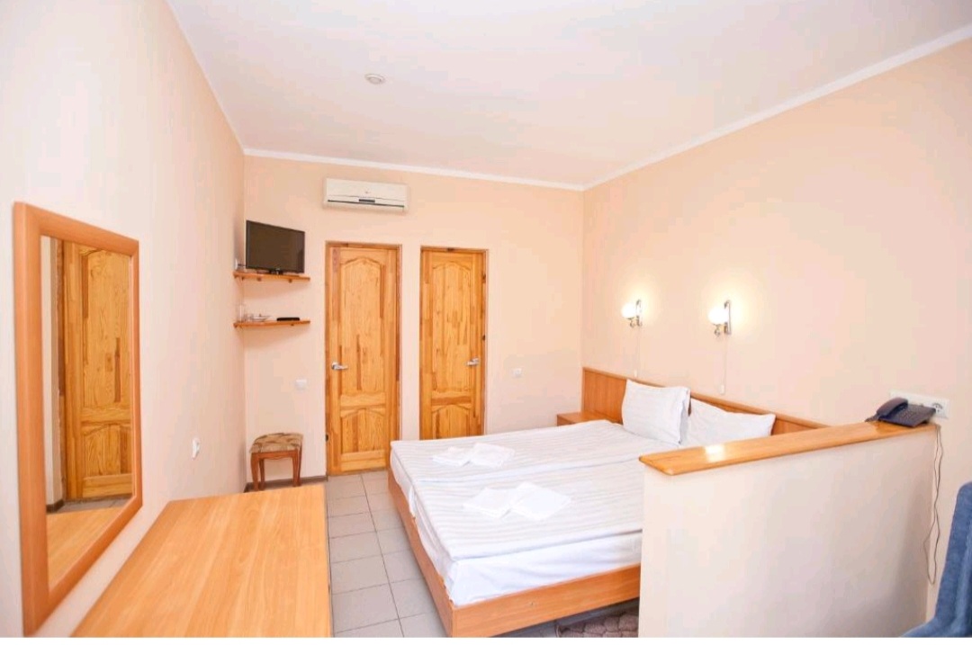 В номере: зеркало, кровать двуспальная, прикроватная тумбочка, столик журнальный, шкаф, кондиционер, мини-холодильник, сейф, телевизор ЖК, чайный набор посуды