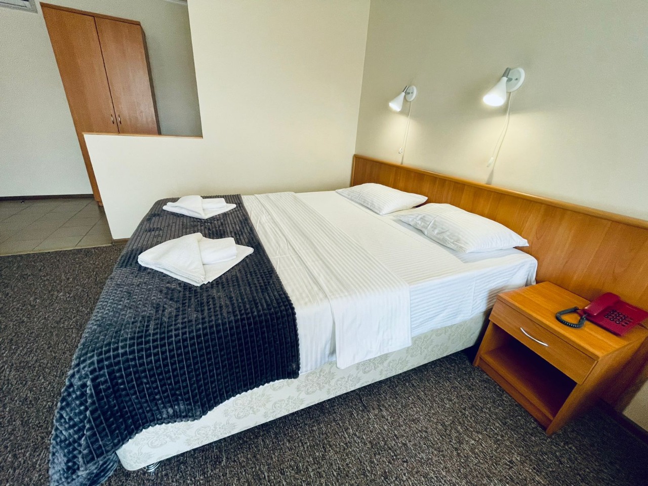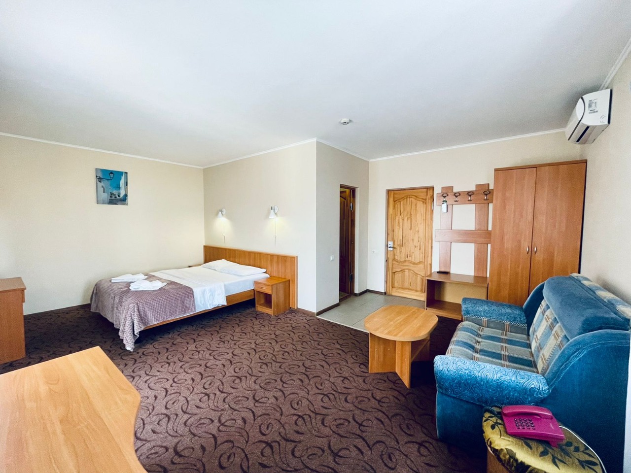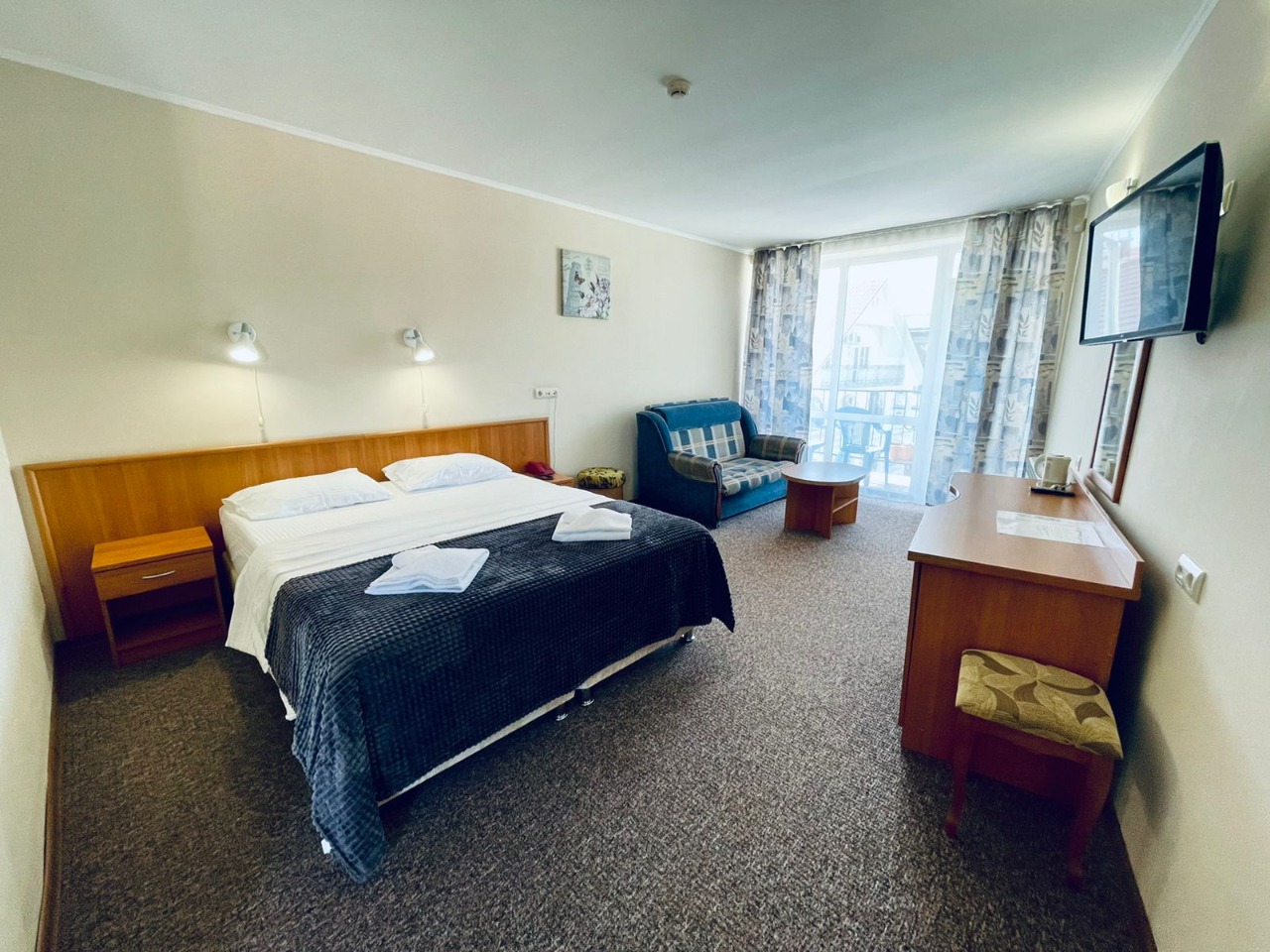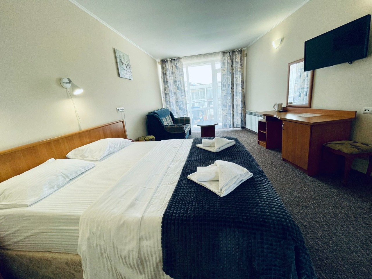 В номере: зеркало, кровать двуспальная, прикроватная тумбочка, столик журнальный, шкаф, кондиционер, мини-холодильник, сейф, телевизор ЖК, чайный набор посуды