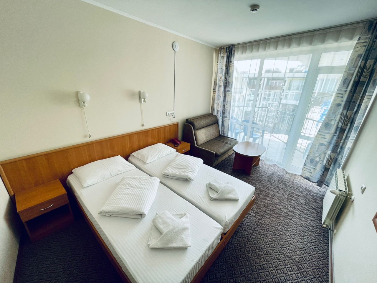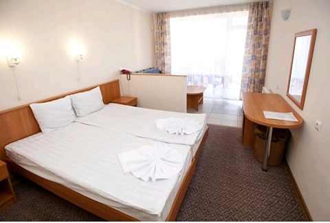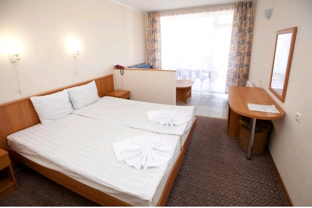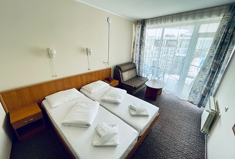 В номере: зеркало, кровати односпальные, прикроватные тумбочки, столик журнальный, кондиционер, мини-холодильник, сейф, телевизор ЖК, чайный набор посуды