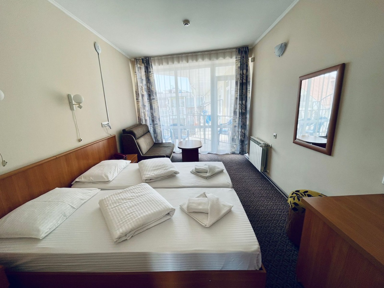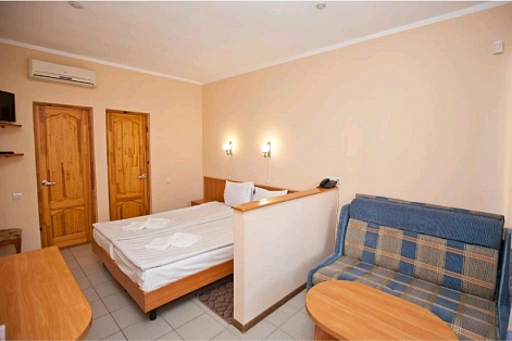 В номере: зеркало, кровати односпальные, прикроватные тумбочки, столик журнальный, шкаф-купе, кондиционер, мини-холодильник, сейф, телевизор ЖК, чайный набор посуды