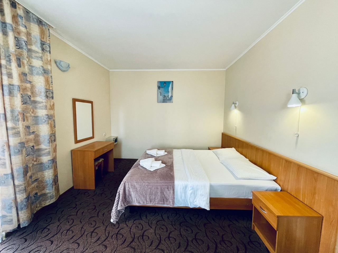В номере: зеркало, кровать двуспальная, прикроватные тумбочки, столик журнальный, шкаф, кондиционер, мини-холодильник, сейф, телевизор ЖК, чайный набор посуды, электрочайник