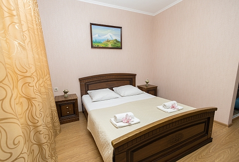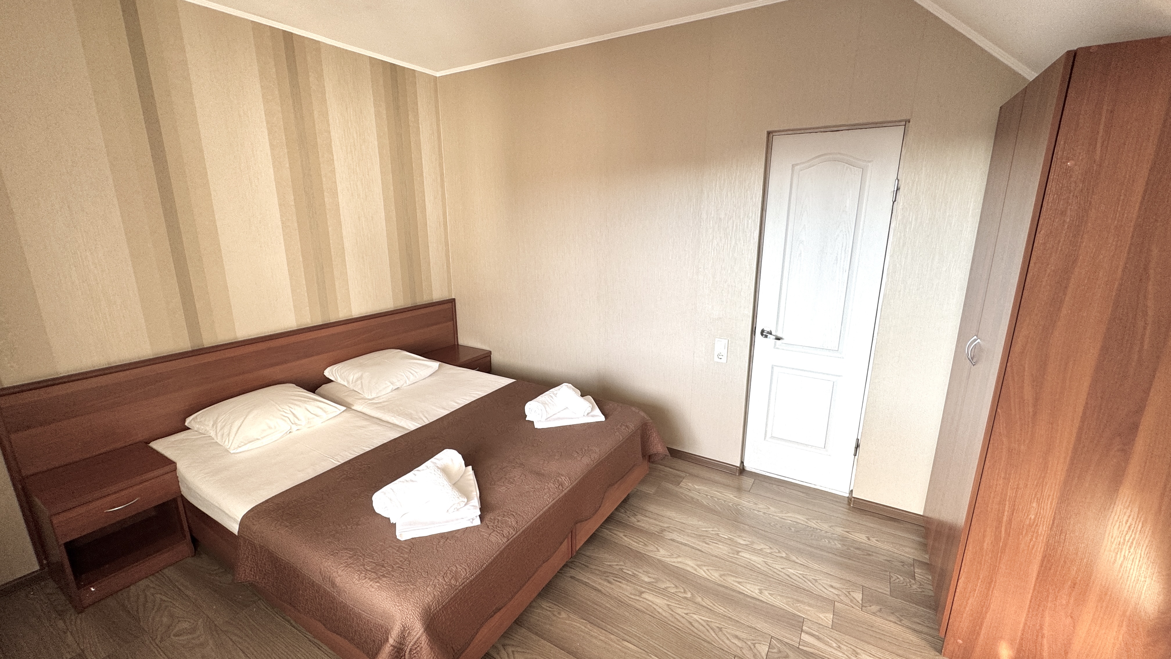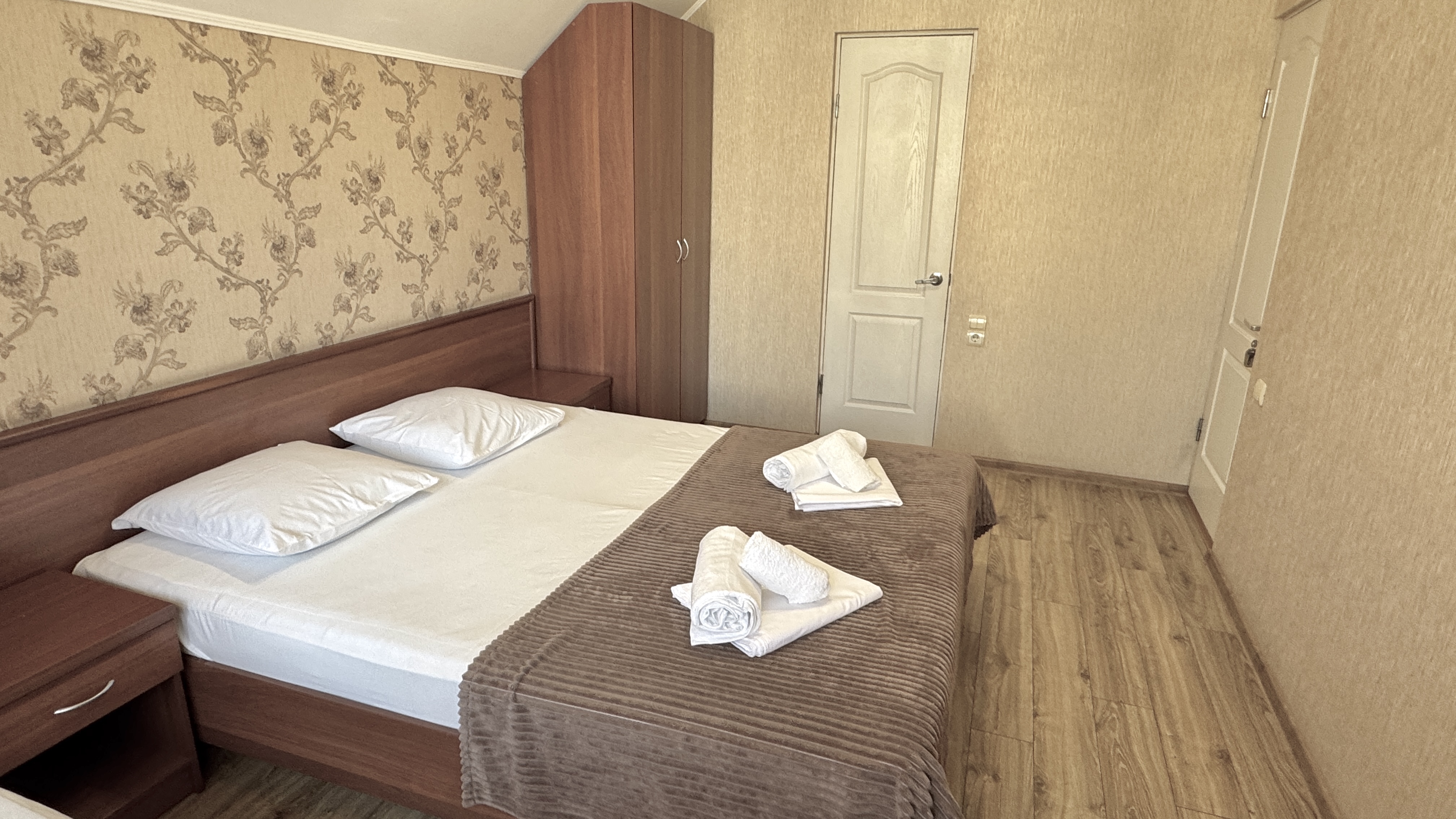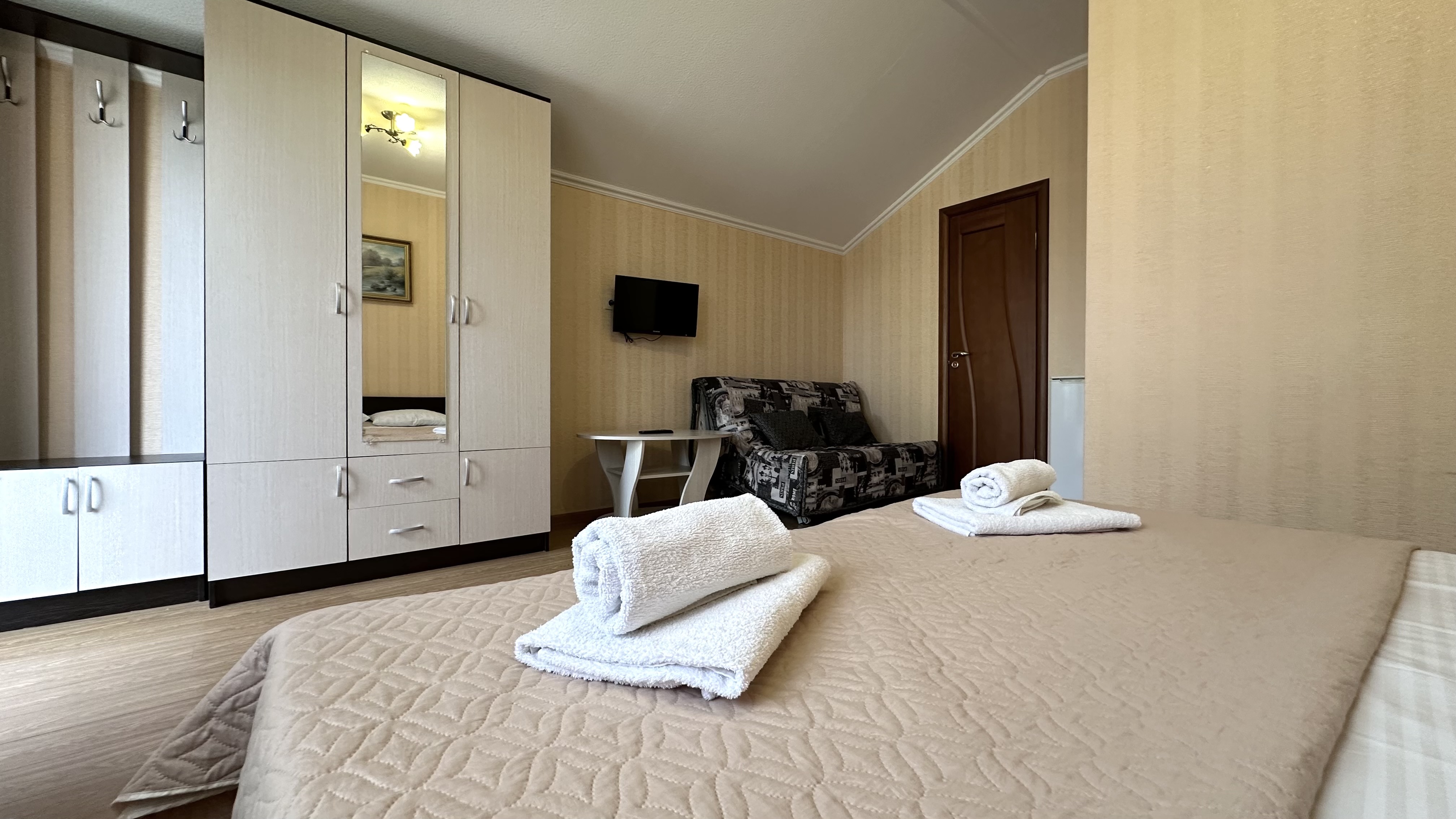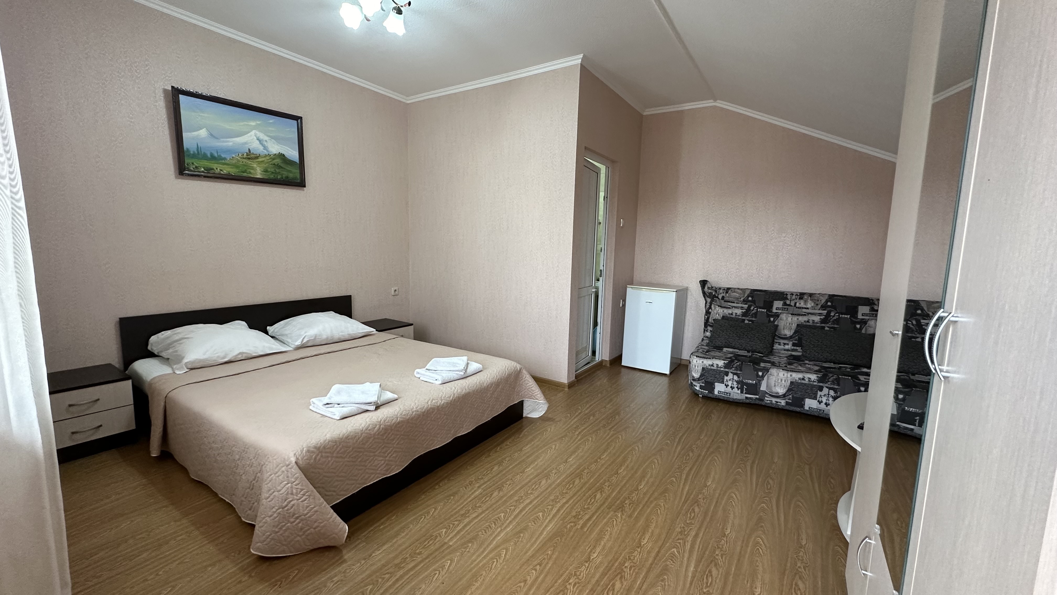 В номере: вешалка, диван раскладной, зеркало, кровать двуспальная, прикроватные тумбочки, шкаф, кондиционер, телевизор, холодильник