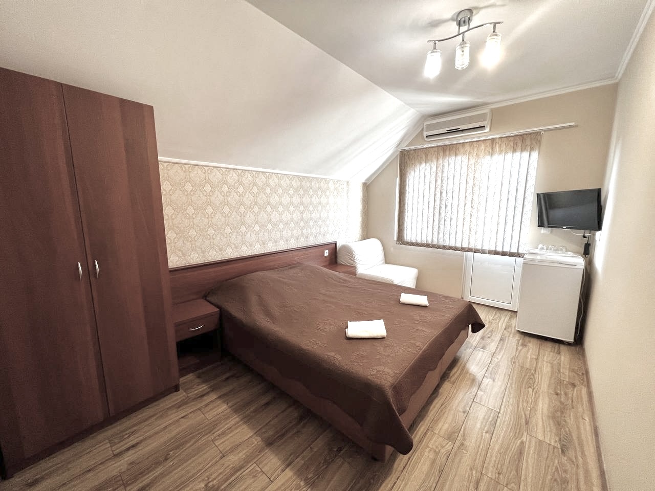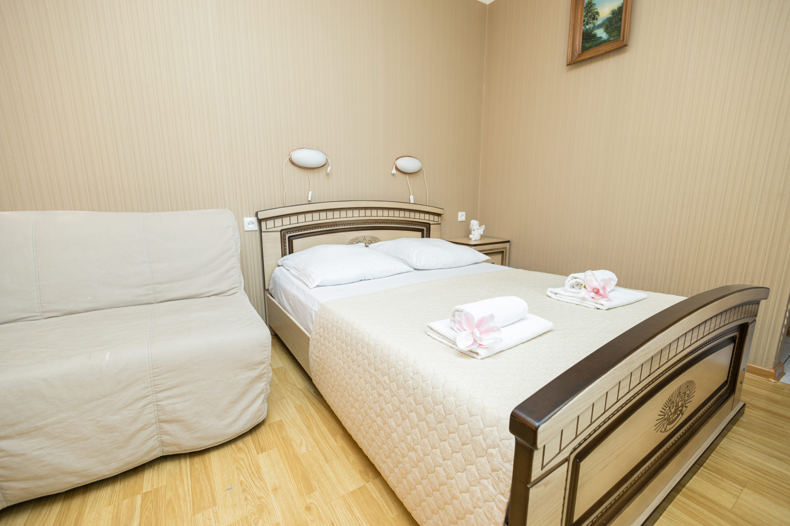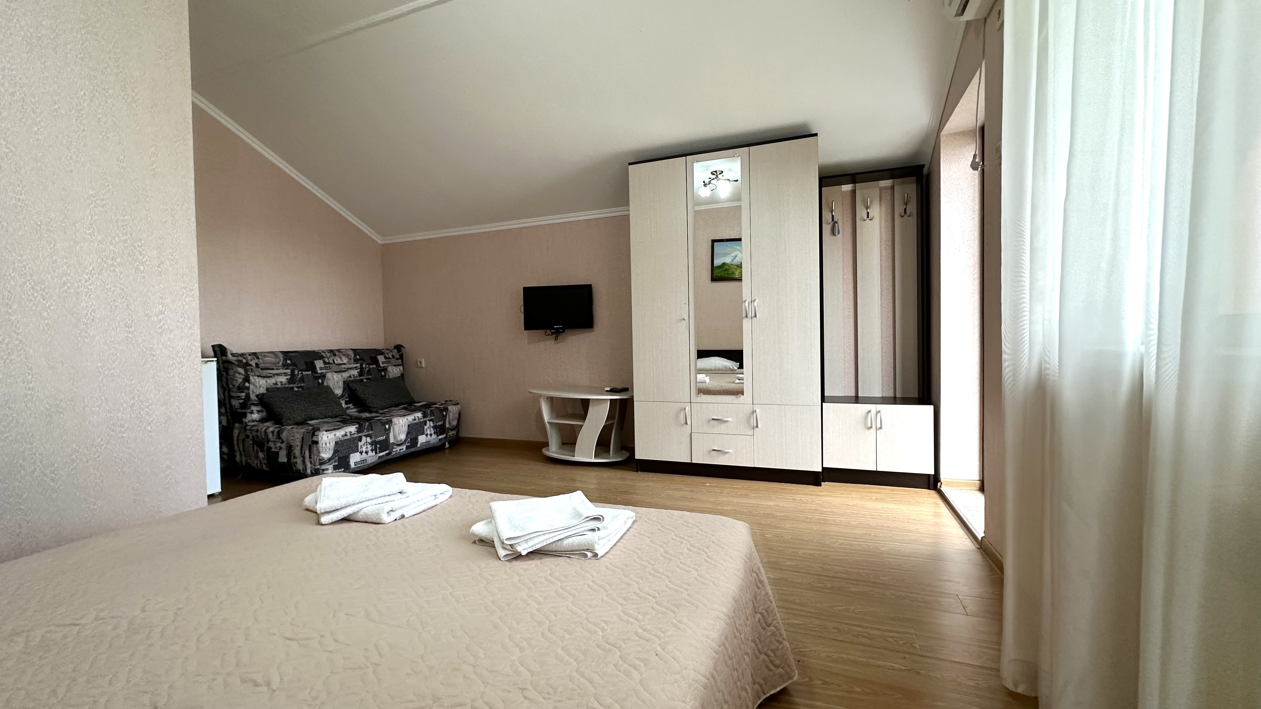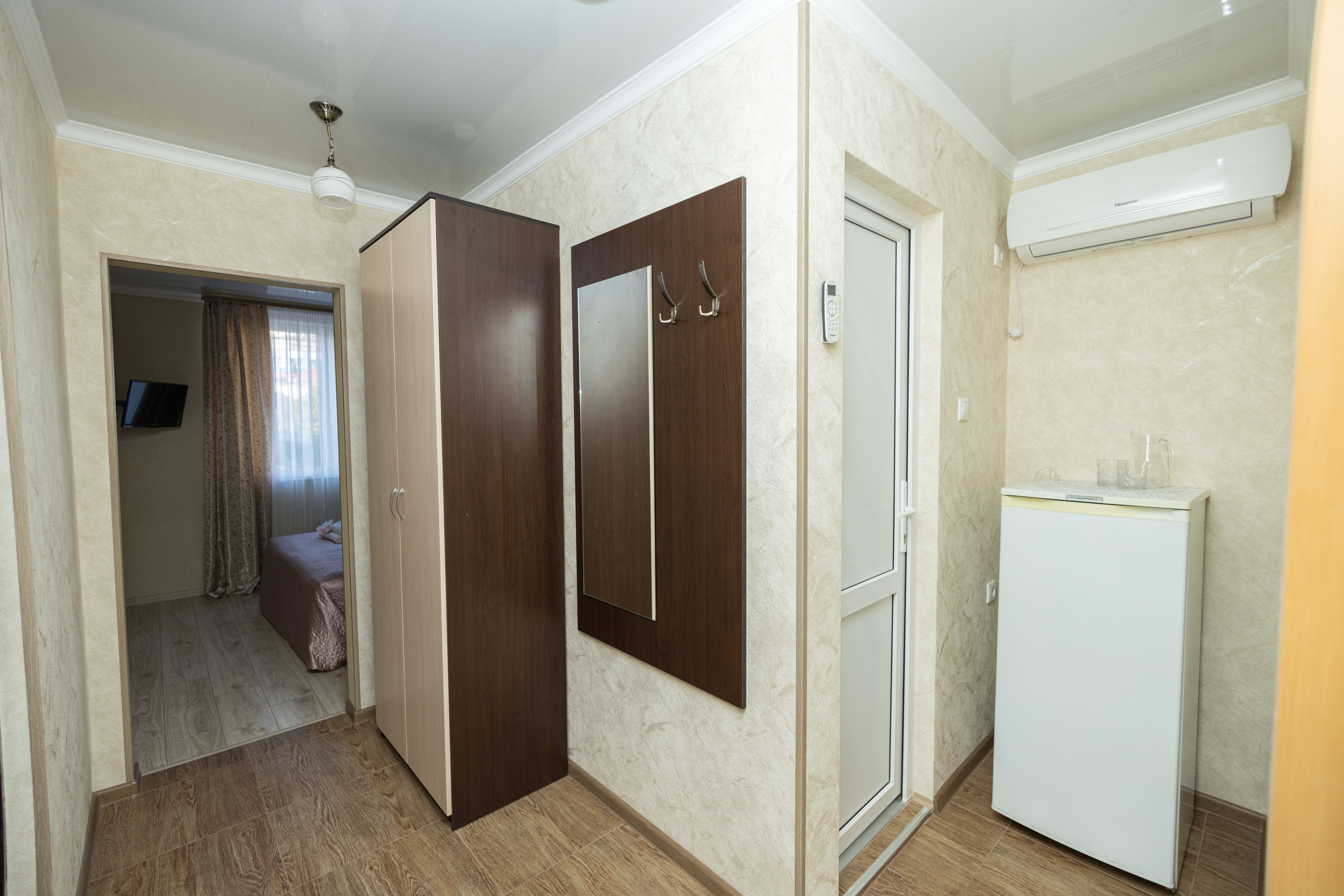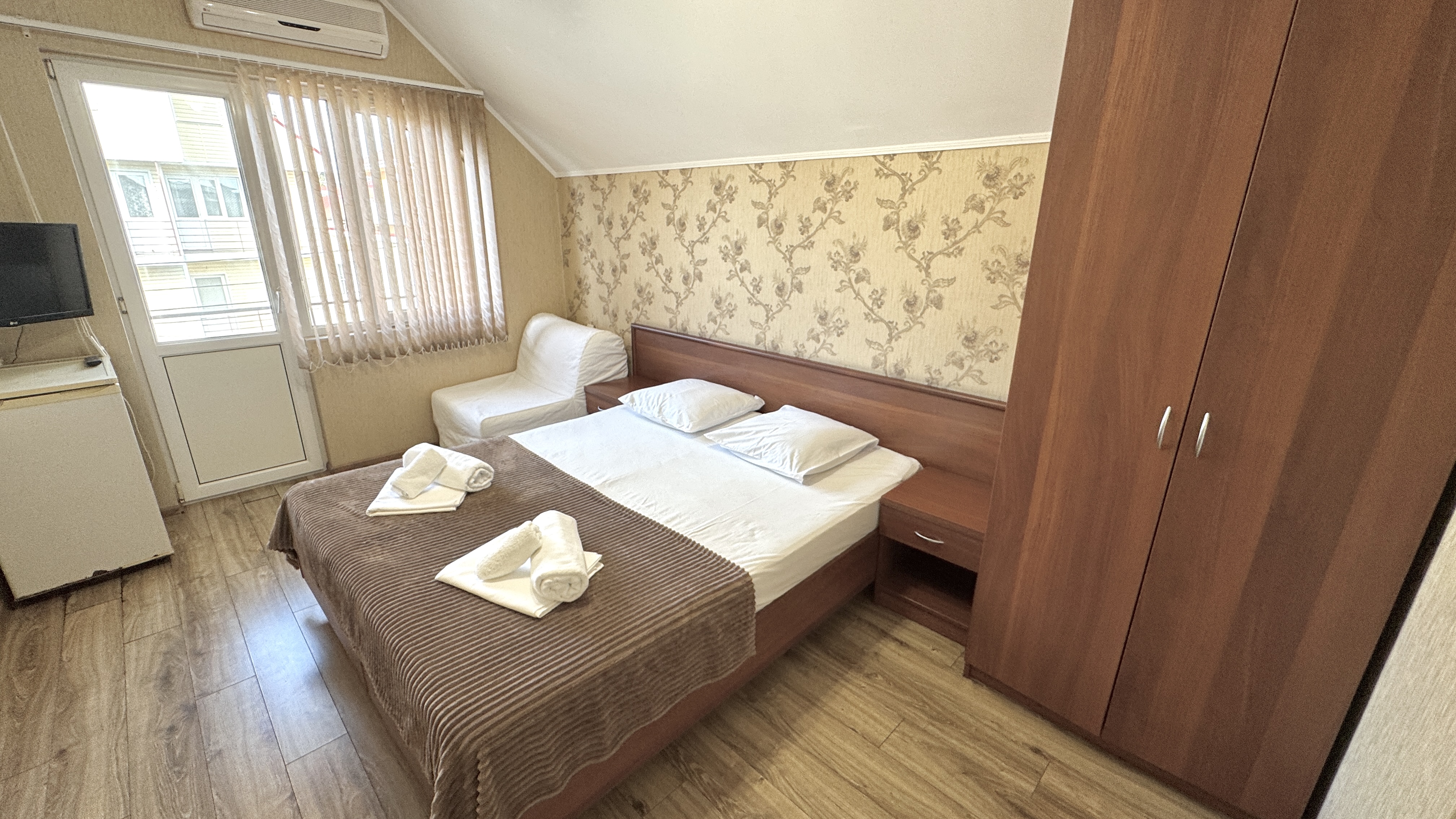 В номере: вешалка, диван раскладной, зеркало, кровать двуспальная, прикроватные тумбочки, шкаф, кондиционер, телевизор, холодильник
