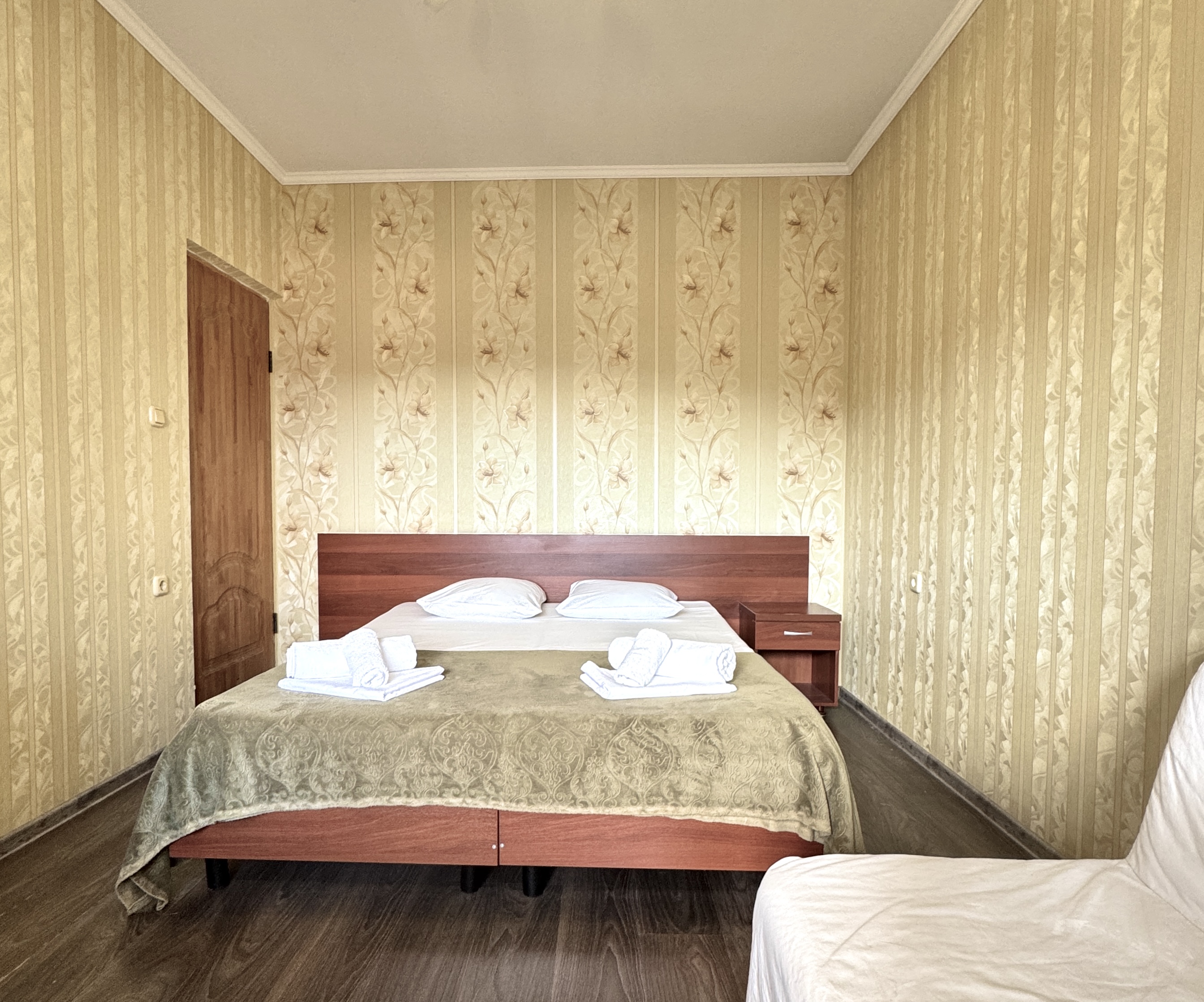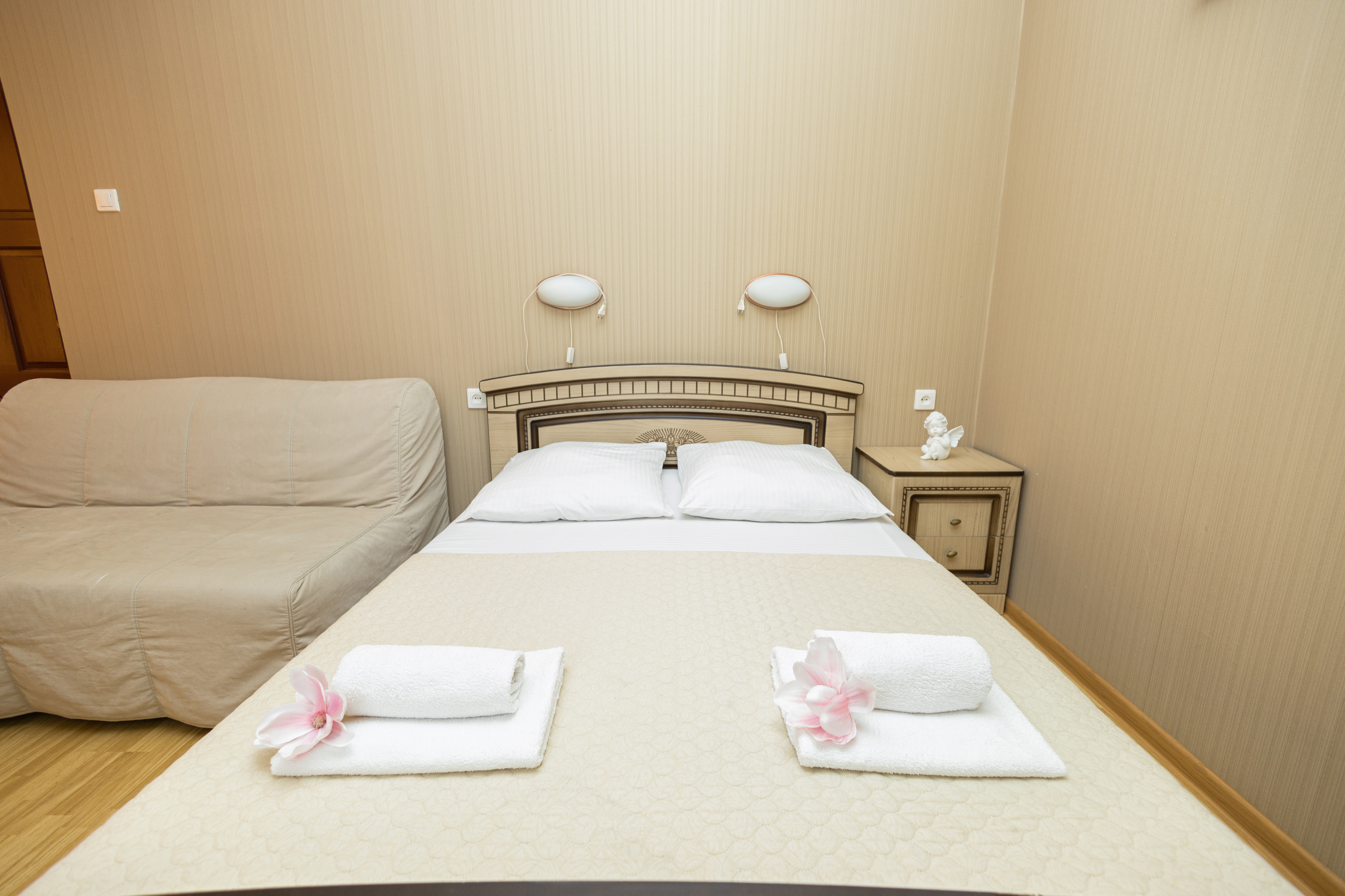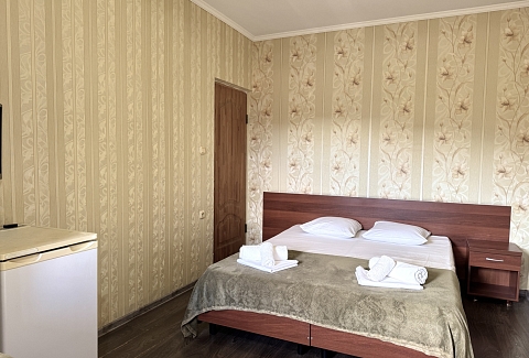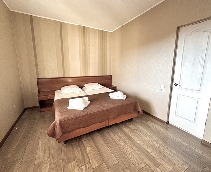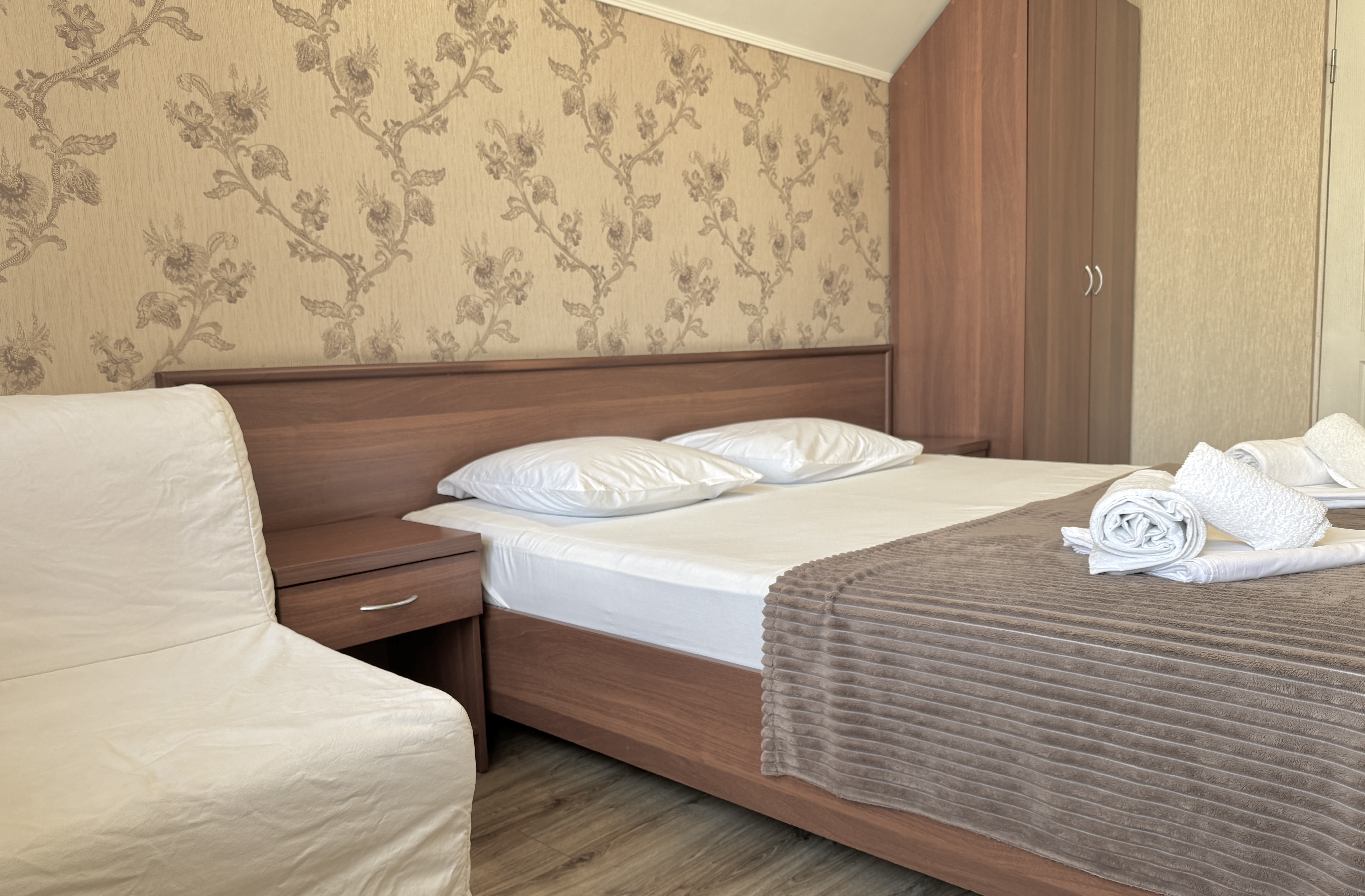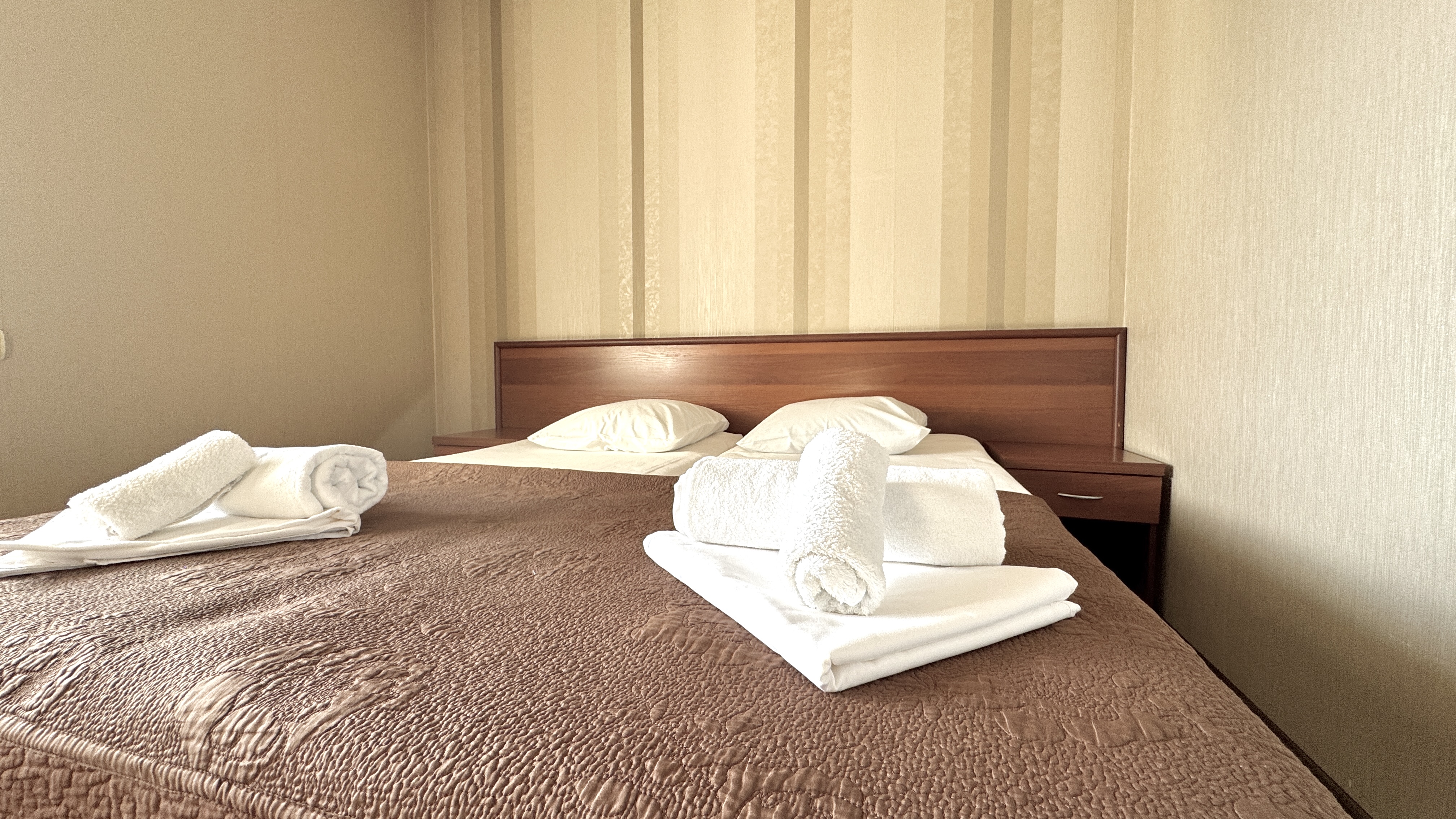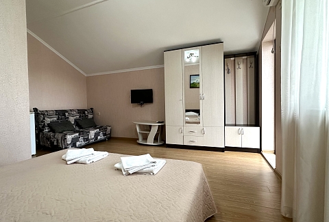 В номере: вешалка, диван раскладной, зеркало, кровать двуспальная, прикроватные тумбочки, шкаф, кондиционер, телевизор, холодильник