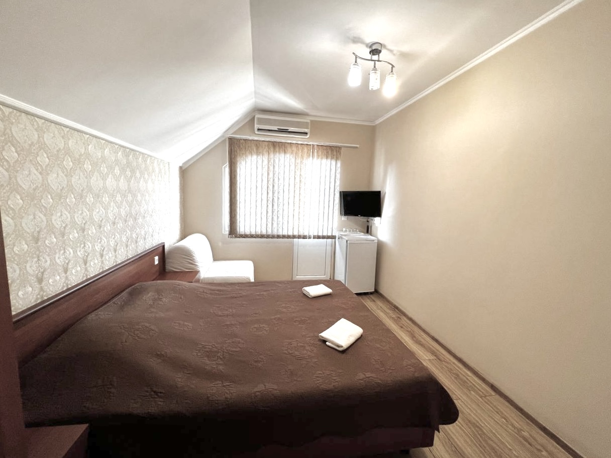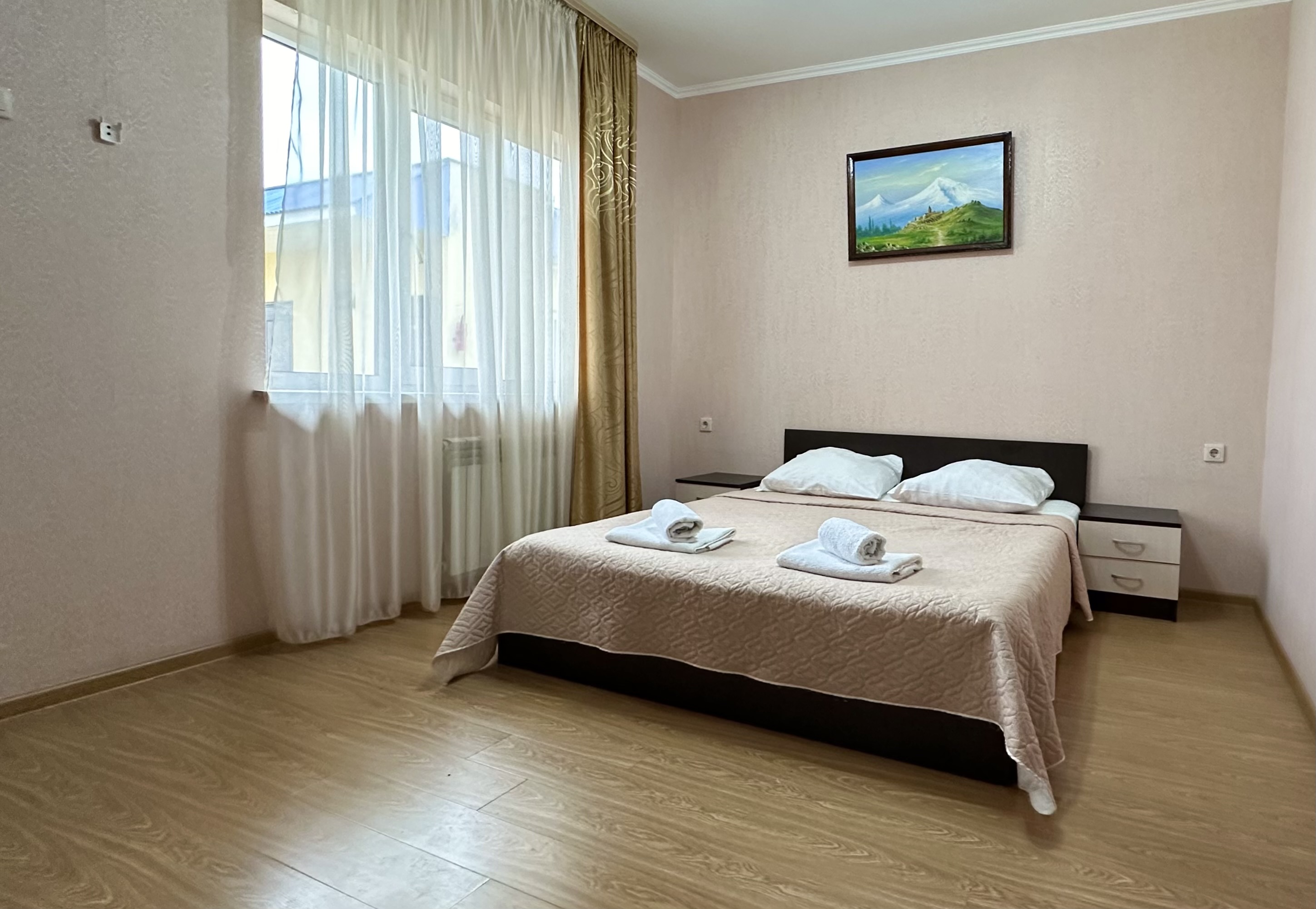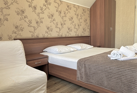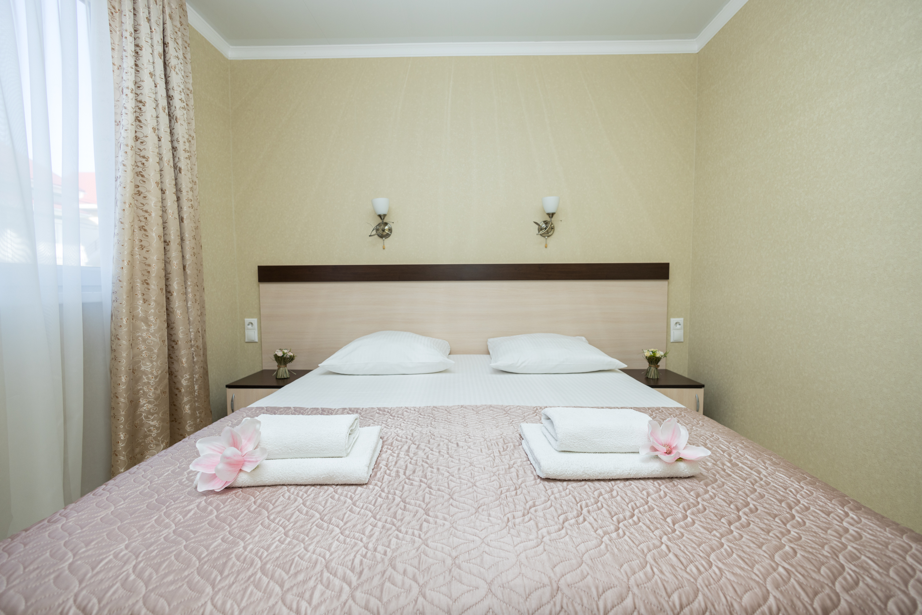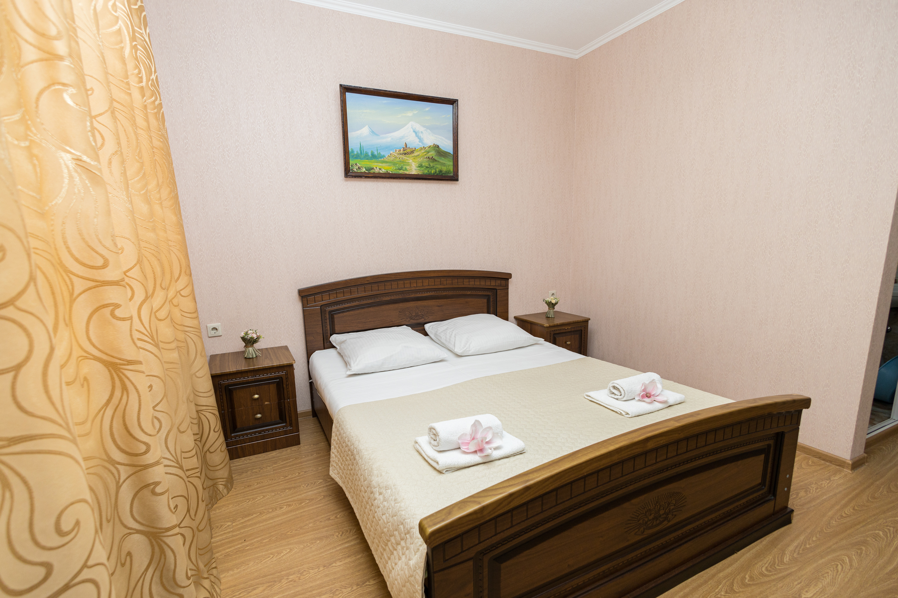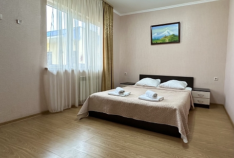 В номере: вешалка, диван раскладной, зеркало, кровать двуспальная, прикроватные тумбочки, шкаф, кондиционер, телевизор, холодильник