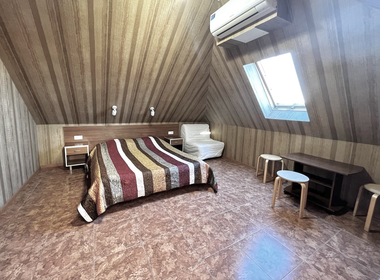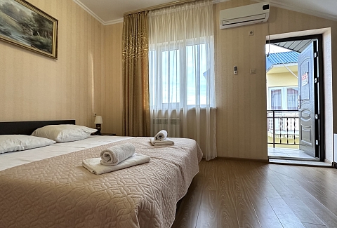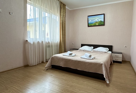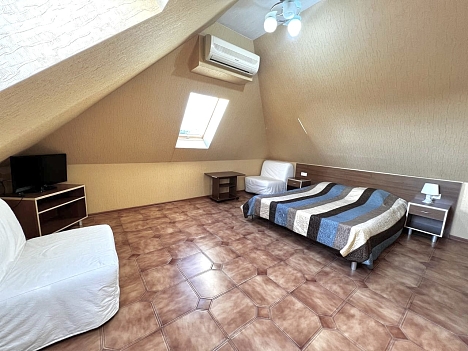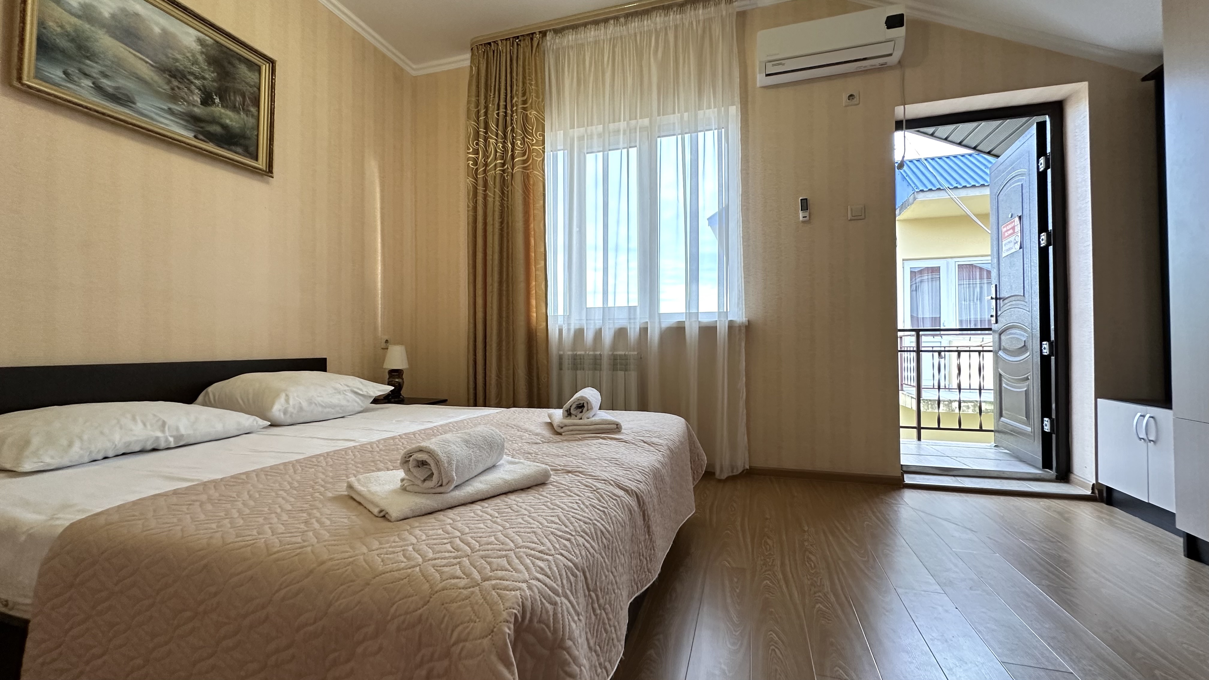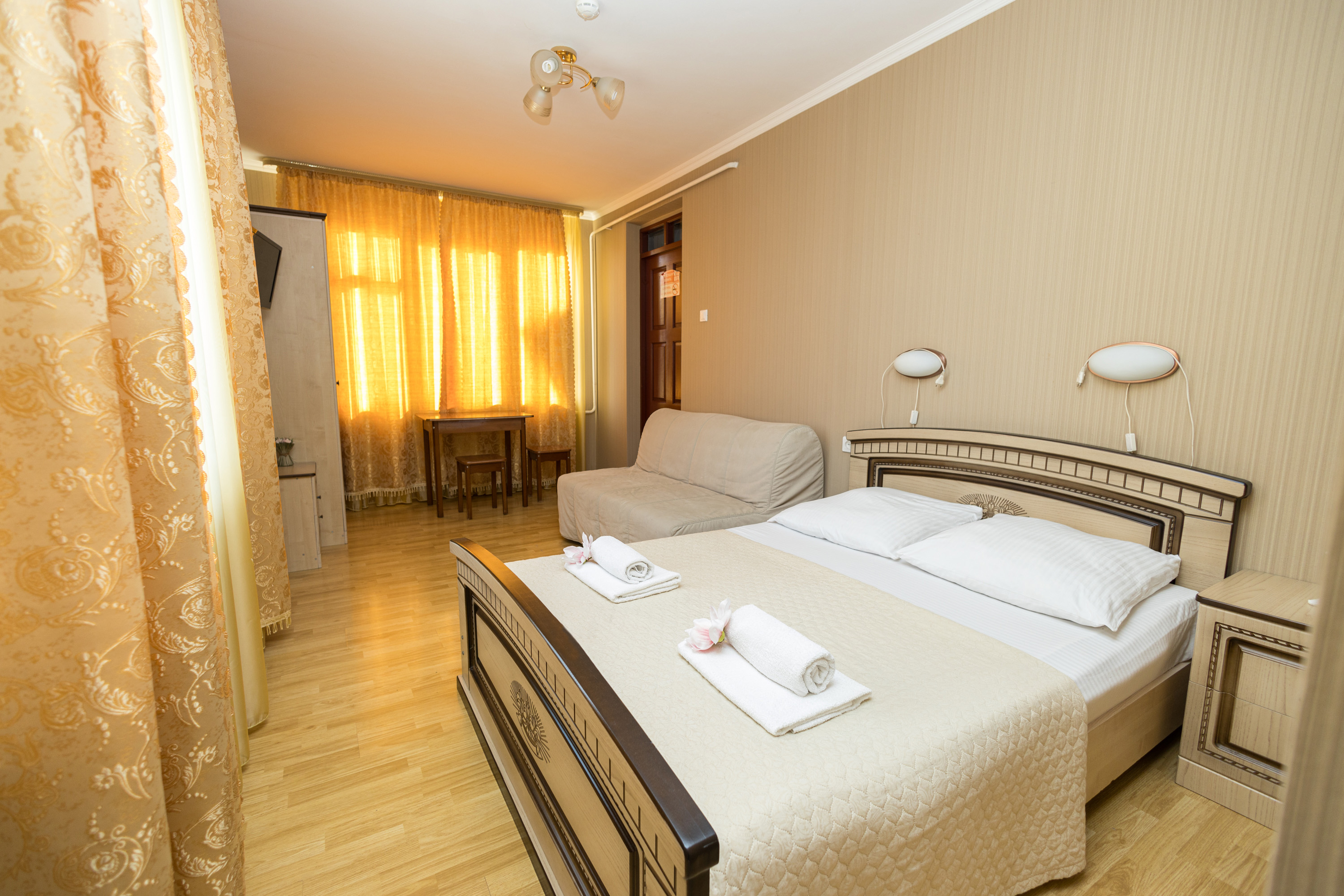В номере: диван, кровать двуспальная, прикроватные тумбочки, пуфик, стол, столик журнальный, шкаф, кондиционер, мини-холодильник, телевизор ЖК