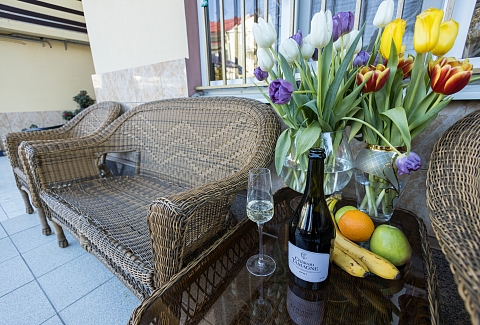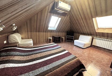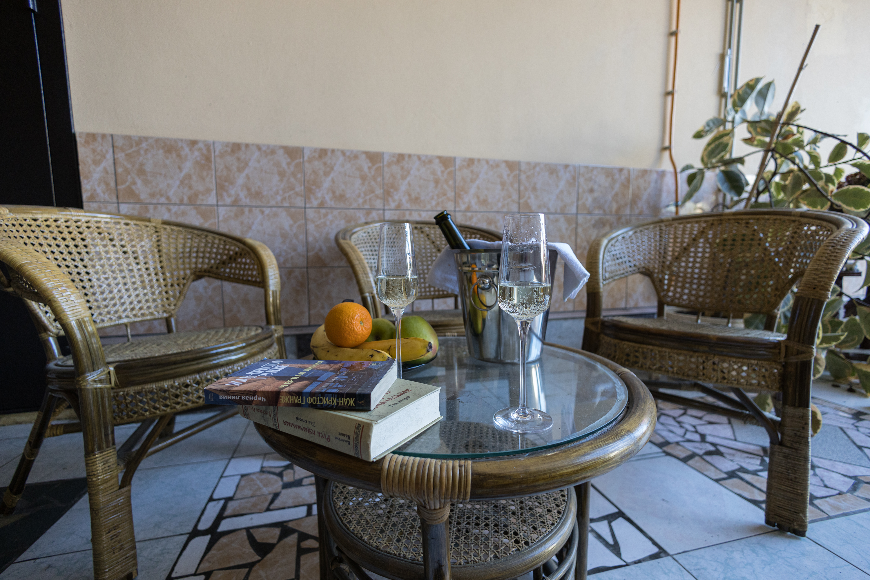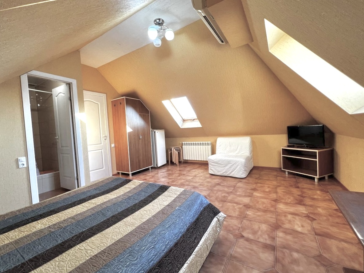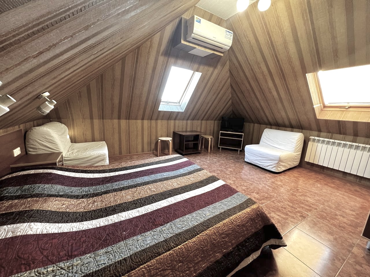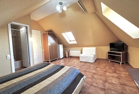В номере: диван, кровать двуспальная, прикроватные тумбочки, пуфик, стол, столик журнальный, шкаф, кондиционер, мини-холодильник, телевизор ЖК
