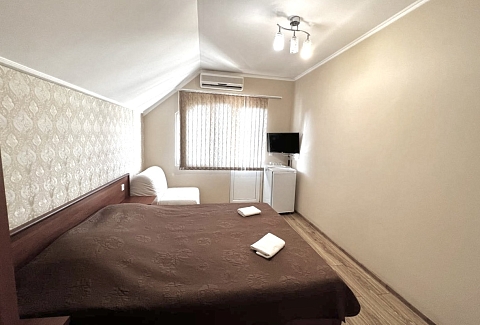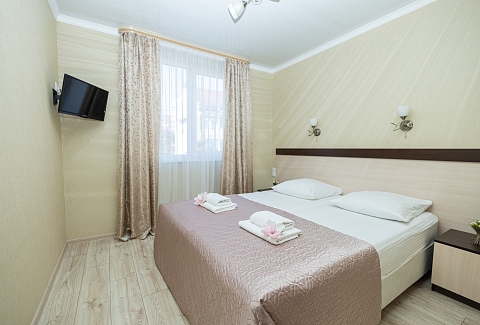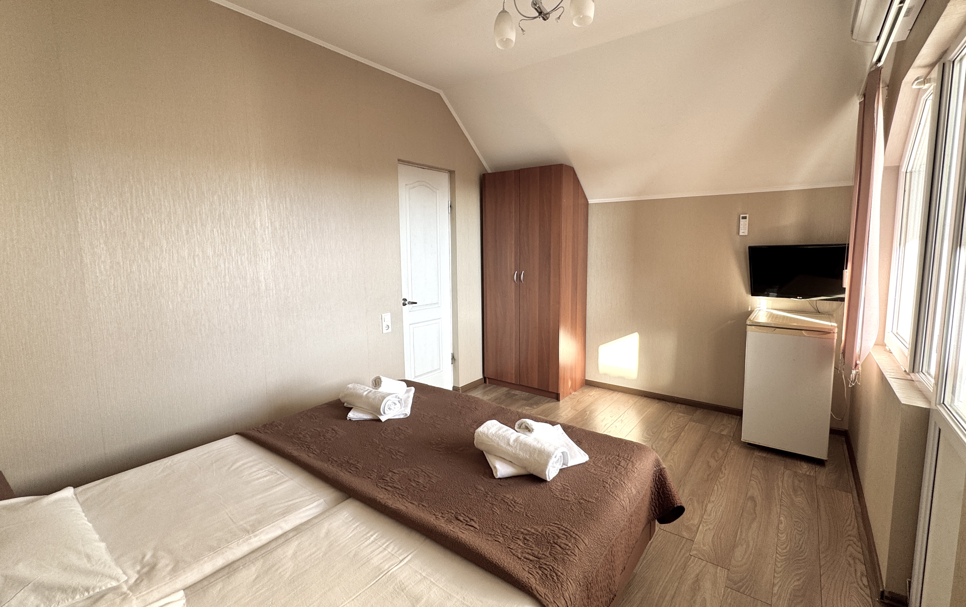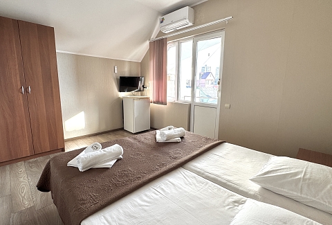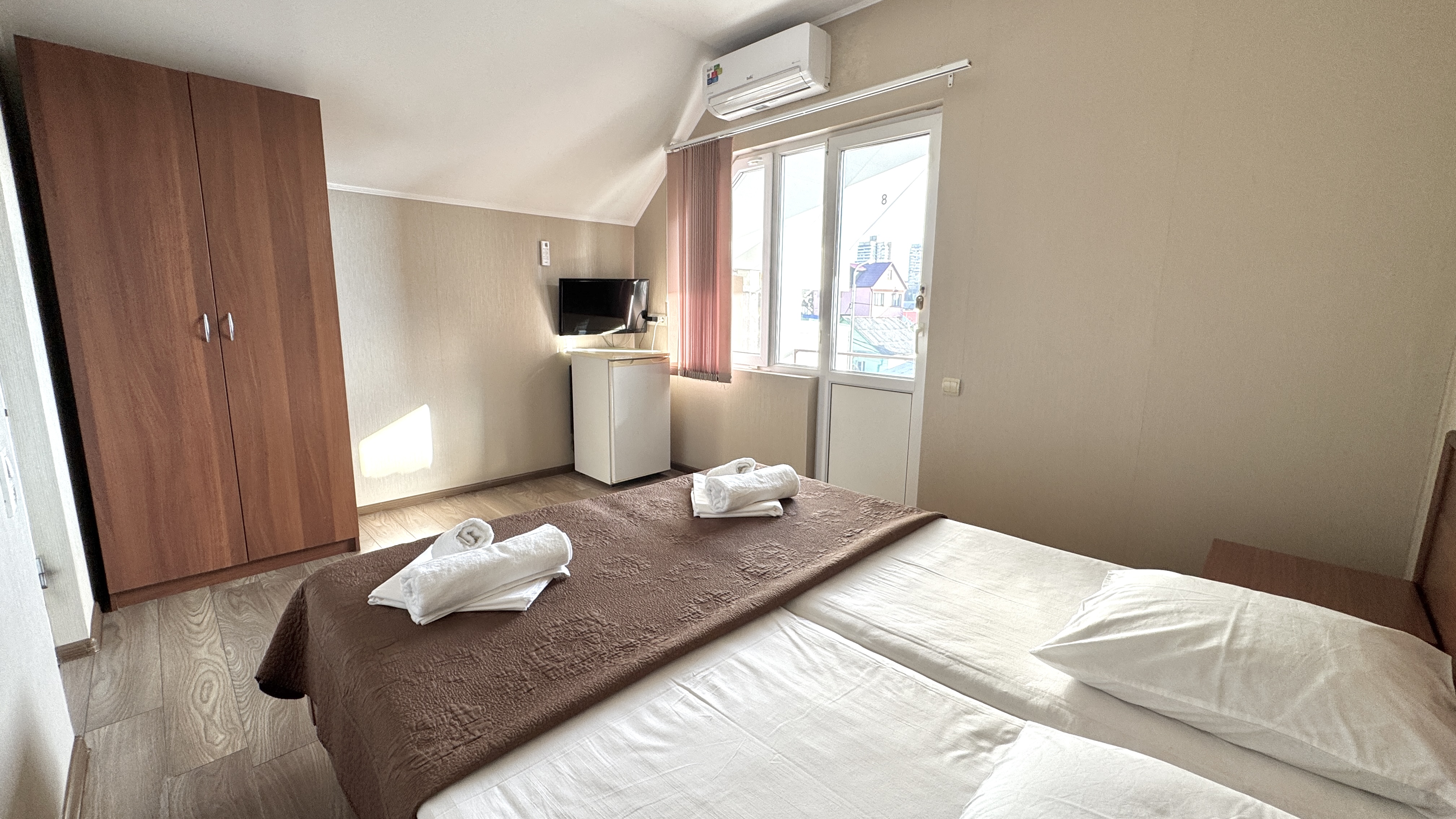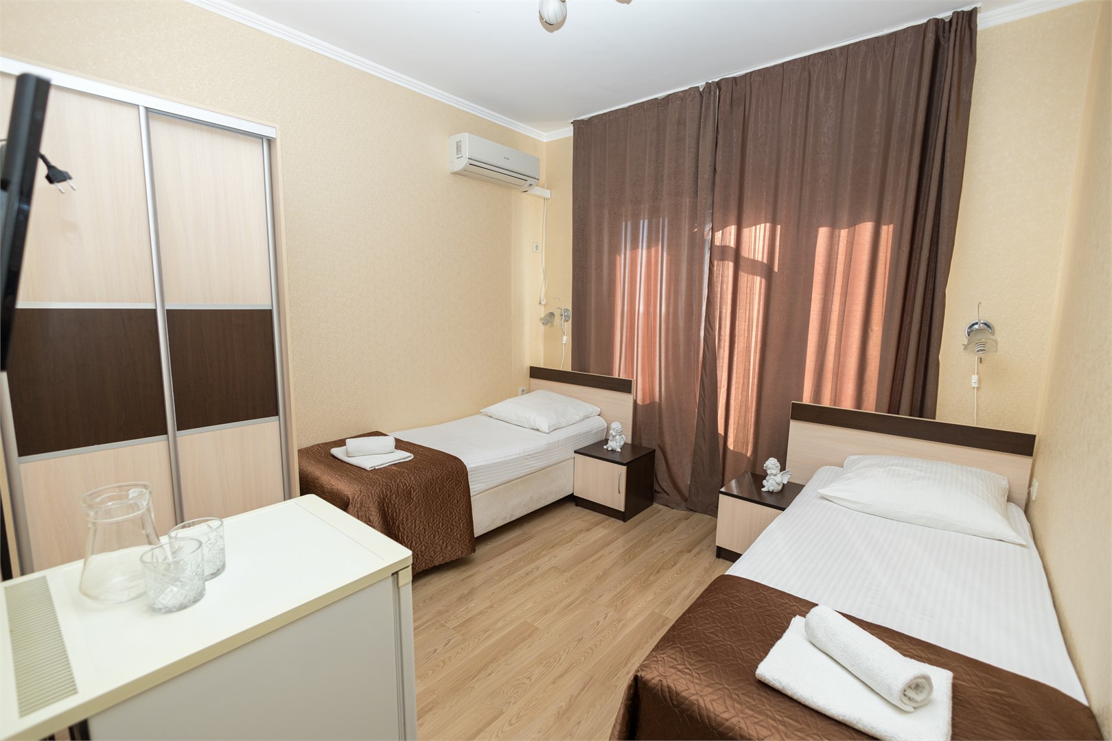 В номере: вешалка, зеркало, кресло-кровать, кровати односпальные /одна двуспальная кровать, прикроватные тумбочки, шкаф, кондиционер, телевизор, холодильник