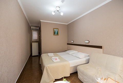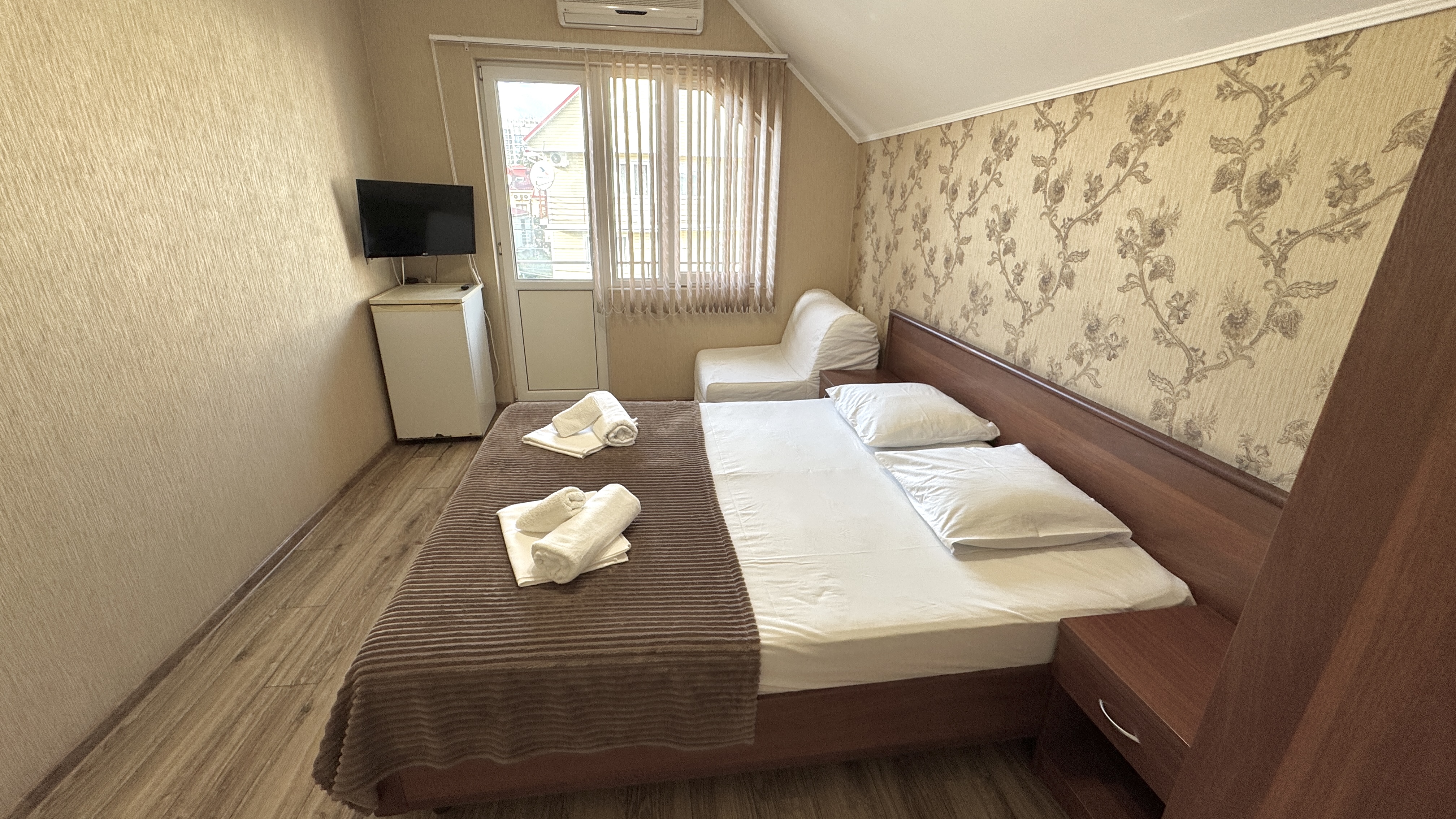 В номере: зеркало, кресло-кровать, кровати односпальные /одна двуспальная кровать, прикроватные тумбочки, шкаф, кондиционер, мини-холодильник, телевизор