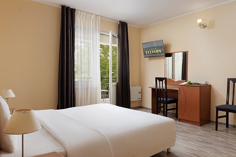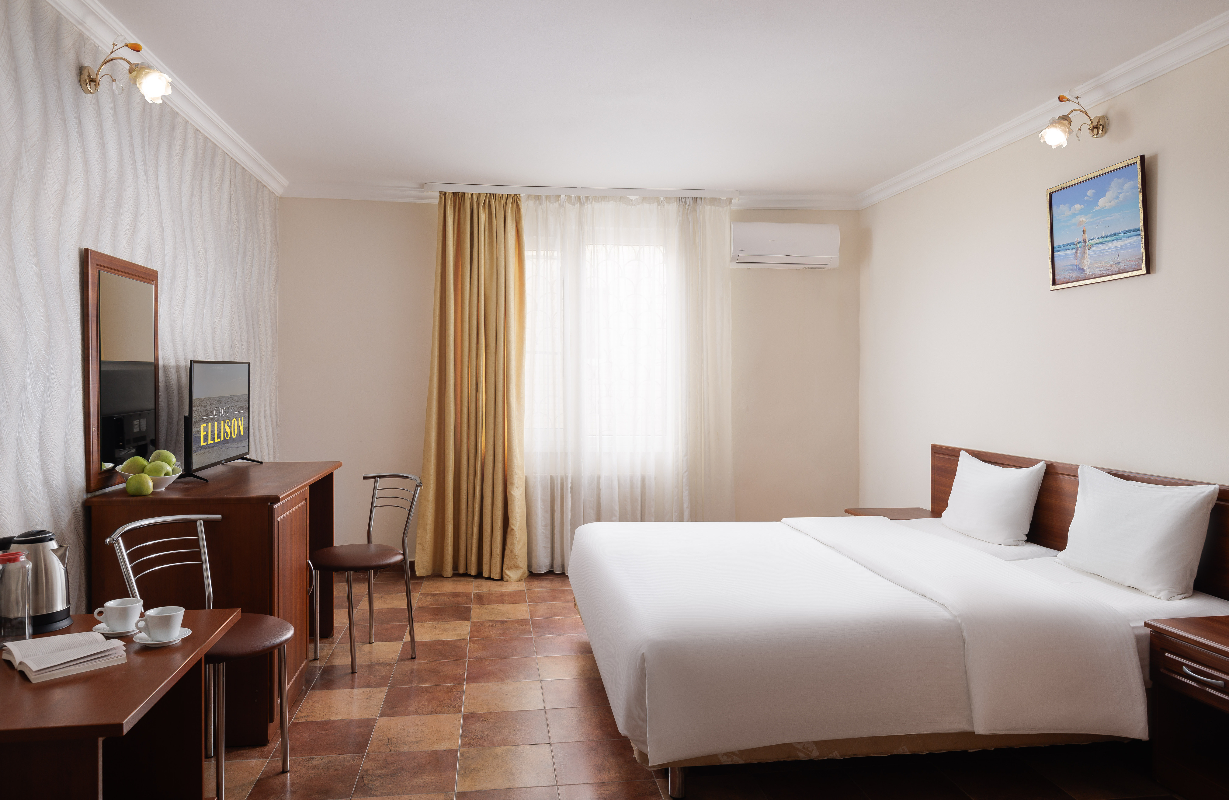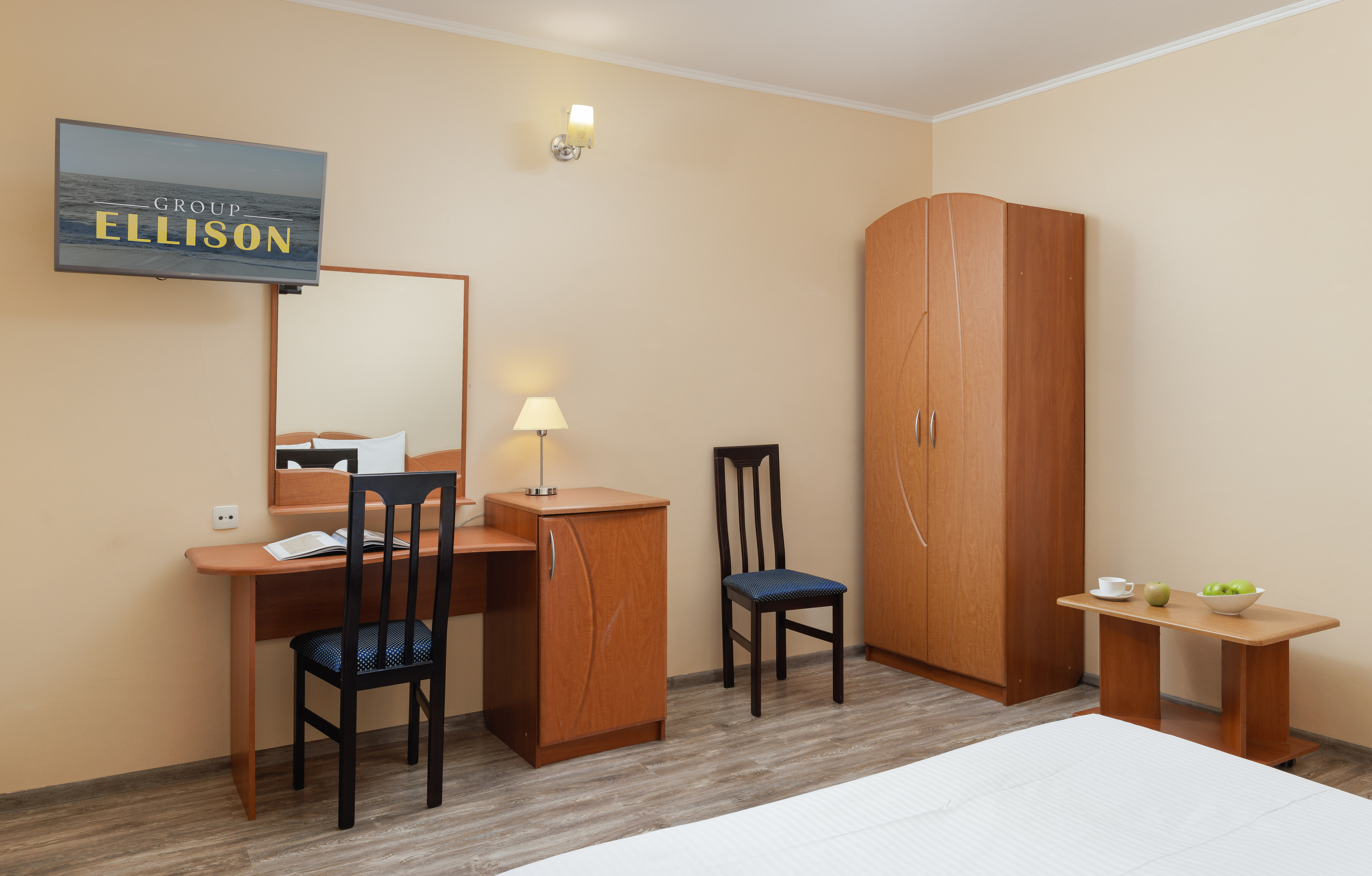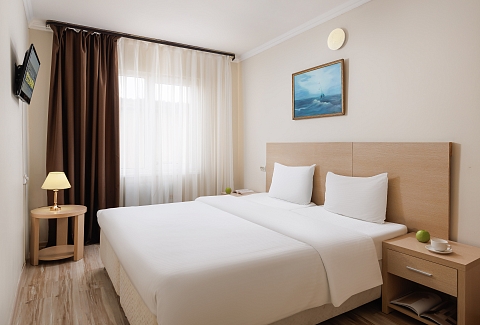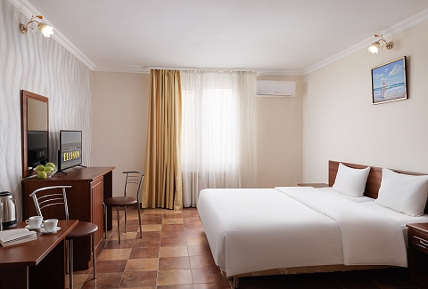 В номере: вешалка, зеркало, кровати односпальные /одна двуспальная кровать, прикроватные тумбочки, стол, стулья, шкаф, кондиционер, мини-холодильник, телевизор ЖК, чайный набор посуды, электрочайник