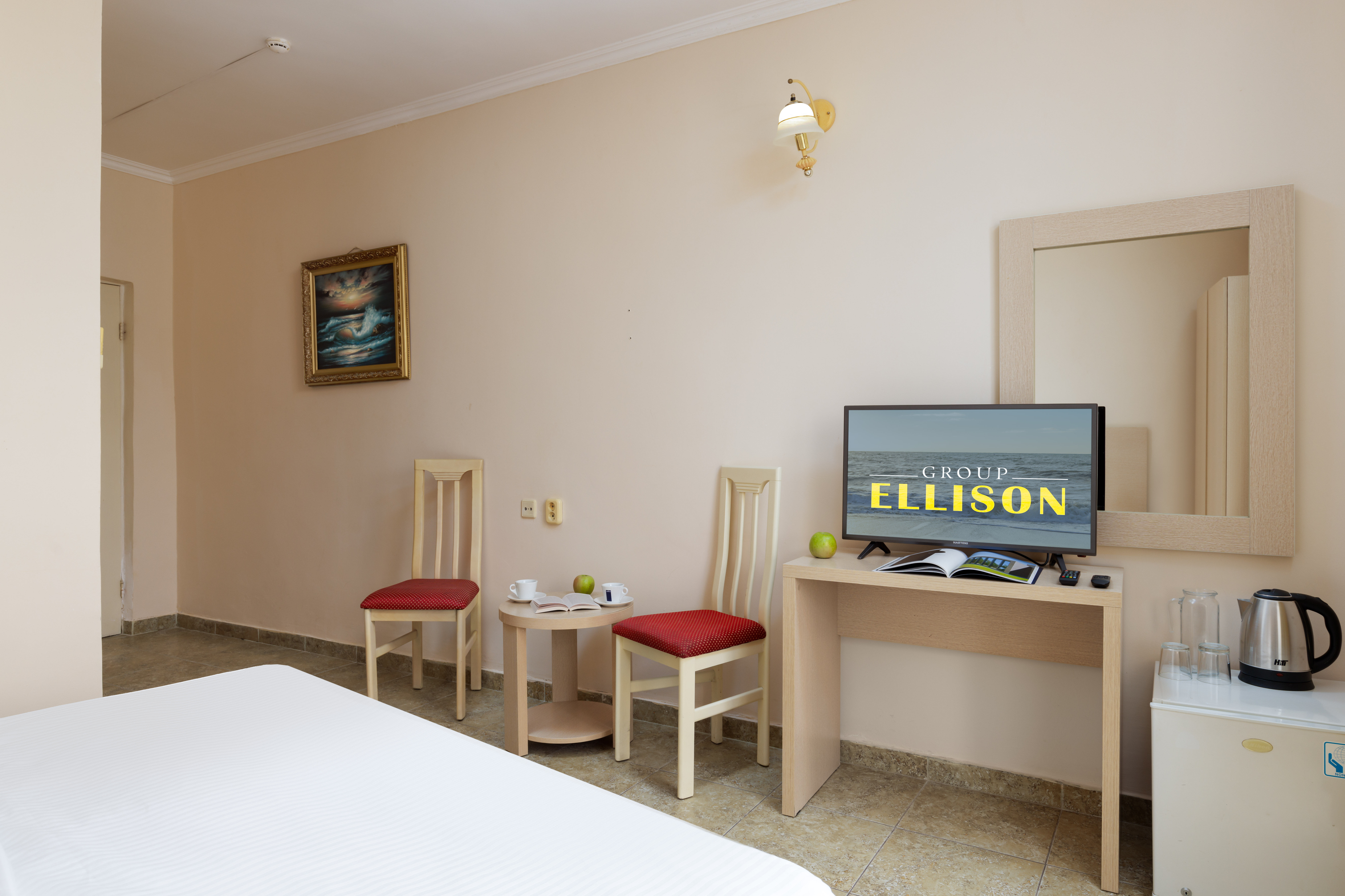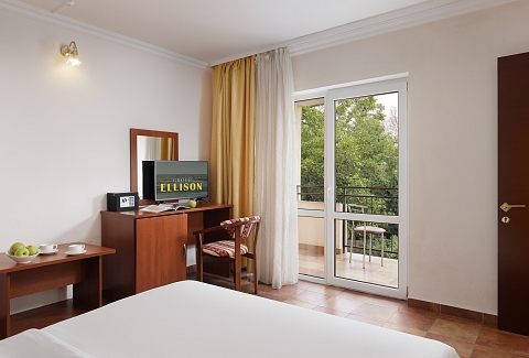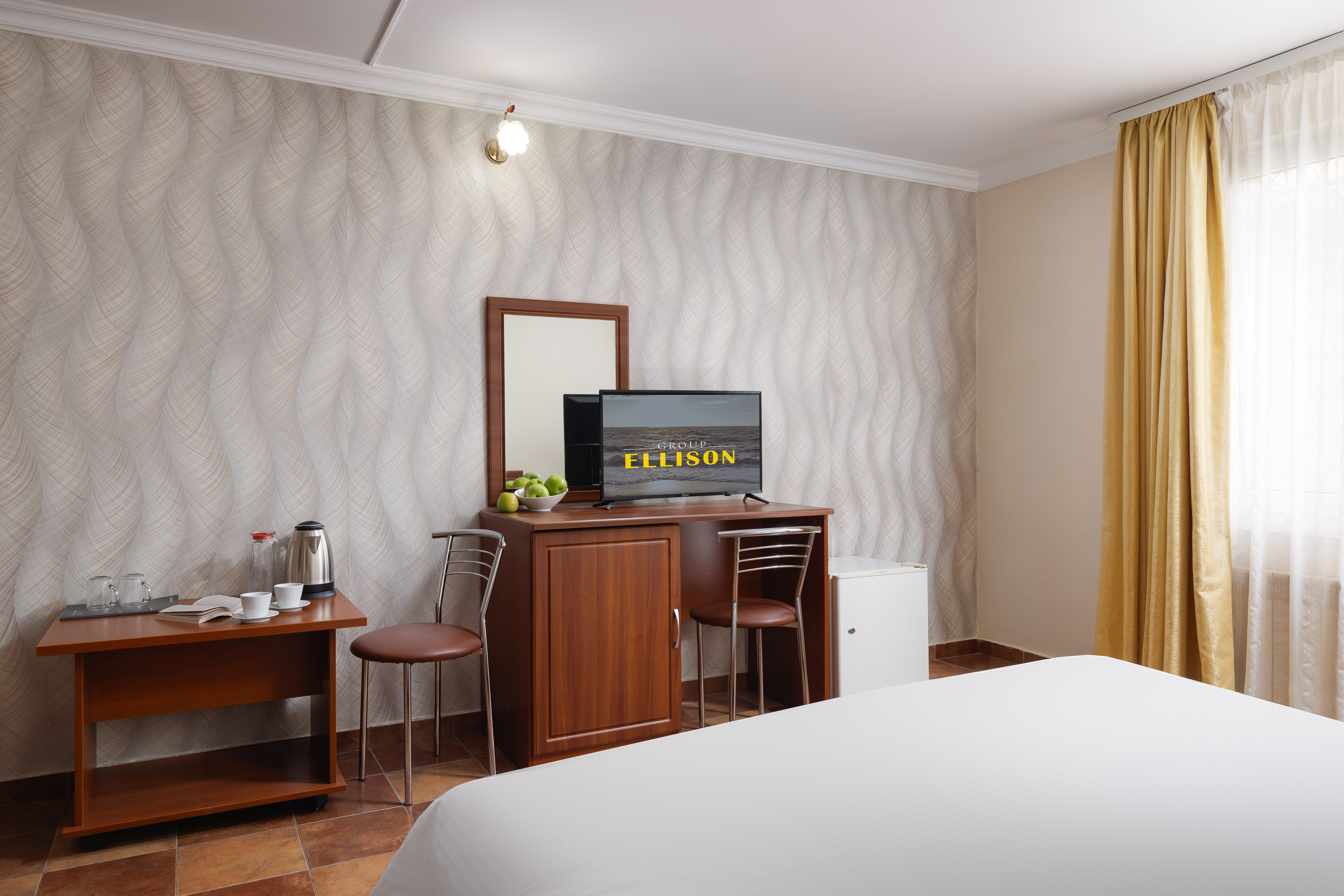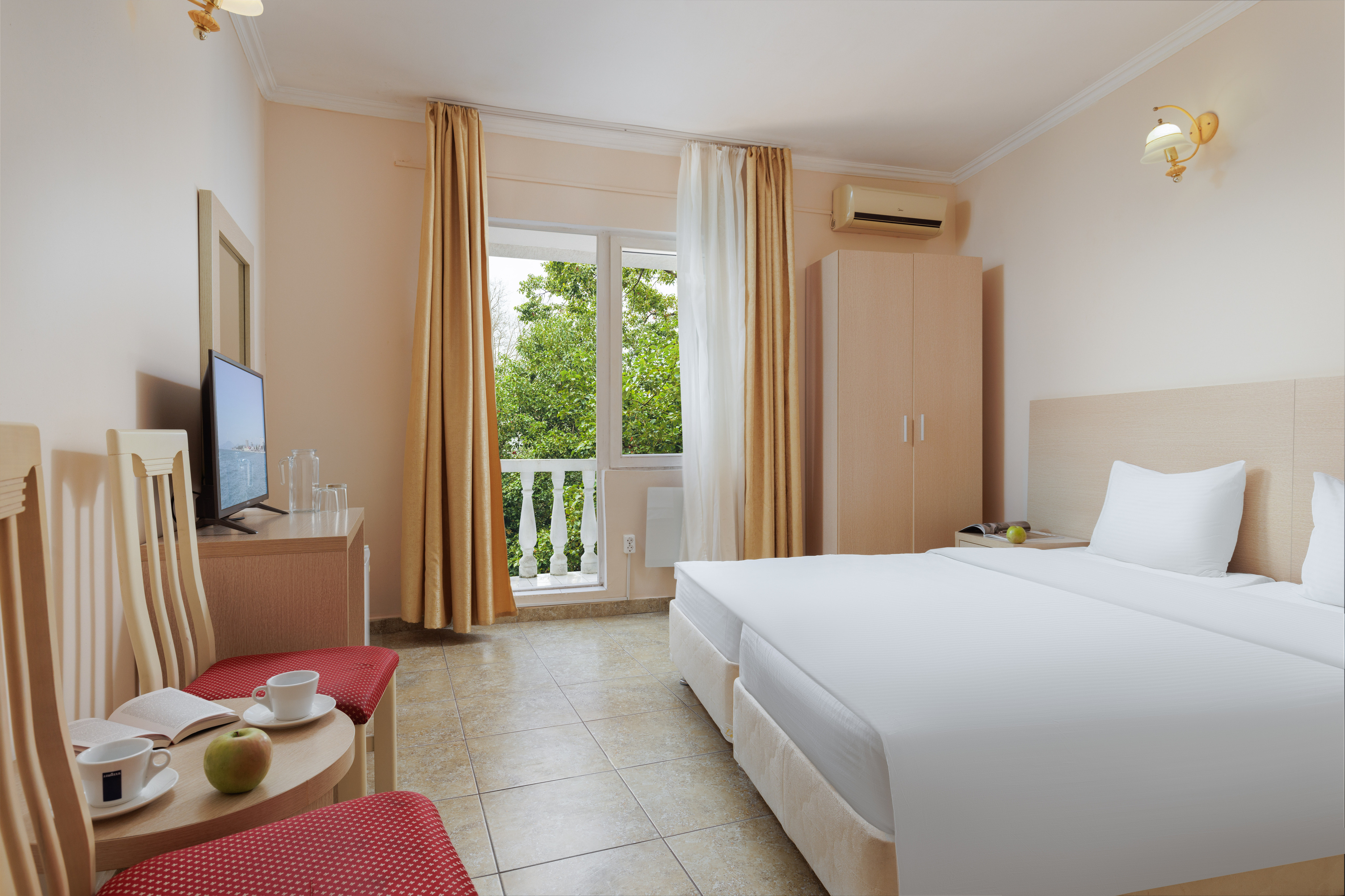 В номере: вешалка, зеркало, кровати односпальные /одна двуспальная кровать, прикроватные тумбочки, стол, стулья, шкаф, кондиционер, мини-холодильник, телевизор ЖК, чайный набор посуды, электрочайник