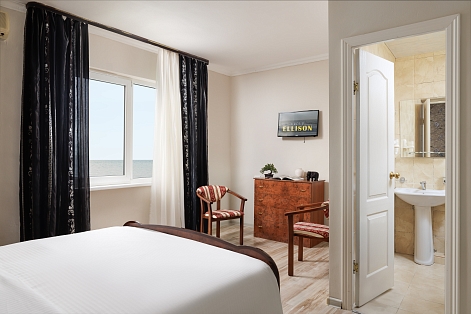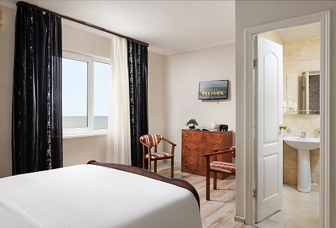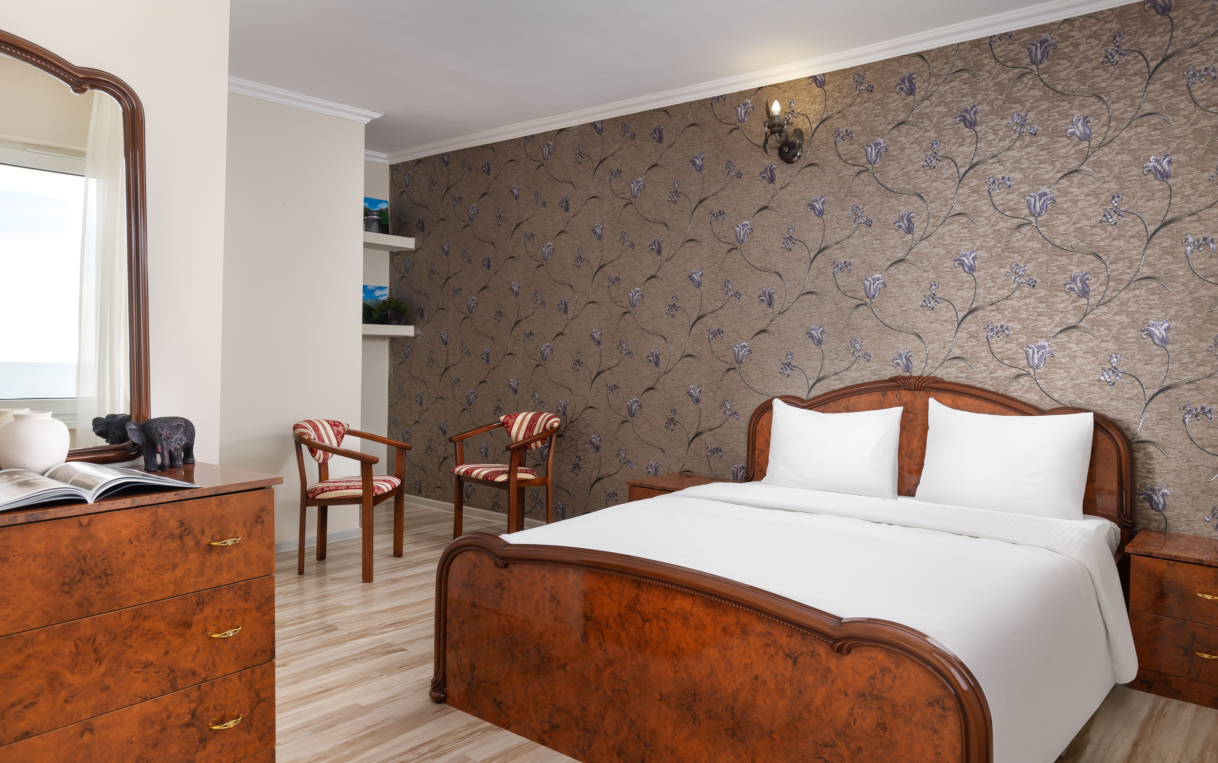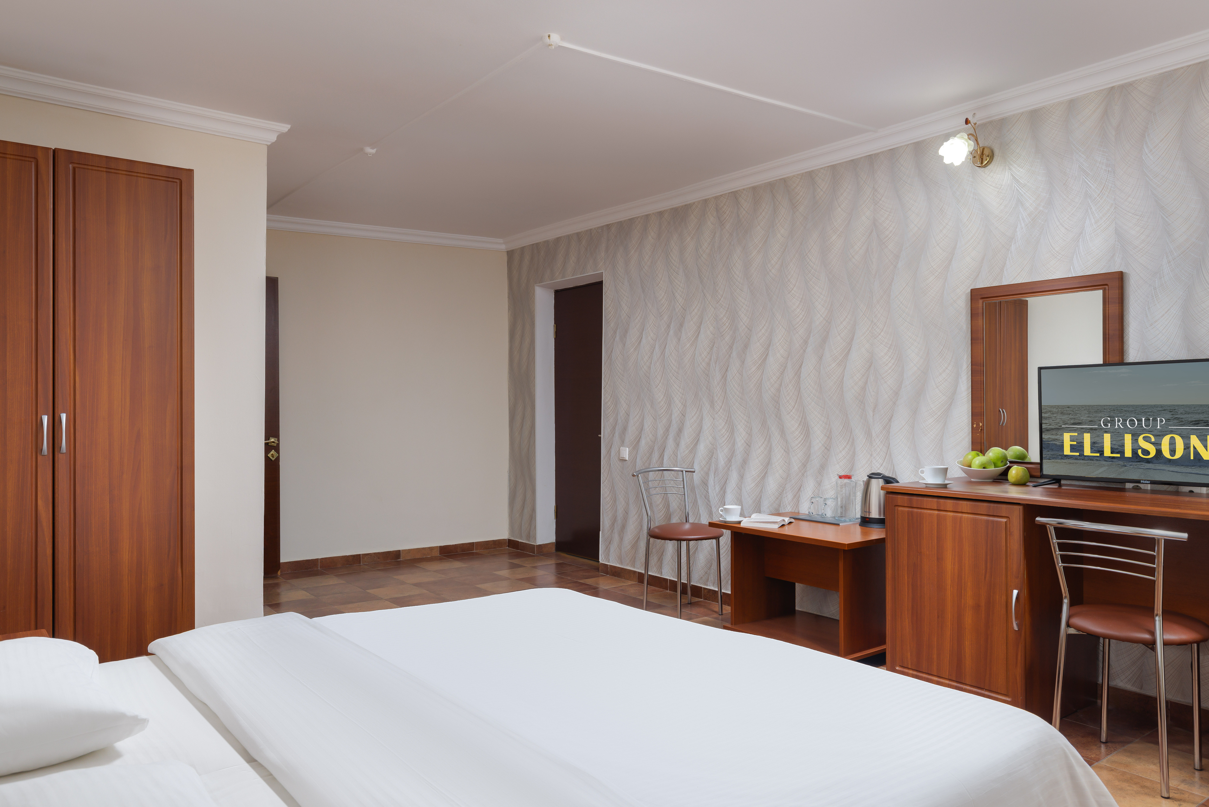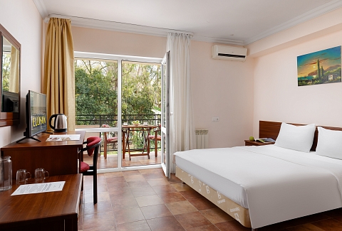 В номере: вешалка, диван, зеркало, кровати односпальные /одна двуспальная кровать, прикроватные тумбочки, стол, стулья, шкаф, кондиционер, мини-холодильник, телевизор ЖК, чайный набор посуды, электрочайник