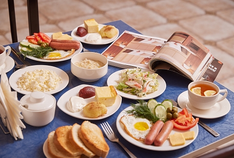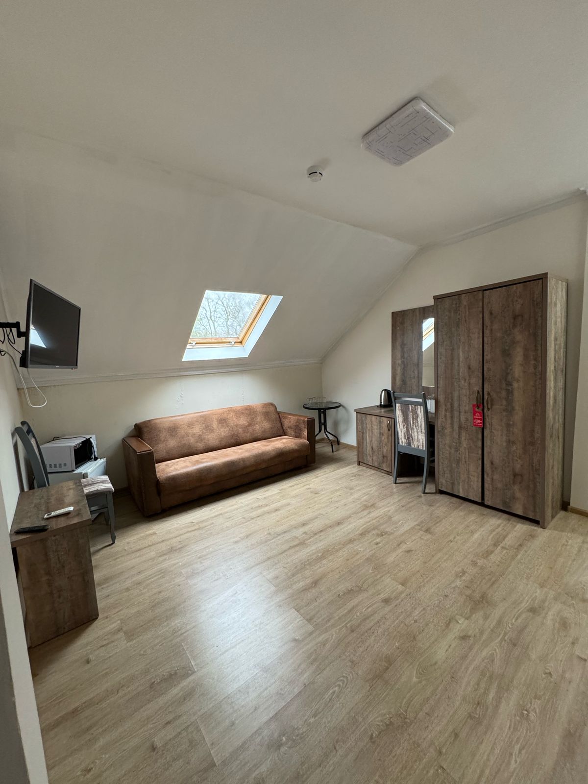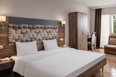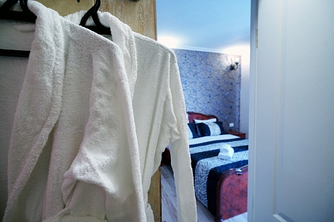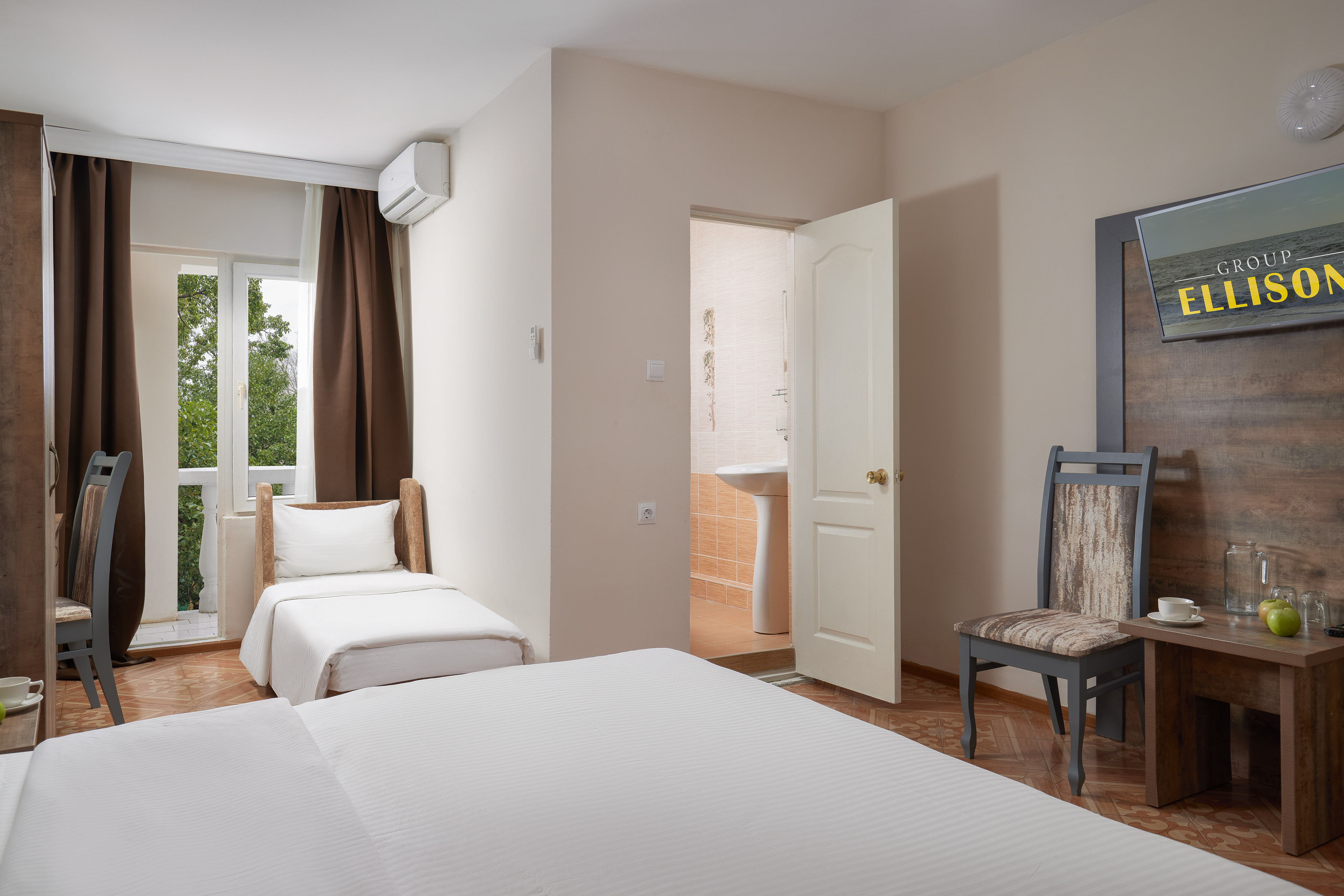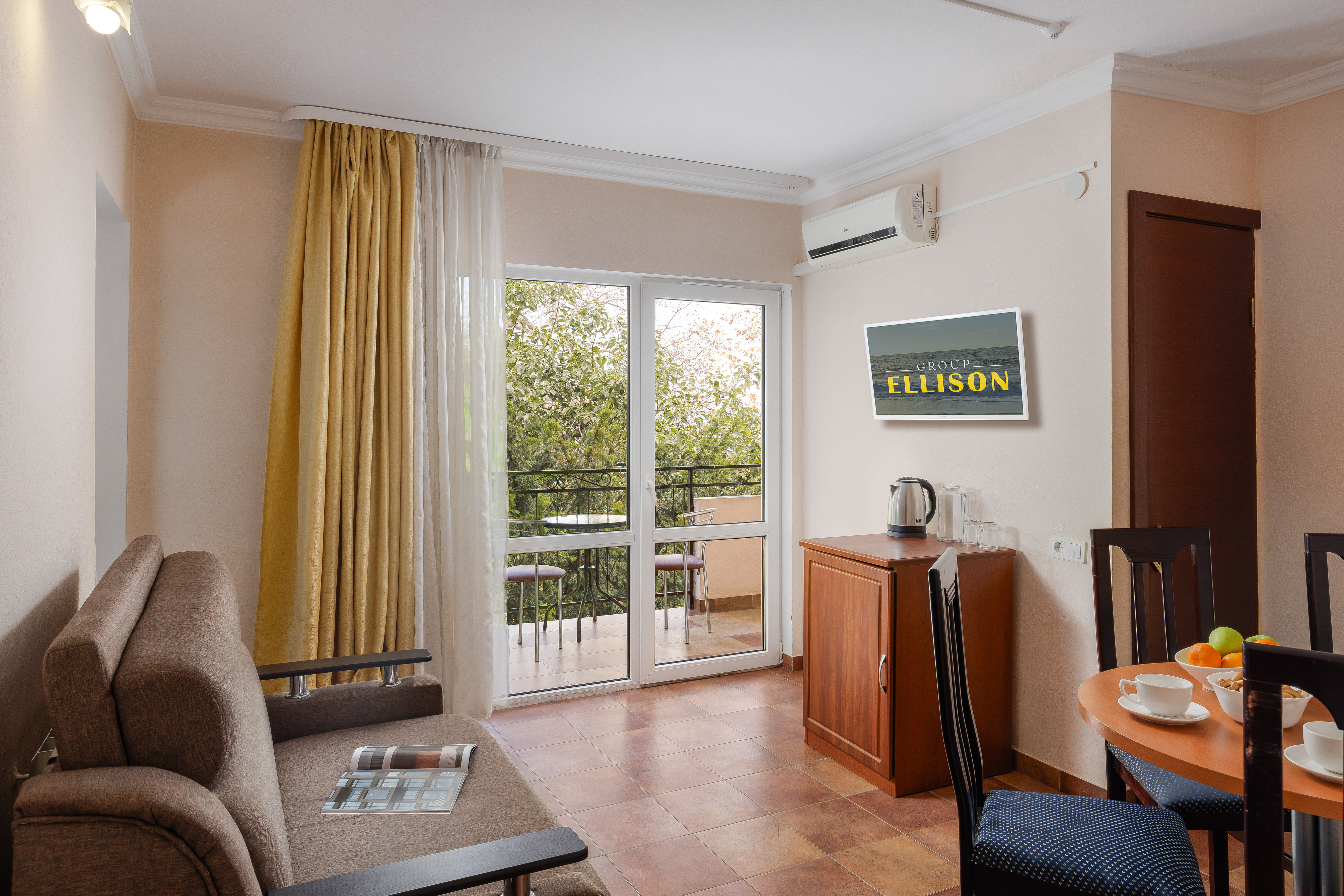В номере: вешалка, диван, зеркало, кровати односпальные /одна двуспальная кровать, прикроватные тумбочки, стол, стулья, шкаф, кондиционер, мини-холодильник, телевизор ЖК, чайный набор посуды, электрочайник