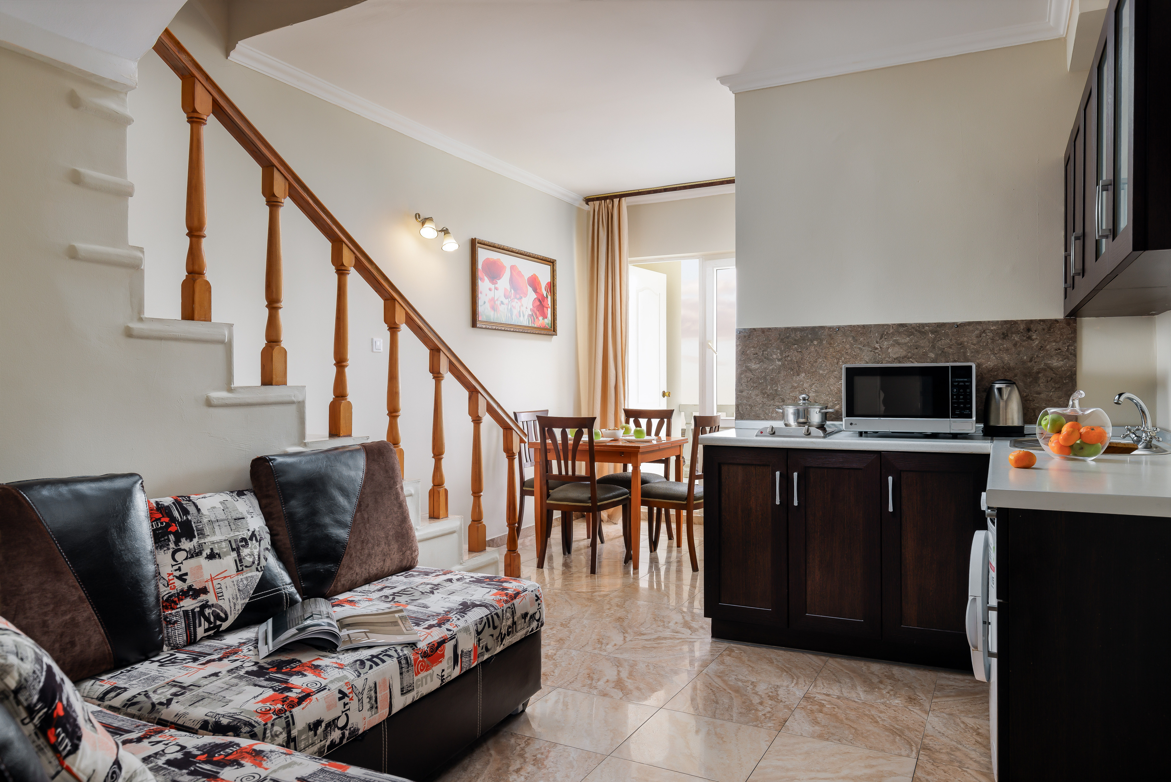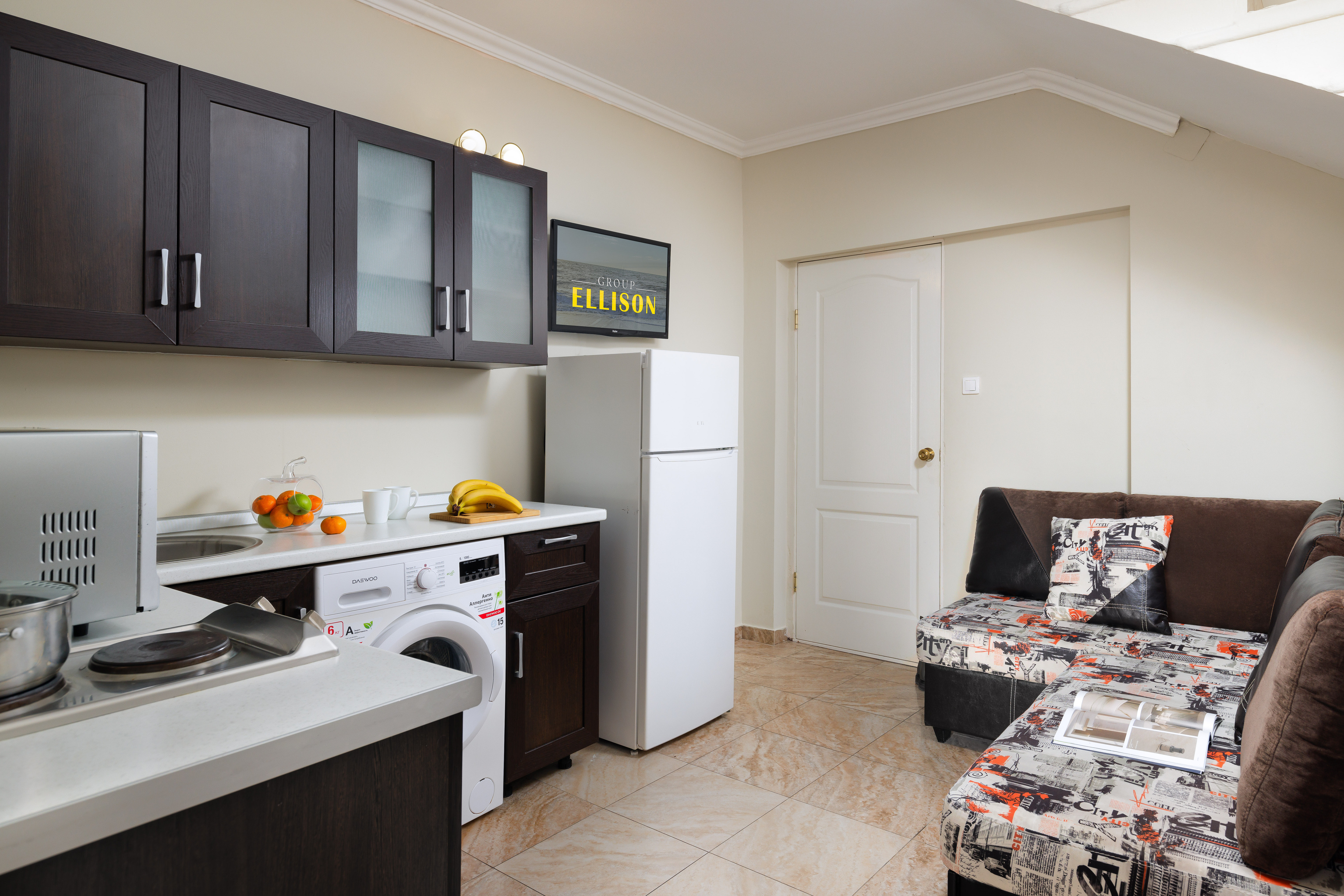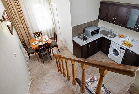 В номере: вешалка, диван раскладной, зеркало, кровать двуспальная, кухонная мебель, прикроватные тумбочки, стол, стулья, шкаф, гладильная доска, кондиционер, микроволновая печь, набор посуды, плита электрическая, стиральная машина, телевизор ЖК, утюг, холодильник, чайный набор посуды, электрочайник