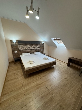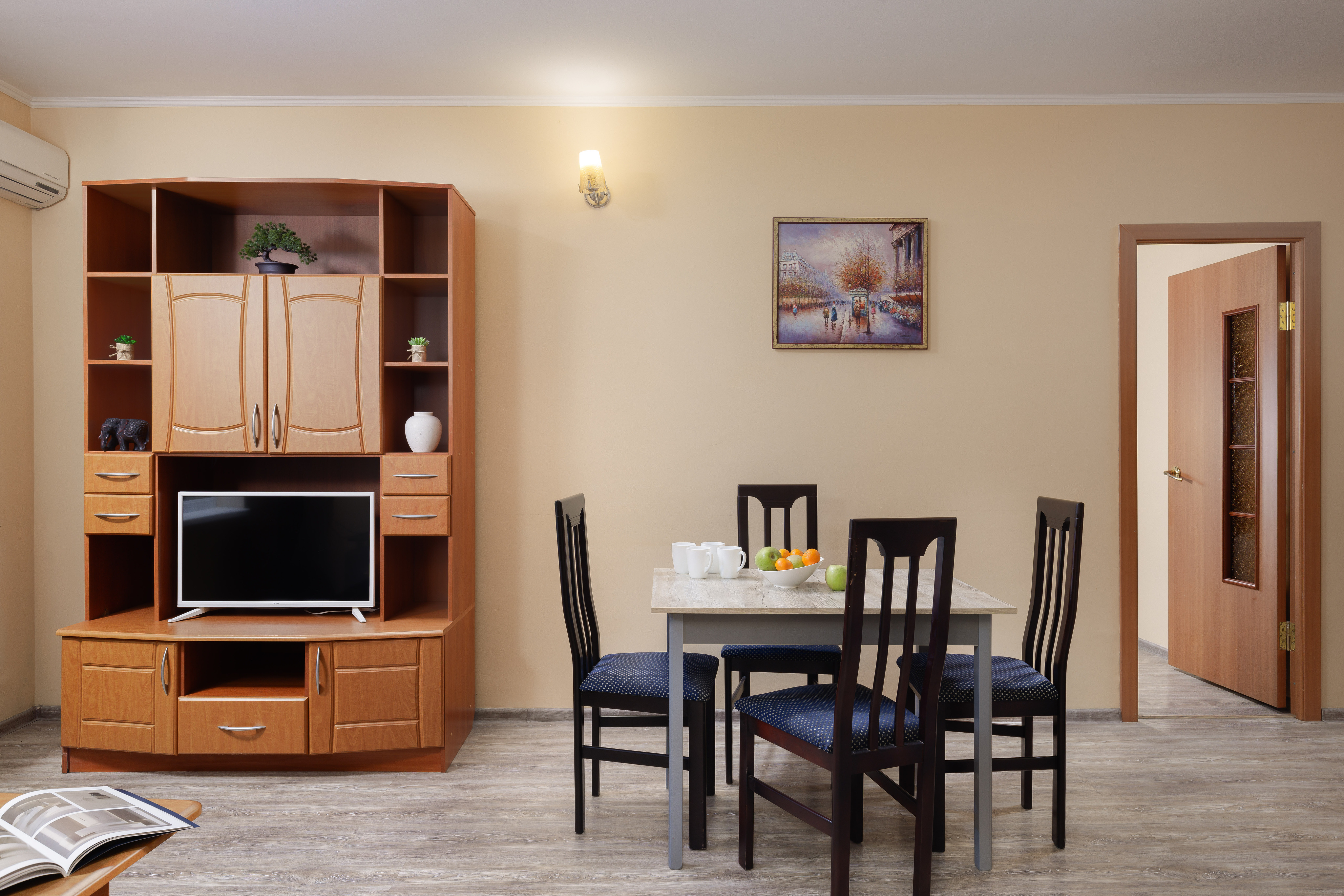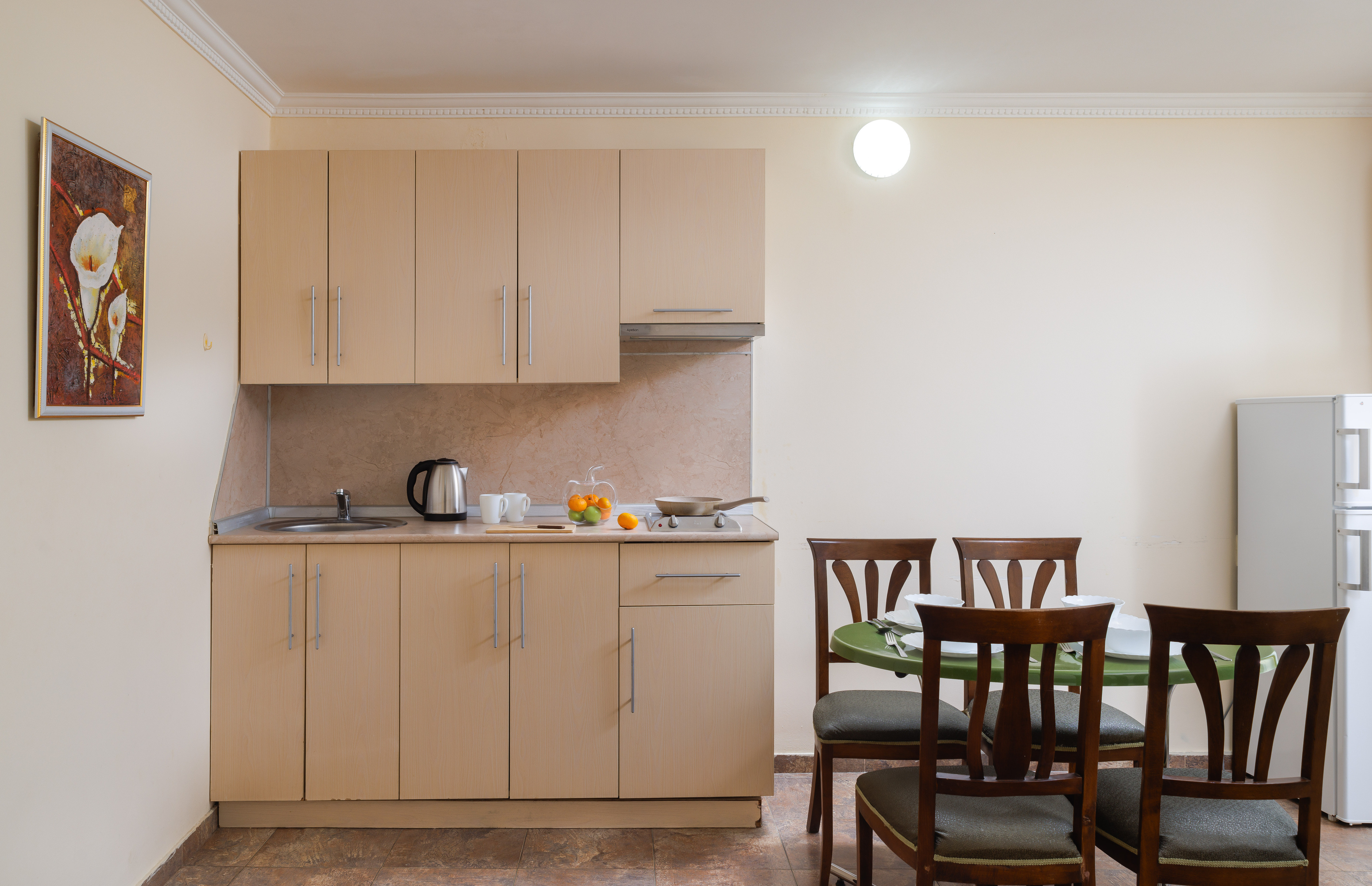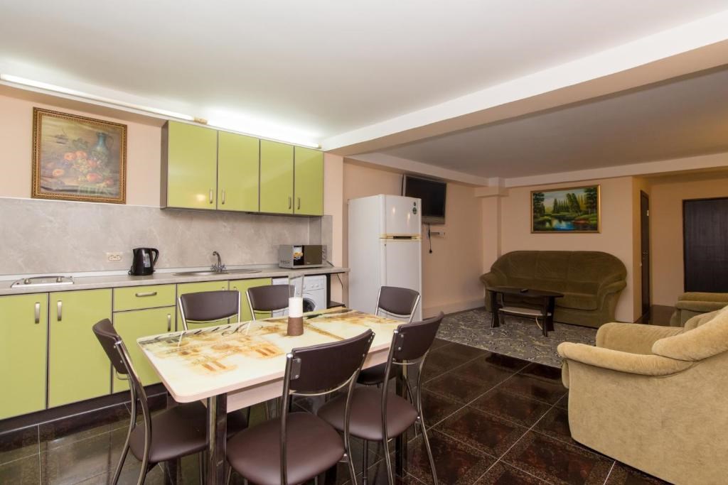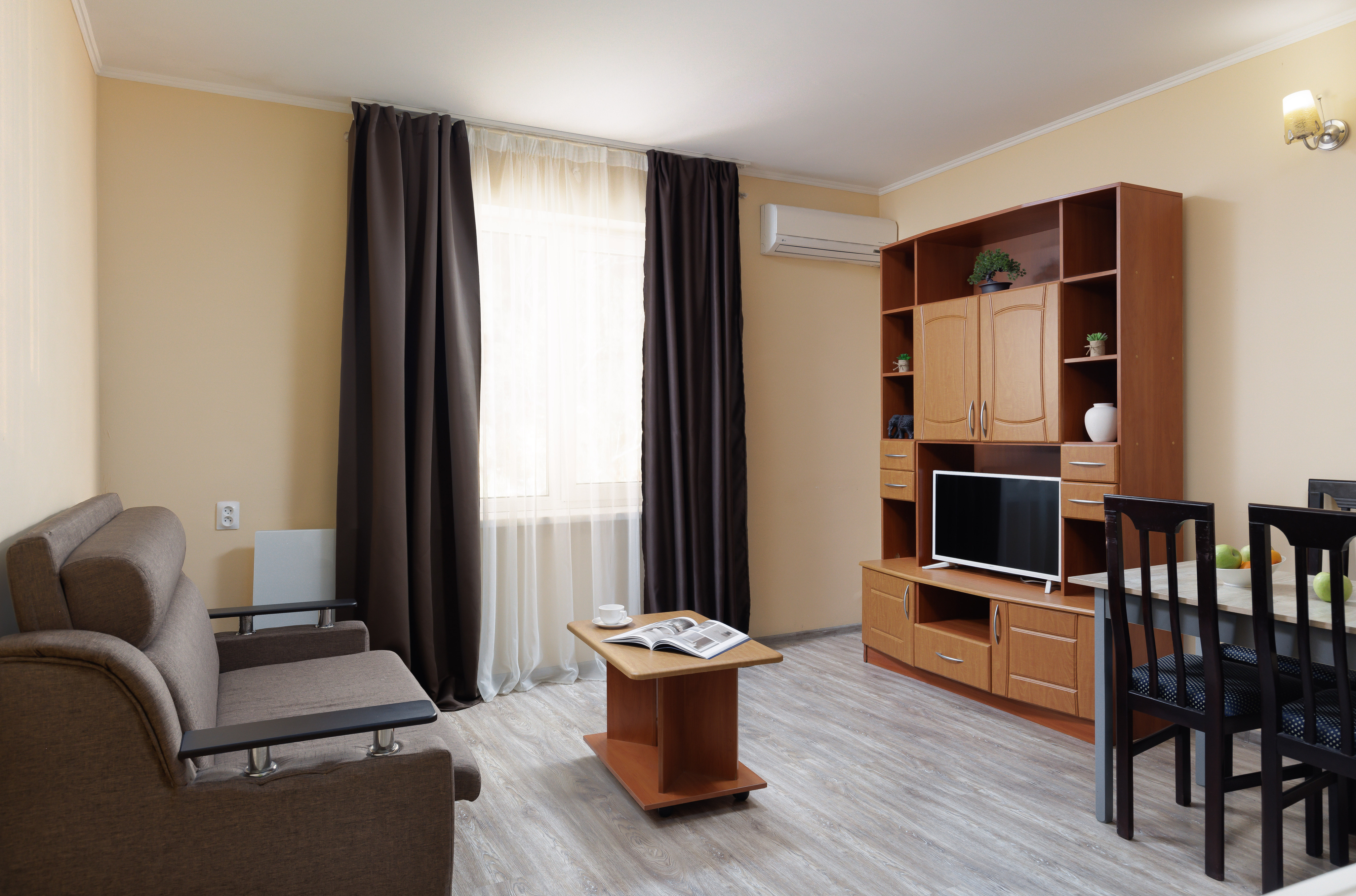 В номере: вешалка, диван раскладной, зеркало, кровати односпальные /одна двуспальная кровать, кухонная мебель, прикроватные тумбочки, стол, стулья, шкаф, гладильная доска, кондиционер, набор посуды, плита электрическая, телевизор ЖК, утюг, холодильник, чайный набор посуды, электрочайник