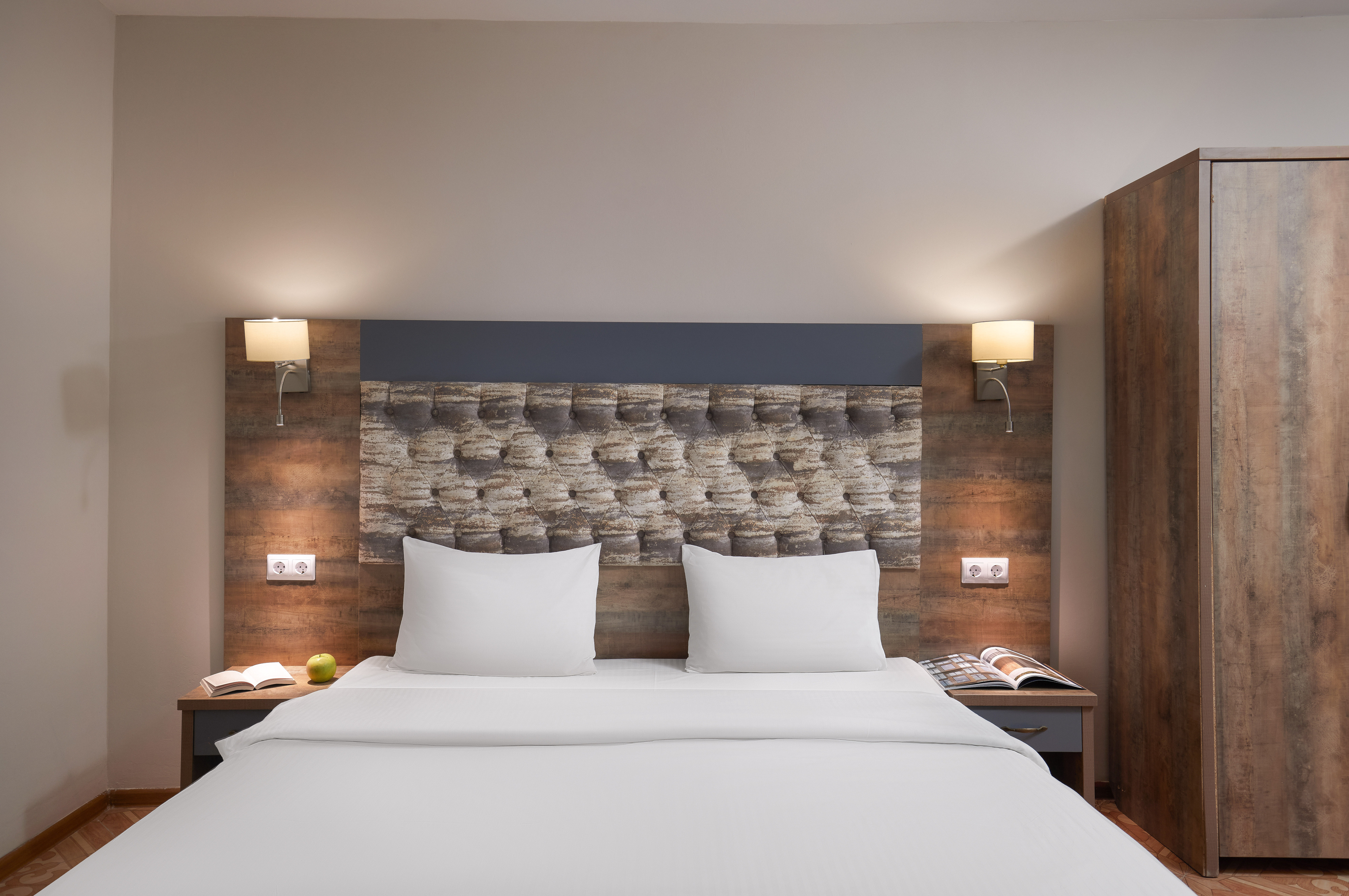 В номере: вешалка, зеркало, кресло-кровать, кровати односпальные, прикроватные тумбочки, стол, стулья, шкаф, кондиционер, мини-холодильник, телевизор ЖК, чайный набор посуды, электрочайник