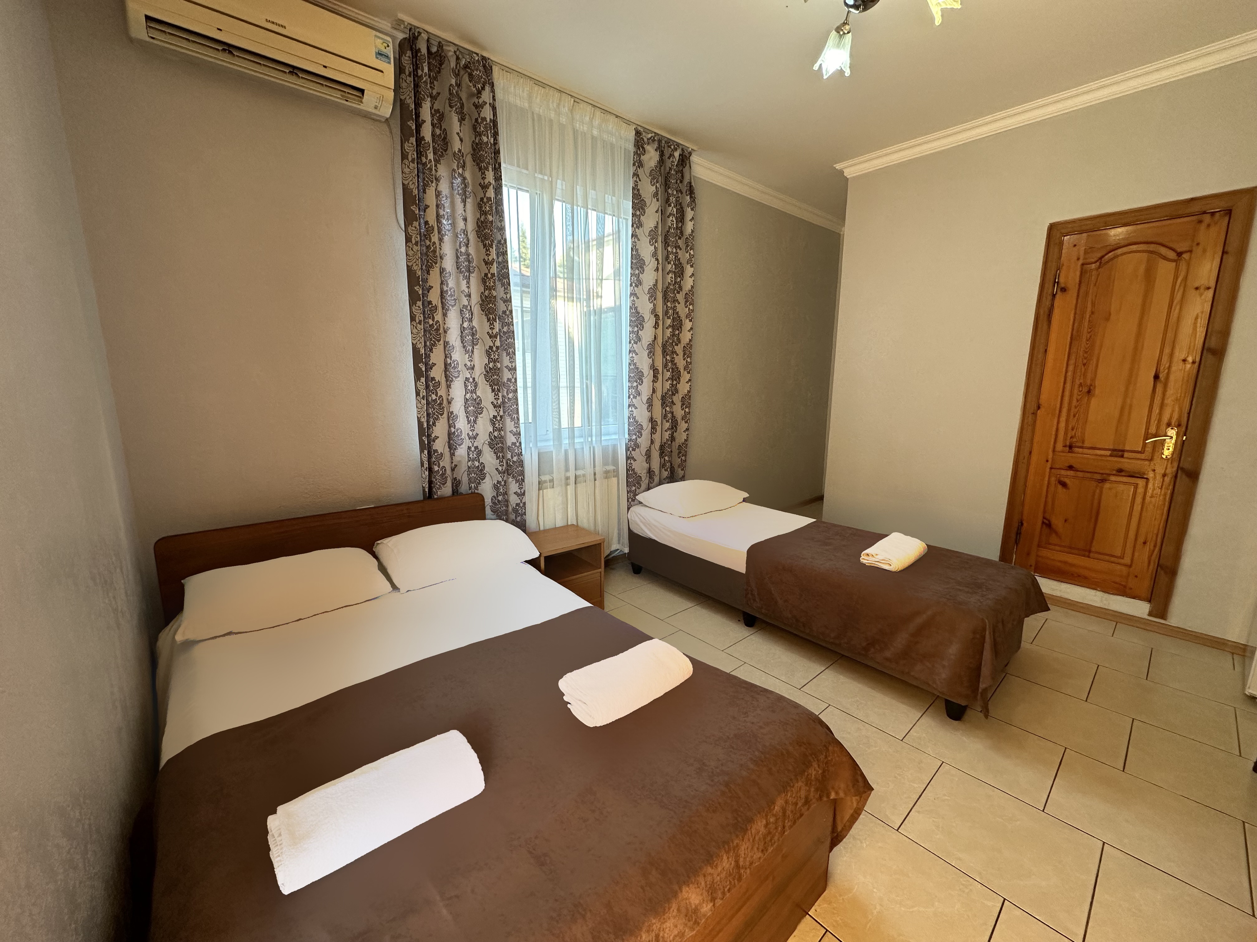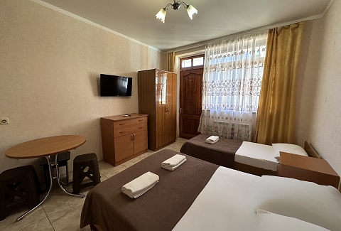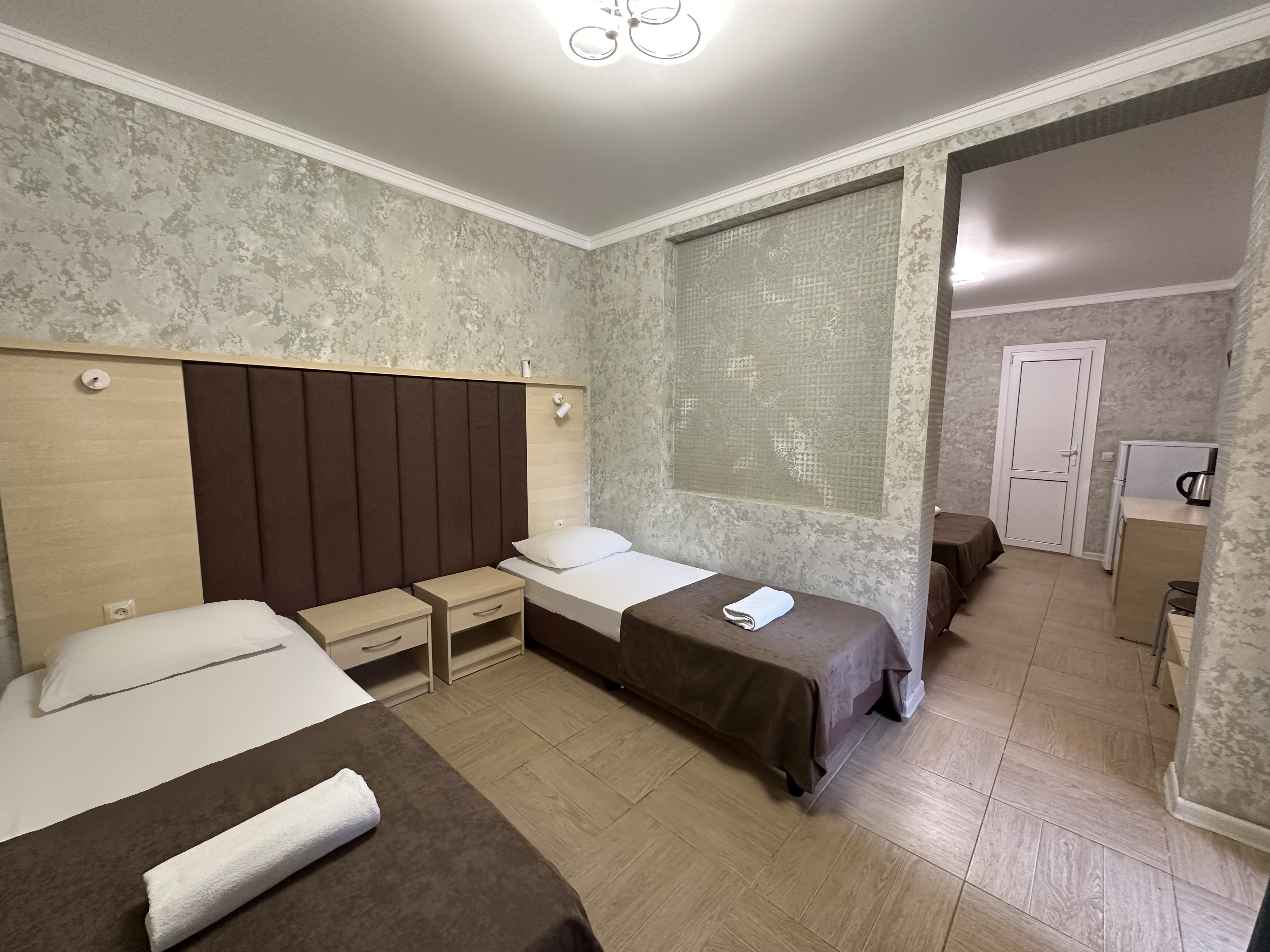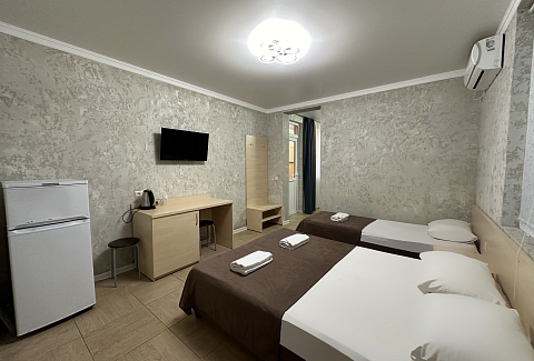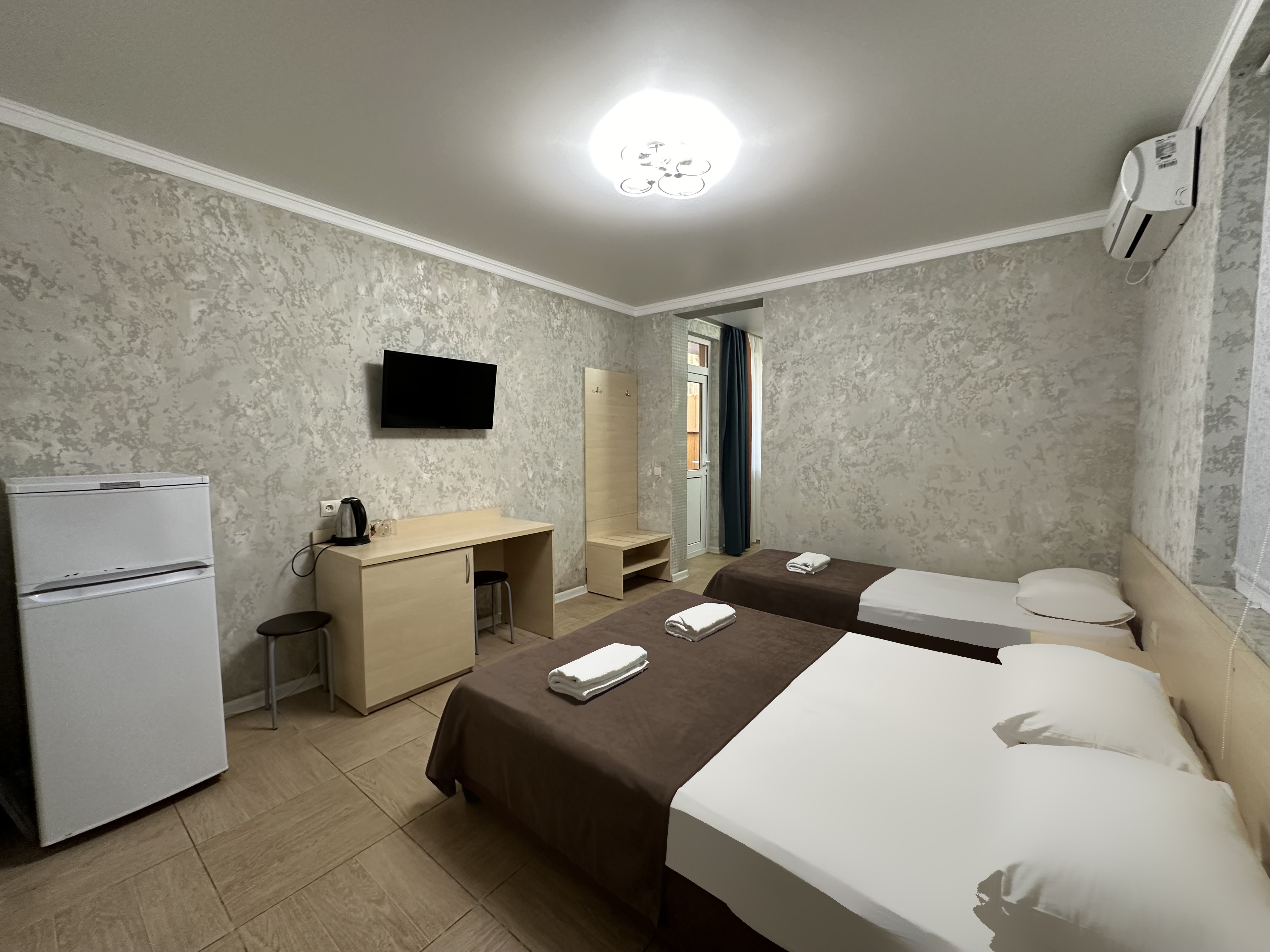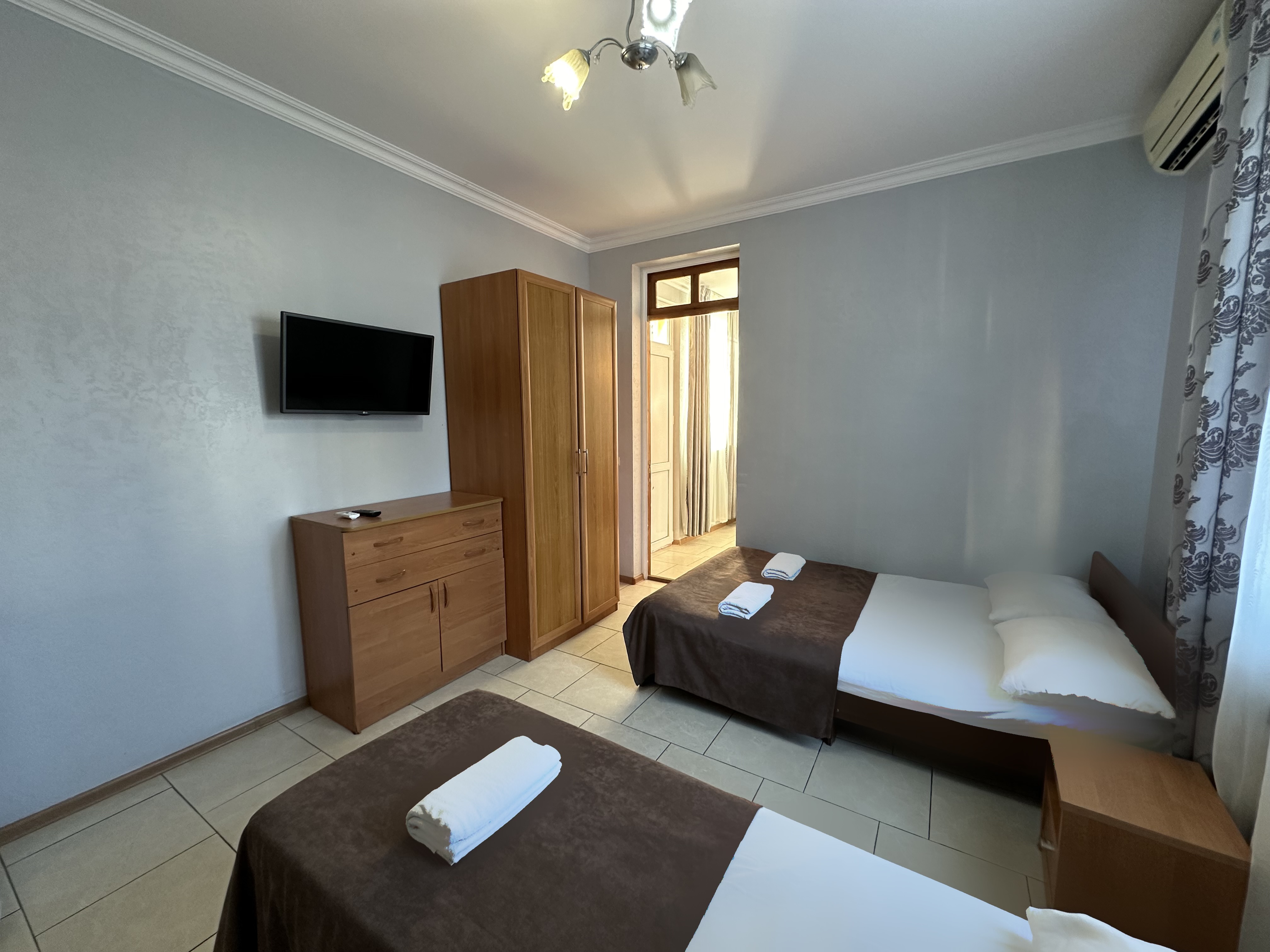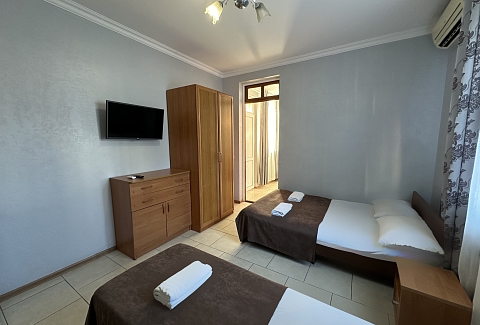 В номере: кровать двуспальная, кровать односпальная, прикроватные тумбочки, шкаф, кондиционер, сейф, телевизор, холодильник, чайный набор посуды