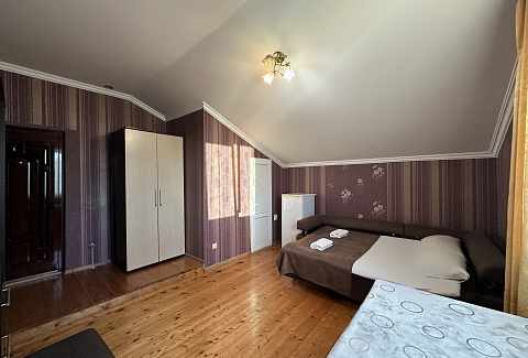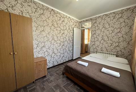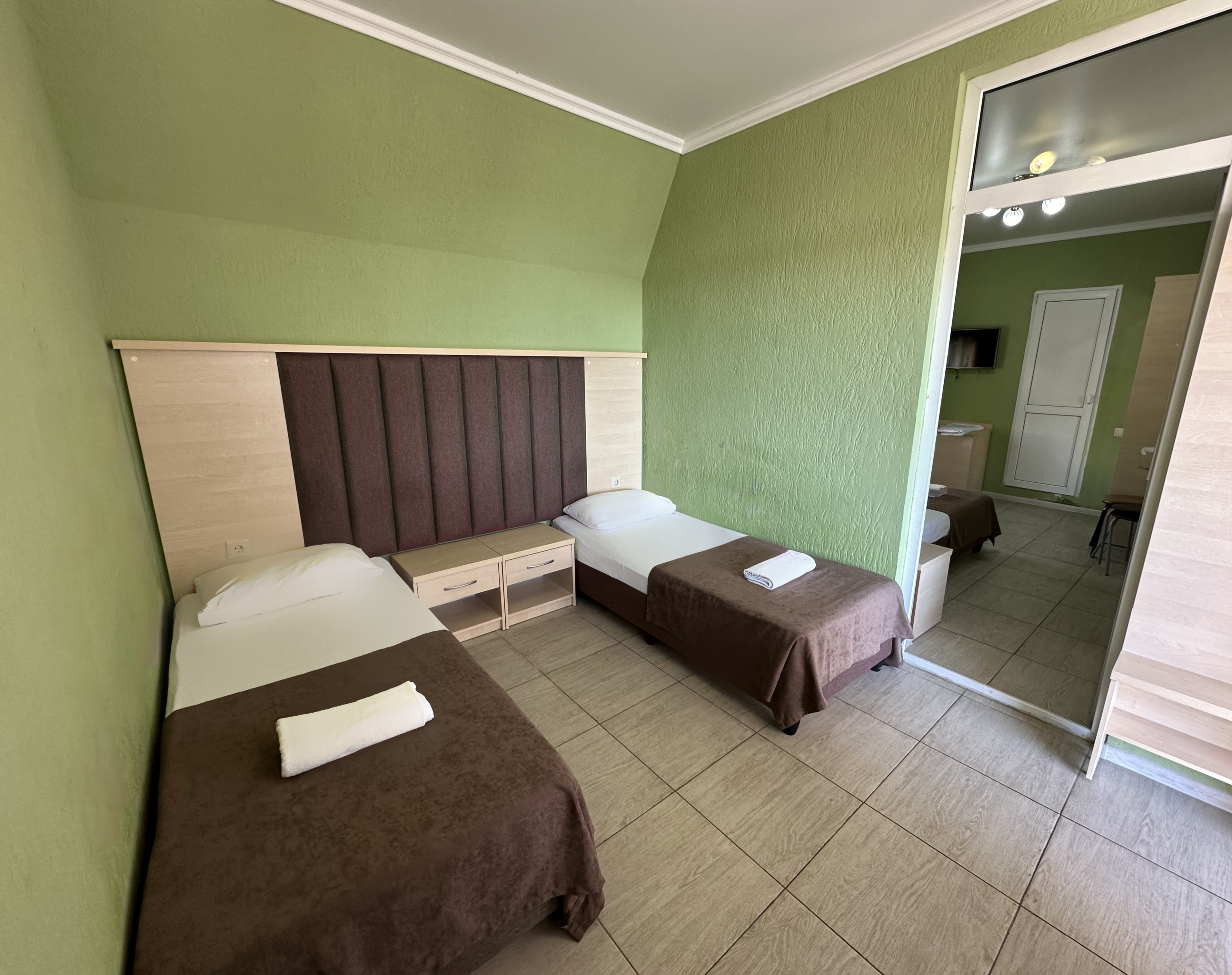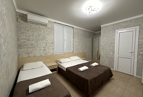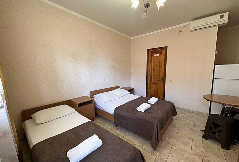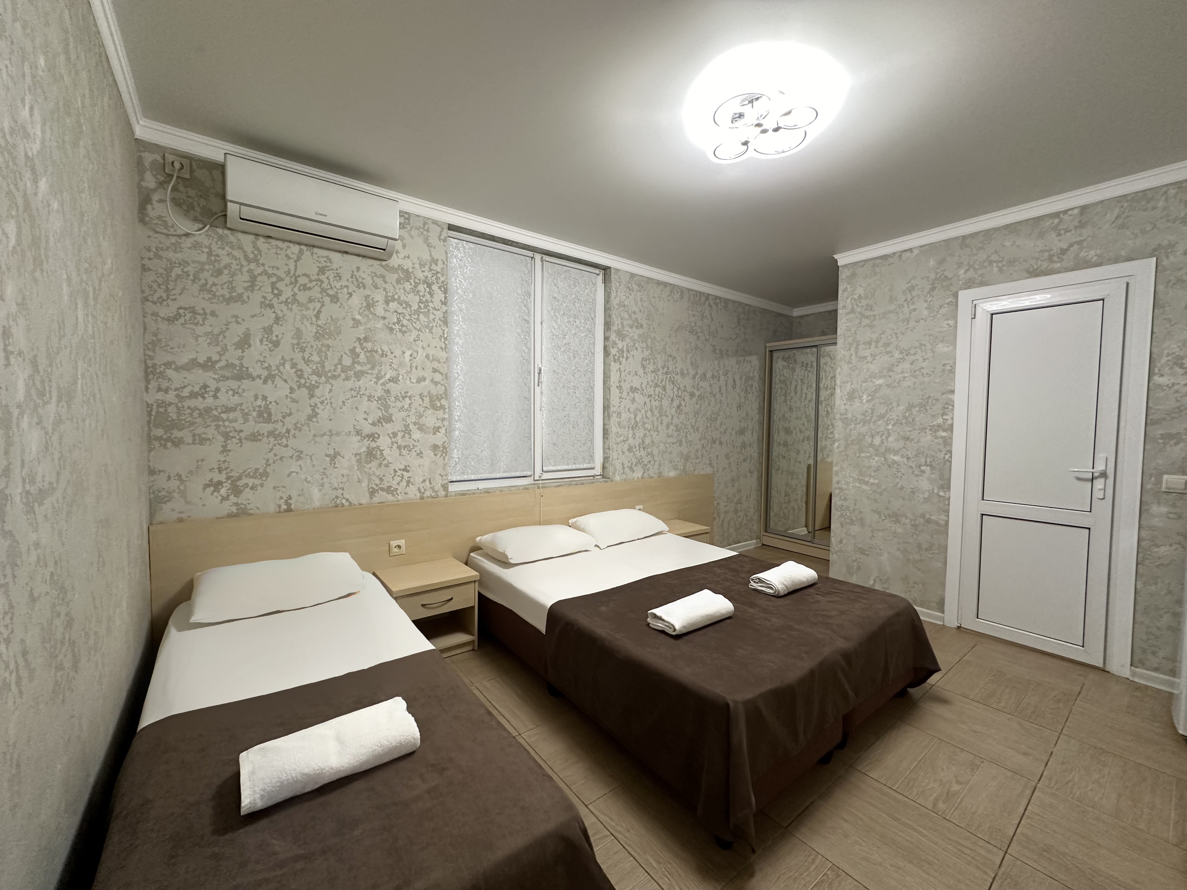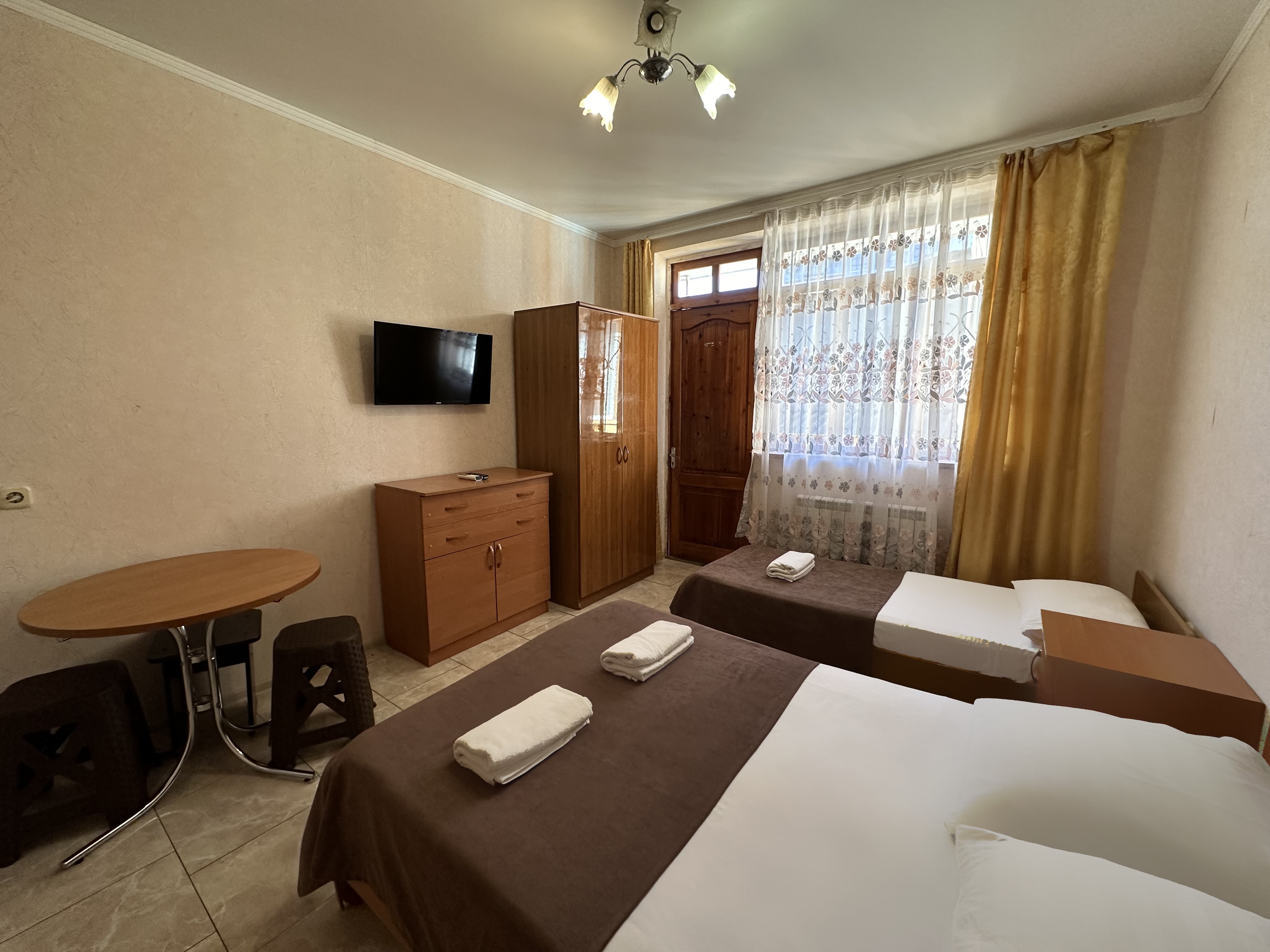 В номере: кровать двуспальная, кровать односпальная, прикроватные тумбочки, шкаф, кондиционер, сейф, телевизор, холодильник, чайный набор посуды