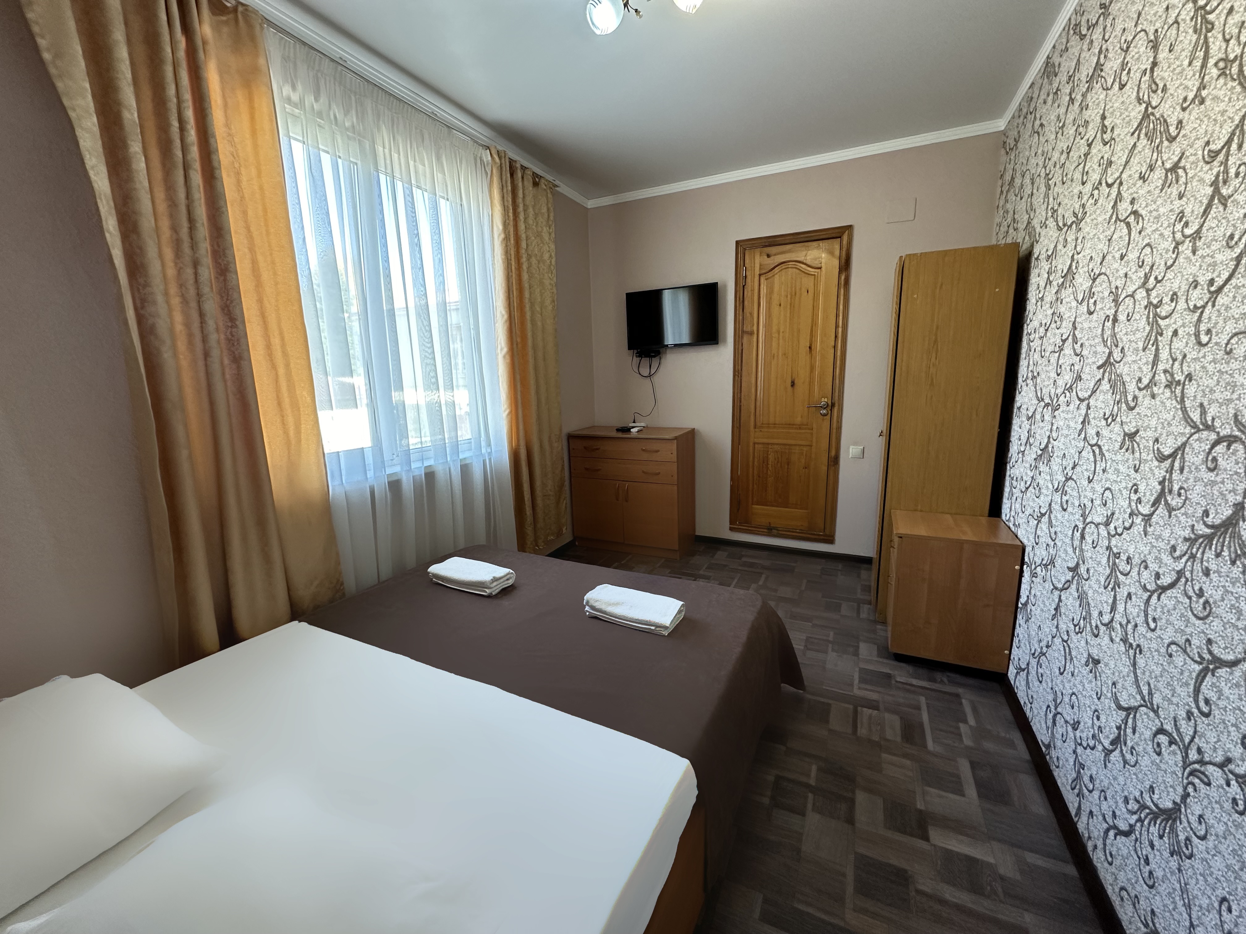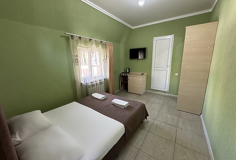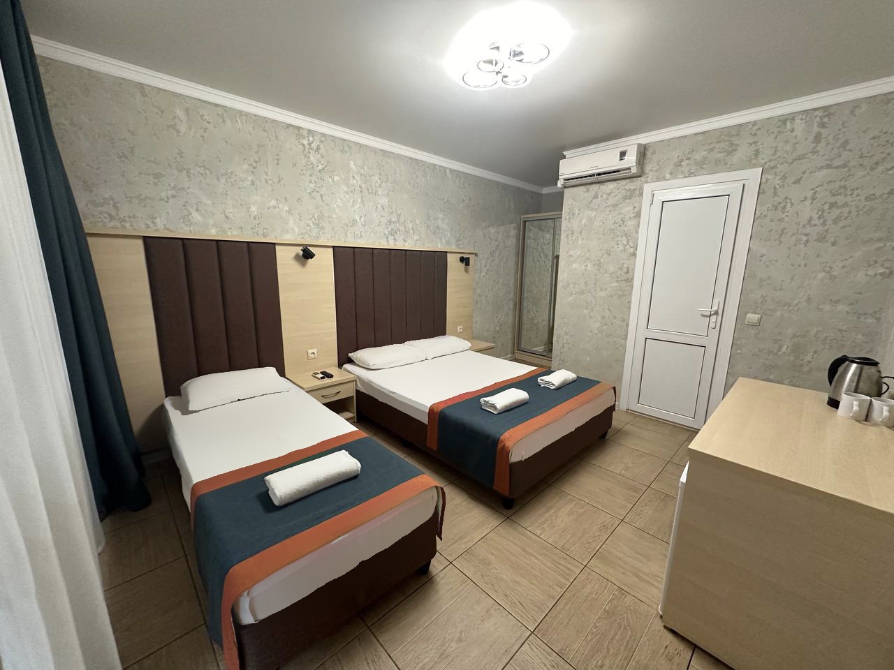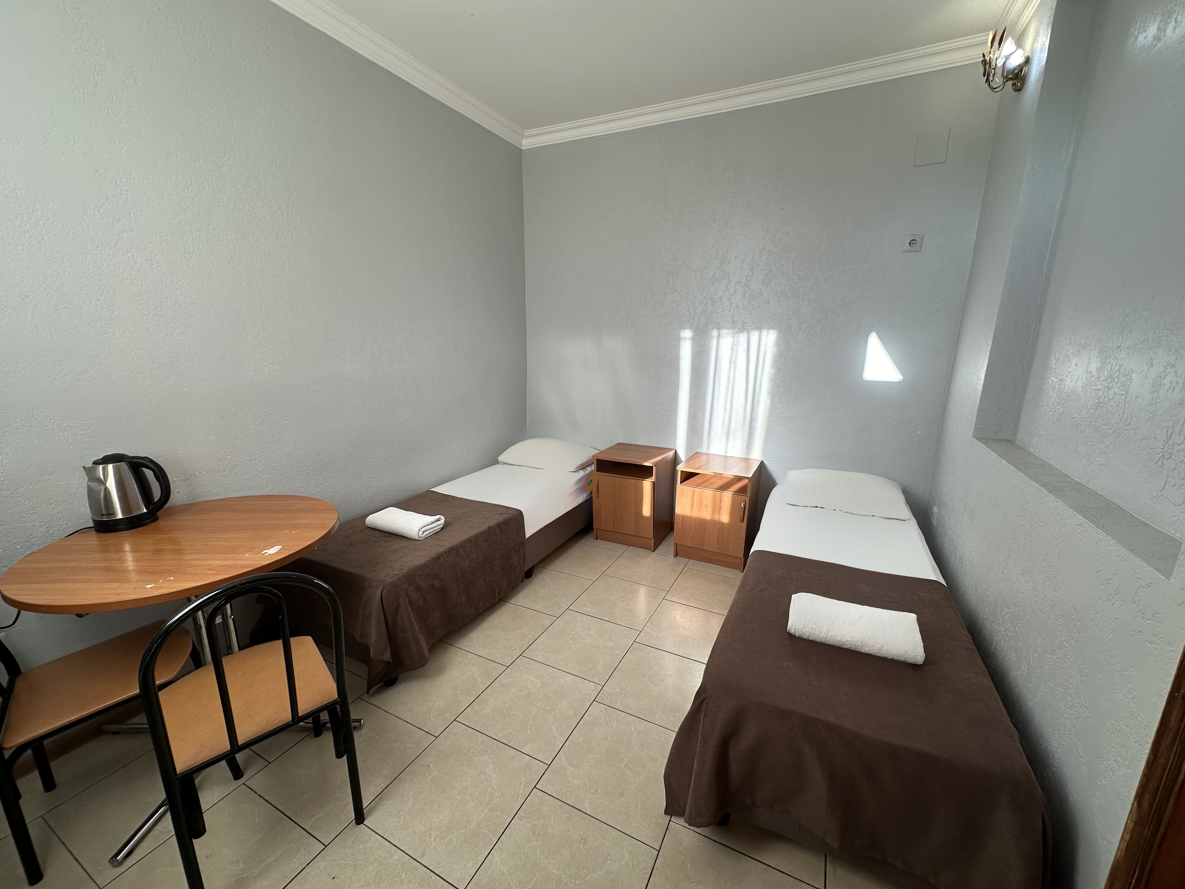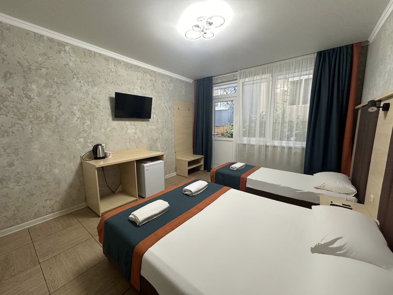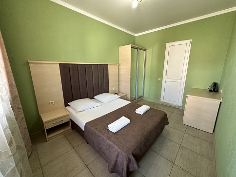 Здание отеля занимает небольшую закрытую территорию в 600 метрах от моря. Жилой фонд включает в себя номера разные по уровню комфорта и площади. В каждом предусмотрен персональный санузел с душем, есть кондиционер, справляющийся с южной жарой, телевизор, холодильник. При гостинице работает столовая, есть открытый бассейн с подогревом, в числе прочих удобств – услуги прачечной и безлимитный интернет. В 10 минутах ходьбы – галечный пляж с раздевалками, навесами, лежаками.