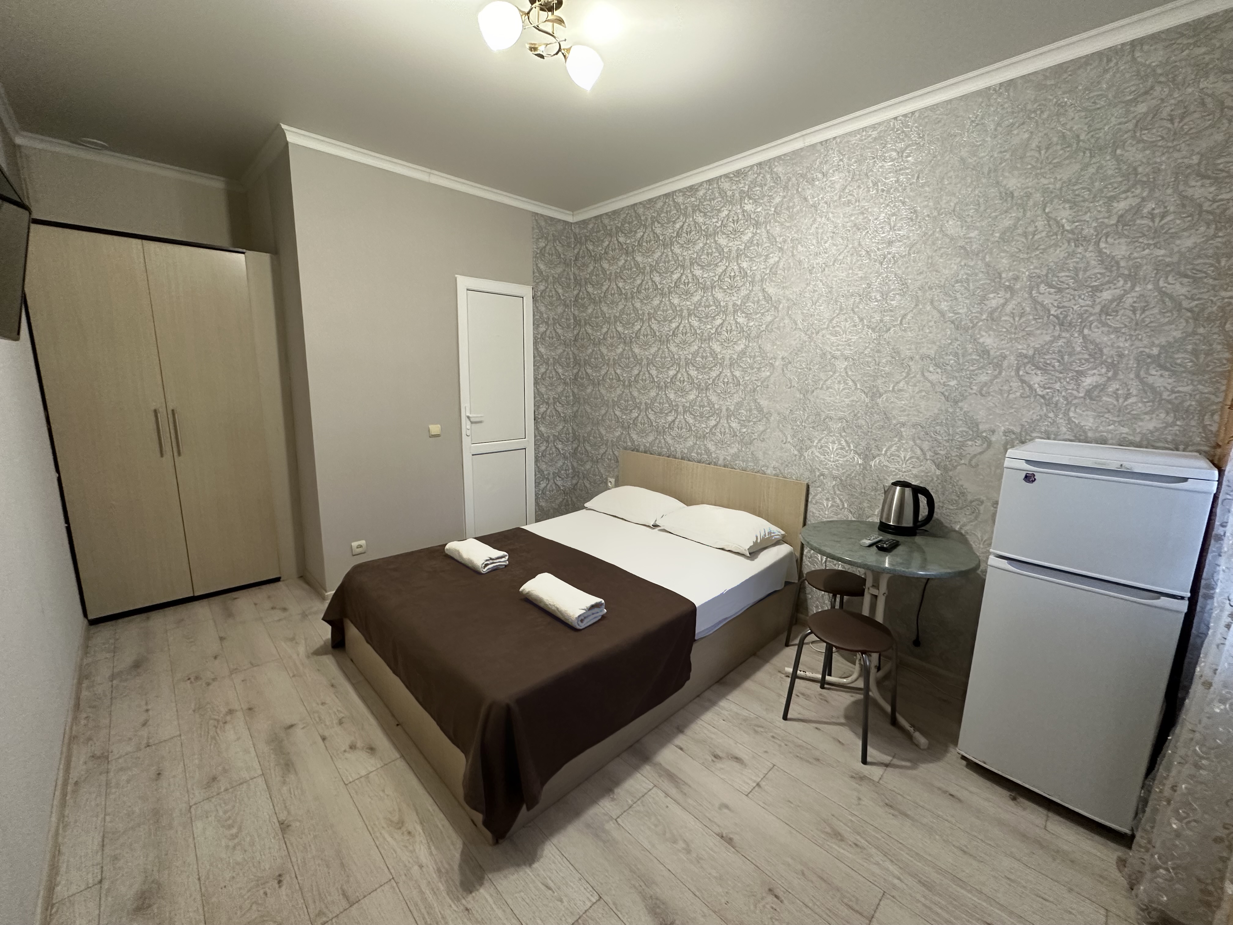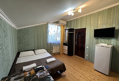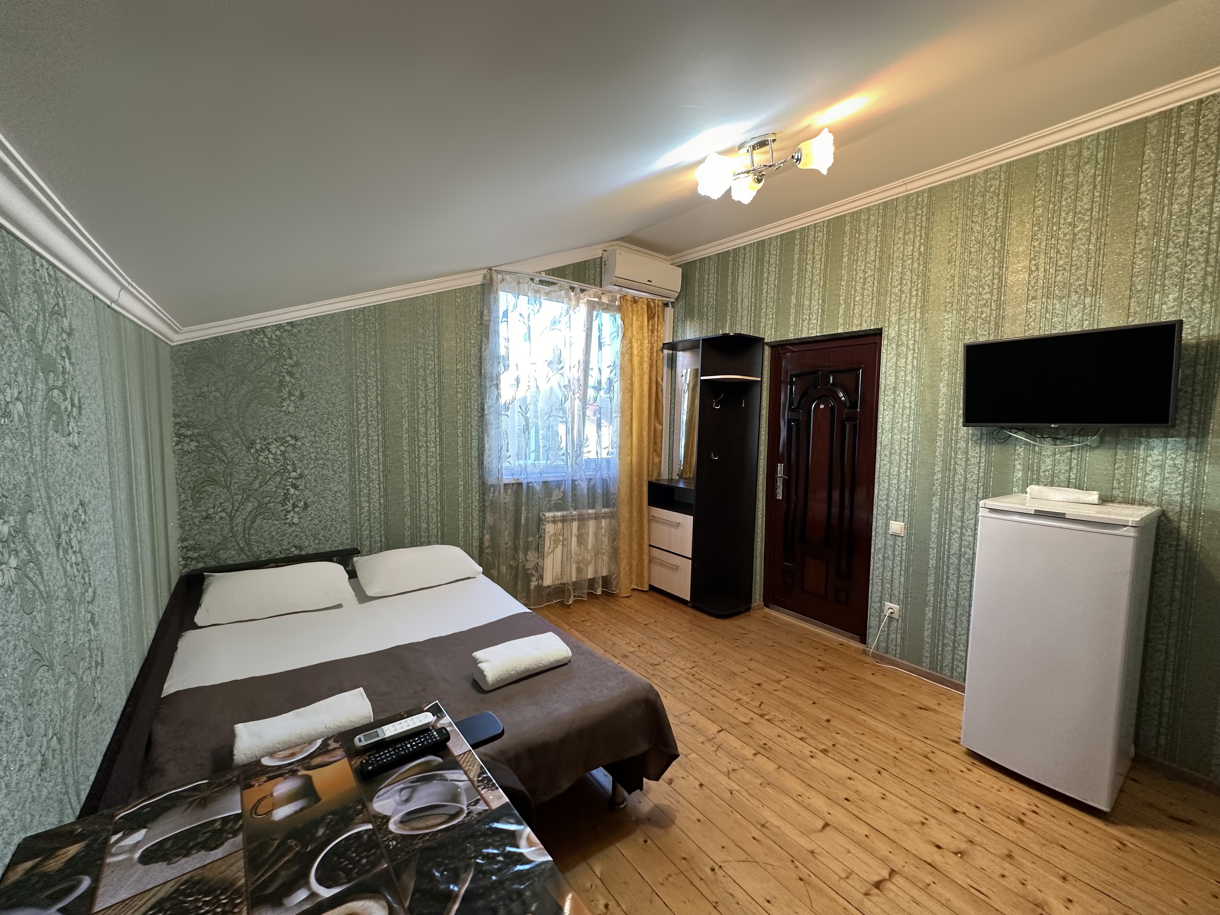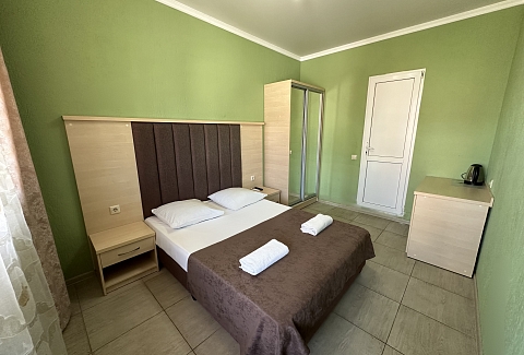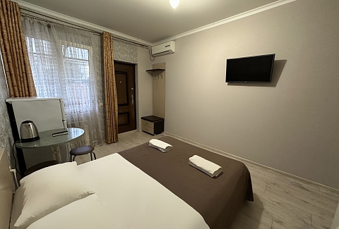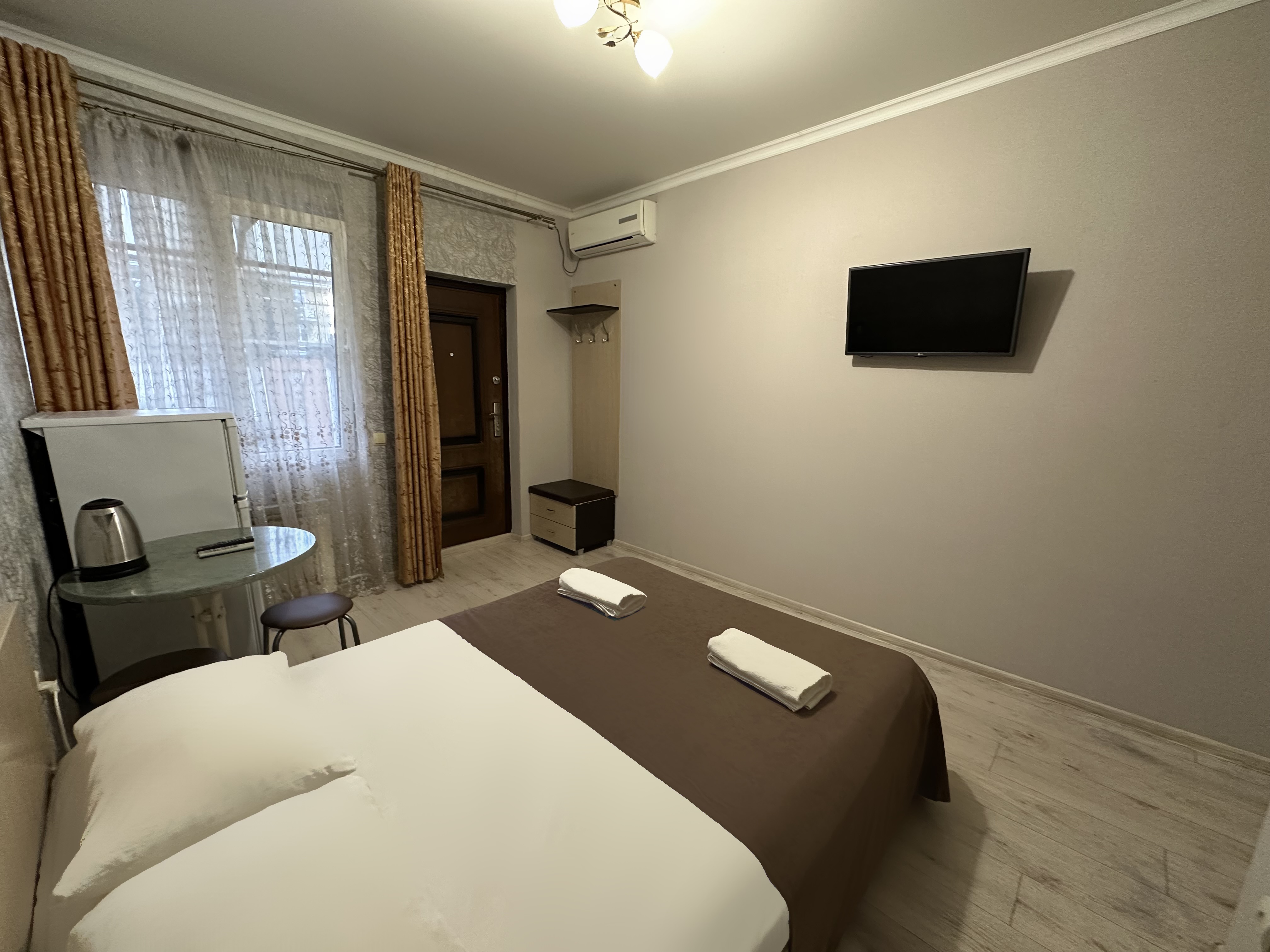 В номере: кровать двуспальная, прикроватные тумбочки, шкаф, кондиционер, сейф, телевизор, холодильник, чайный набор посуды
