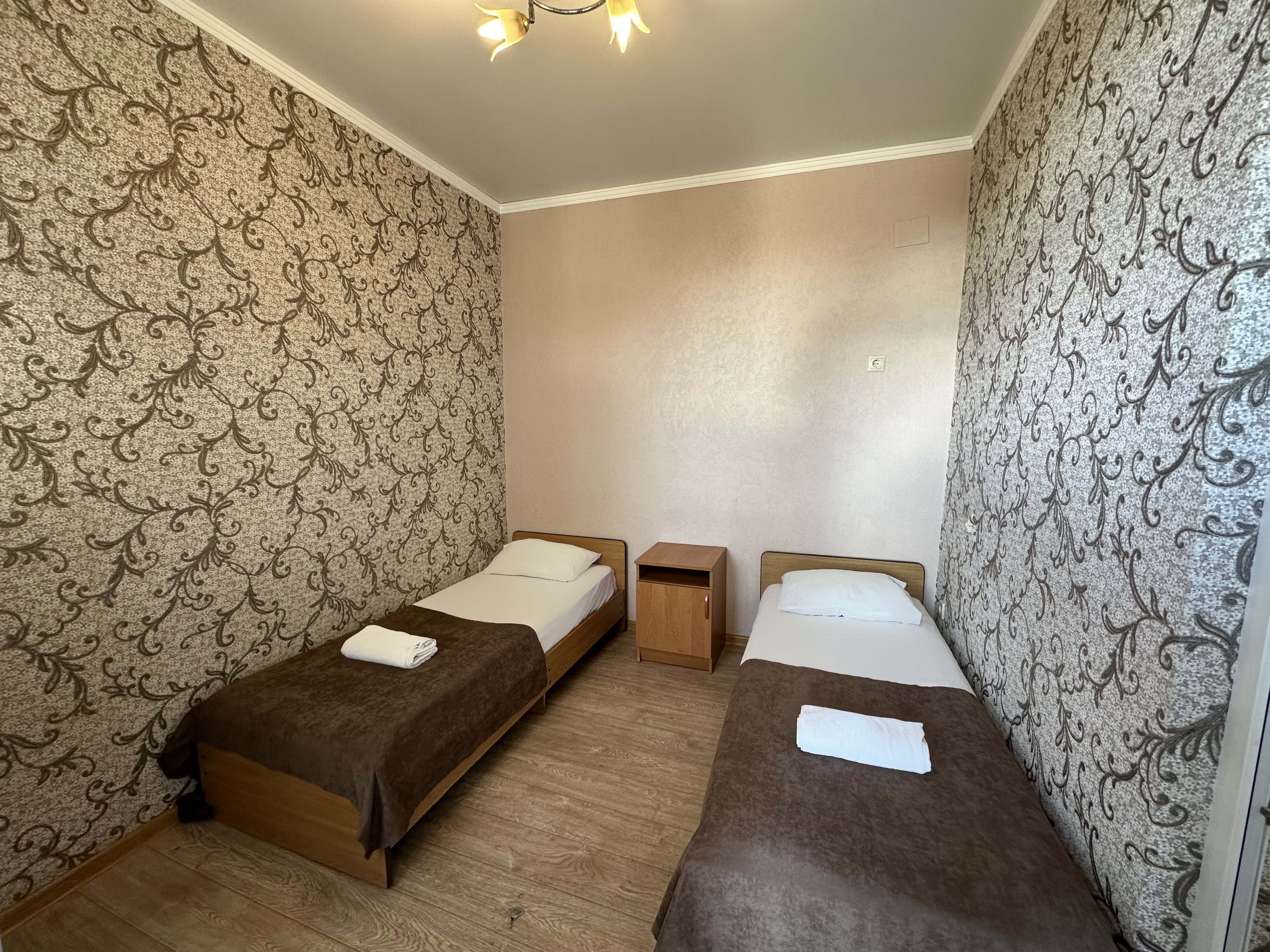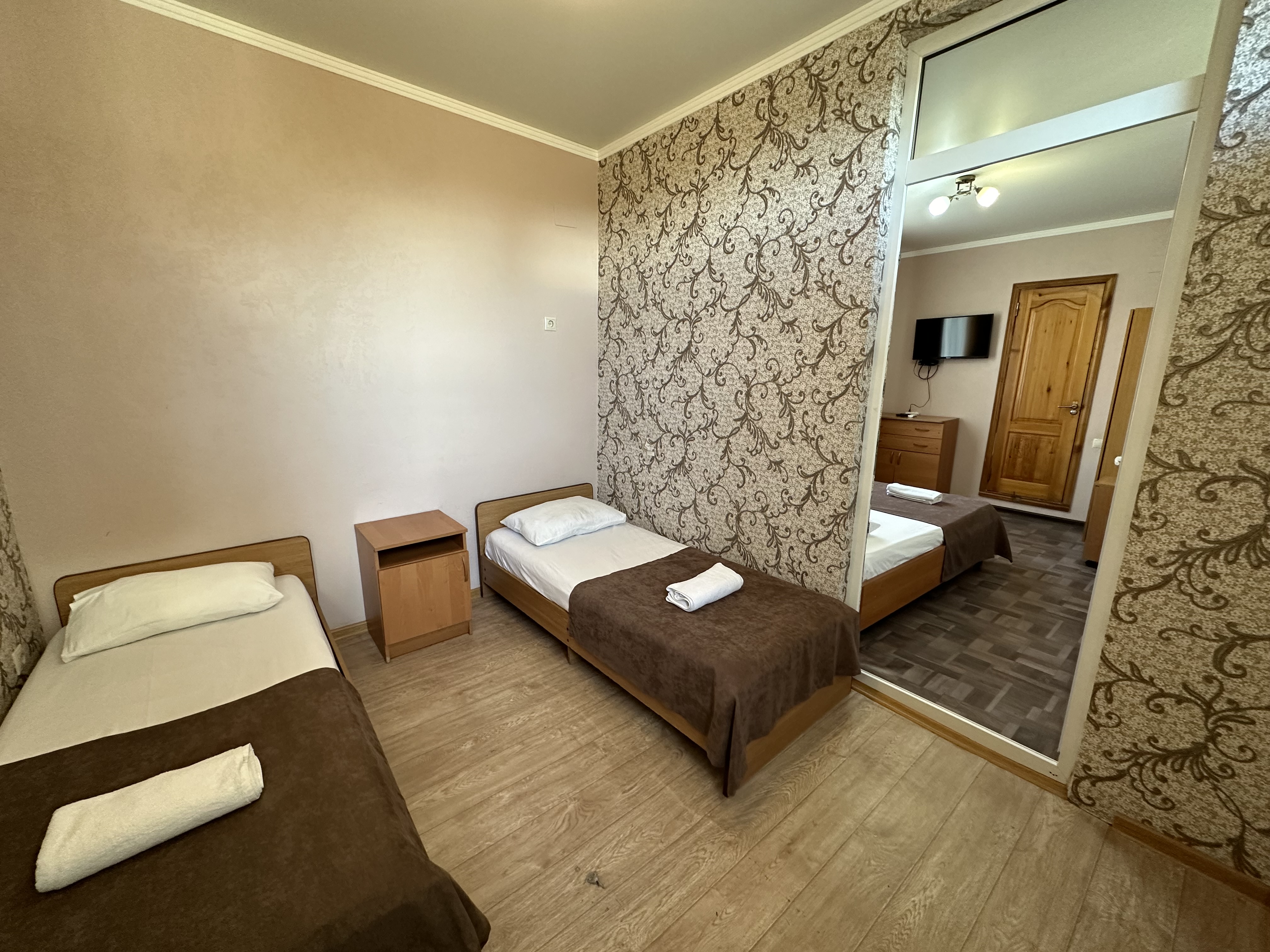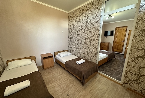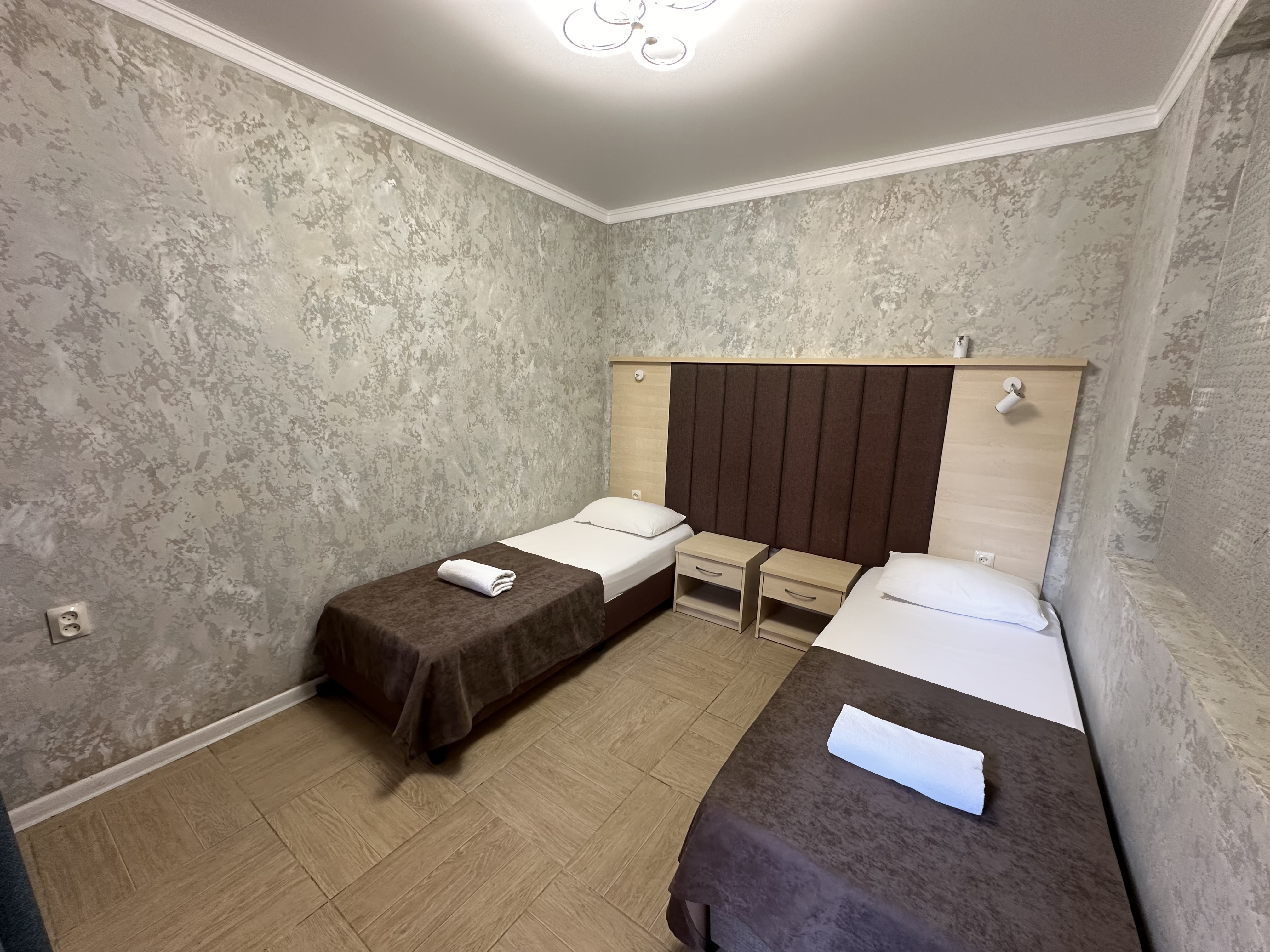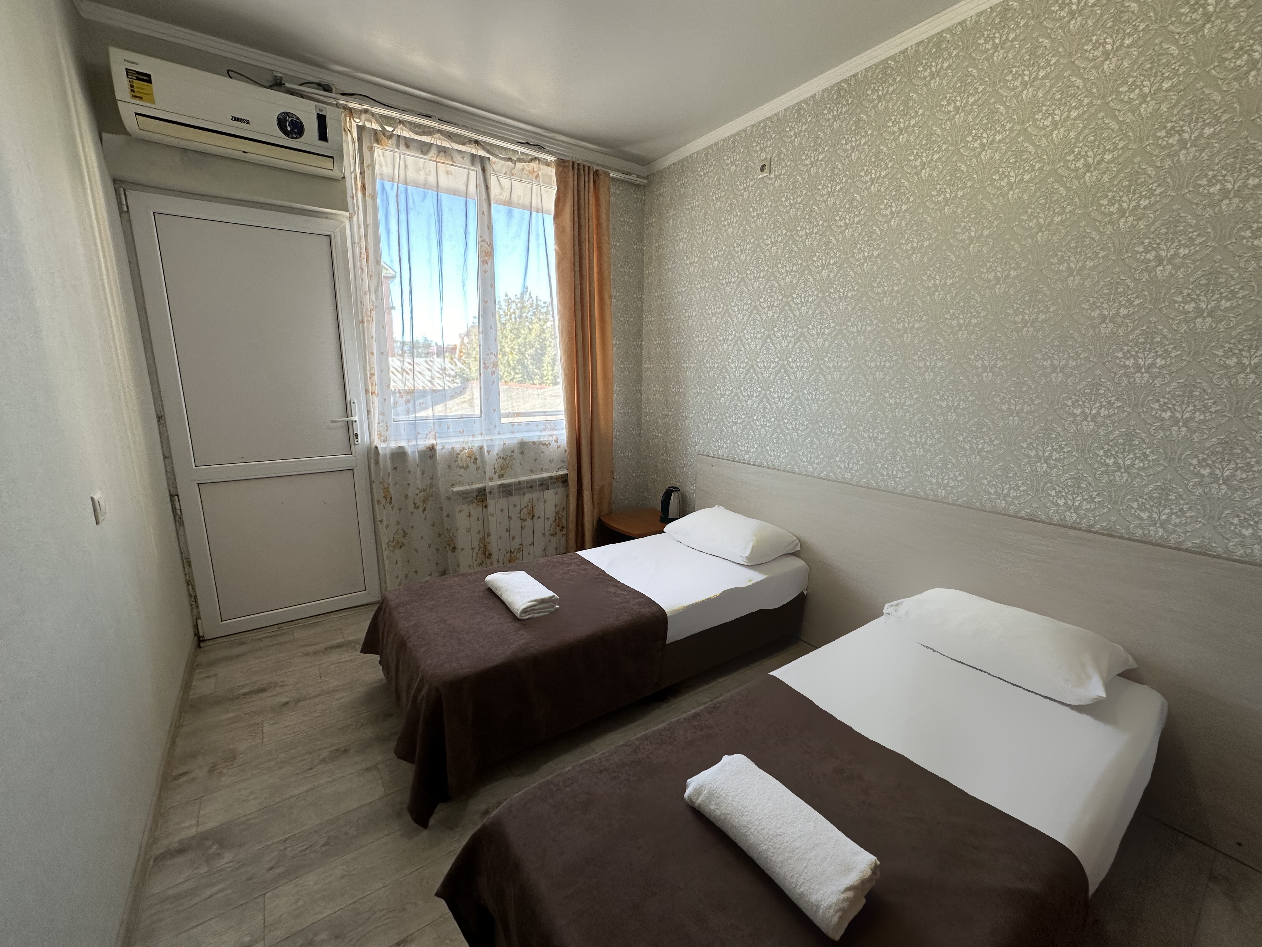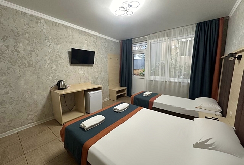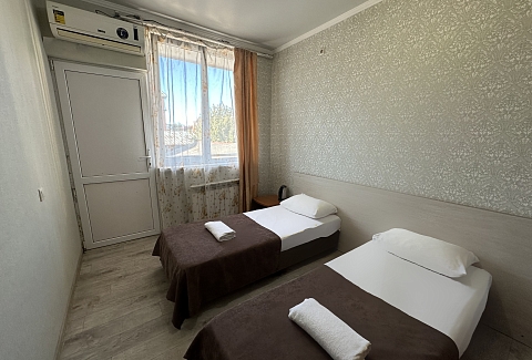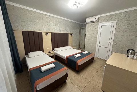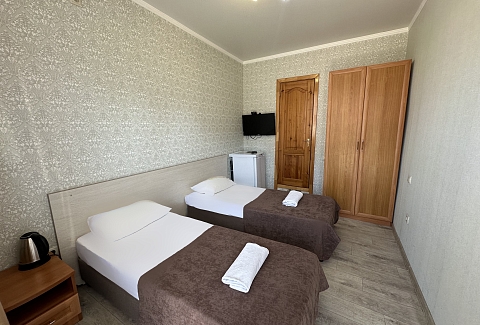 В номере: кровати односпальные, прикроватные тумбочки, шкаф, кондиционер, сейф, телевизор, холодильник, чайный набор посуды
