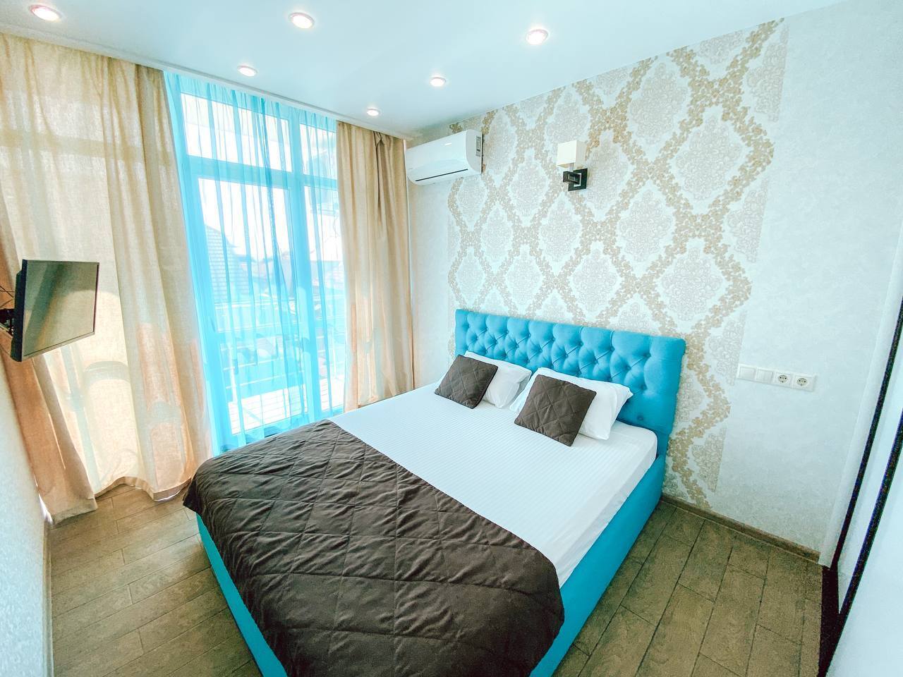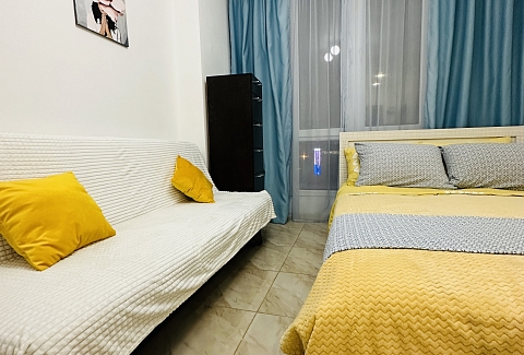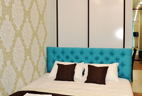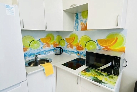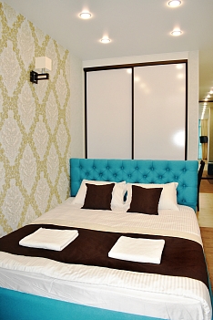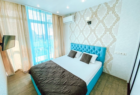 В номере: вешалка, диван раскладной, зеркало, кровать двуспальная, стол, стулья, шкаф, кондиционер, микроволновая печь, набор посуды, плита электрическая, телевизор, холодильник, электрочайник